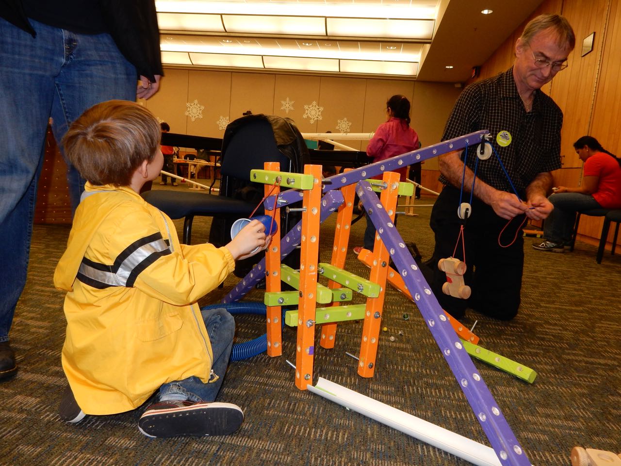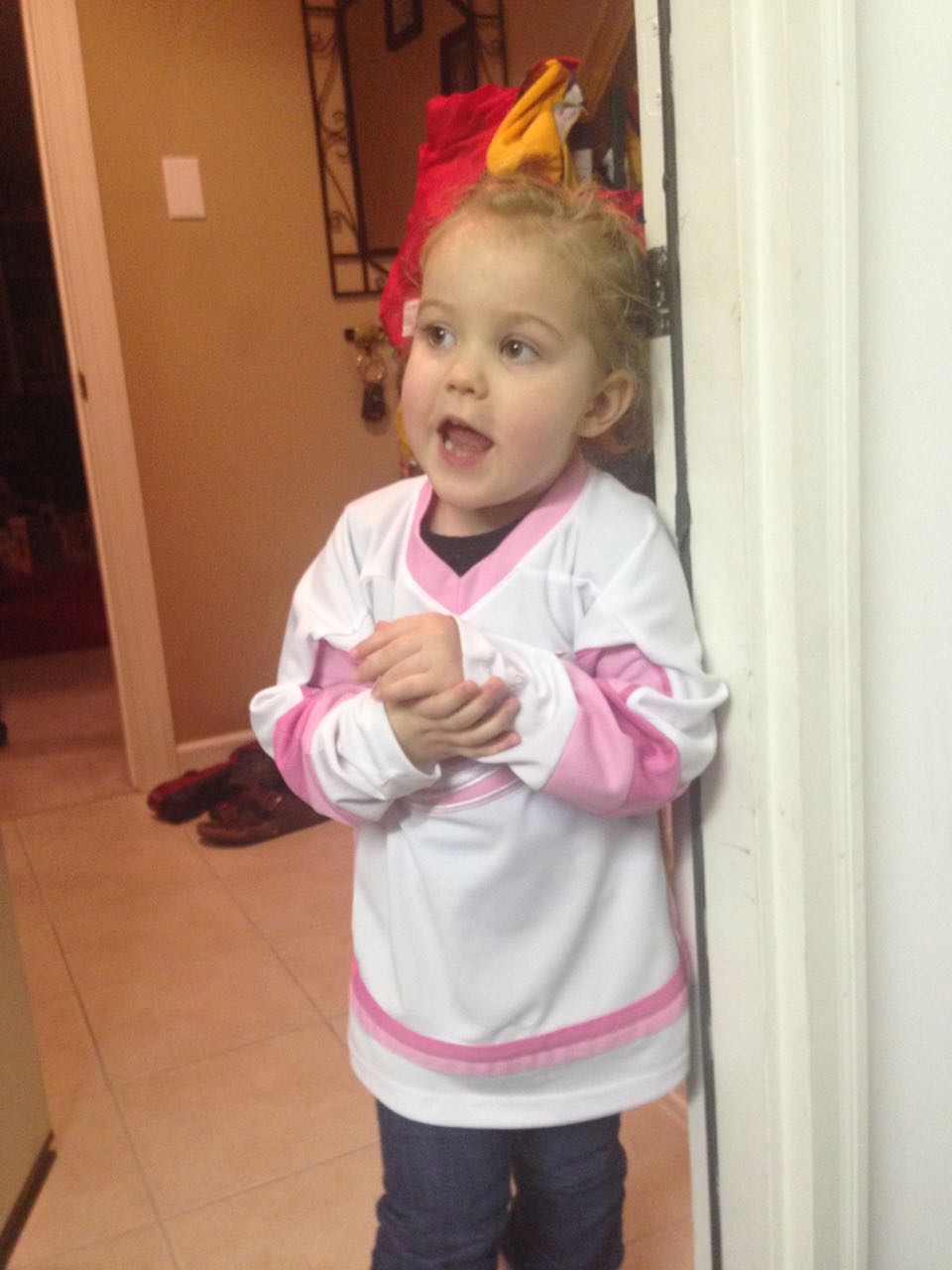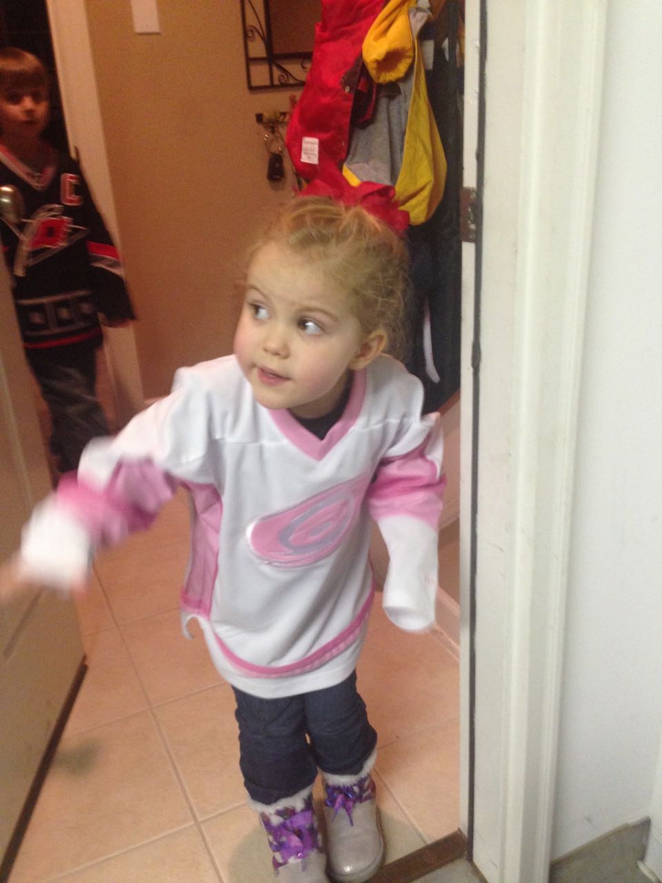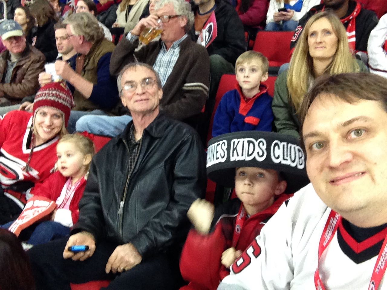 Today we took Grandpa Roger to Marbles! They had a special Engineer It! activity room set up, with all sorts of building materials you could use to make contraptions that cause a chain reaction. What fun! We spent a lot of time in this room. As the ranking engineer in the room, Grandpa Roger took the rest of us to school. 🙂 Kendall really liked hooking up the little cars to strings and dragging them around and around. Brian liked creating big marble runs. We did manage to play in some other areas, like the pirate ship, submarine, and underwater room. Brian created a robot guy with some of the materials they had out. Tonight, we took Grandpa Roger out to a hockey game. The kids were energetic (no surprise there!) and Brian was in especially rare form, really getting into all the music. 🙂 Kendall was quite proud to wear her new pink and white jersey.