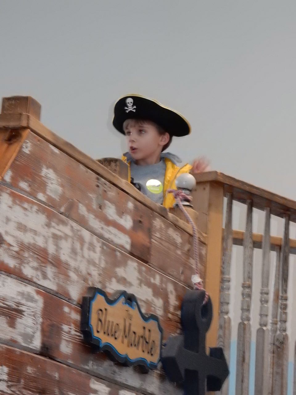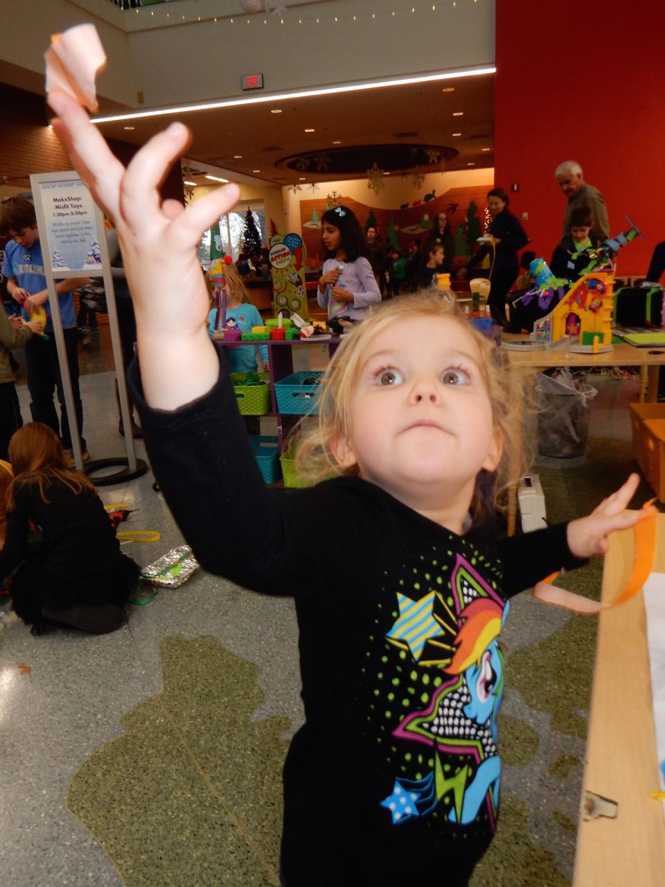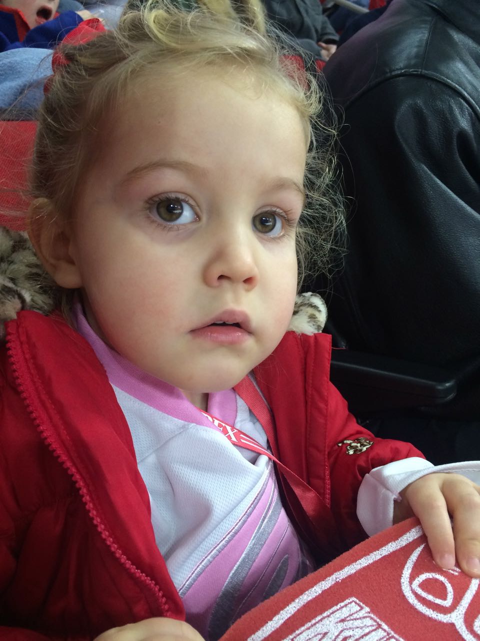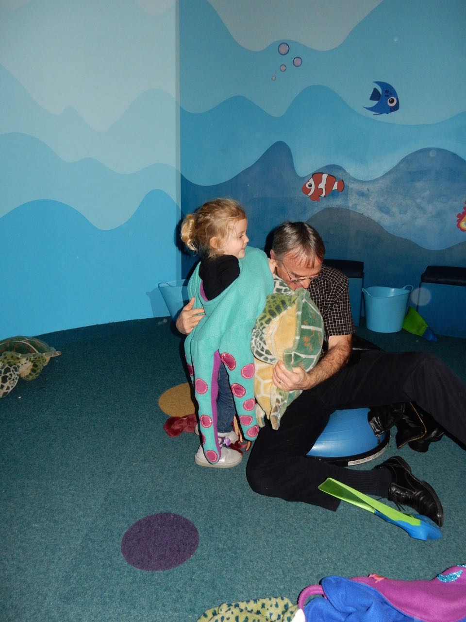 Today we took Grandpa Roger to Marbles! They had a special Engineer It! activity room set up, with all sorts of building materials you could use to make contraptions that cause a chain reaction. What fun! We spent a lot of time in this room. As the ranking engineer in the room, Grandpa Roger took the rest of us to school. 🙂 Kendall really liked hooking up the little cars to strings and dragging them around and around. Brian liked creating big marble runs. We did manage to play in some other areas, like the pirate ship, submarine, and underwater room. Brian created a robot guy with some of the materials they had out. Tonight, we took Grandpa Roger out to a hockey game. The kids were energetic (no surprise there!) and Brian was in especially rare form, really getting into all the music. 🙂 Kendall was quite proud to wear her new pink and white jersey.