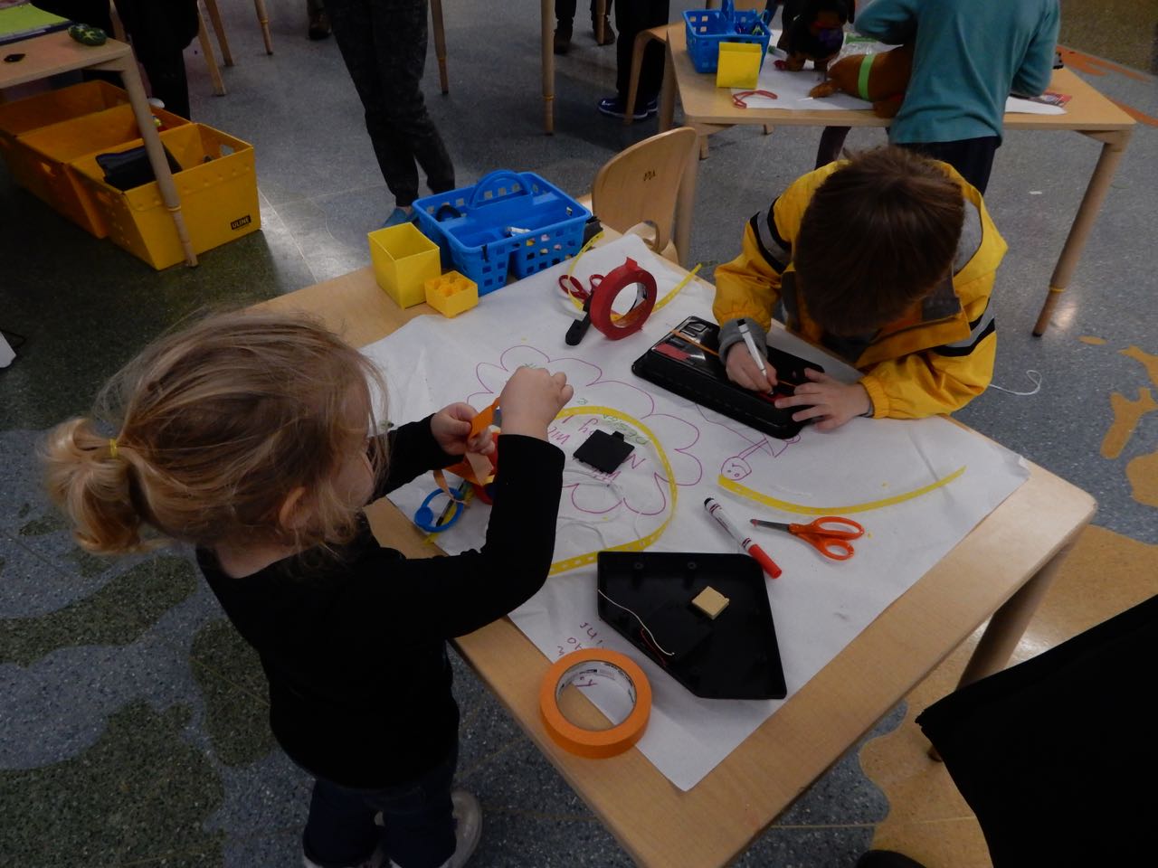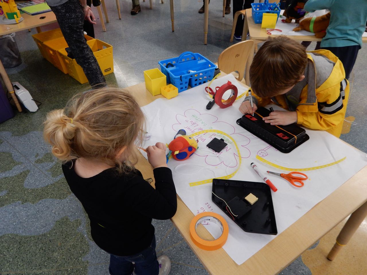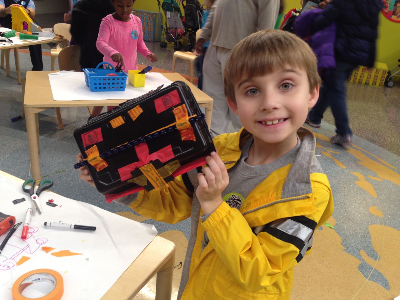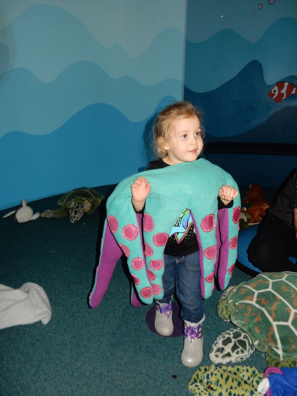 Today we took Grandpa Roger to Marbles! They had a special Engineer It! activity room set up, with all sorts of building materials you could use to make contraptions that cause a chain reaction. What fun! We spent a lot of time in this room. As the ranking engineer in the room, Grandpa Roger took the rest of us to school. 🙂 Kendall really liked hooking up the little cars to strings and dragging them around and around. Brian liked creating big marble runs. We did manage to play in some other areas, like the pirate ship, submarine, and underwater room. Brian created a robot guy with some of the materials they had out. Tonight, we took Grandpa Roger out to a hockey game. The kids were energetic (no surprise there!) and Brian was in especially rare form, really getting into all the music. 🙂 Kendall was quite proud to wear her new pink and white jersey.