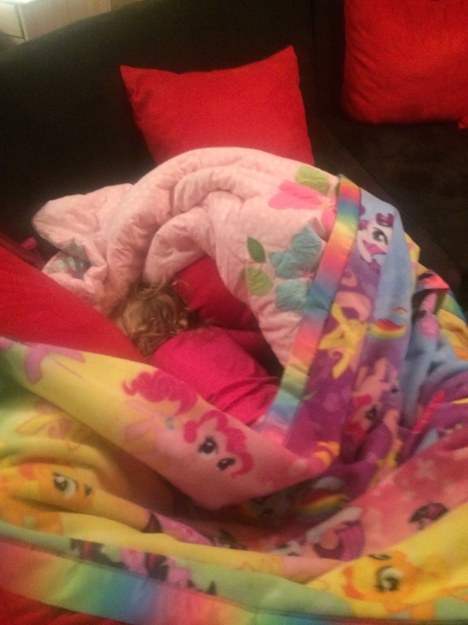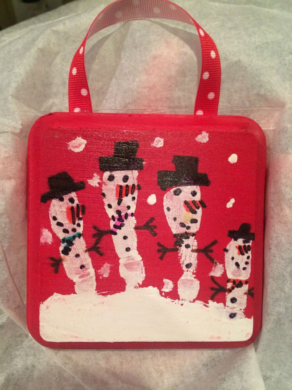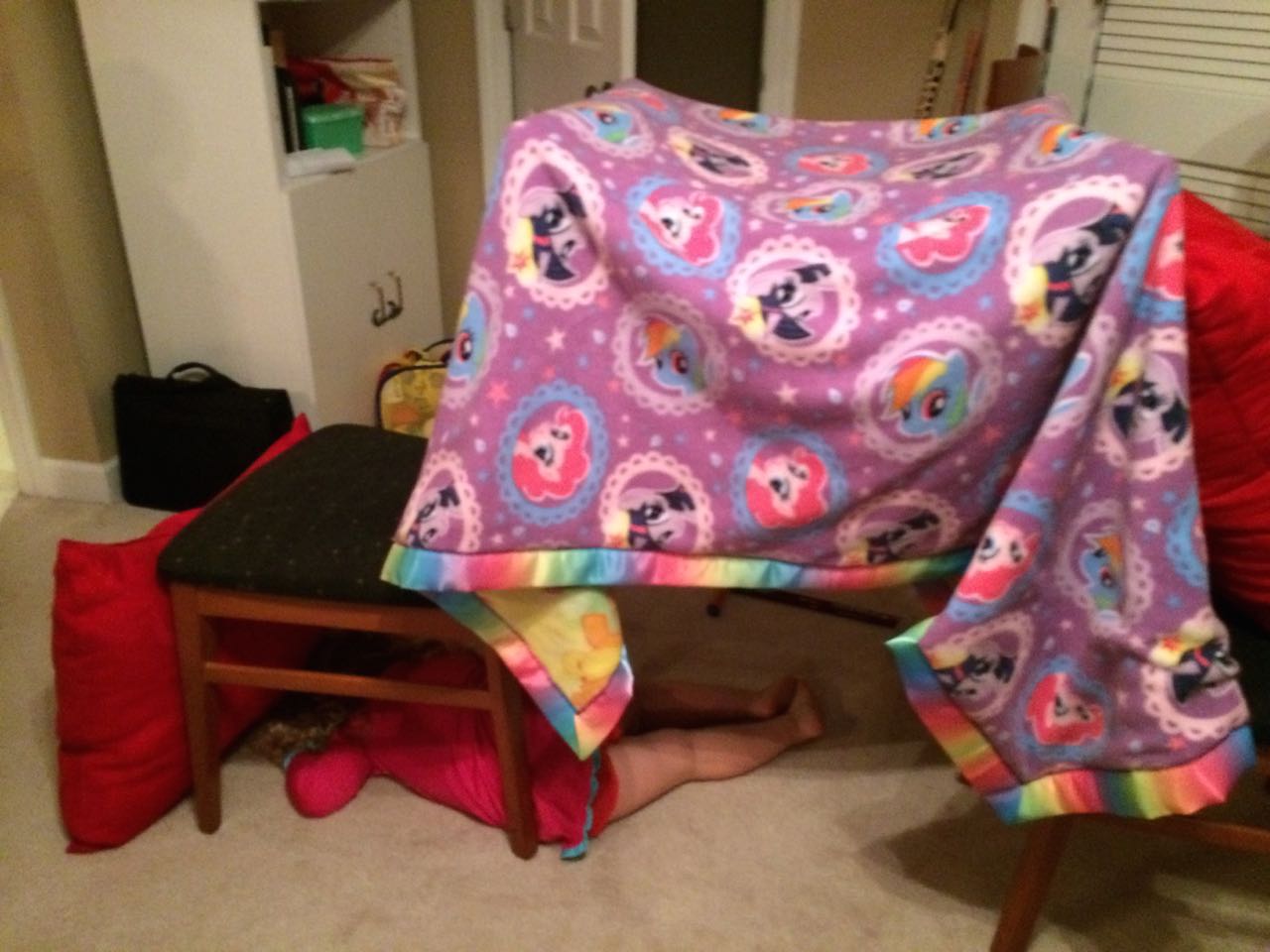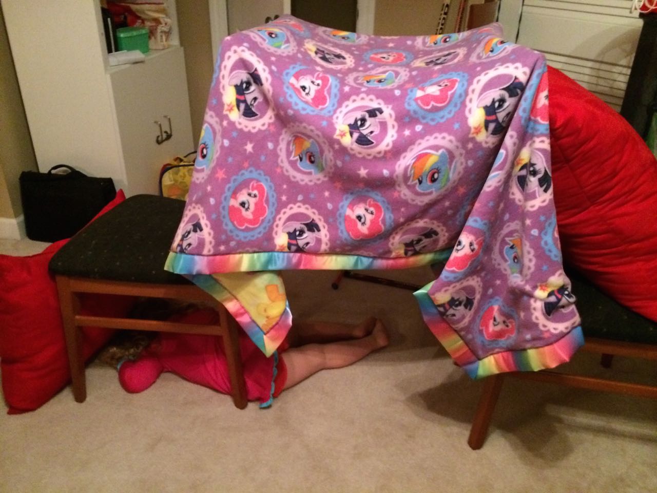 Tonight, I finished making a My Little Pony blanket for Kendall! I think she liked it a lot. My friend Jennie came over, and helped the kids make a blanket fort to play in! They entertained us playing hockey, playing Just Dance, and watching My Little Pony (they really loved the “Babs Seed” episode, and we all learned a little about how to deal with a bully). We decided to watch a movie together–“Wreck-It Ralph”! The kids brought out their sleeping bags and we had a fun evening, almost like a sleepover. Also included, a picture of Brian’s fingerprint-snowman ornament one more time before we pack it away until next year. I love how he made a snowman for each of us!