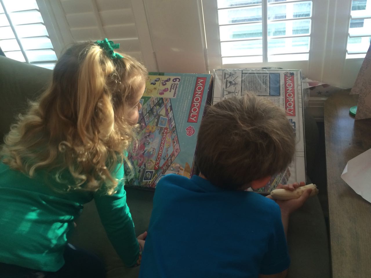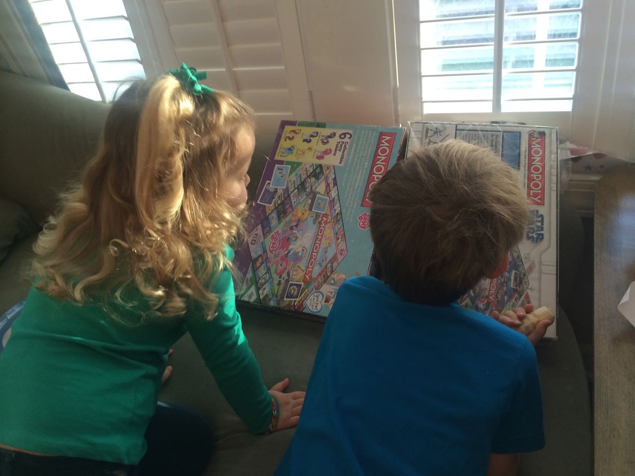 We surprised the kids by presenting them with character-tie-in versions of Monopoly! Actually, we had originally planned on just getting the My Little Pony version for Kendall, but Brian found out, and wished that there was a Clone Wars version of Monopoly. I went and looked, of course–and it turns out they did make one, a few years ago! I found one in good condition for less than collector’s-item pricing, so I went ahead. When we gave Kendall her game, Brian got his, too! What a surprise. 😀 They are a little young for these yet, but, it’s cool to have them on hand anyway. Monopoly is one of Brandon’s very favorite board games, so, we expect to have lots of good times playing the classic game with the kids’ favorite characters. Also included, pictures of Kendall in her “I Love My Nana” shirt (that’s for you, Rosemary!) and some snapshots of the brilliant, but rare, January sunset we had today.