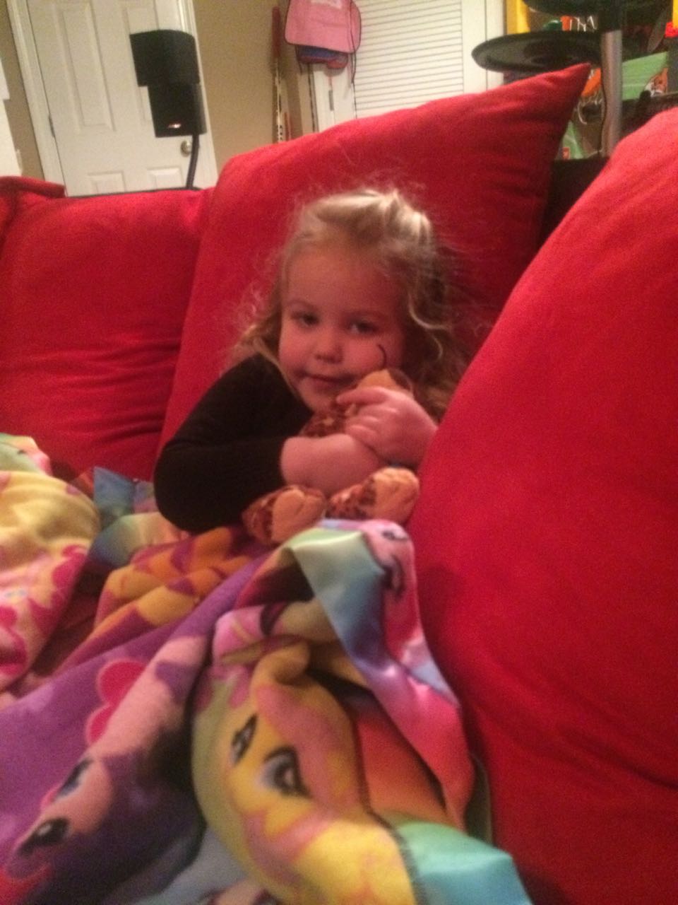 Kendall was feeling under the weather today, so I stayed home with her. Somehow we found Pee-Wee’s Playhouse on Netflix, and I introduced her to one of the wackiest shows from the 80’s. She really liked it, a lot! Mostly, she took it easy today, resting under the pony blanket I made her. 🙂