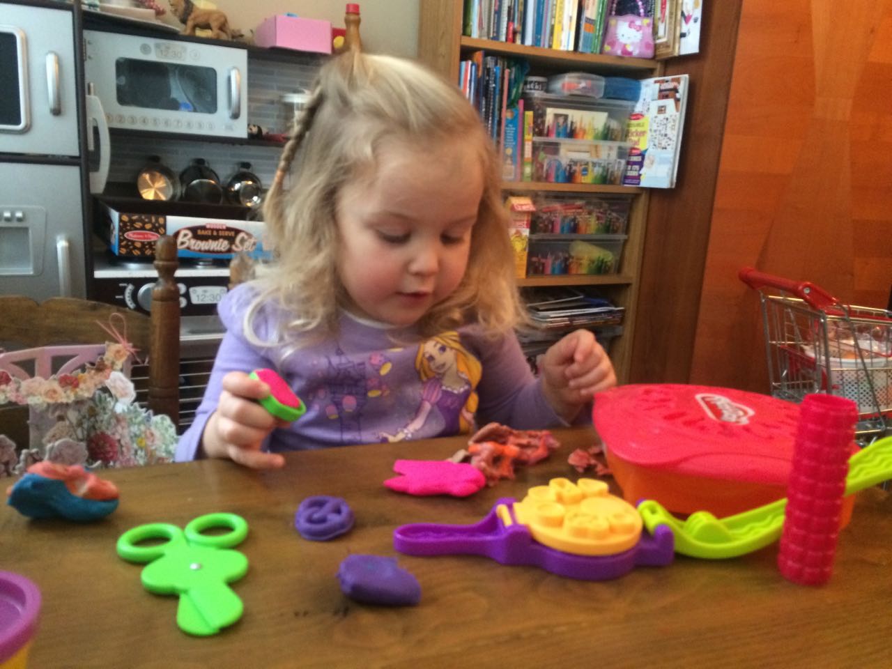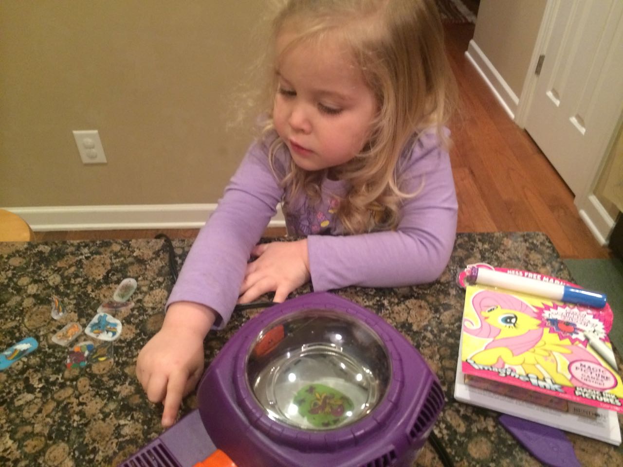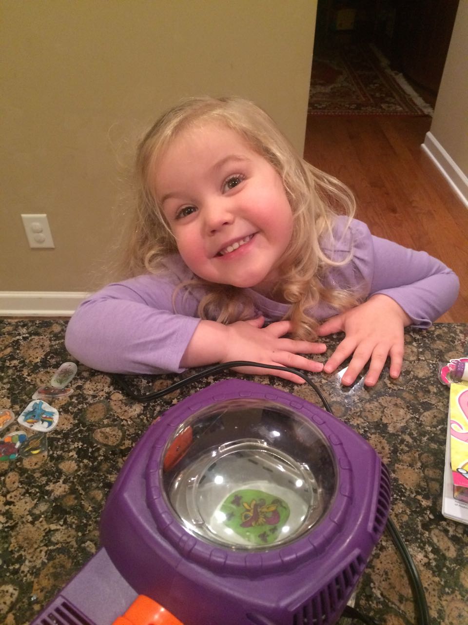 I was home with Kendall again today, who is feeling better and has a bit more energy. I had to do more to keep her entertained, so, we had some Play-Doh time, and tried out the Shrinky Dinks kit that she received for her birthday! We made a good number of things, and I traced and colored some pony characters for her from her coloring book. She was pleased with the results!