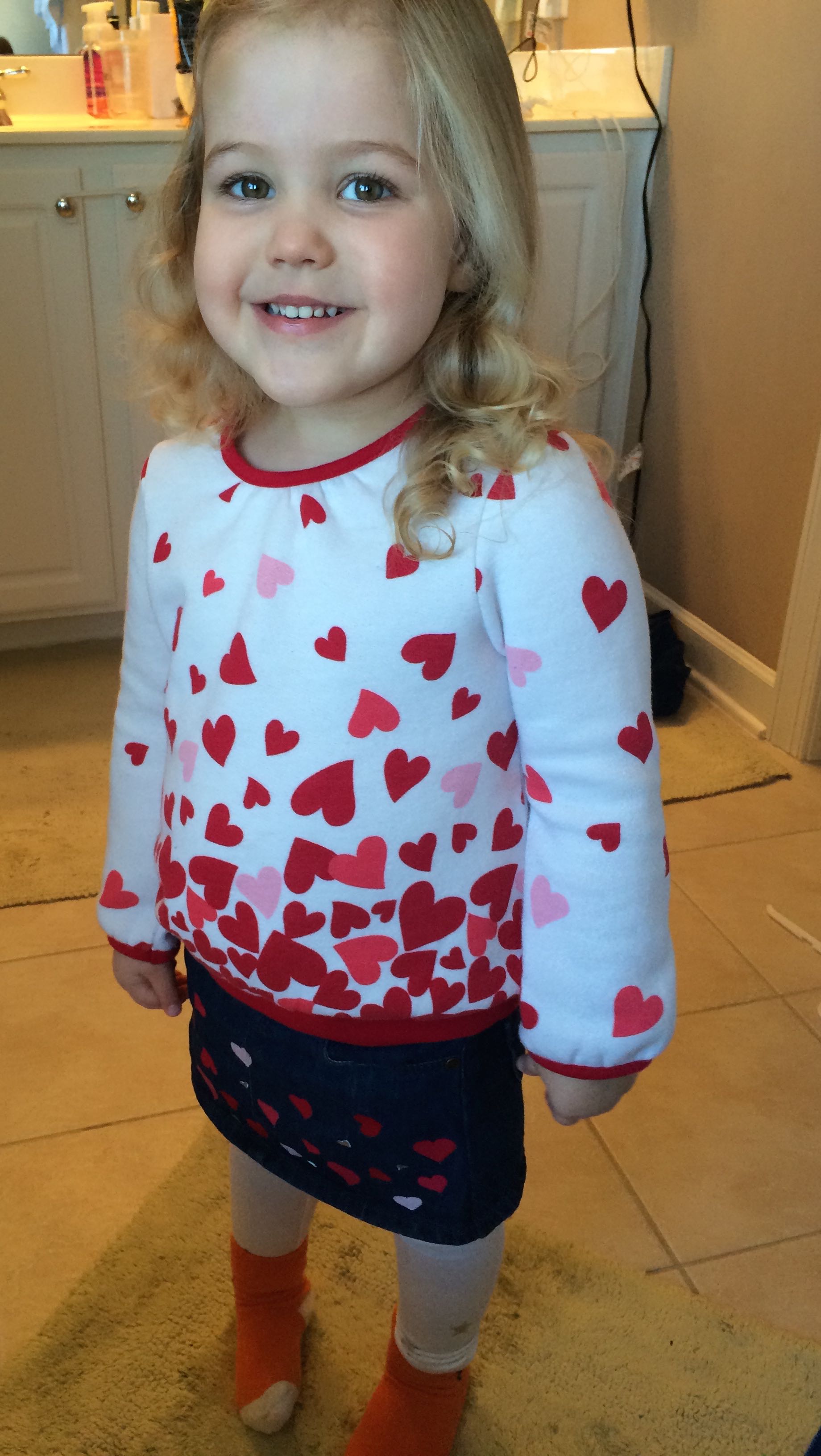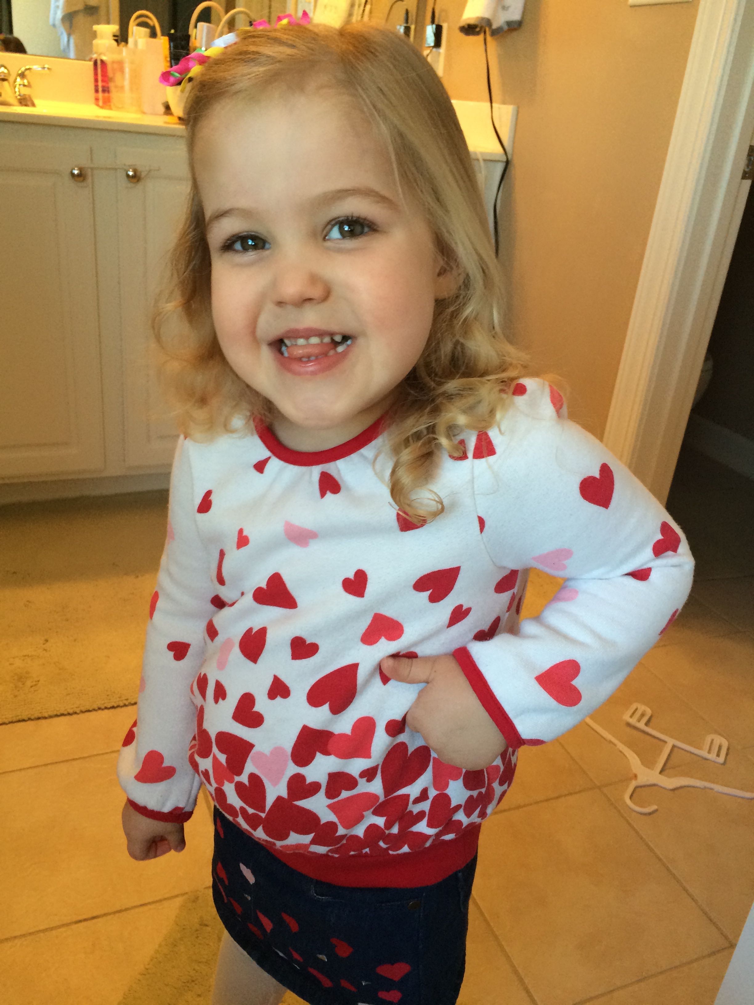 Kendall was looking quite festive for her classroom’s Valentine party today! I was able to join her for the afternoon gathering. She loved those cupcakes with the heart sprinkles, and sitting with her best friend Canady! We came home a little early and worked on a fun craft project–felt Valentine heart faces! Kendall really impressed me with her fine motor skills–she could totally use a yarn needle to sew the hearts together without any help! We made some cute faces and saved a few for Brian to make when he got home. The kids hung up a few heart faces in their rooms to decorate.