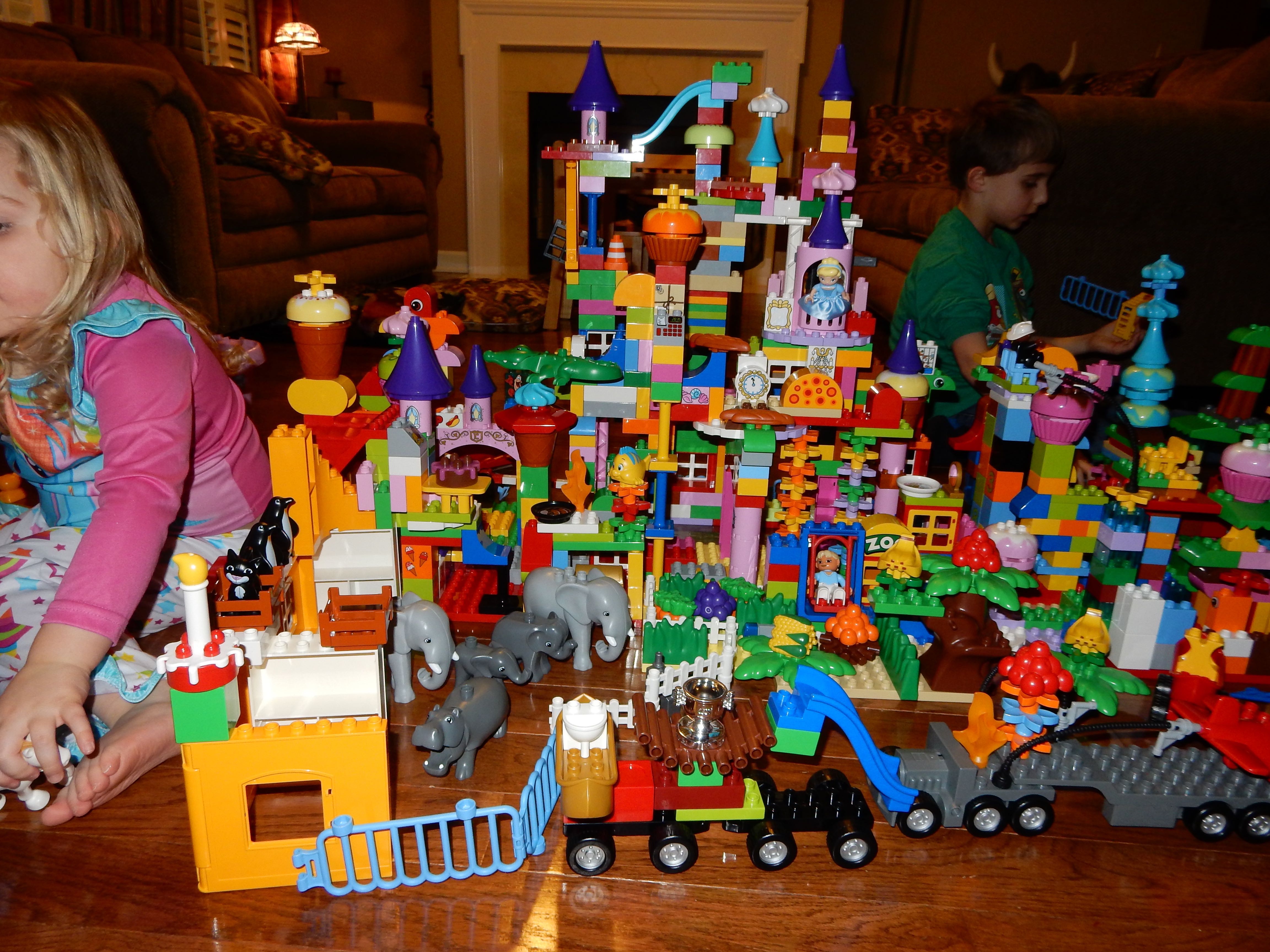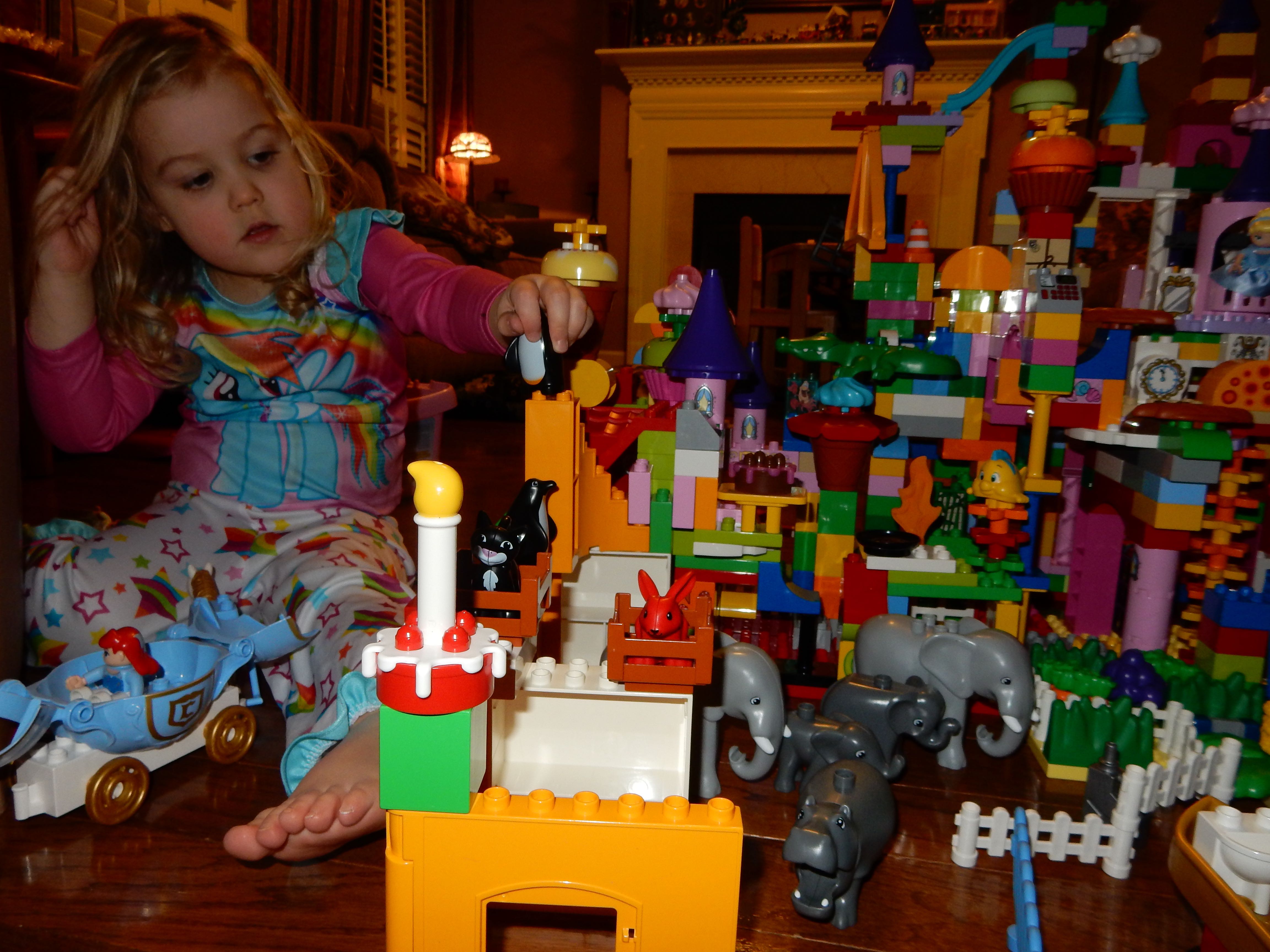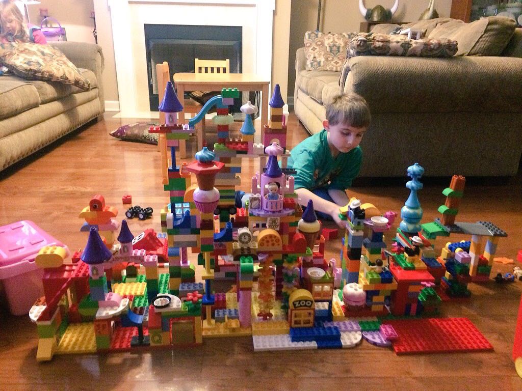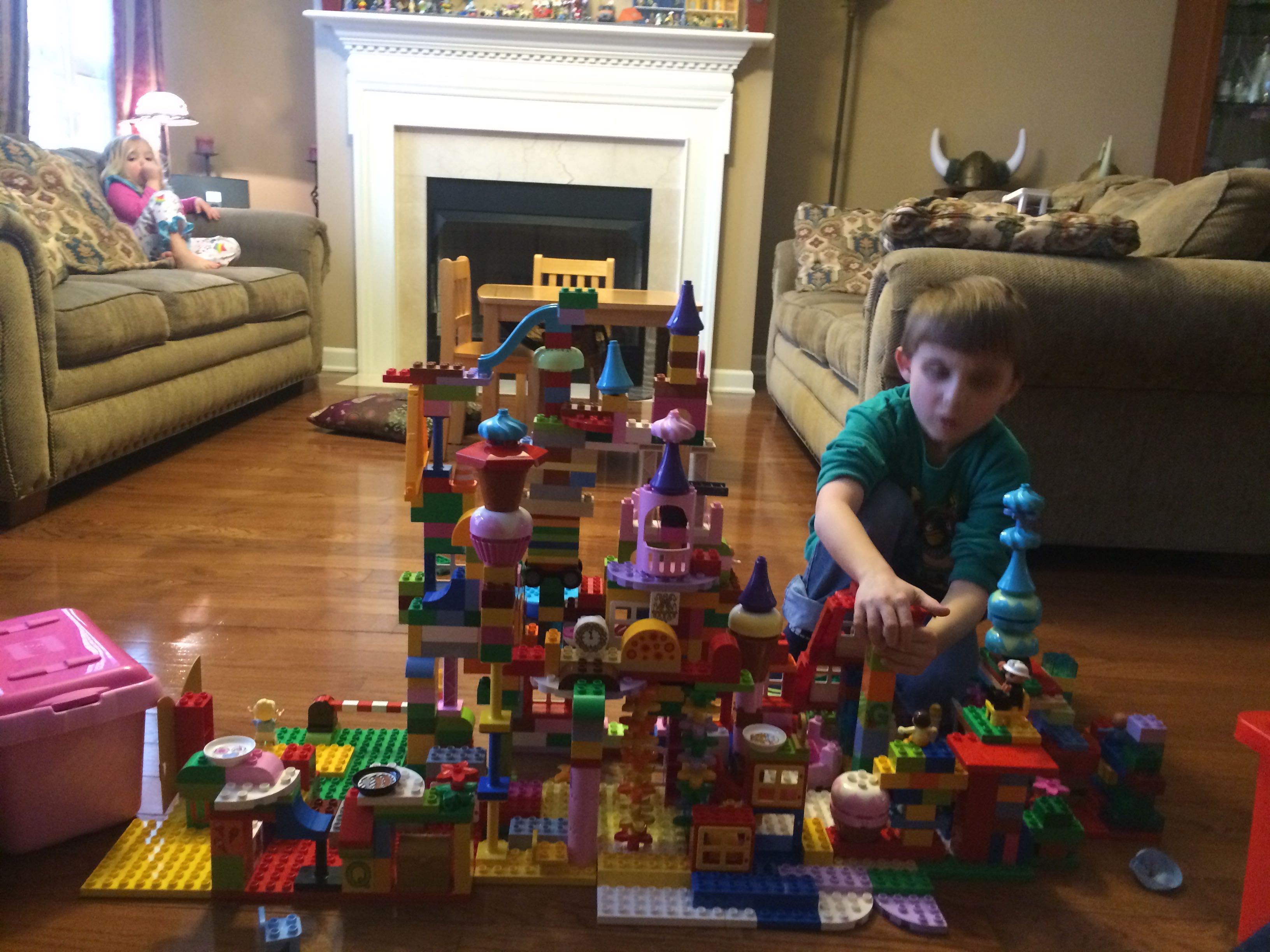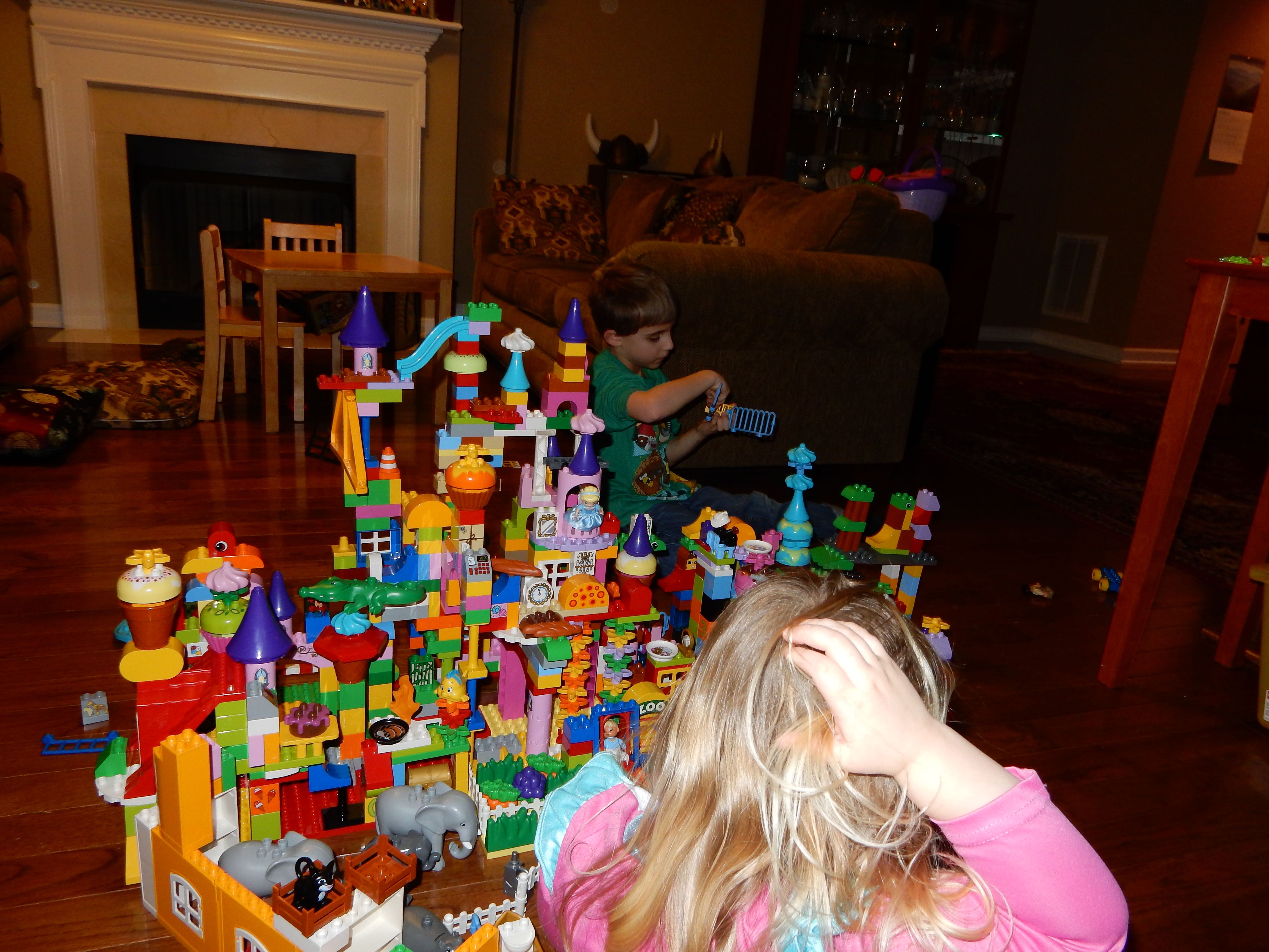 Gahhh! Just when we thought we were done with winter weather, it’s back with a vengeance. Everyone was home again today, as we waited for the big flakes to start falling. And, fall they did–once they got going, we ended up with a pretty significant amount of snow (on top of the re-frozen slushy mess from the last round!) We kept busy with more origami, baking a loaf of lemon bread, Play-Doh, and Duplos–oh, what we built with Duplos..! The kids made all sorts of things, but at some point in the late afternoon, we started building one large crazy castle together. I think the goal was simply to use all the bricks we could, and the result was pretty amazing! Plenty of fun activities like swings, slides, crazy stairs, hidden towers, etc. for all of the Duplo people were included in the castle, although I noticed that Cinderella and Ariel had ditched their princess skirts and absconded in the Zoo Plane.