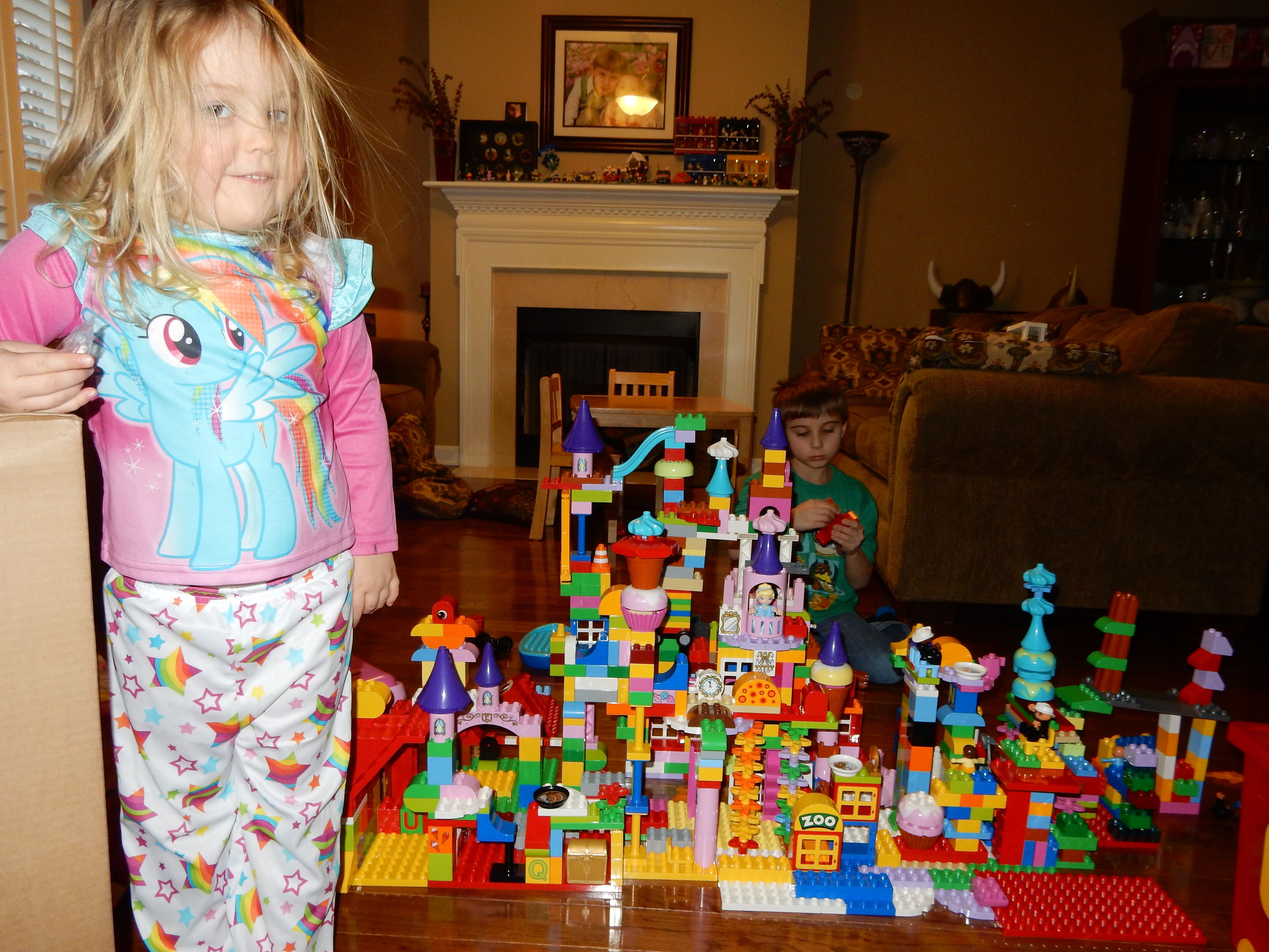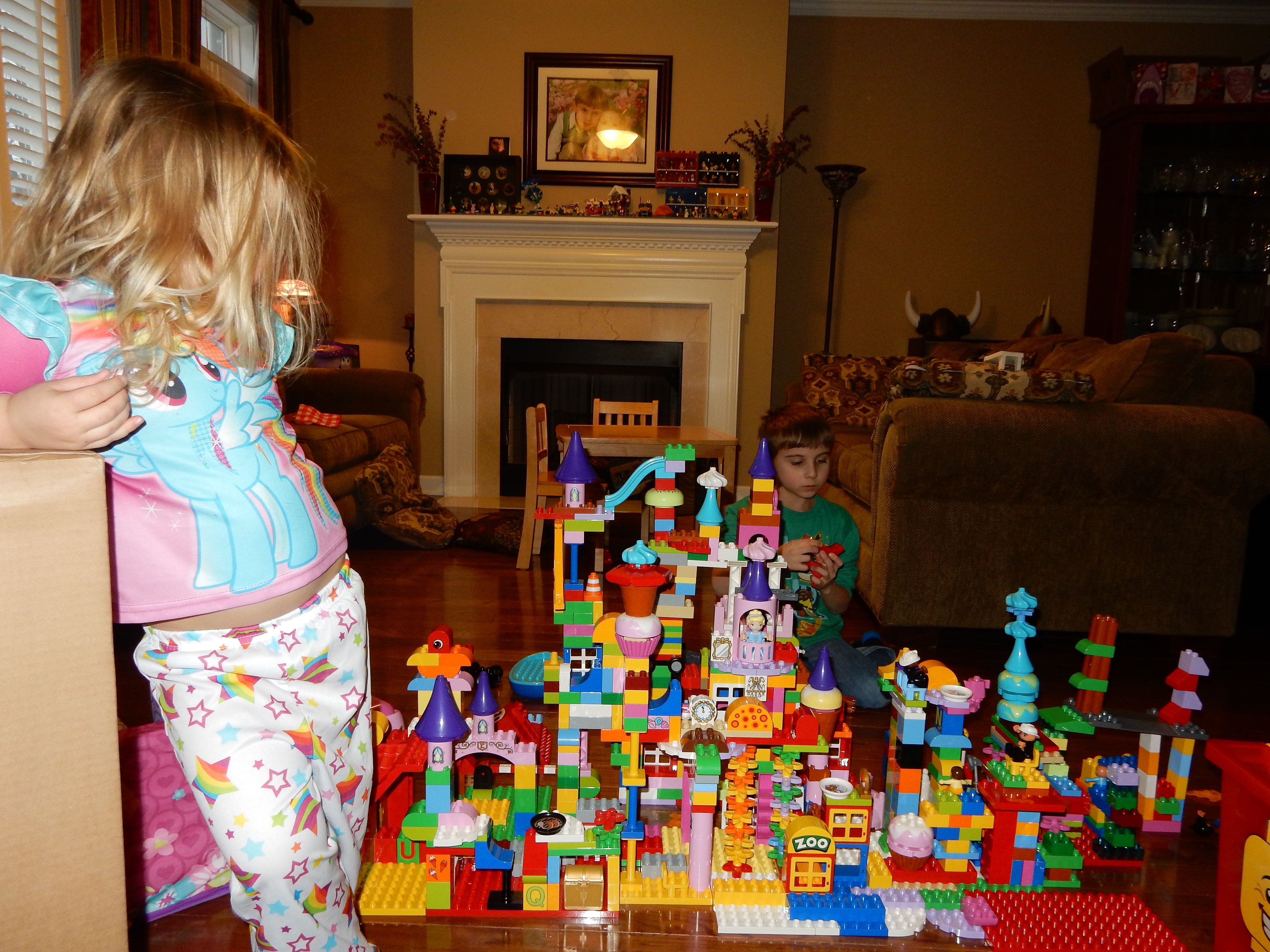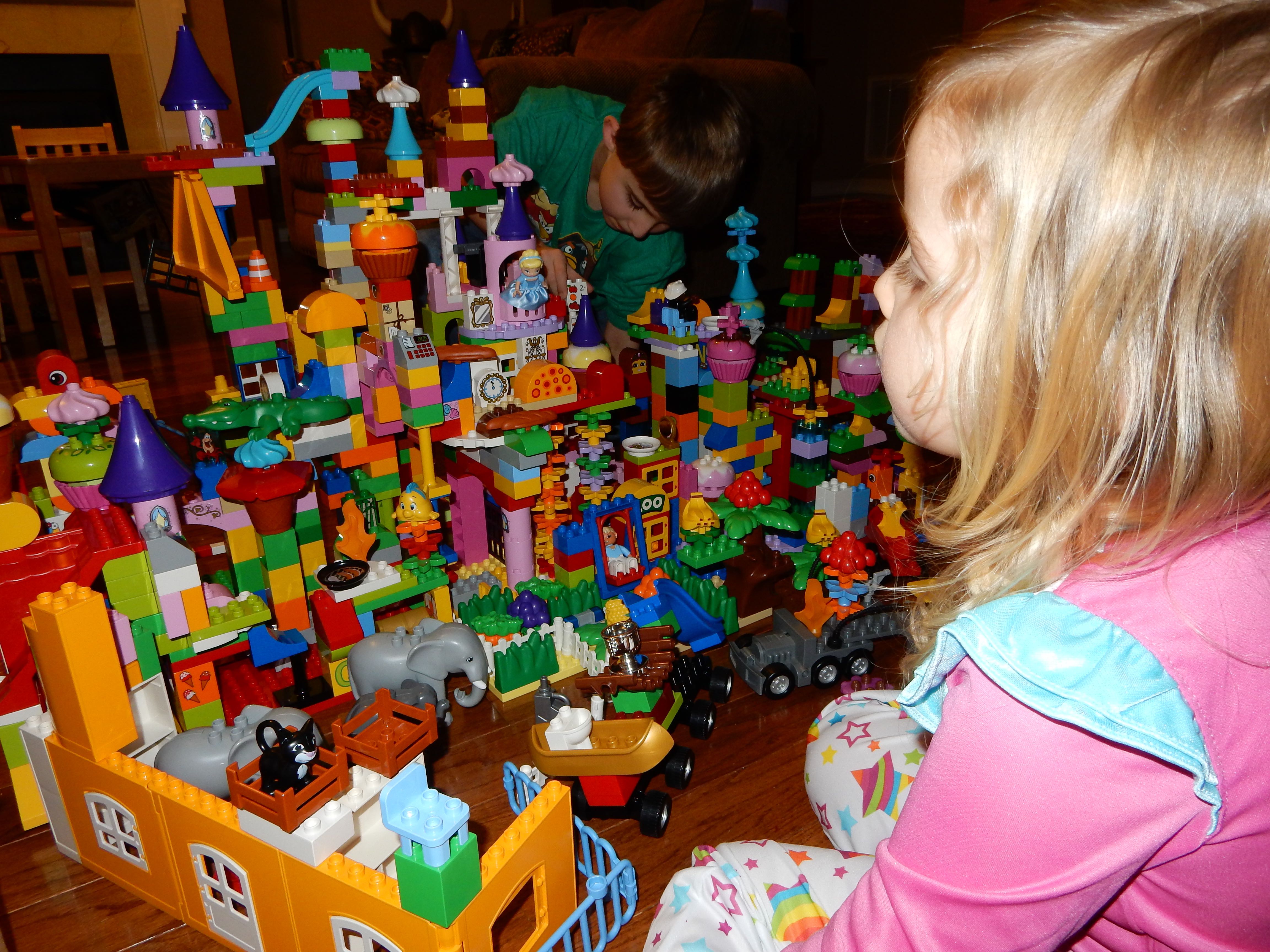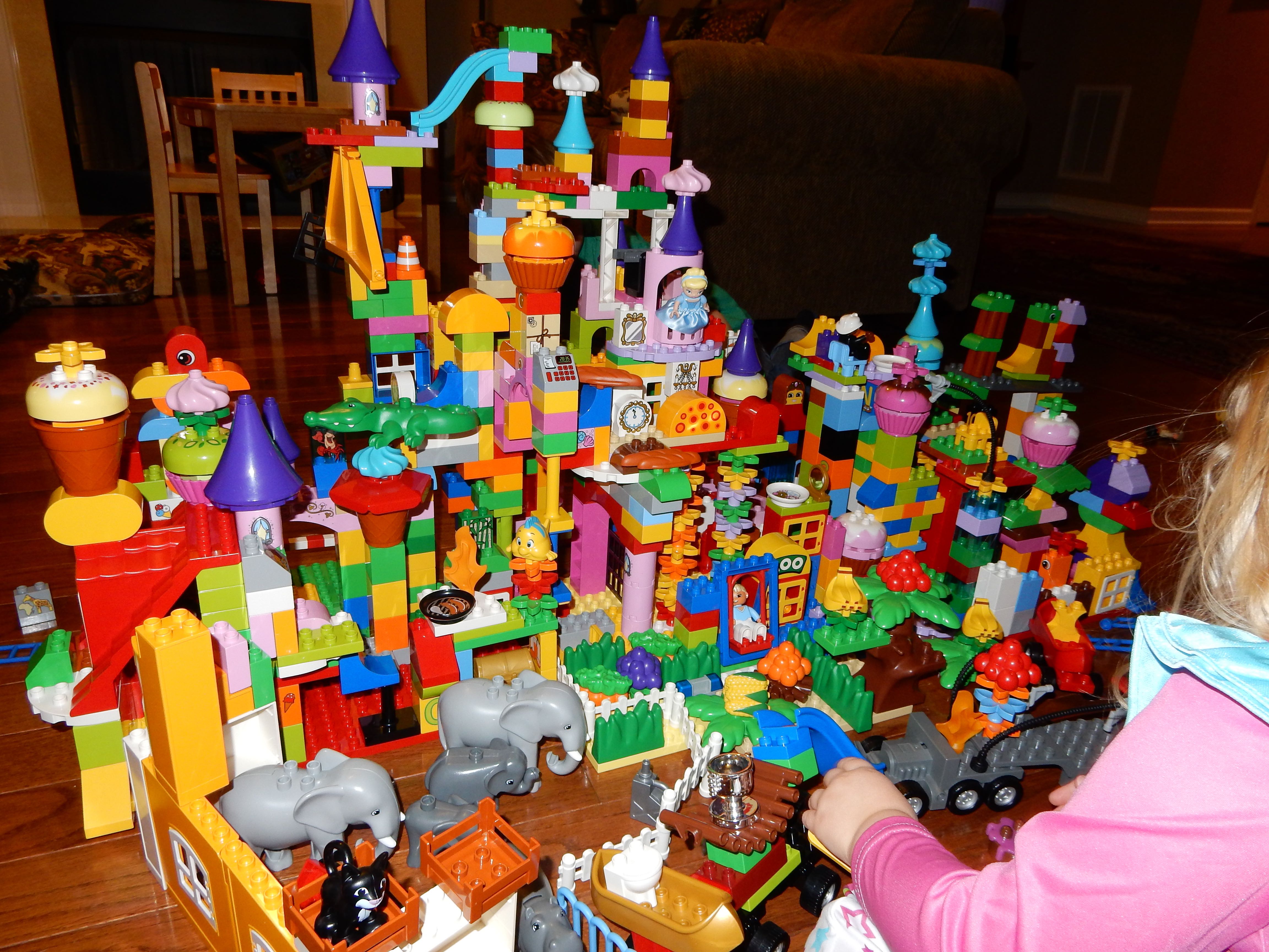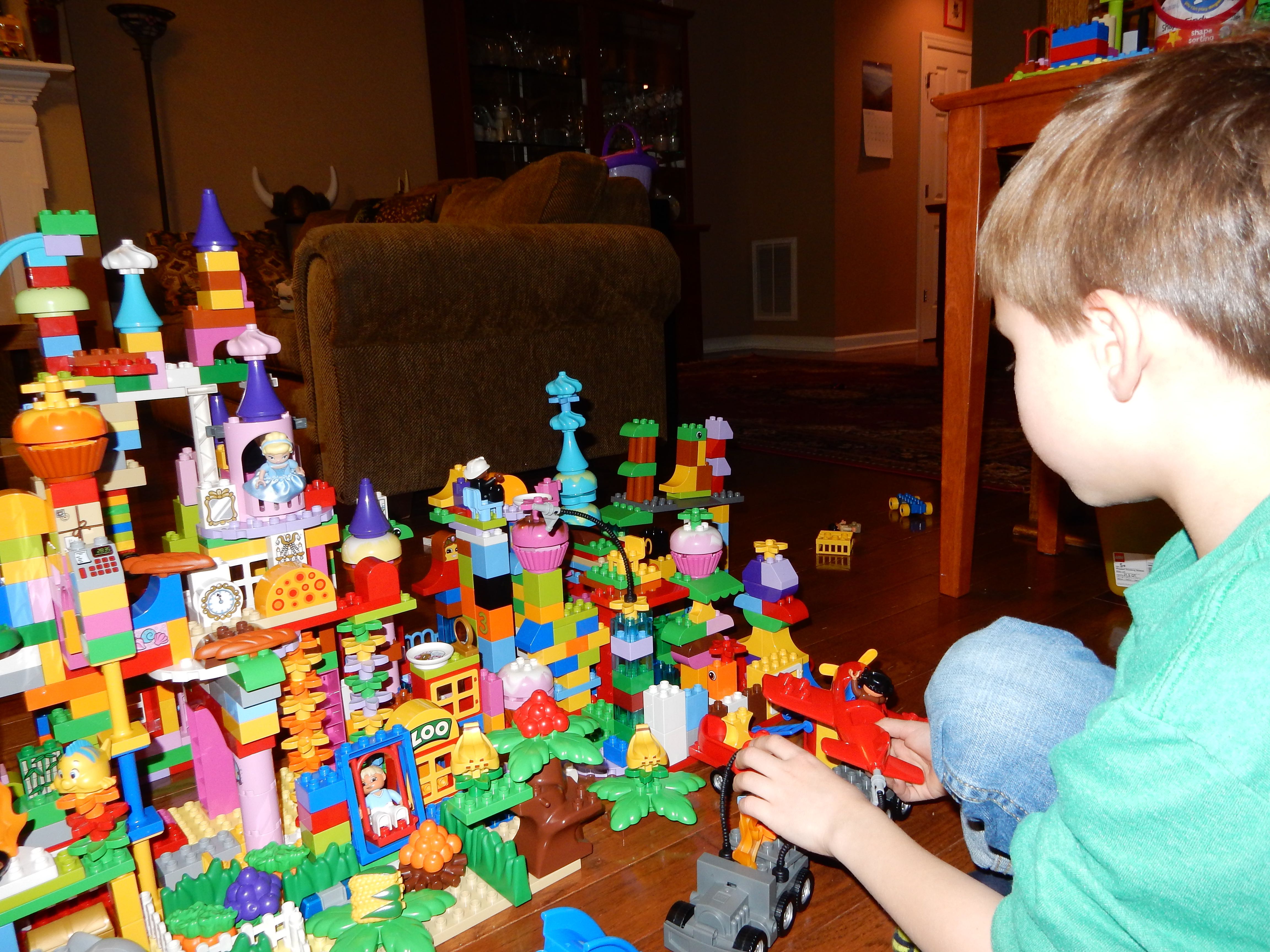 Gahhh! Just when we thought we were done with winter weather, it’s back with a vengeance. Everyone was home again today, as we waited for the big flakes to start falling. And, fall they did–once they got going, we ended up with a pretty significant amount of snow (on top of the re-frozen slushy mess from the last round!) We kept busy with more origami, baking a loaf of lemon bread, Play-Doh, and Duplos–oh, what we built with Duplos..! The kids made all sorts of things, but at some point in the late afternoon, we started building one large crazy castle together. I think the goal was simply to use all the bricks we could, and the result was pretty amazing! Plenty of fun activities like swings, slides, crazy stairs, hidden towers, etc. for all of the Duplo people were included in the castle, although I noticed that Cinderella and Ariel had ditched their princess skirts and absconded in the Zoo Plane.