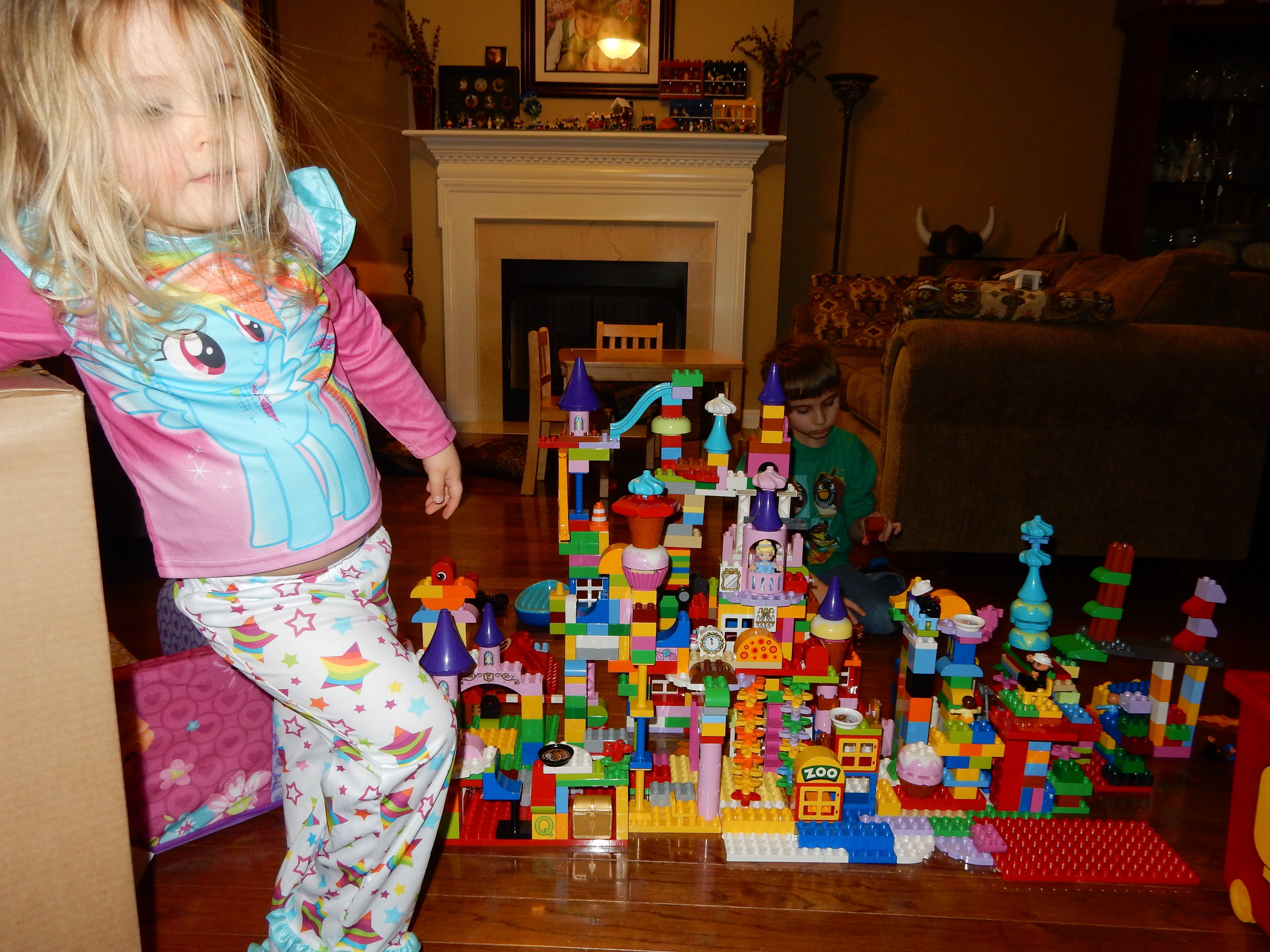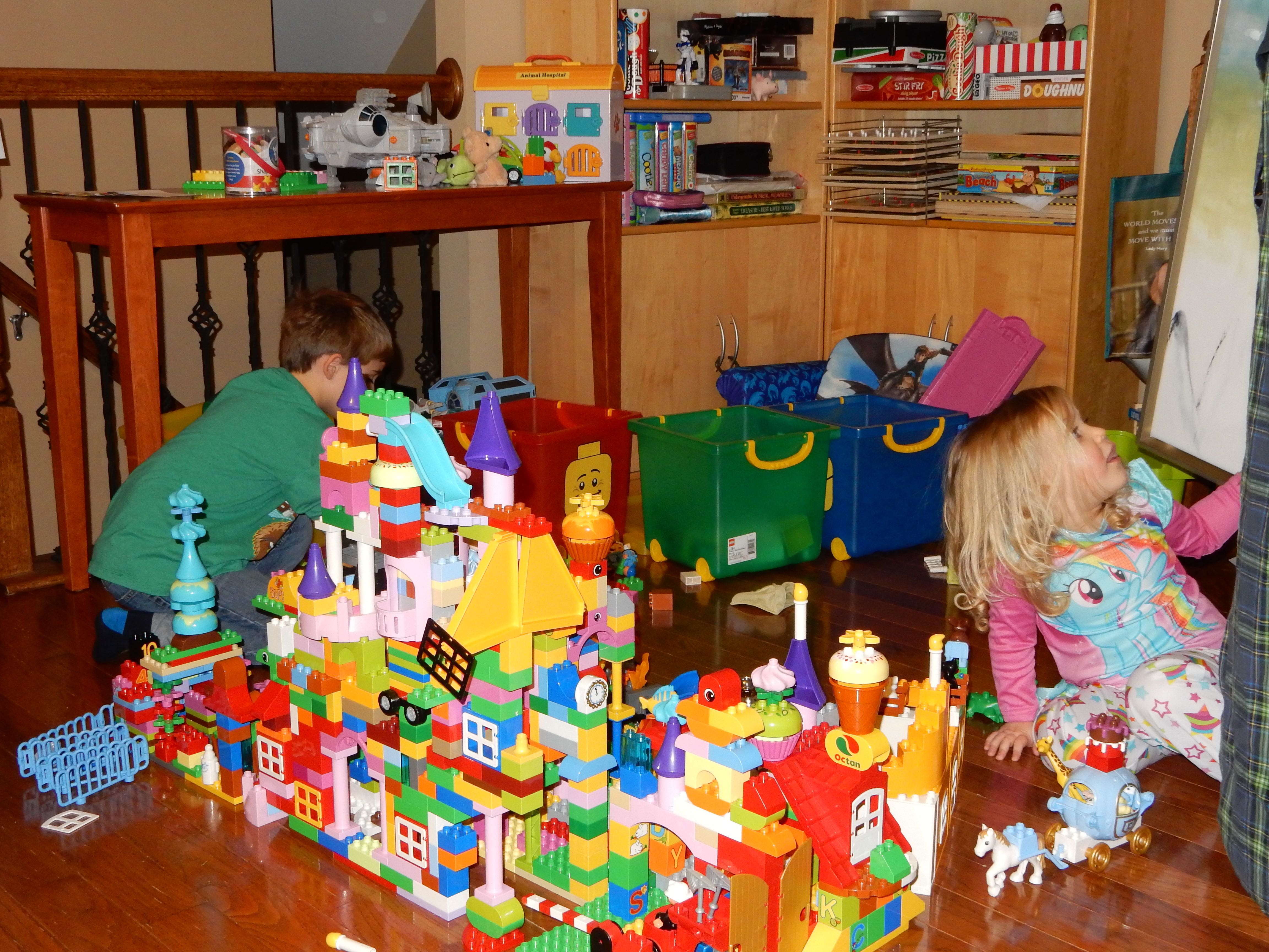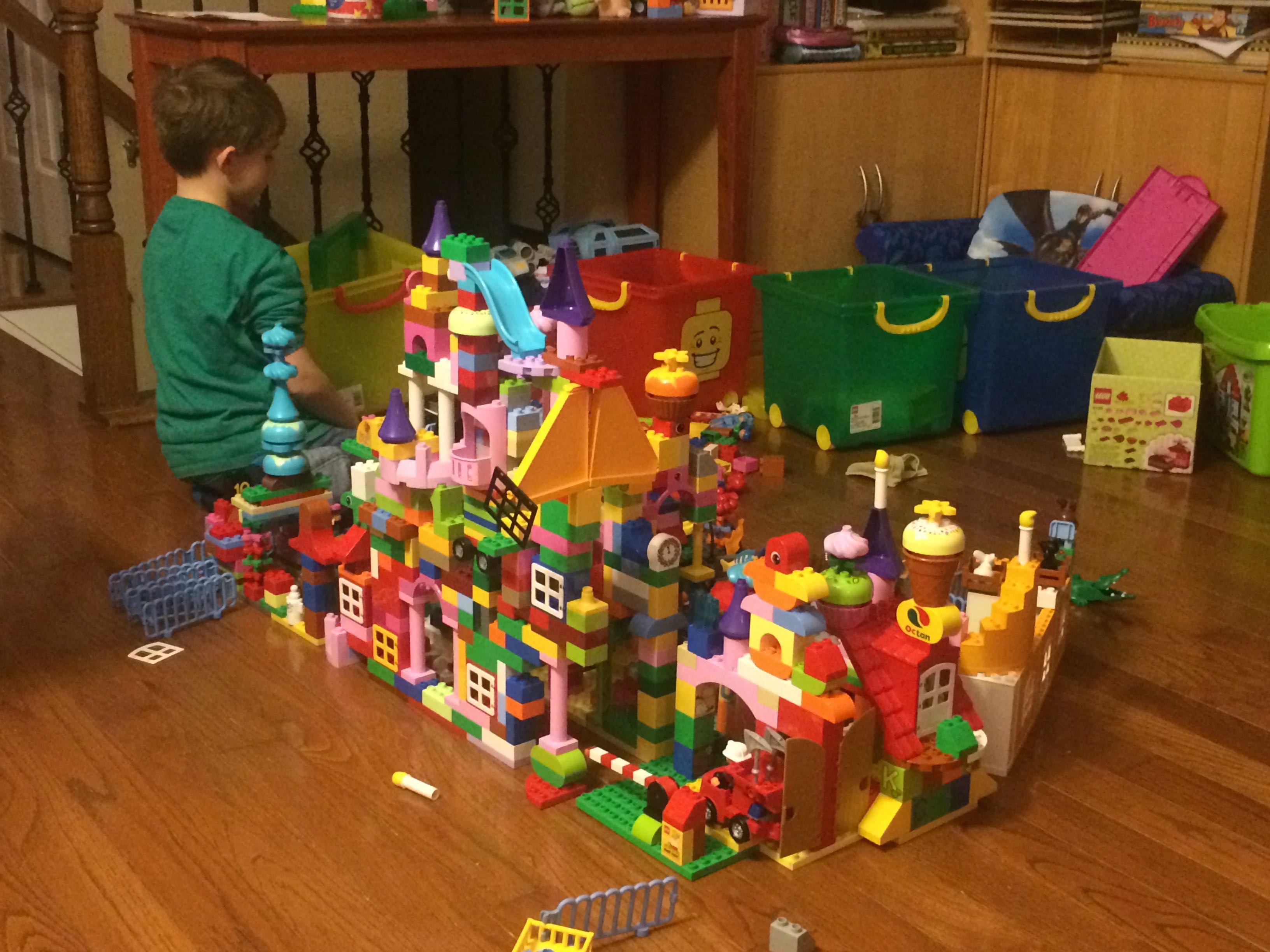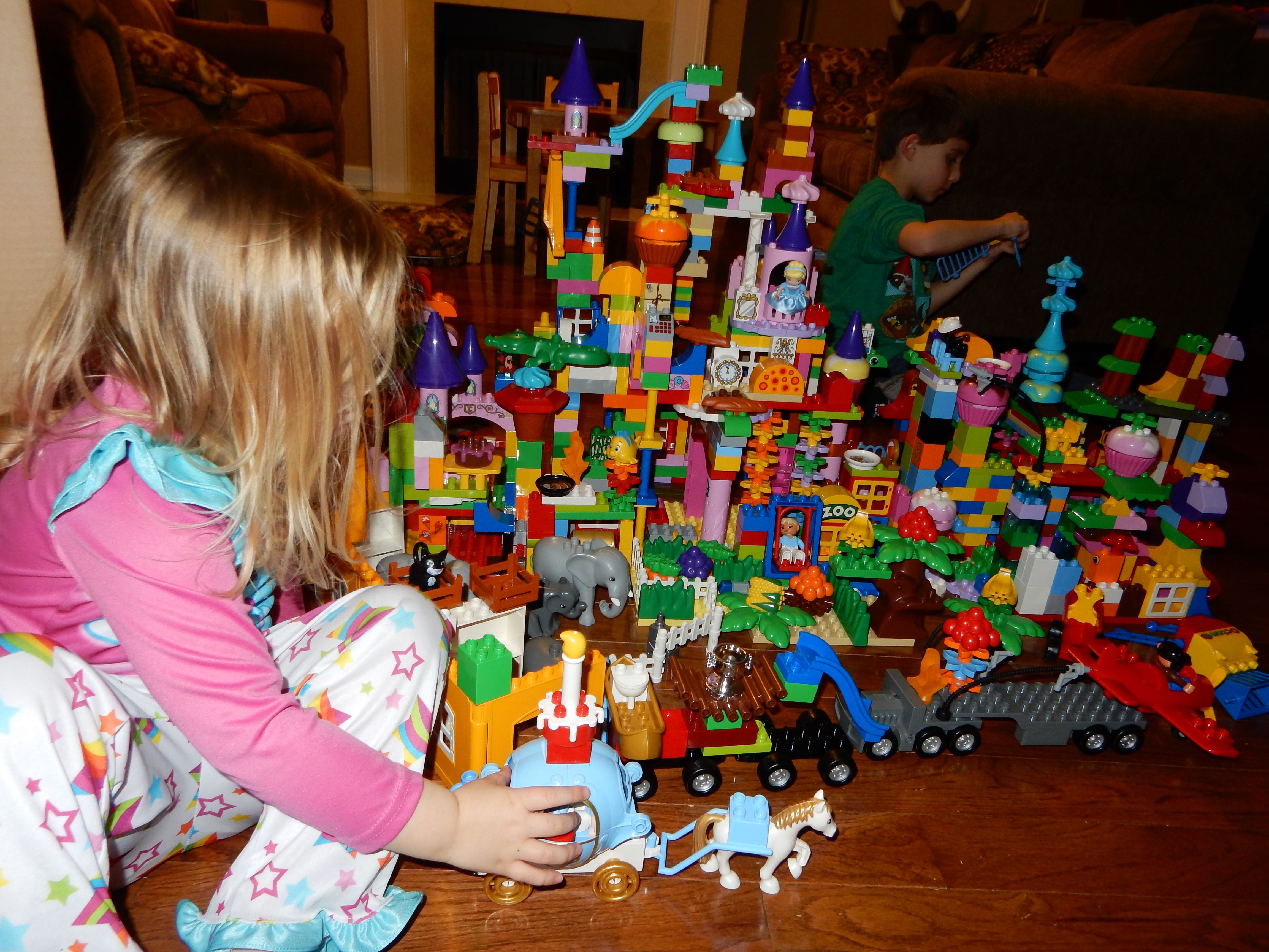 Gahhh! Just when we thought we were done with winter weather, it’s back with a vengeance. Everyone was home again today, as we waited for the big flakes to start falling. And, fall they did–once they got going, we ended up with a pretty significant amount of snow (on top of the re-frozen slushy mess from the last round!) We kept busy with more origami, baking a loaf of lemon bread, Play-Doh, and Duplos–oh, what we built with Duplos..! The kids made all sorts of things, but at some point in the late afternoon, we started building one large crazy castle together. I think the goal was simply to use all the bricks we could, and the result was pretty amazing! Plenty of fun activities like swings, slides, crazy stairs, hidden towers, etc. for all of the Duplo people were included in the castle, although I noticed that Cinderella and Ariel had ditched their princess skirts and absconded in the Zoo Plane.