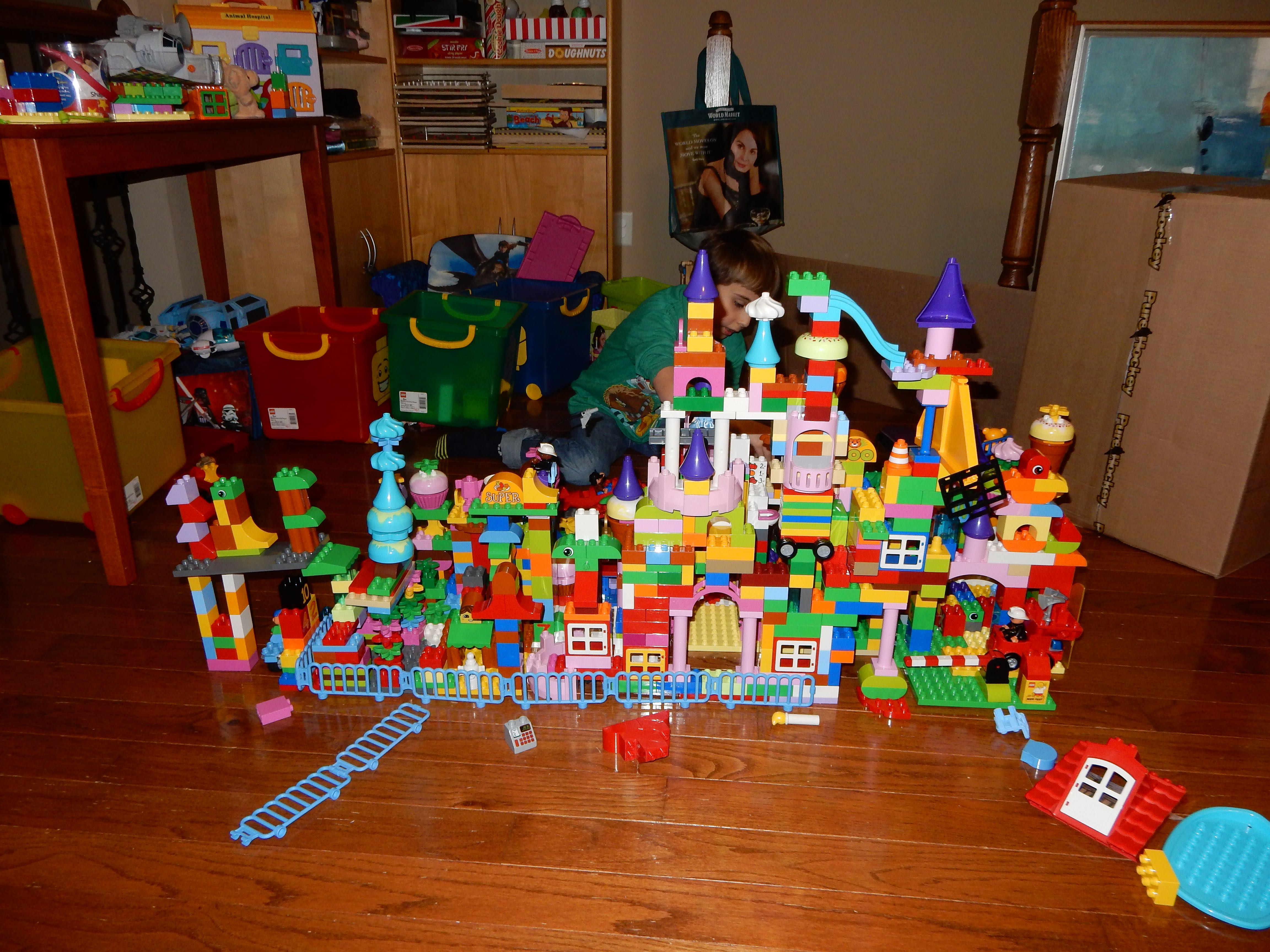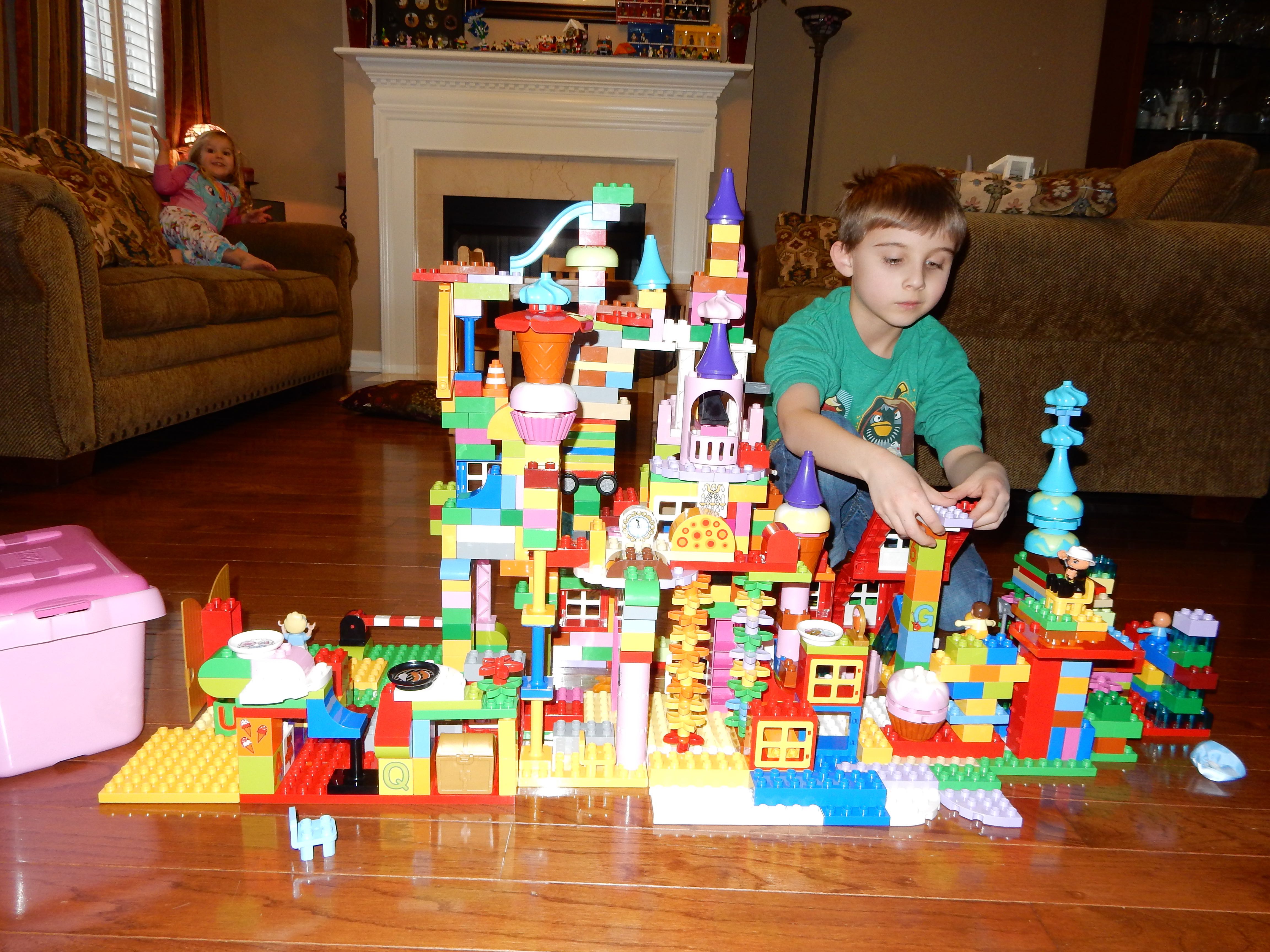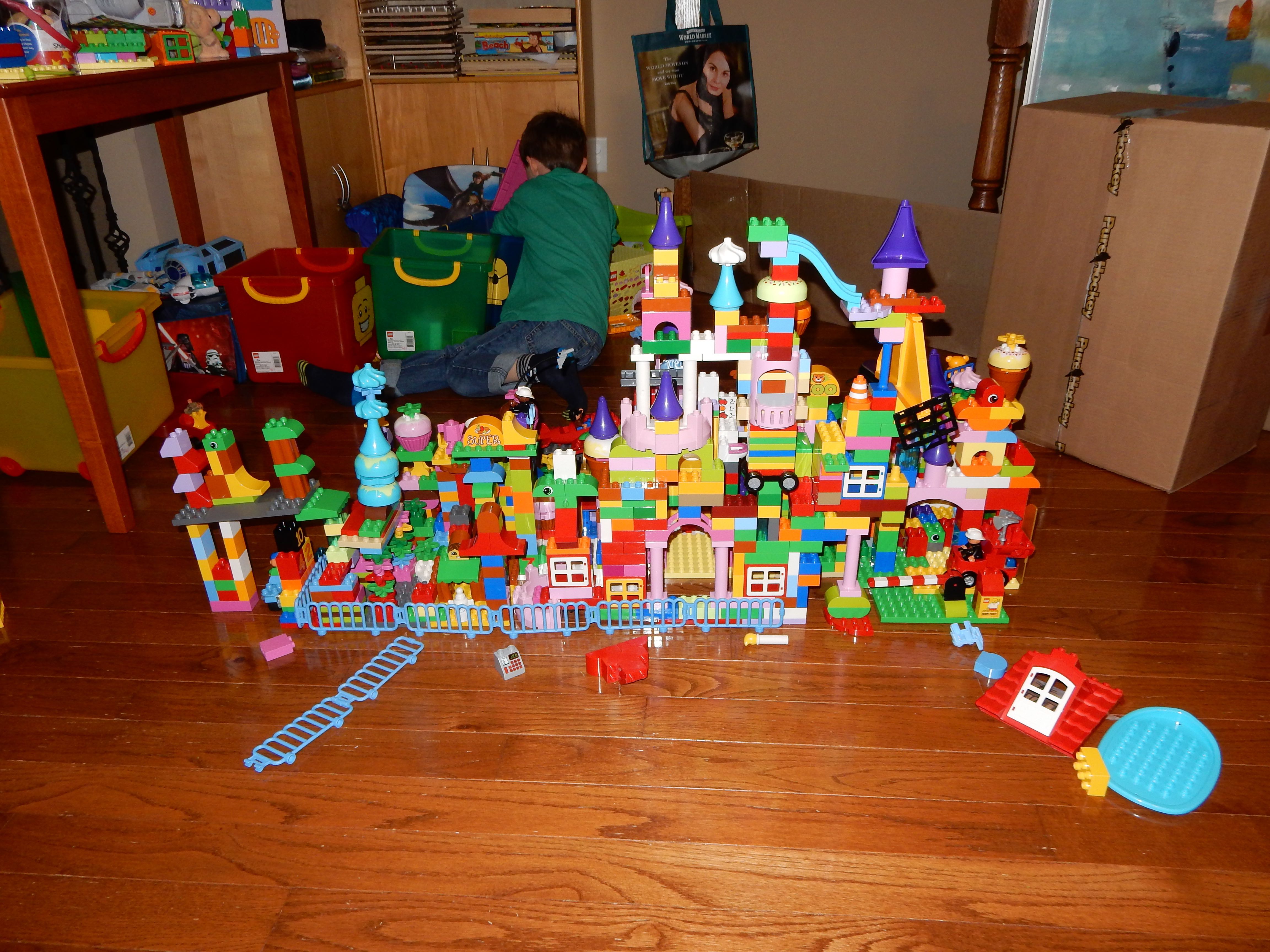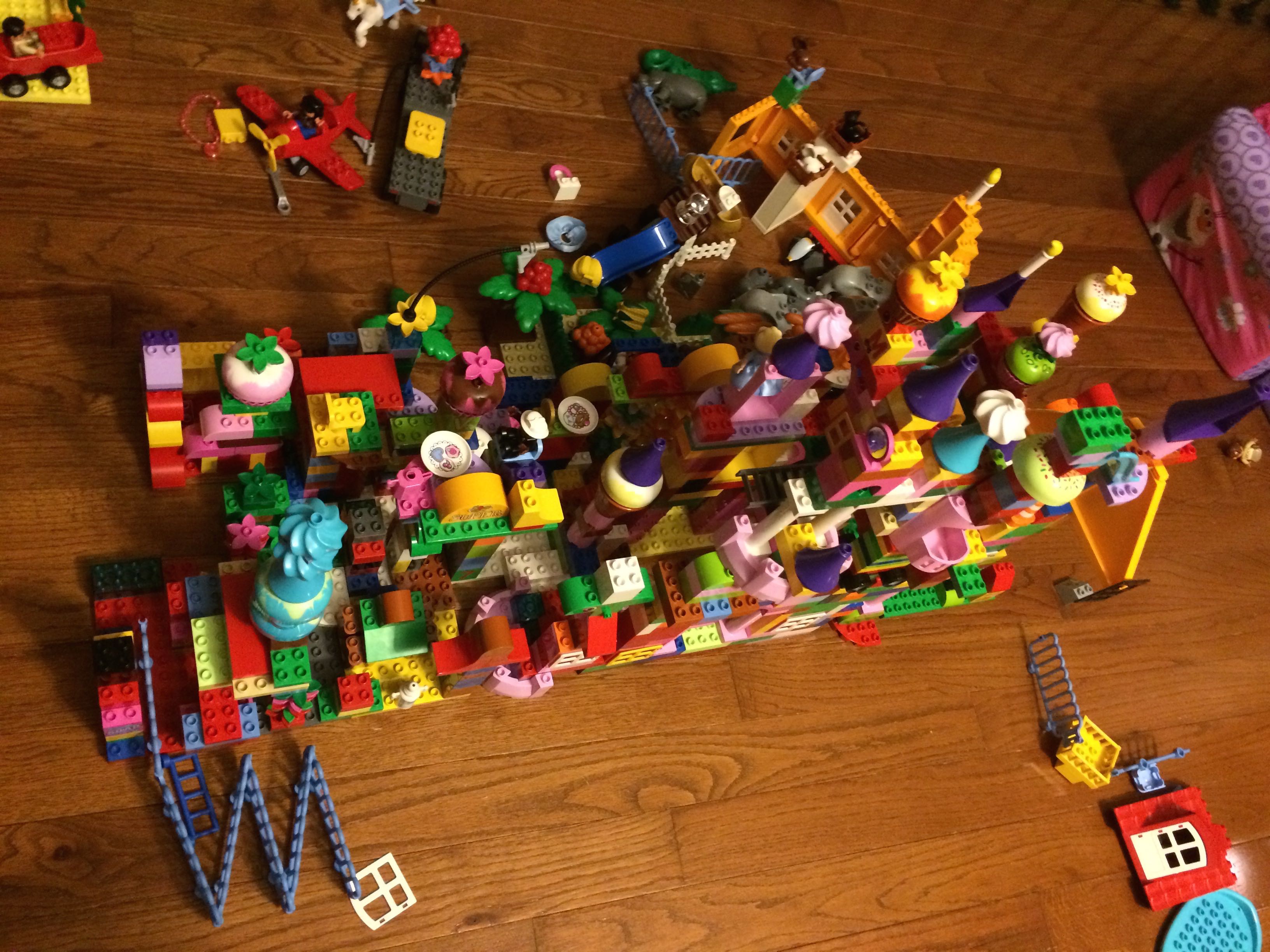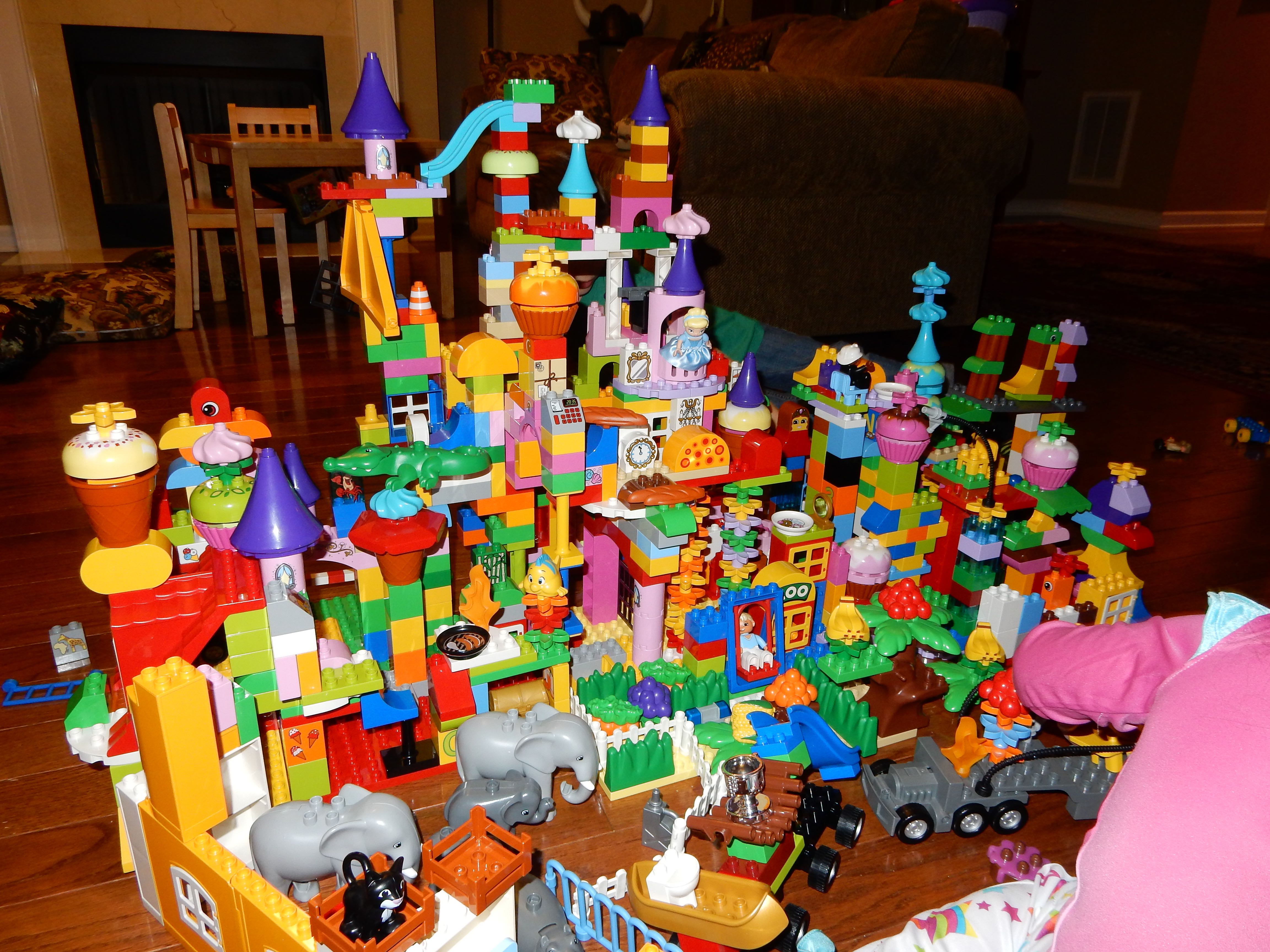 Gahhh! Just when we thought we were done with winter weather, it’s back with a vengeance. Everyone was home again today, as we waited for the big flakes to start falling. And, fall they did–once they got going, we ended up with a pretty significant amount of snow (on top of the re-frozen slushy mess from the last round!) We kept busy with more origami, baking a loaf of lemon bread, Play-Doh, and Duplos–oh, what we built with Duplos..! The kids made all sorts of things, but at some point in the late afternoon, we started building one large crazy castle together. I think the goal was simply to use all the bricks we could, and the result was pretty amazing! Plenty of fun activities like swings, slides, crazy stairs, hidden towers, etc. for all of the Duplo people were included in the castle, although I noticed that Cinderella and Ariel had ditched their princess skirts and absconded in the Zoo Plane.