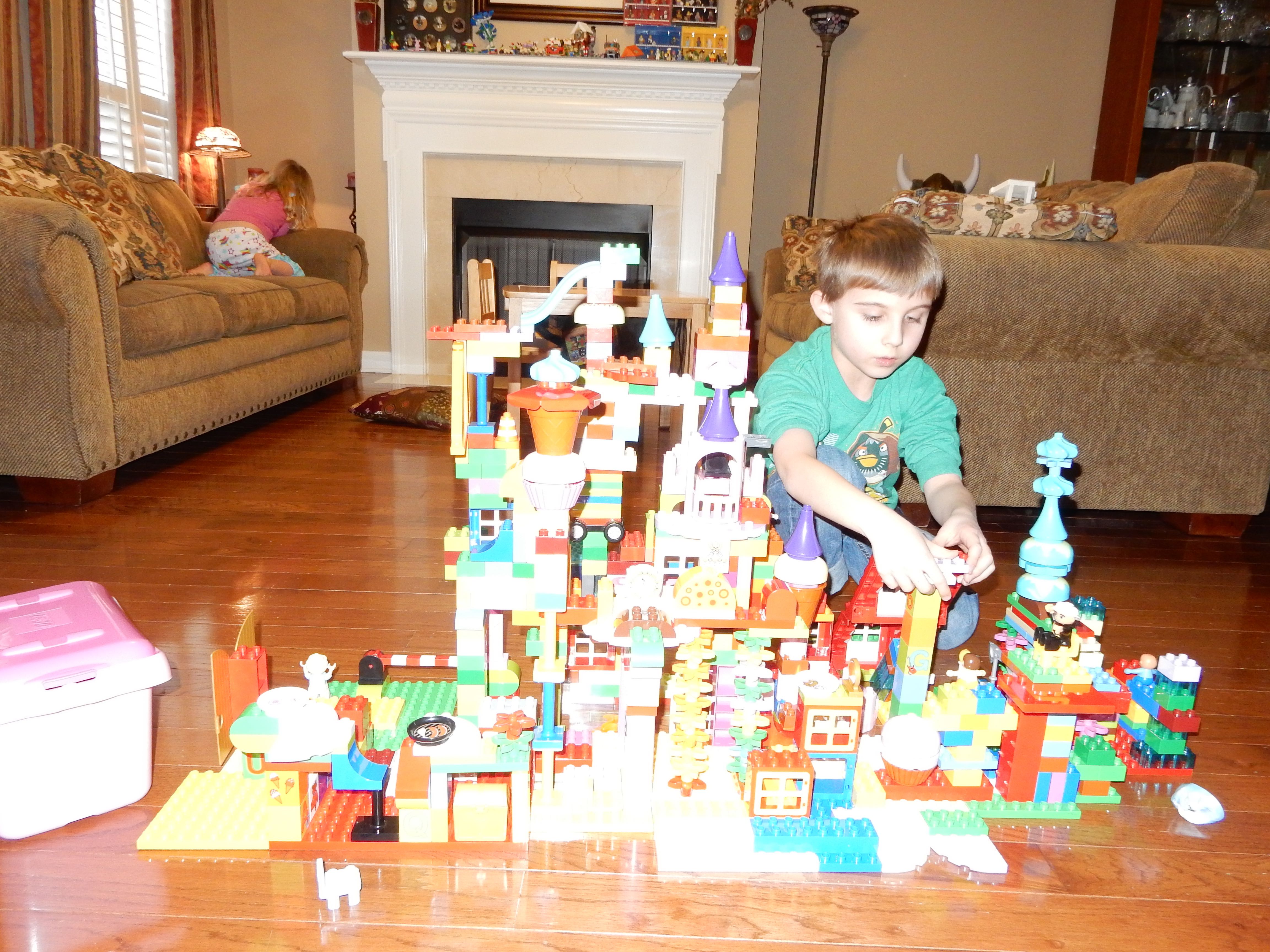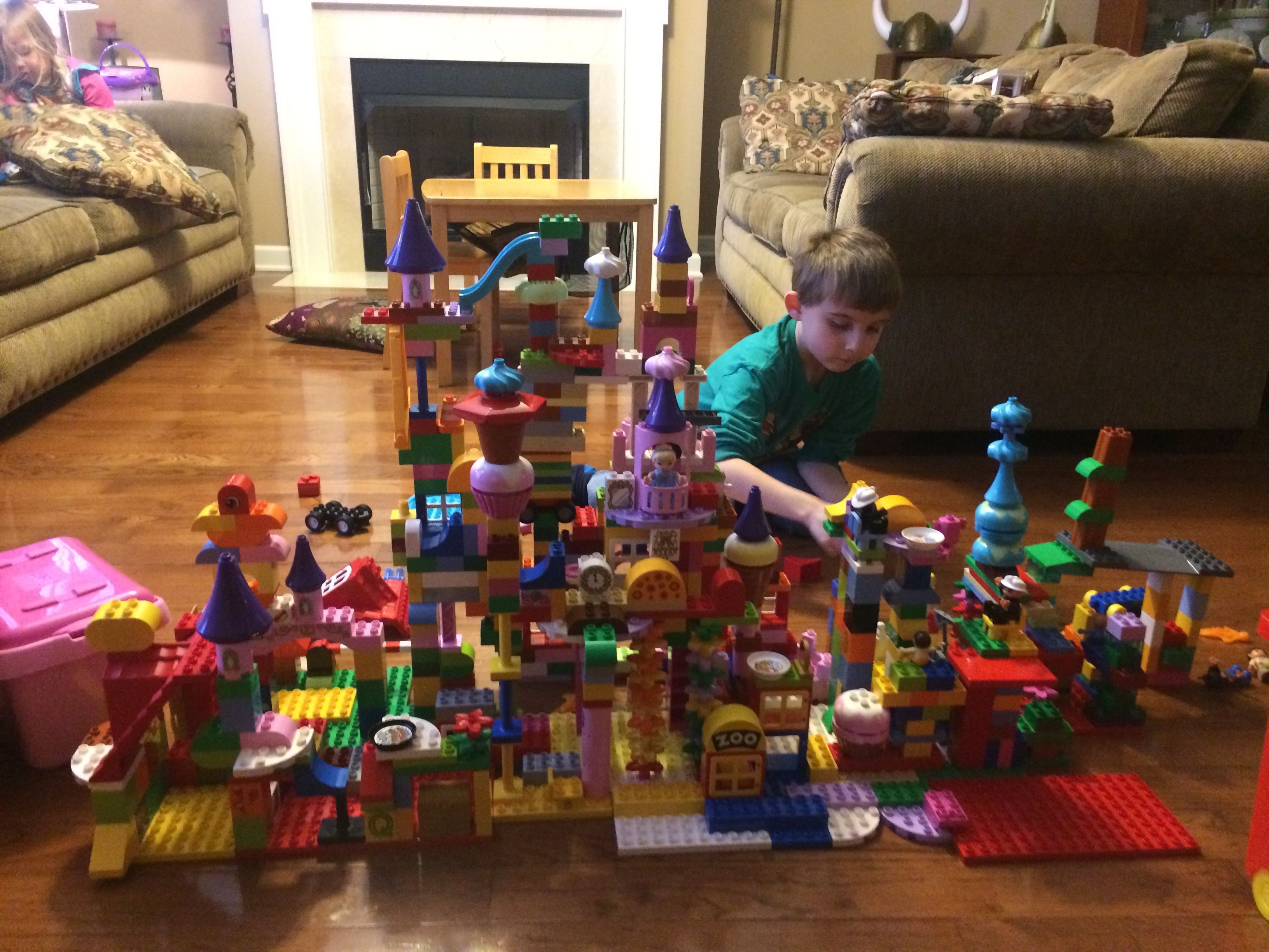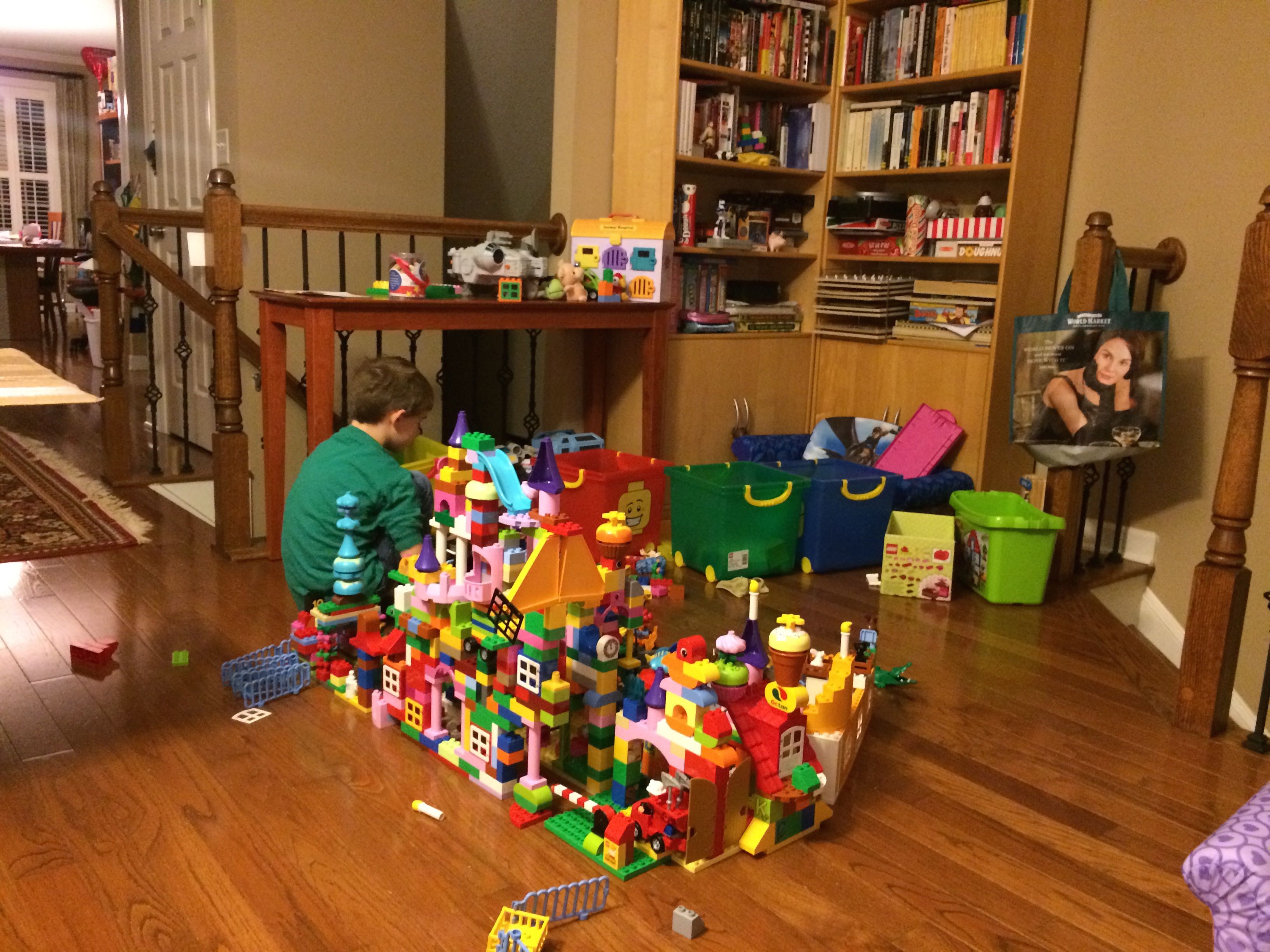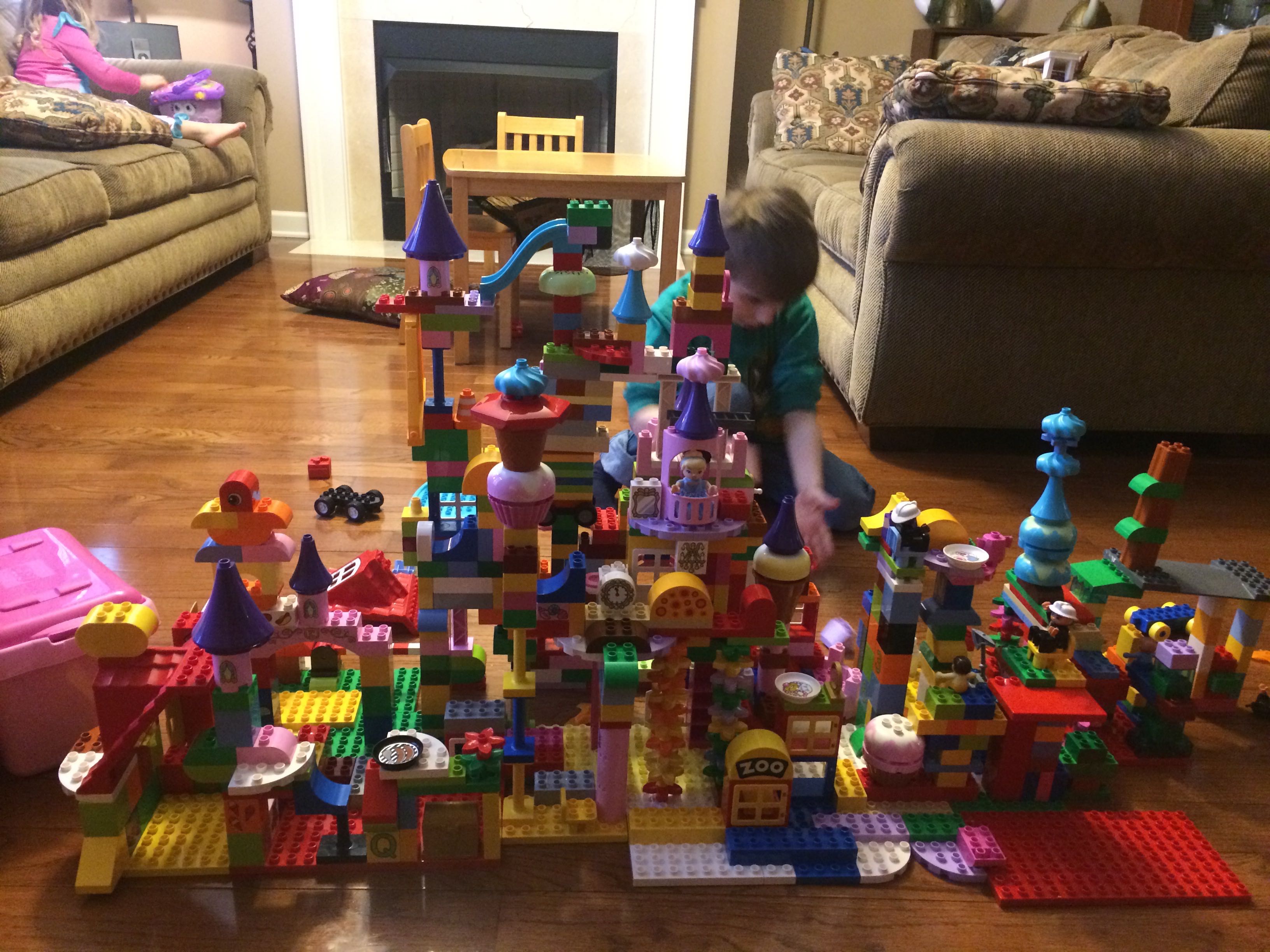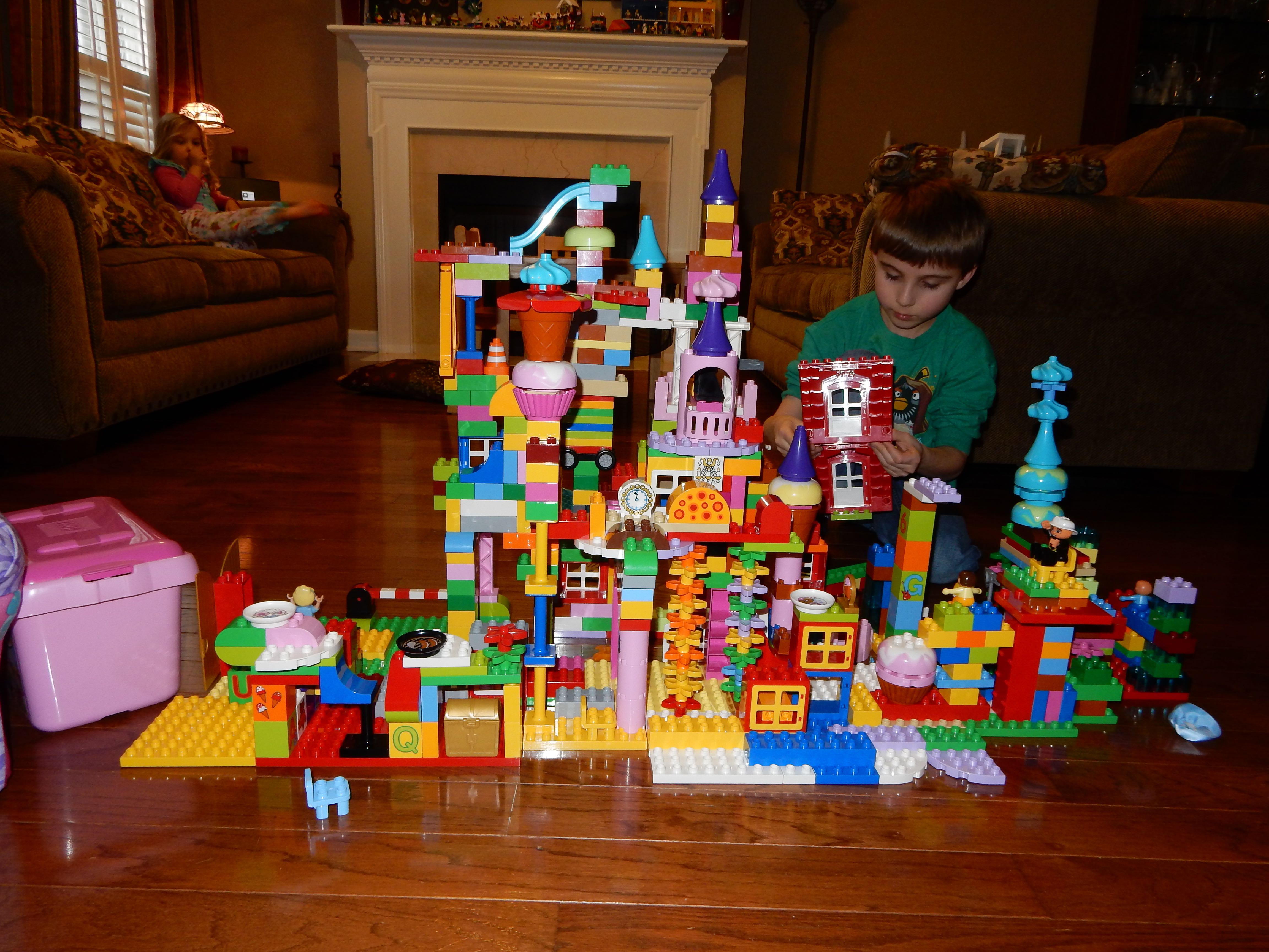 Gahhh! Just when we thought we were done with winter weather, it’s back with a vengeance. Everyone was home again today, as we waited for the big flakes to start falling. And, fall they did–once they got going, we ended up with a pretty significant amount of snow (on top of the re-frozen slushy mess from the last round!) We kept busy with more origami, baking a loaf of lemon bread, Play-Doh, and Duplos–oh, what we built with Duplos..! The kids made all sorts of things, but at some point in the late afternoon, we started building one large crazy castle together. I think the goal was simply to use all the bricks we could, and the result was pretty amazing! Plenty of fun activities like swings, slides, crazy stairs, hidden towers, etc. for all of the Duplo people were included in the castle, although I noticed that Cinderella and Ariel had ditched their princess skirts and absconded in the Zoo Plane.