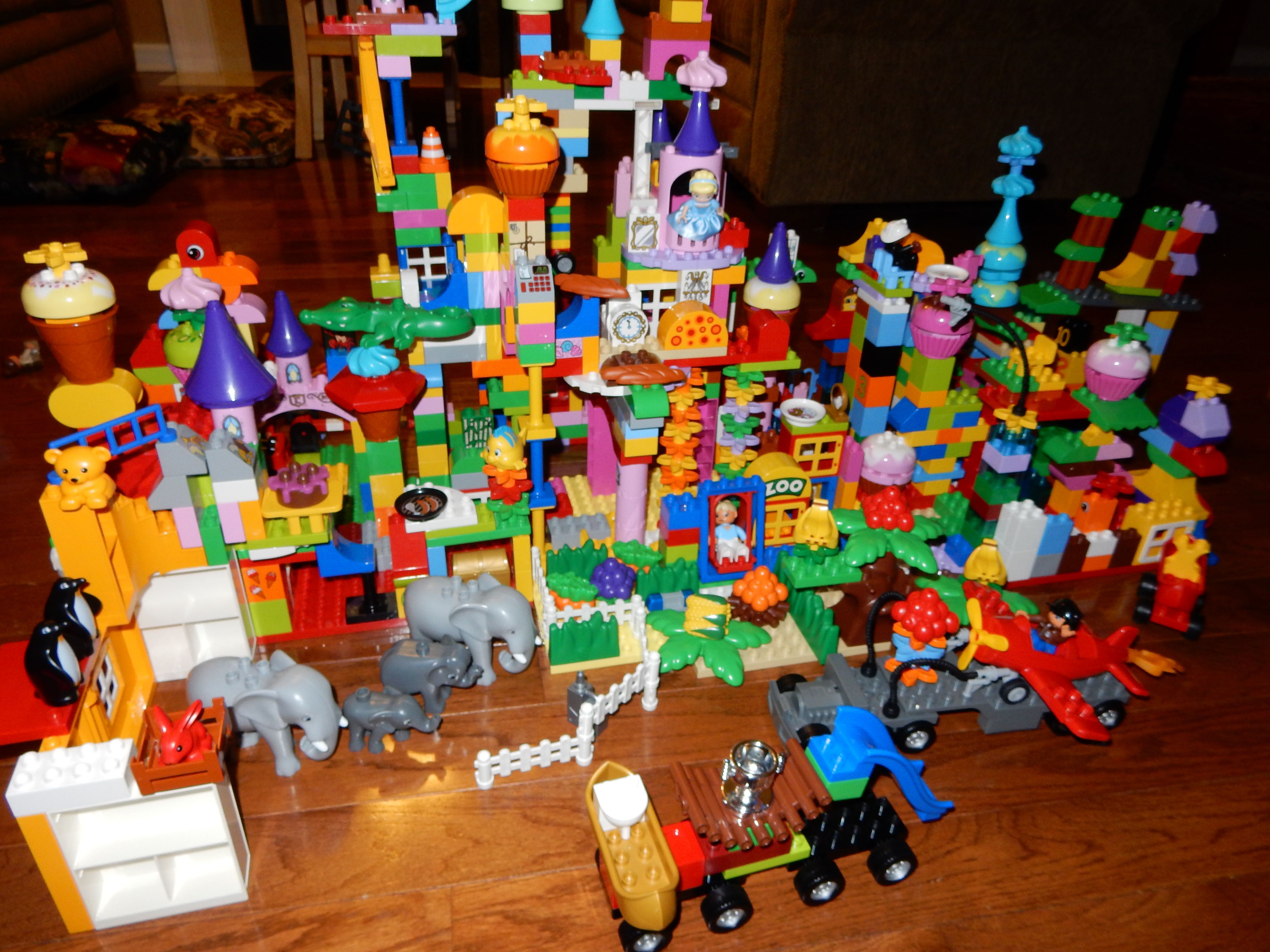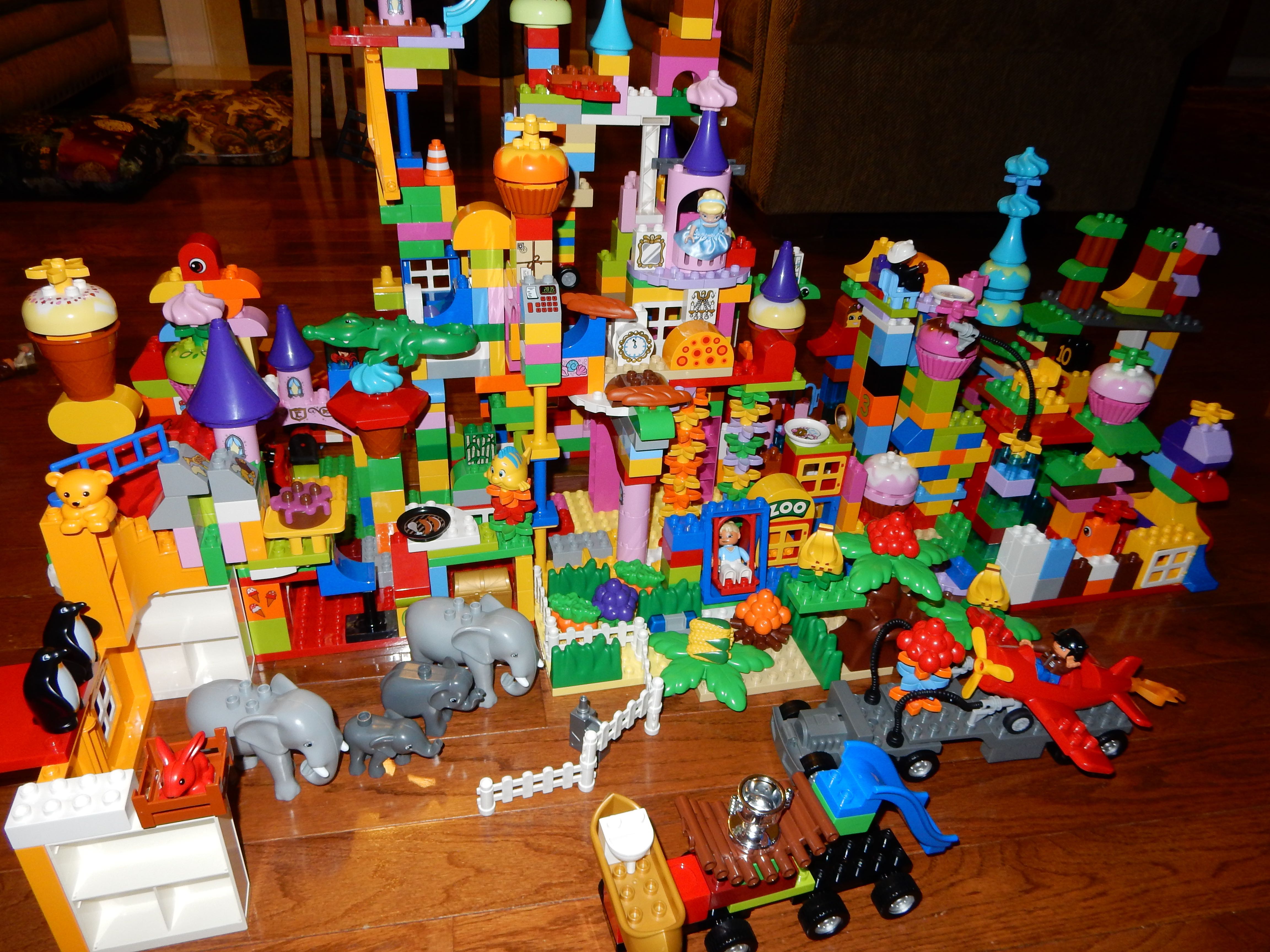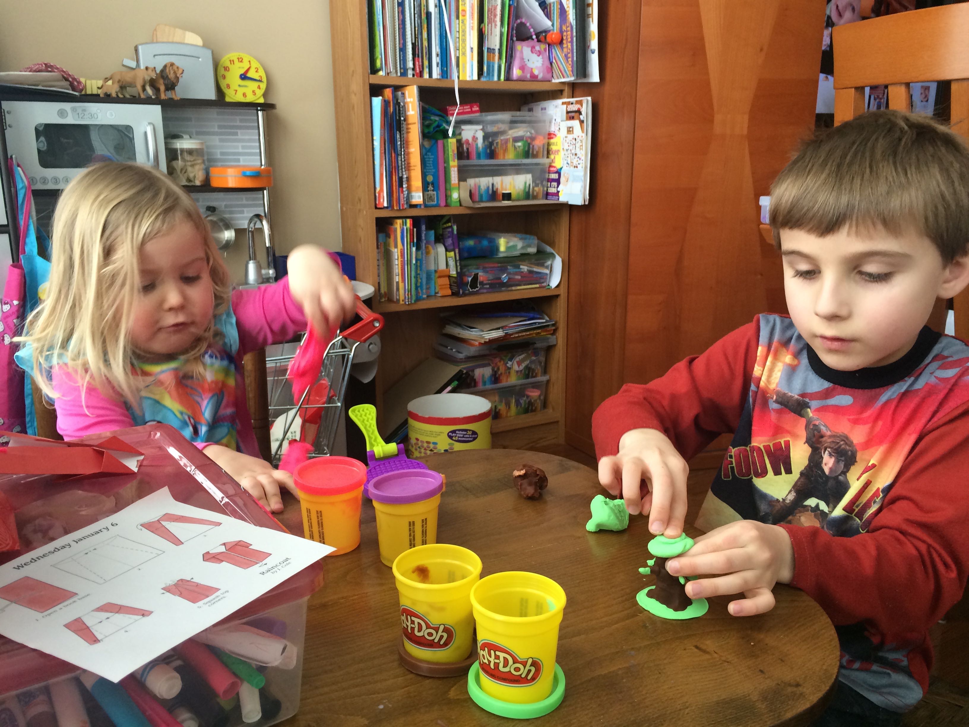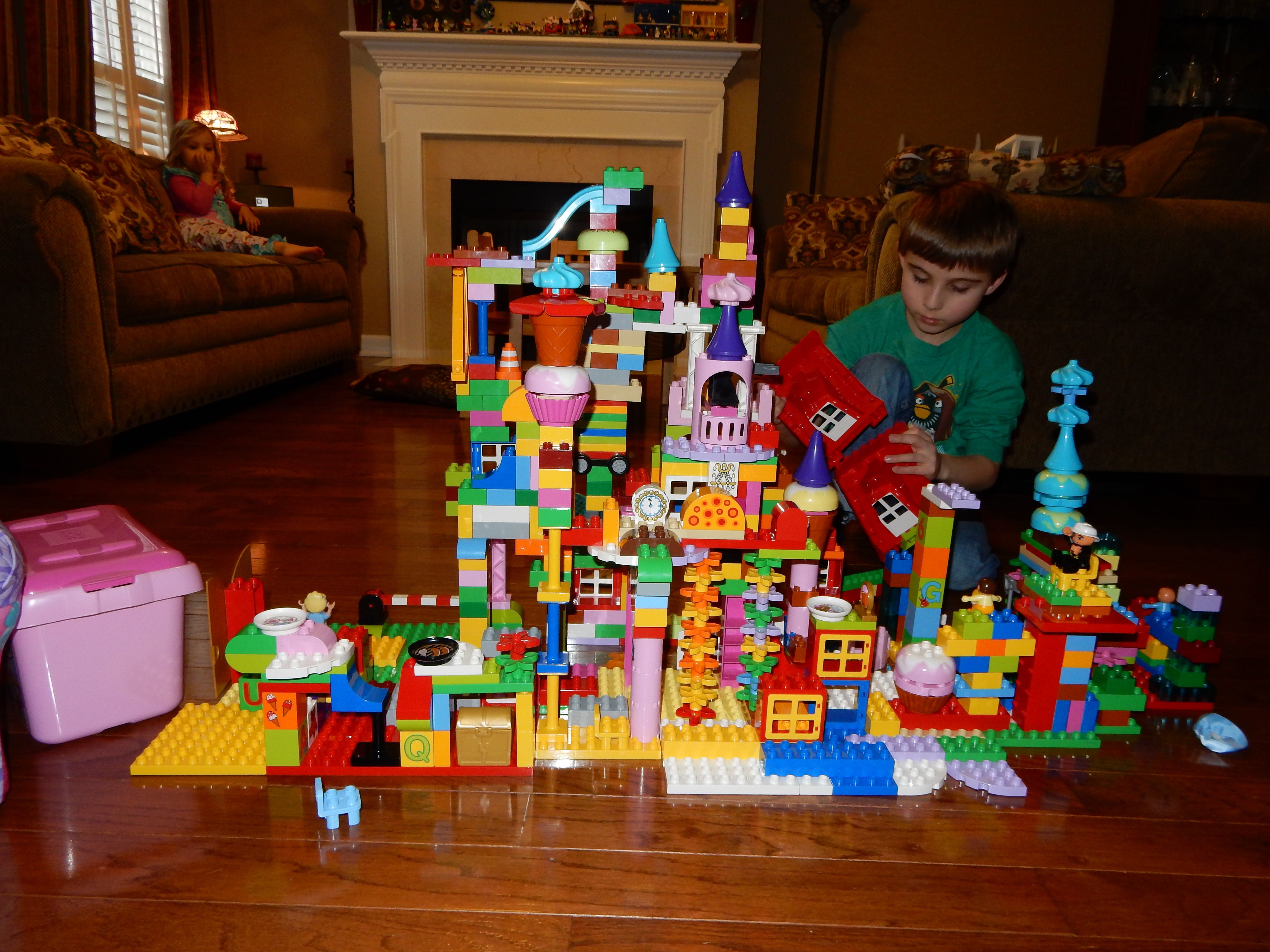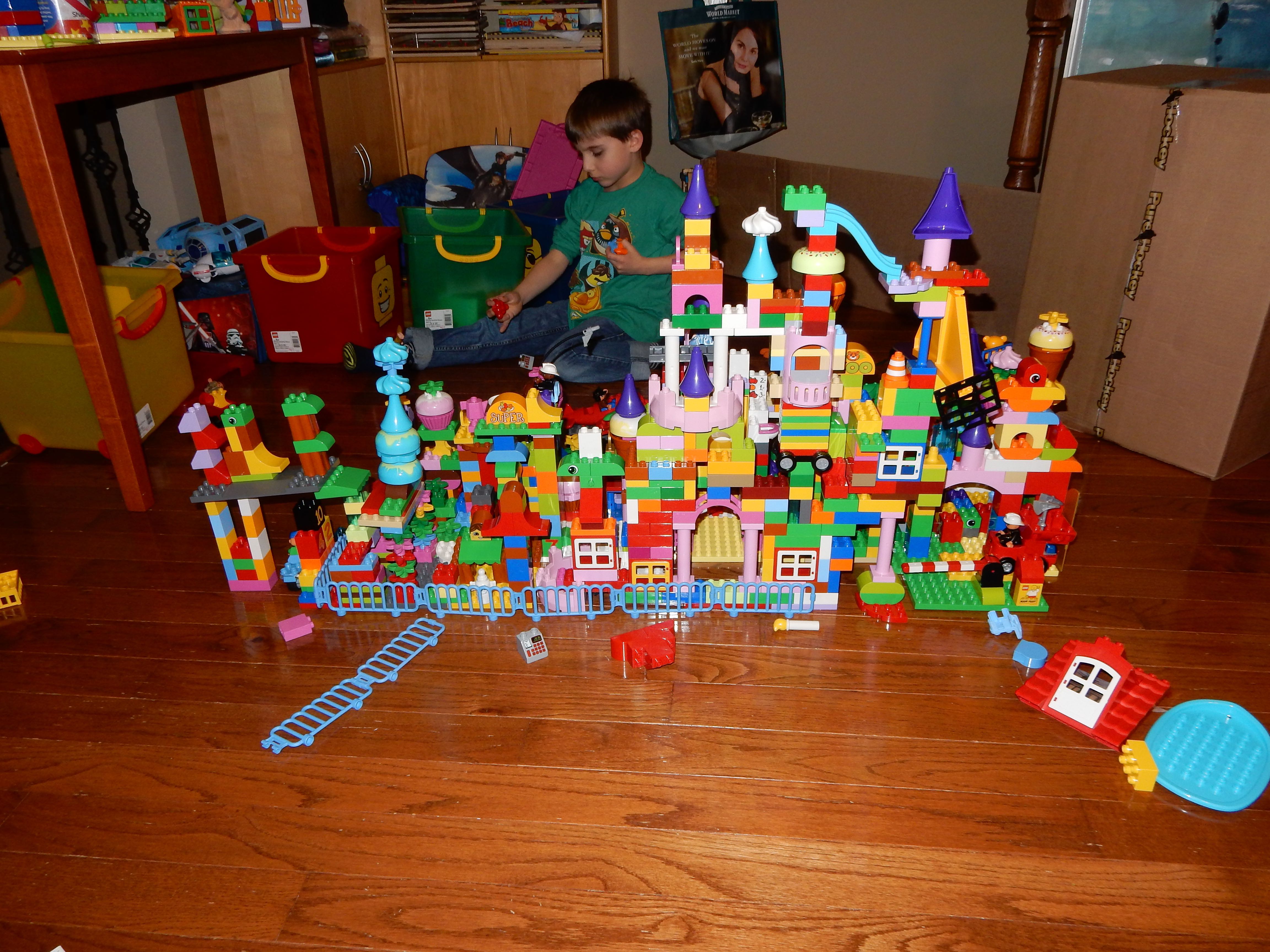 Gahhh! Just when we thought we were done with winter weather, it’s back with a vengeance. Everyone was home again today, as we waited for the big flakes to start falling. And, fall they did–once they got going, we ended up with a pretty significant amount of snow (on top of the re-frozen slushy mess from the last round!) We kept busy with more origami, baking a loaf of lemon bread, Play-Doh, and Duplos–oh, what we built with Duplos..! The kids made all sorts of things, but at some point in the late afternoon, we started building one large crazy castle together. I think the goal was simply to use all the bricks we could, and the result was pretty amazing! Plenty of fun activities like swings, slides, crazy stairs, hidden towers, etc. for all of the Duplo people were included in the castle, although I noticed that Cinderella and Ariel had ditched their princess skirts and absconded in the Zoo Plane.