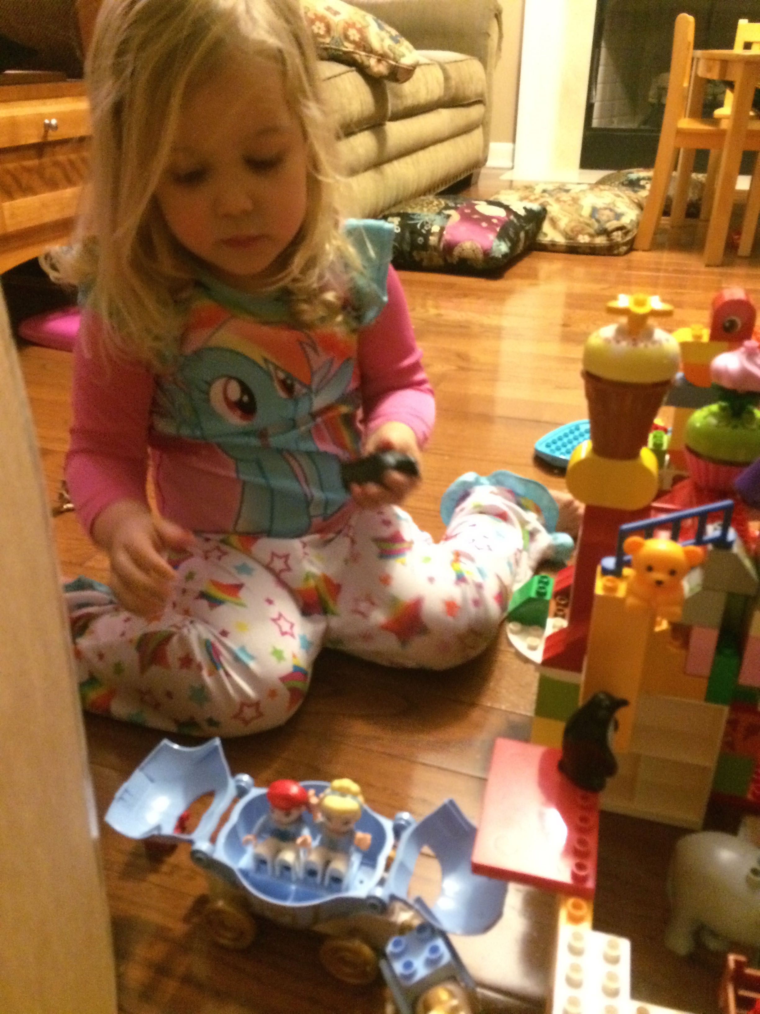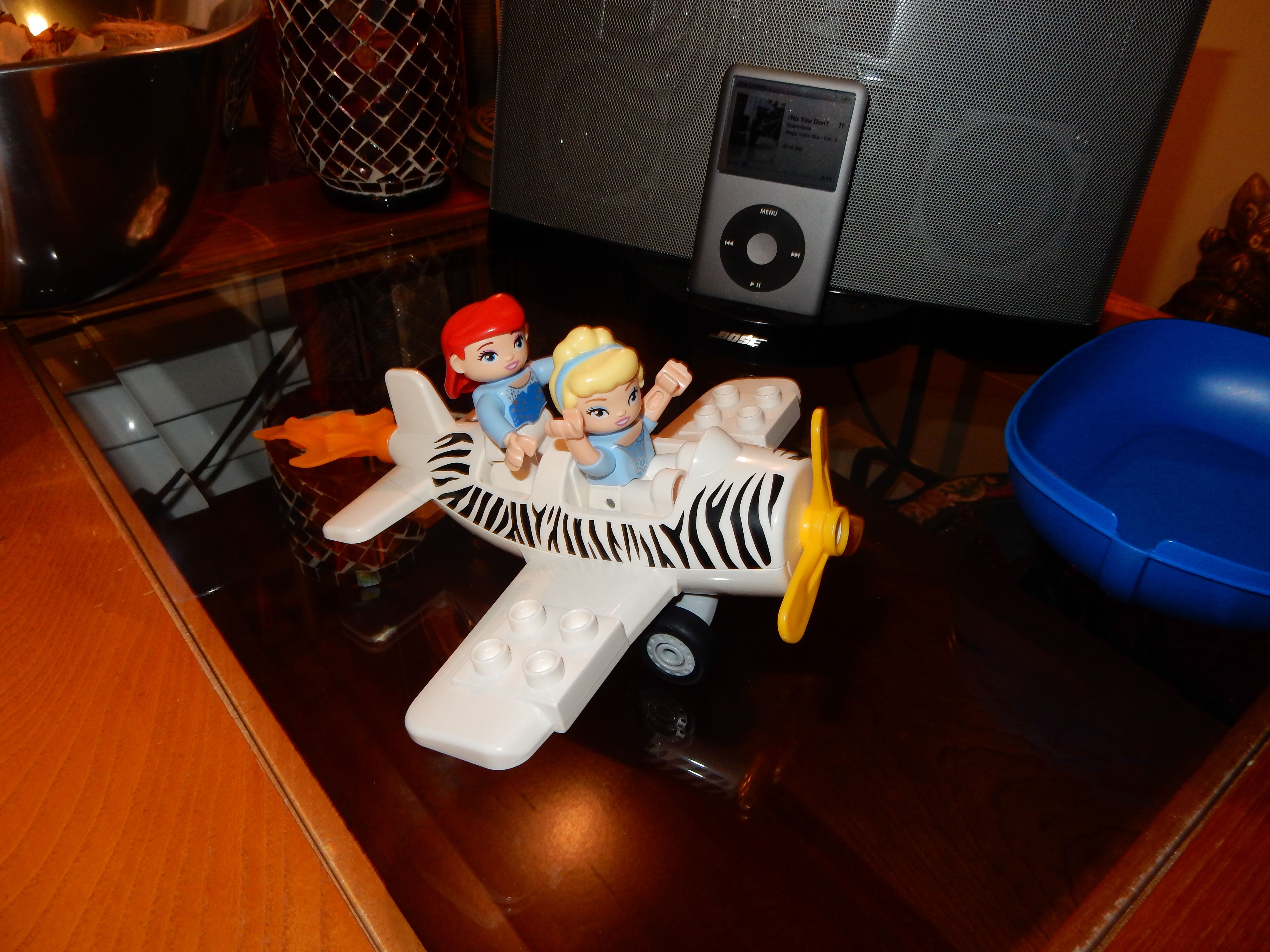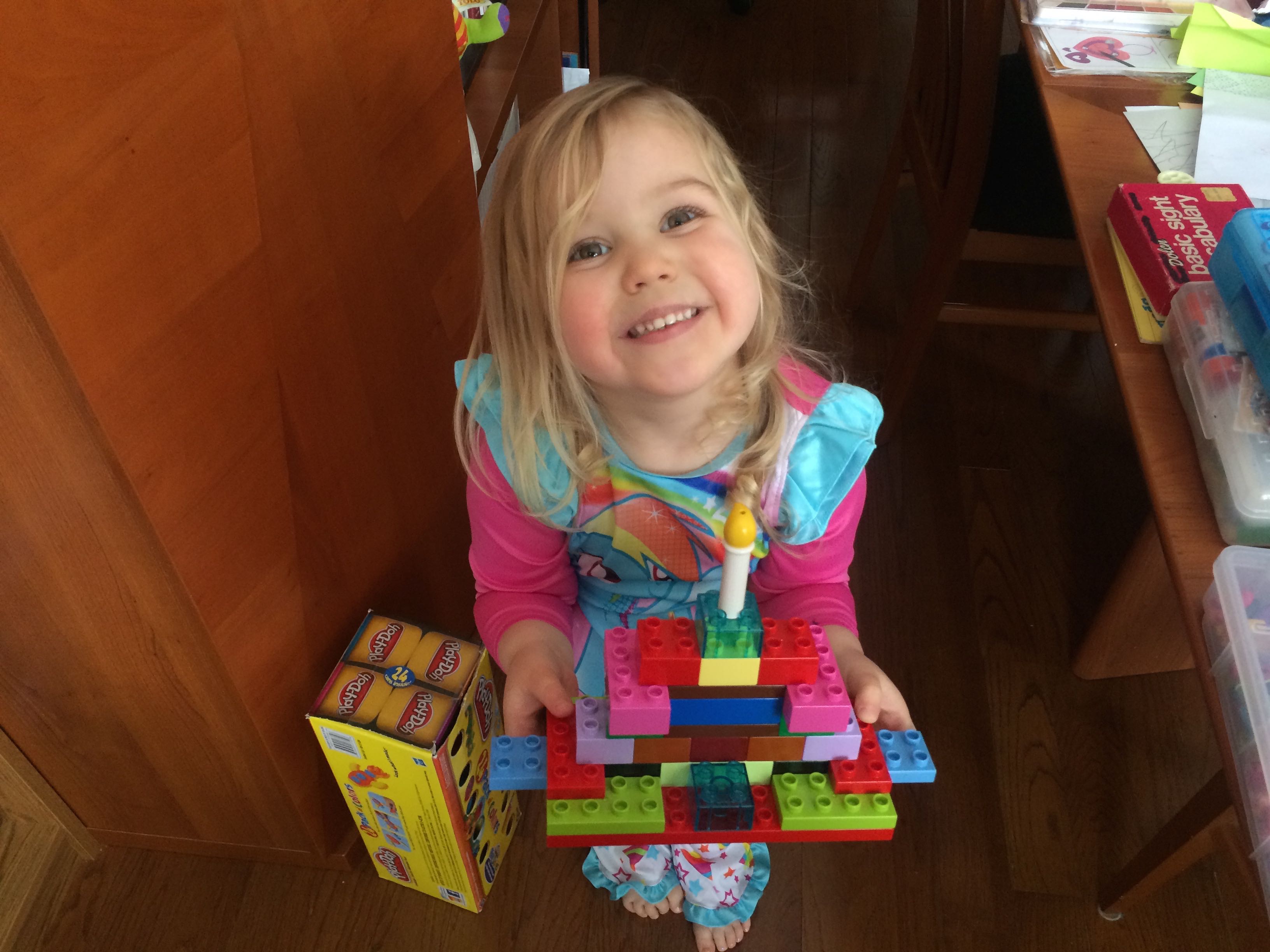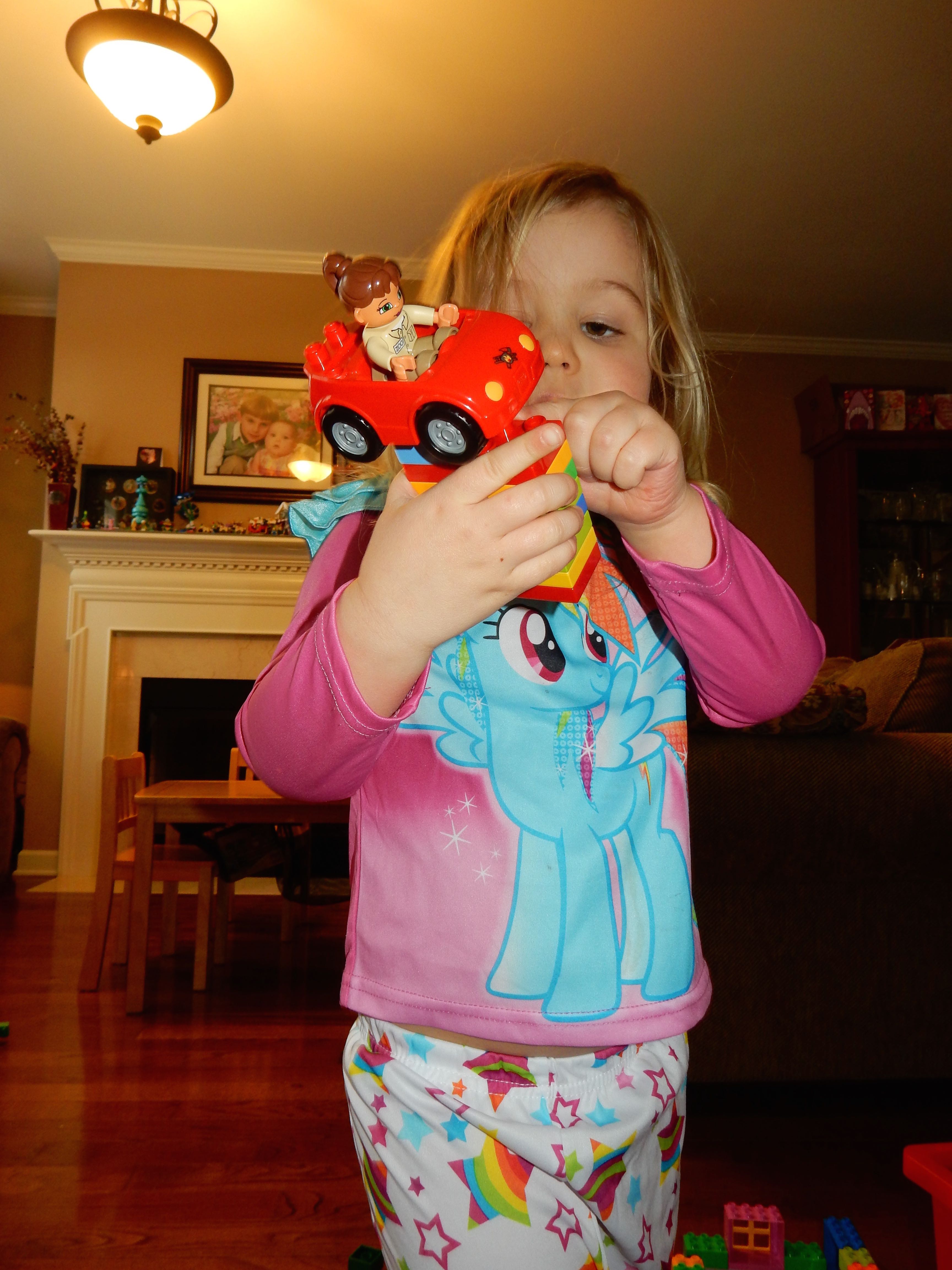 Gahhh! Just when we thought we were done with winter weather, it’s back with a vengeance. Everyone was home again today, as we waited for the big flakes to start falling. And, fall they did–once they got going, we ended up with a pretty significant amount of snow (on top of the re-frozen slushy mess from the last round!) We kept busy with more origami, baking a loaf of lemon bread, Play-Doh, and Duplos–oh, what we built with Duplos..! The kids made all sorts of things, but at some point in the late afternoon, we started building one large crazy castle together. I think the goal was simply to use all the bricks we could, and the result was pretty amazing! Plenty of fun activities like swings, slides, crazy stairs, hidden towers, etc. for all of the Duplo people were included in the castle, although I noticed that Cinderella and Ariel had ditched their princess skirts and absconded in the Zoo Plane.