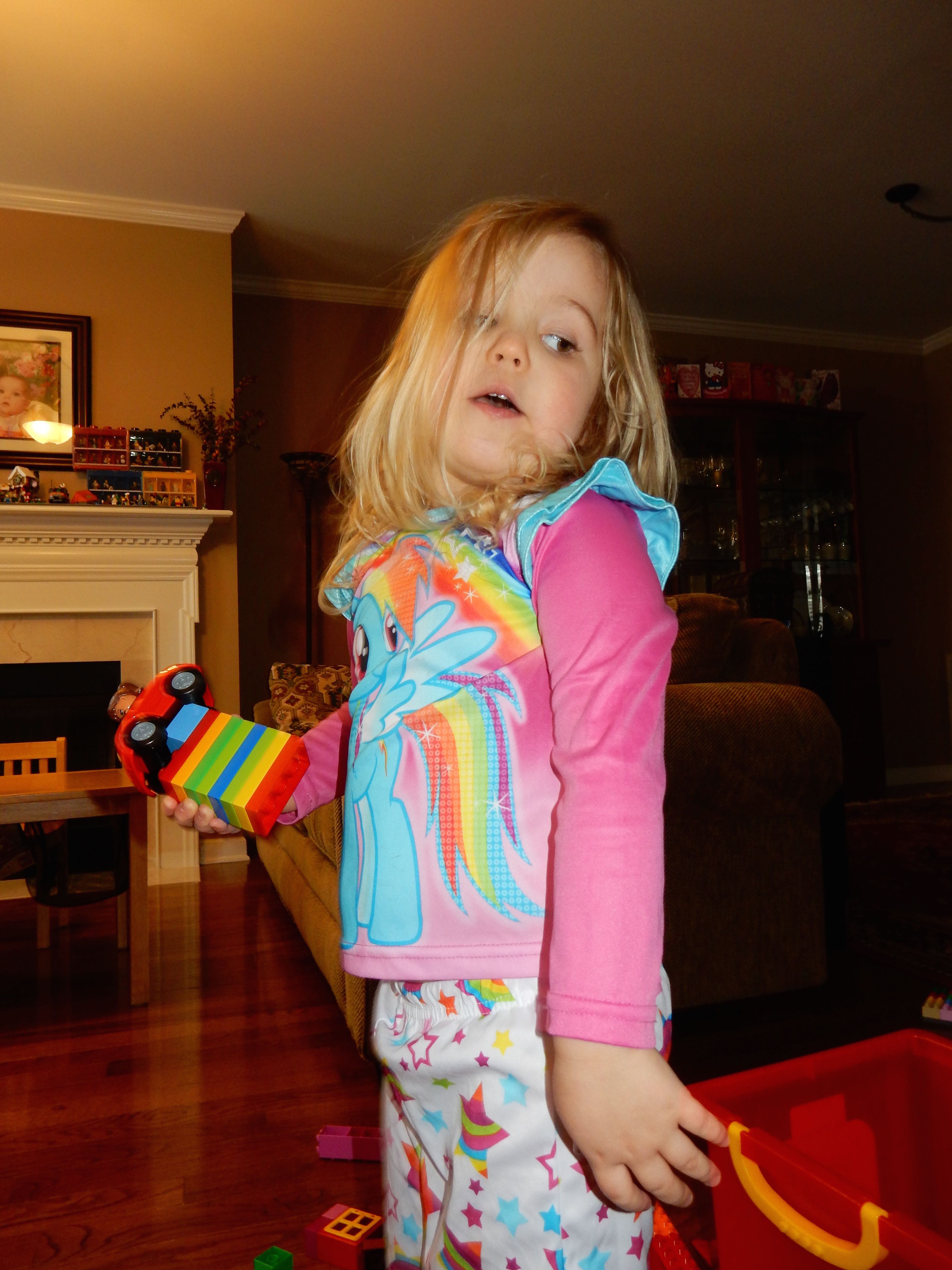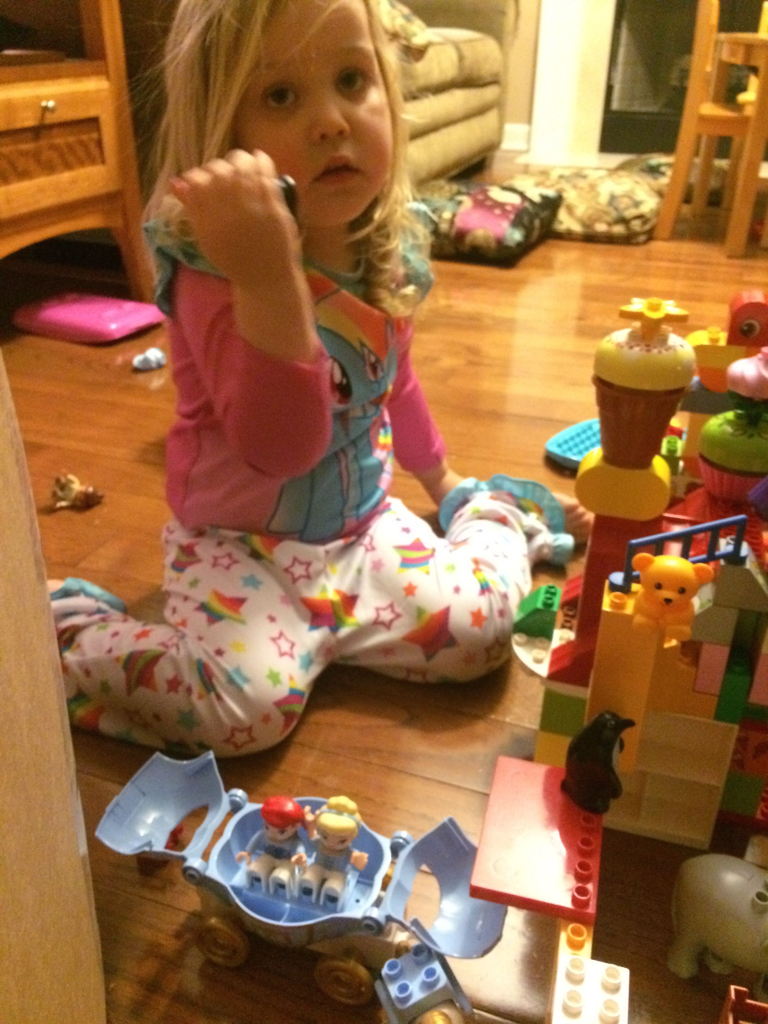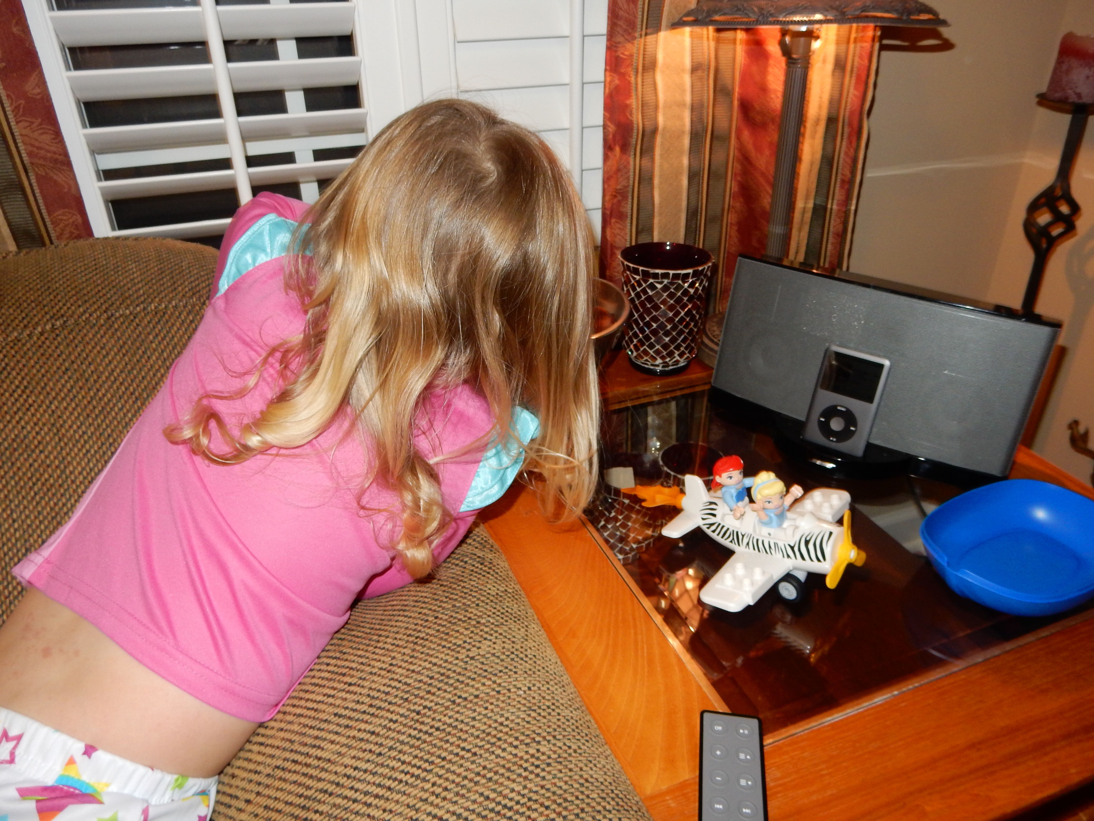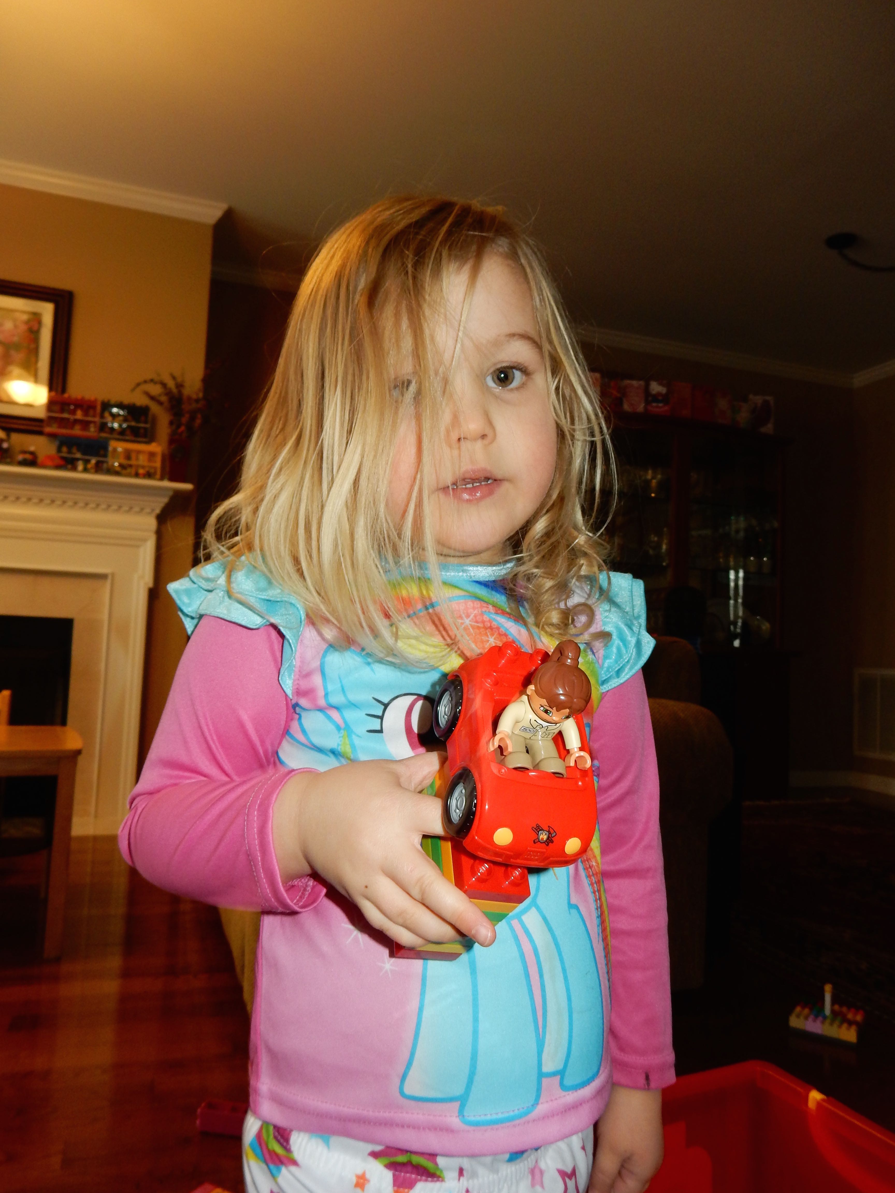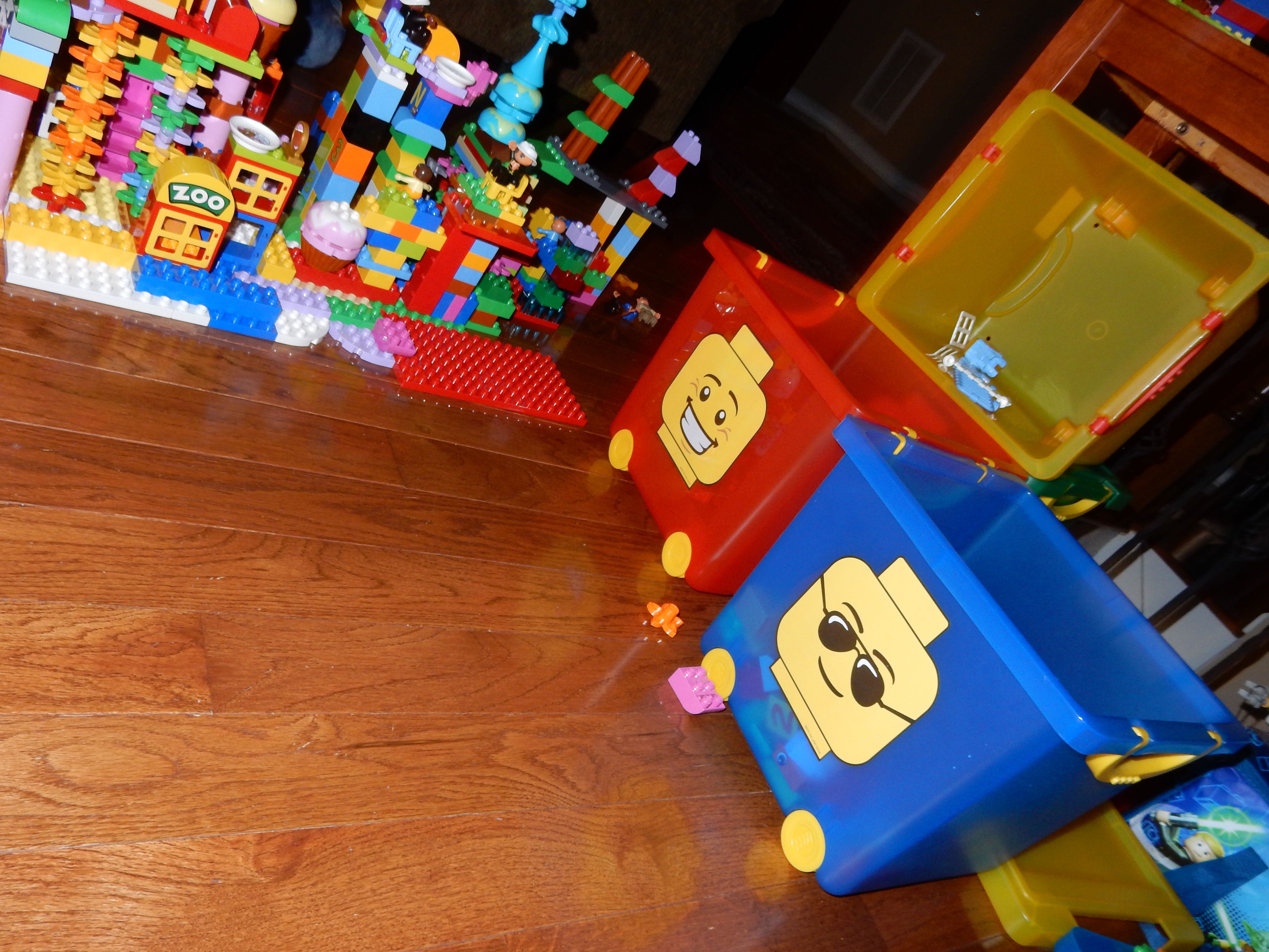 Gahhh! Just when we thought we were done with winter weather, it’s back with a vengeance. Everyone was home again today, as we waited for the big flakes to start falling. And, fall they did–once they got going, we ended up with a pretty significant amount of snow (on top of the re-frozen slushy mess from the last round!) We kept busy with more origami, baking a loaf of lemon bread, Play-Doh, and Duplos–oh, what we built with Duplos..! The kids made all sorts of things, but at some point in the late afternoon, we started building one large crazy castle together. I think the goal was simply to use all the bricks we could, and the result was pretty amazing! Plenty of fun activities like swings, slides, crazy stairs, hidden towers, etc. for all of the Duplo people were included in the castle, although I noticed that Cinderella and Ariel had ditched their princess skirts and absconded in the Zoo Plane.
