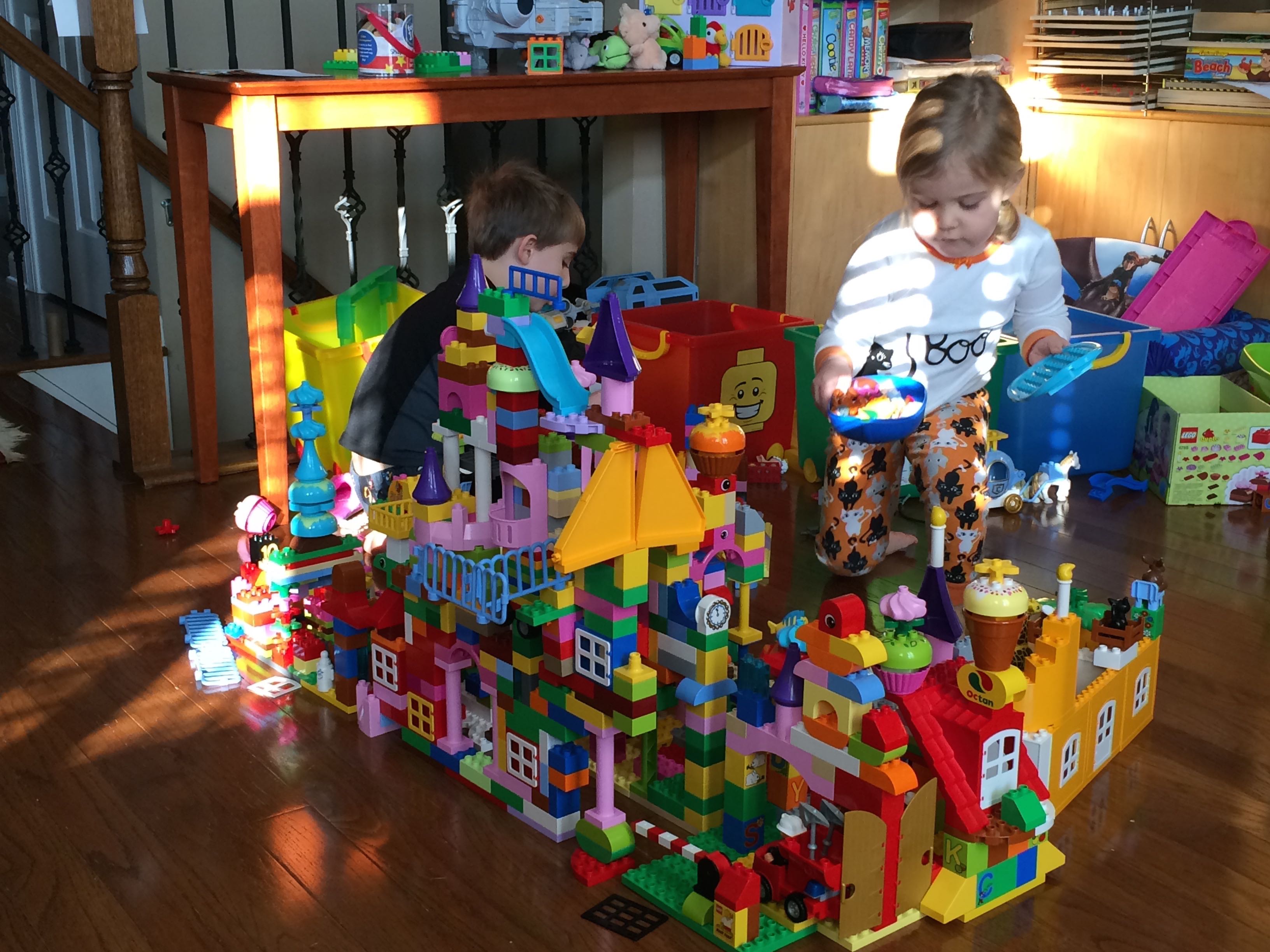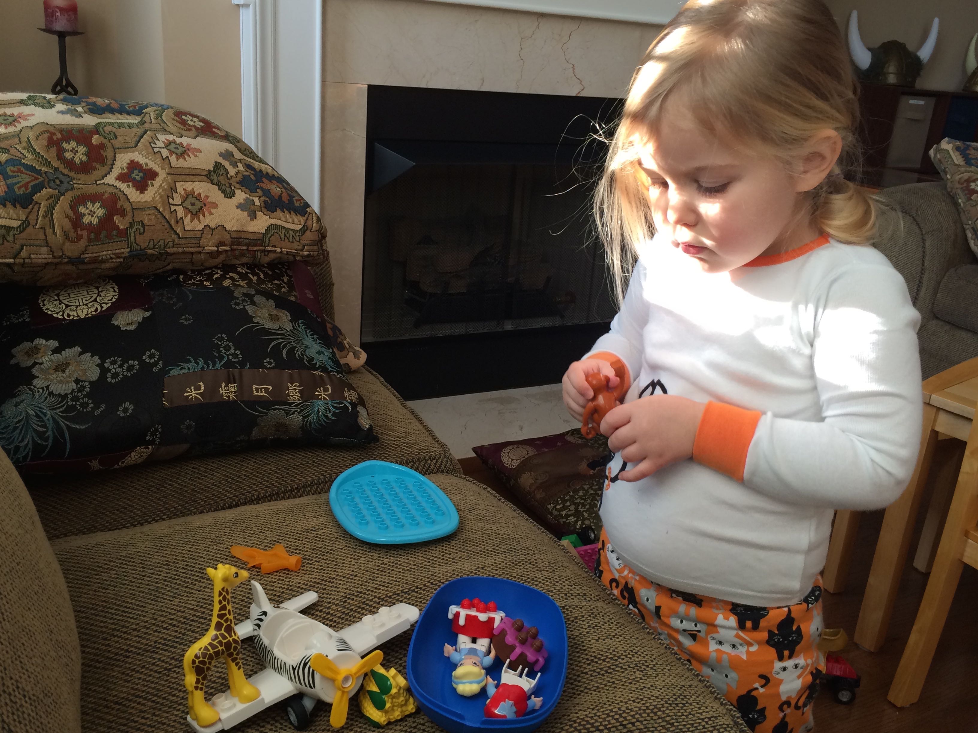 I give up! Let’s try to work again in March, maybe, because we’re home again for yet another snow day. Fully half of February has been a wash, thanks to various disappointing forms of frozen water and related school closures. We’re all a little stir crazy, but did the best we could, staying busy with the giant Duplo castle, board games, lots of ponies on TV, and the hot cocoa flowed freely.. I even tried to get back in Kendall’s good graces by giving her a present–little pony figures from her very favorite My Little Pony episode, “Baby Cakes” (in which Pinkie Pie learns about responsibility, as she babysits the Cake Family’s newborn twins, Pumpkin Cake and Pound Cake. Featuring guest appearances by Nurse Redheart, and proud-yet-frazzled new parents, Cup Cake and Carrot Cake. Shall I quote the script, word for word? Because I can.) 😉 We did get in a little bit more playtime in the snow today, although the snow was melting pretty fast. It still didn’t want to stick, so we had to settle for a snowpile snow guy, and I made some smaller items (like a Japanese-style snow bunny with leaves for ears).