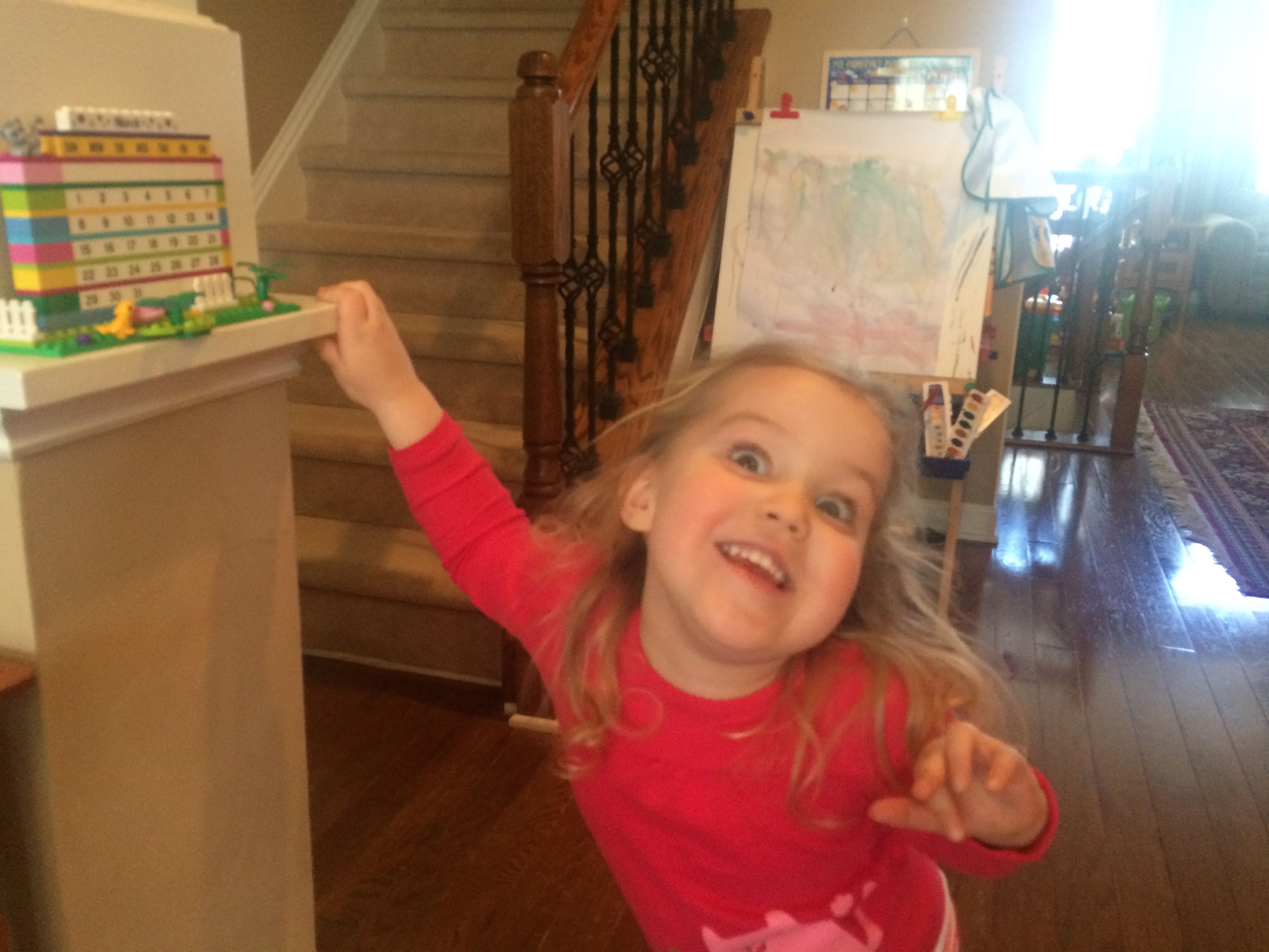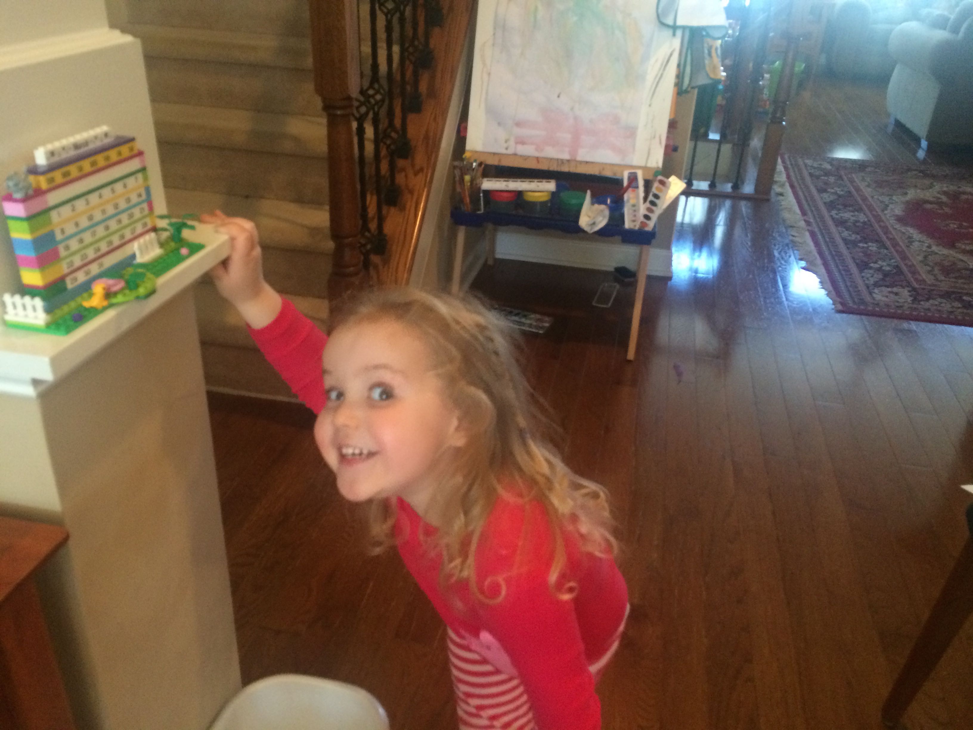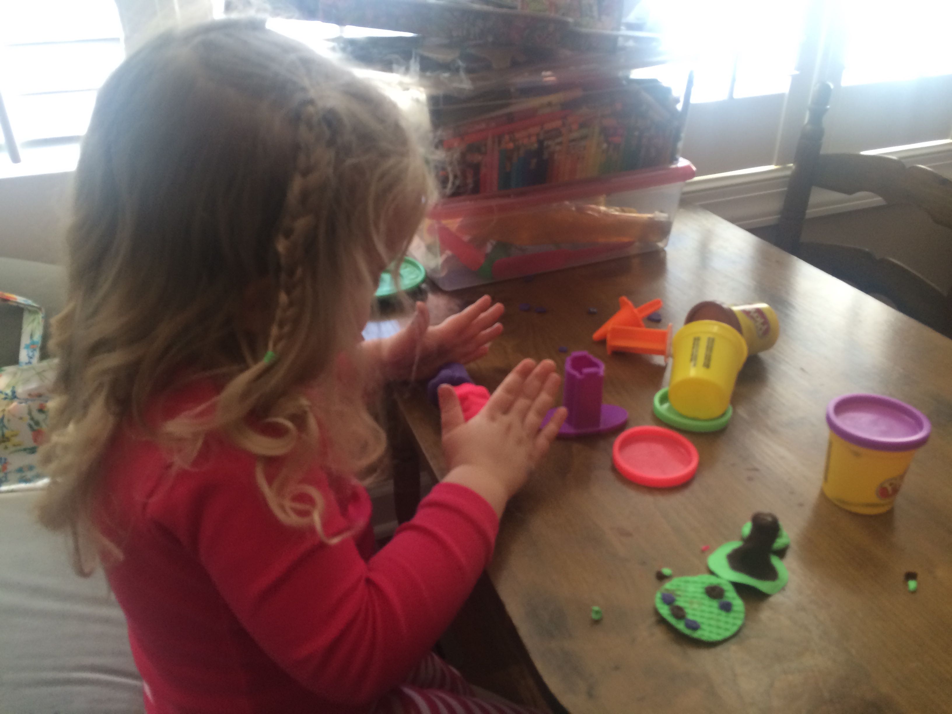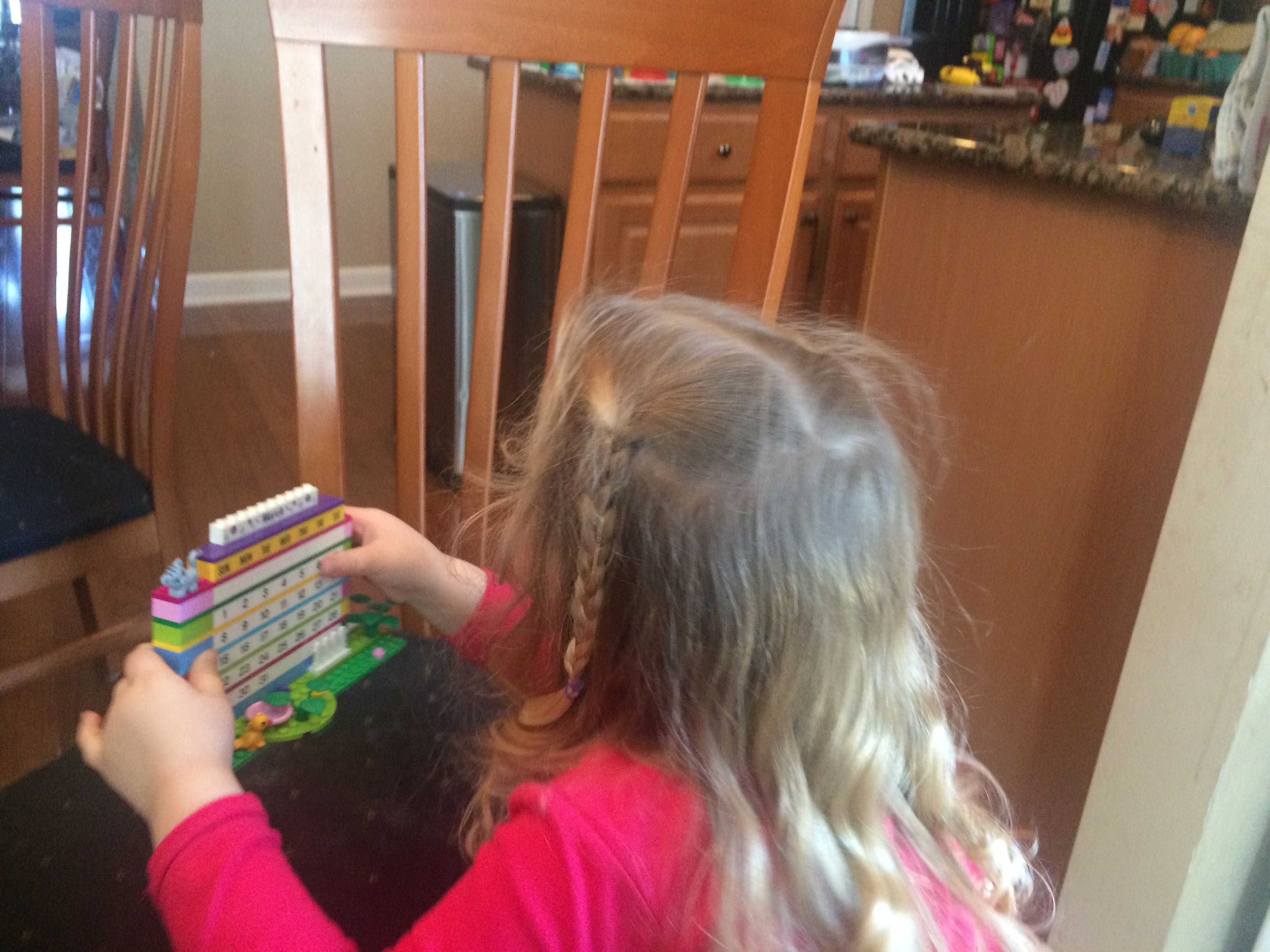 Today the kids remade their Lego calendars for the month (a little late, but hey!) Brian and Brandon attended an afternoon ‘Canes game, while Kendall and I played with Play-Doh at home. The boys brought home a cute ponytail holder with ‘Canes ribbons attached for Kendall, and she loved it so much, she had to try it out right away!