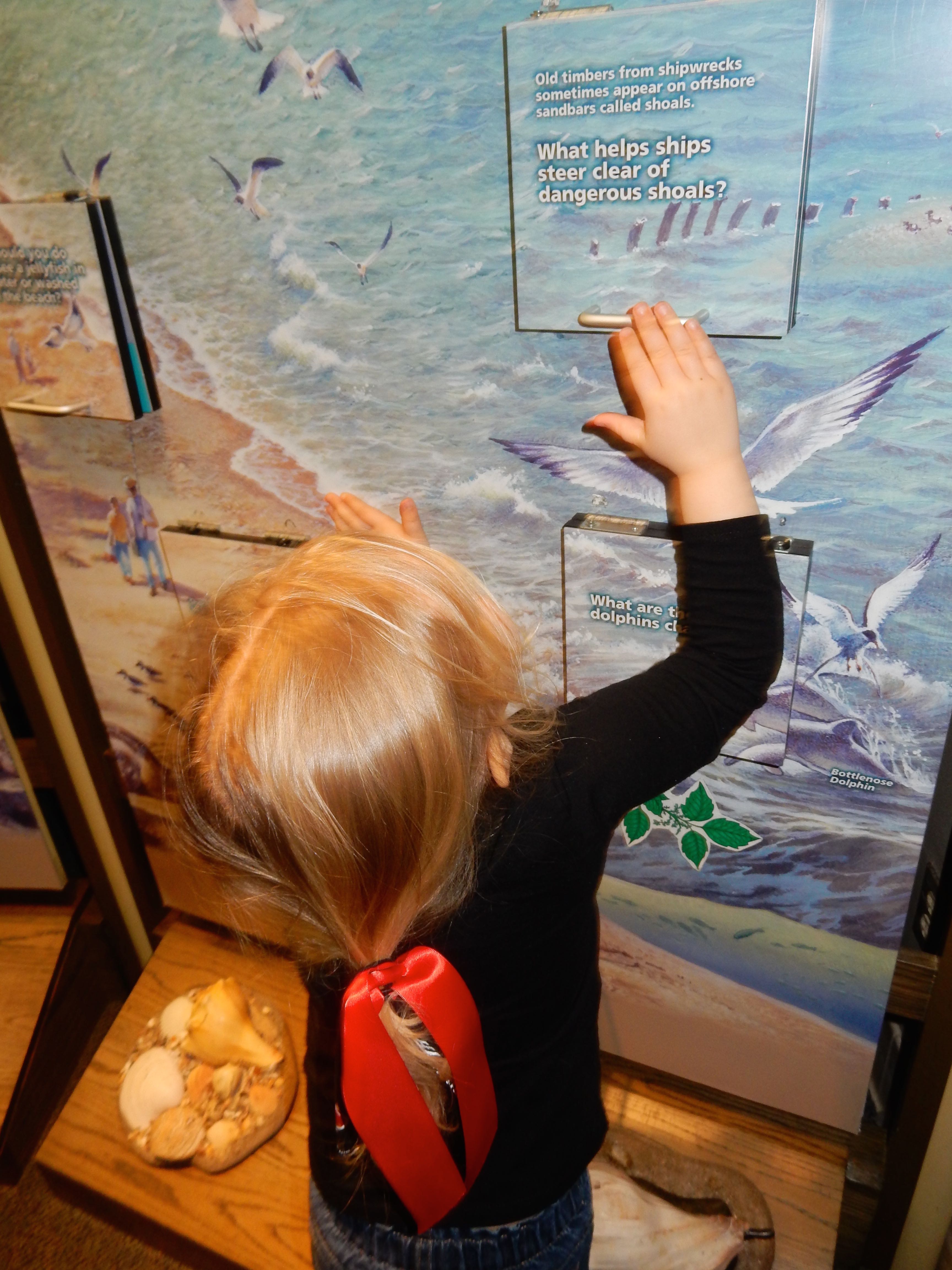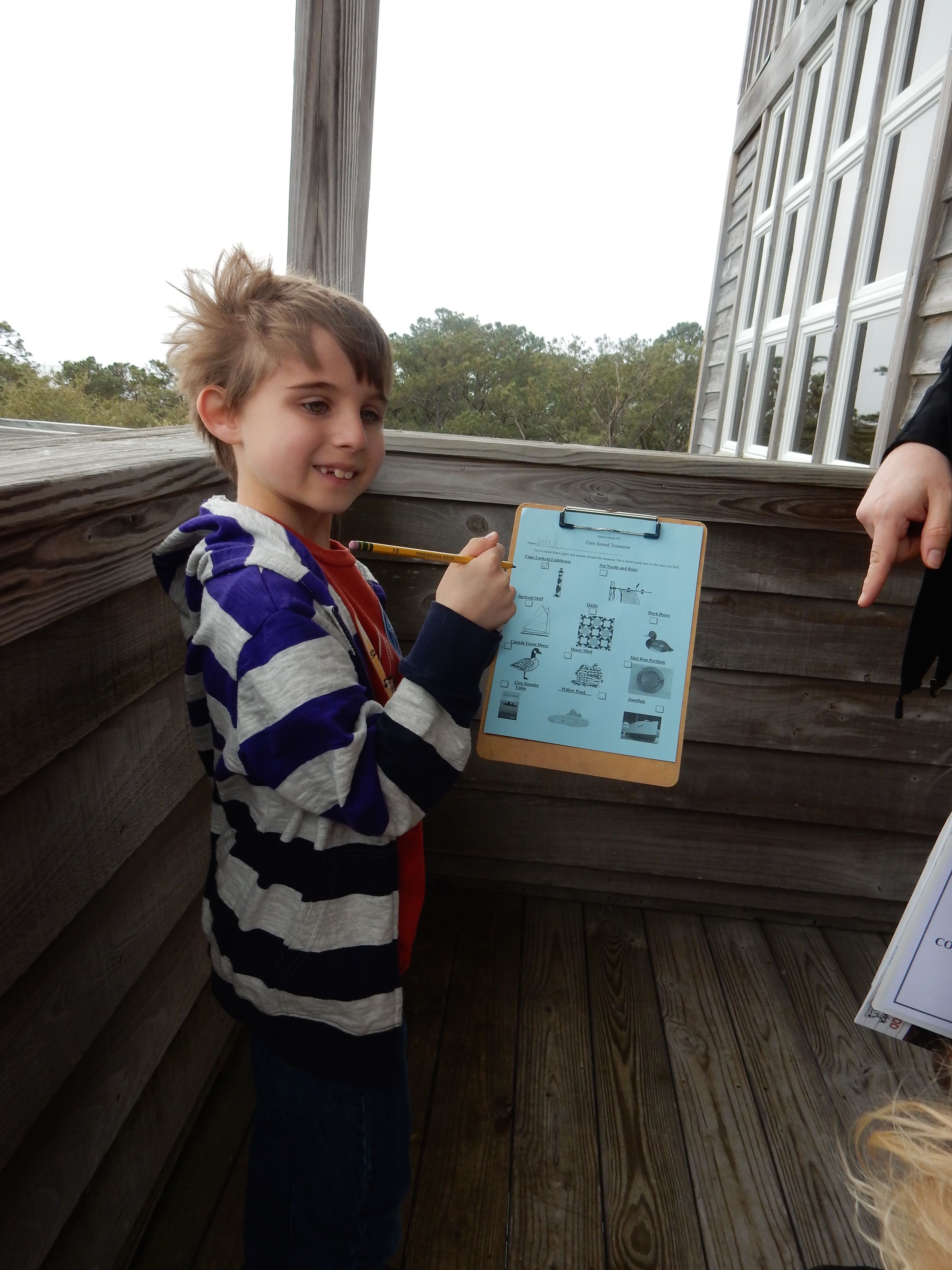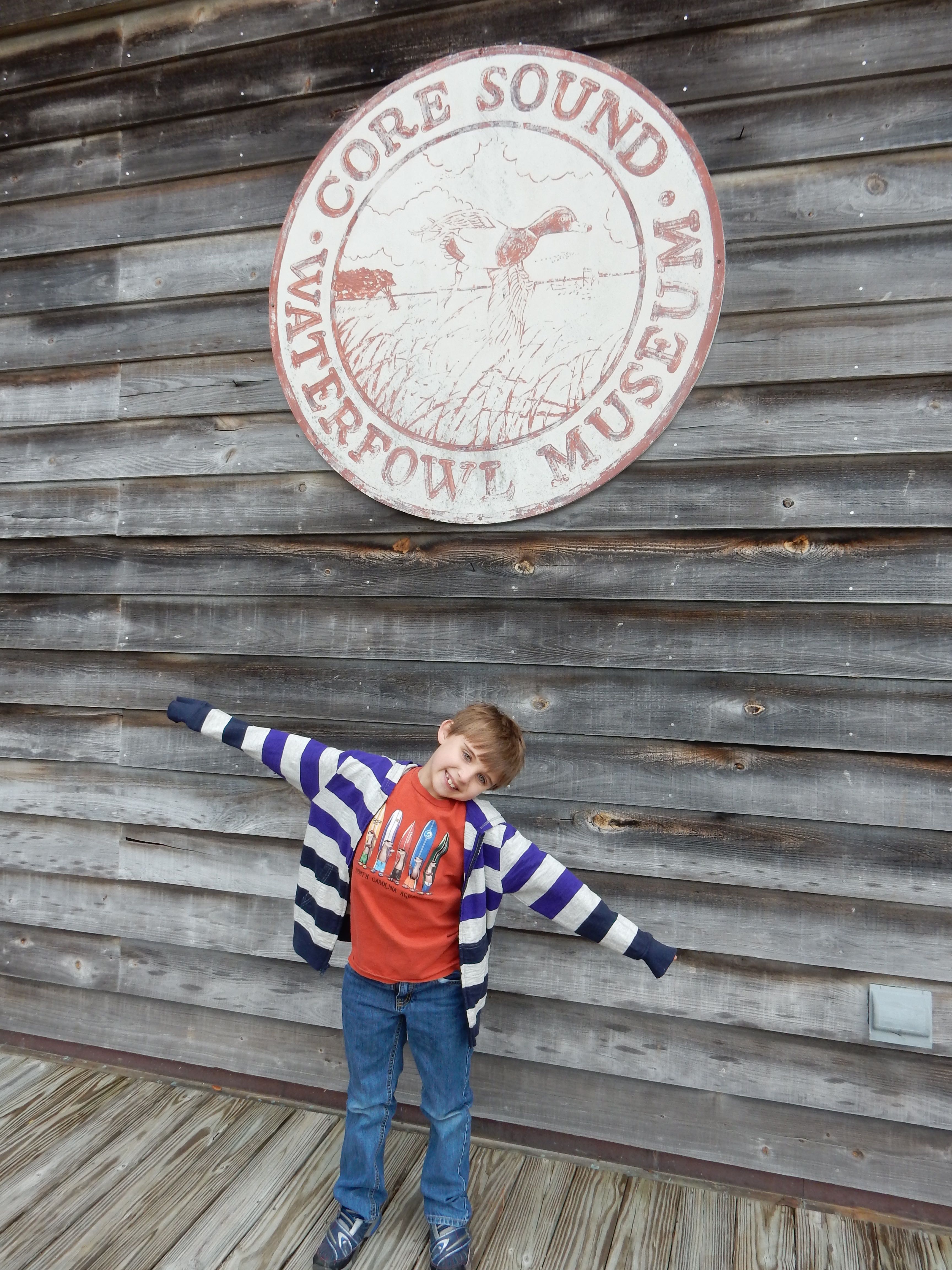 Anyway, we decided to be scofflaws and truants, and blatantly disregard the reinstated school days this week, opting to go for the “excused absence due to an educational field trip” tactic. We’re taking the requirements pretty seriously–packing in tons of educational trips each day, and making Brian take notes for an eventual portfolio, detailing all the things he learns. We did let the kids ease into the day with some Lego time. I’d brought along the “suitcase” Lego sets I’d gotten them probably more than a year ago. They were quite excited, as you can see! Brian compelled me to make a video of him creating a scene with his set. 😉 We eventually had to start educating, so we made our way to Harker’s Island for the Cape Lookout National Seashore Visitor Center, and the Core Sound Waterfowl Museum. Brian “borrowed” Grandma’s notepad, and made some pretty great drawings and notes of the things he saw along the way. He was interested in the big cranes he saw at the seaport, and made us look up the word for “not the crane part, the other part”–gantry, is the word he wanted to know. We got lunch at a Burger King (not one of our usual places–it was kind of gross, reminding us why it’s not one of our usual places!) But at least the kids got paper crowns out of it, and Brian made some excellent drawings of the seagulls we saw outside (love the action shot!) Both kids enjoyed (or at least were decent sports about) the educational exhibits, but the surprise kids’ area at the waterfowl museum was a really big hit. Since they’d put up with a lot of historical artifacts, we let them play there for a good long while. Brian found some books for his wishlist, and Kendall played with the puppets and seashell tic-tac-toe. Both kids got a prize or three from the gift shops at each place. At the Cape Lookout visitor center, we picked up one of those National Park passport books. We got our first stamps for it, and Kendall stamped herself for good measure. 😉 We picked up some groceries on the way back, and bless him, Brandon made us dinner while I occupied the kids (and I really phoned it in–introduced them to Full House reruns on Nick). 😉 It was a fun, but long day, and I was pretty well exhausted by the end. 🙂