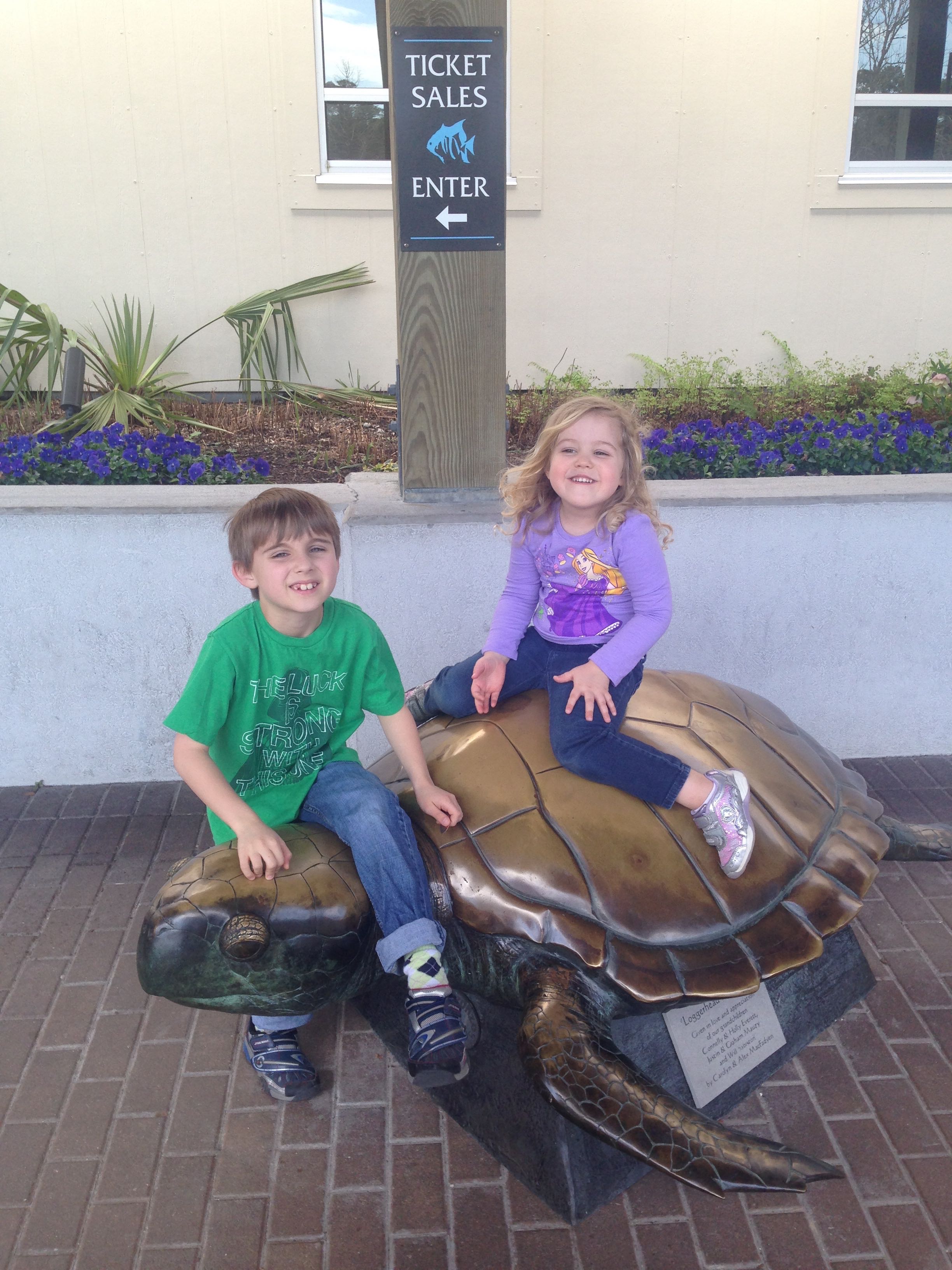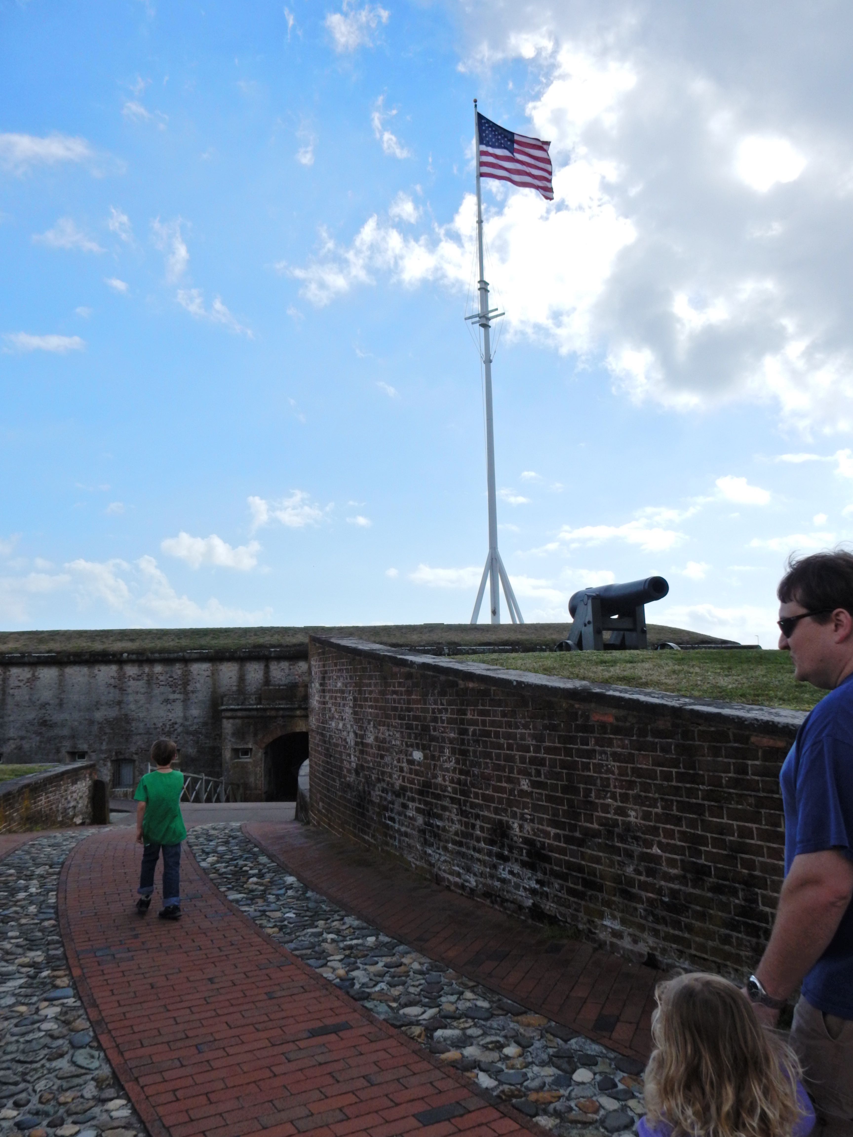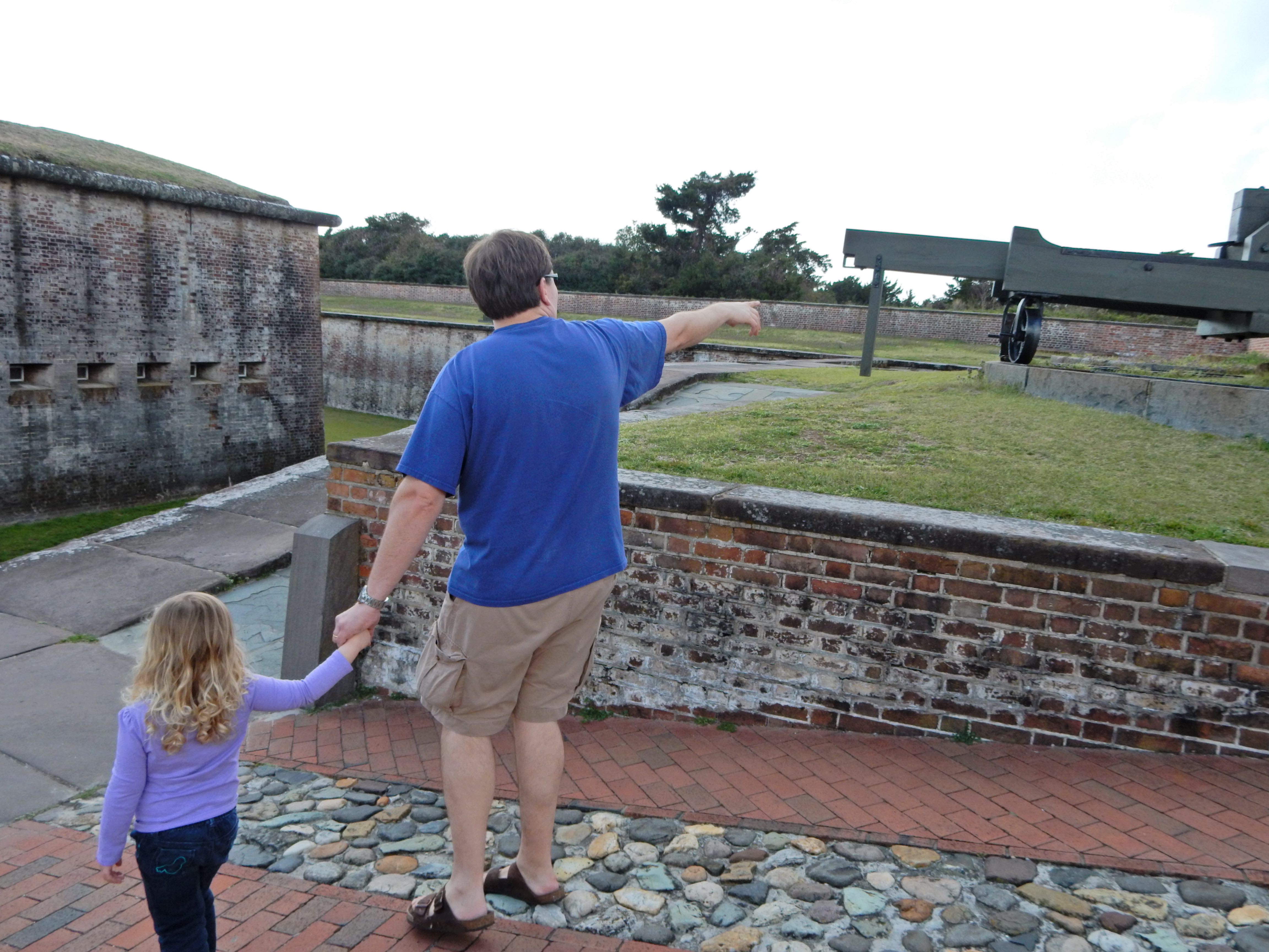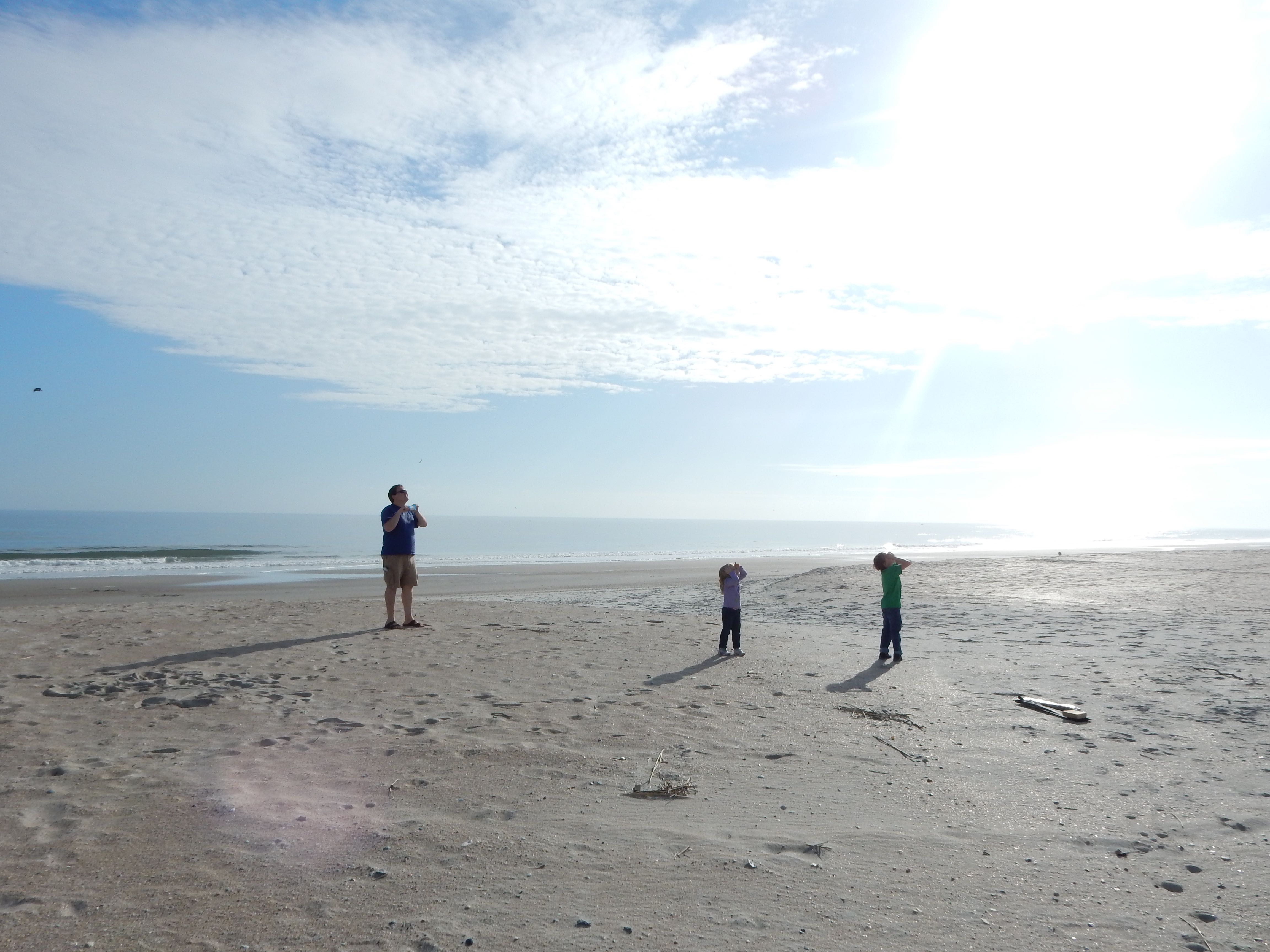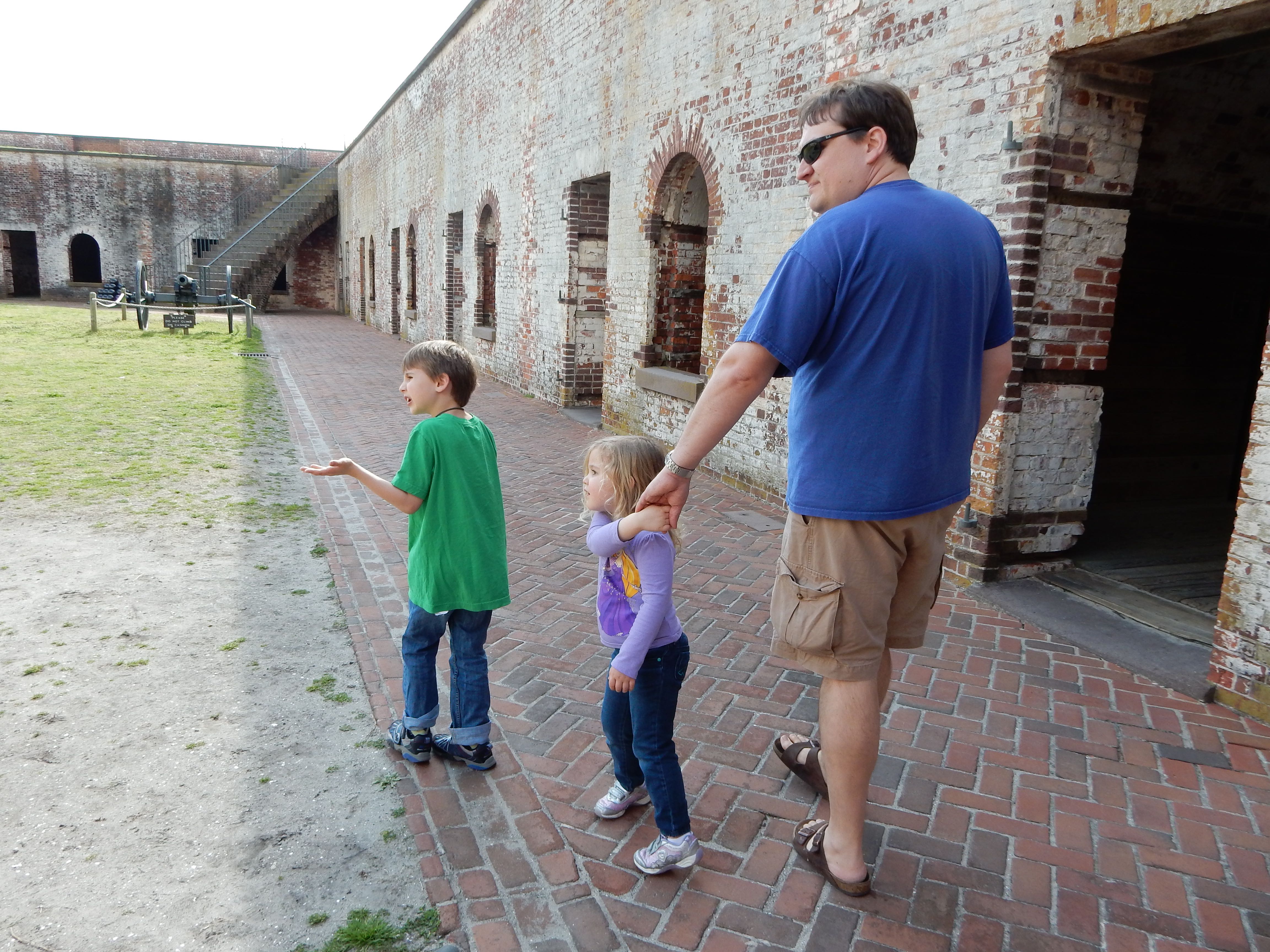 The spring break fun continued today (after a “healthy” breakfast, of course!) Today we were off to the aquarium, always a good time. 🙂 Brian really liked this gigantic plushie sting ray, but it’s nearly as big as him, pretty impractical. We convinced him that just taking pictures with it was okay. 😉 Brian did get a shark tooth necklace at the Wings store, something he wanted to do after seeing a coupon for a free one in the guidebook magazine we’d picked up. We had lunch at the Big Oak Drive-In, known for its yummy shrimp sandwiches and pretty amazing onion rings, too. We even got some apple fritters for dessert. 🙂 Then, we headed off to Fort Macon, or “Fort Fun” as the Visitor’s Guide called it. 😉 Brandon and I had some laughs about that, but the kids really did have fun there! They like running around and opening up all the doors to see what’s inside. In the gift shop, Kendall liked the display of Audubon plushie birds, especially the cardinals, but didn’t actually ask to get one. 🙂 Brandon got a deck of replica “spotter” playing cards, which were used during wartime to help the soldiers learn how to identify planes. Of course Brandon doesn’t need any help with that, he can already identify every plane we see. 🙂 Afterward, we spent a little time on the beach flying kites and playing in the sand some. It’s too cool for getting in the water, but it was fun to be nearby! Kendall had been really jealous of Brian’s note-taking, so at the grocery store we got her a cute pink notebook to have for her own. She was so sleepy, she ended up taking a nap on the couch while we made dinner!