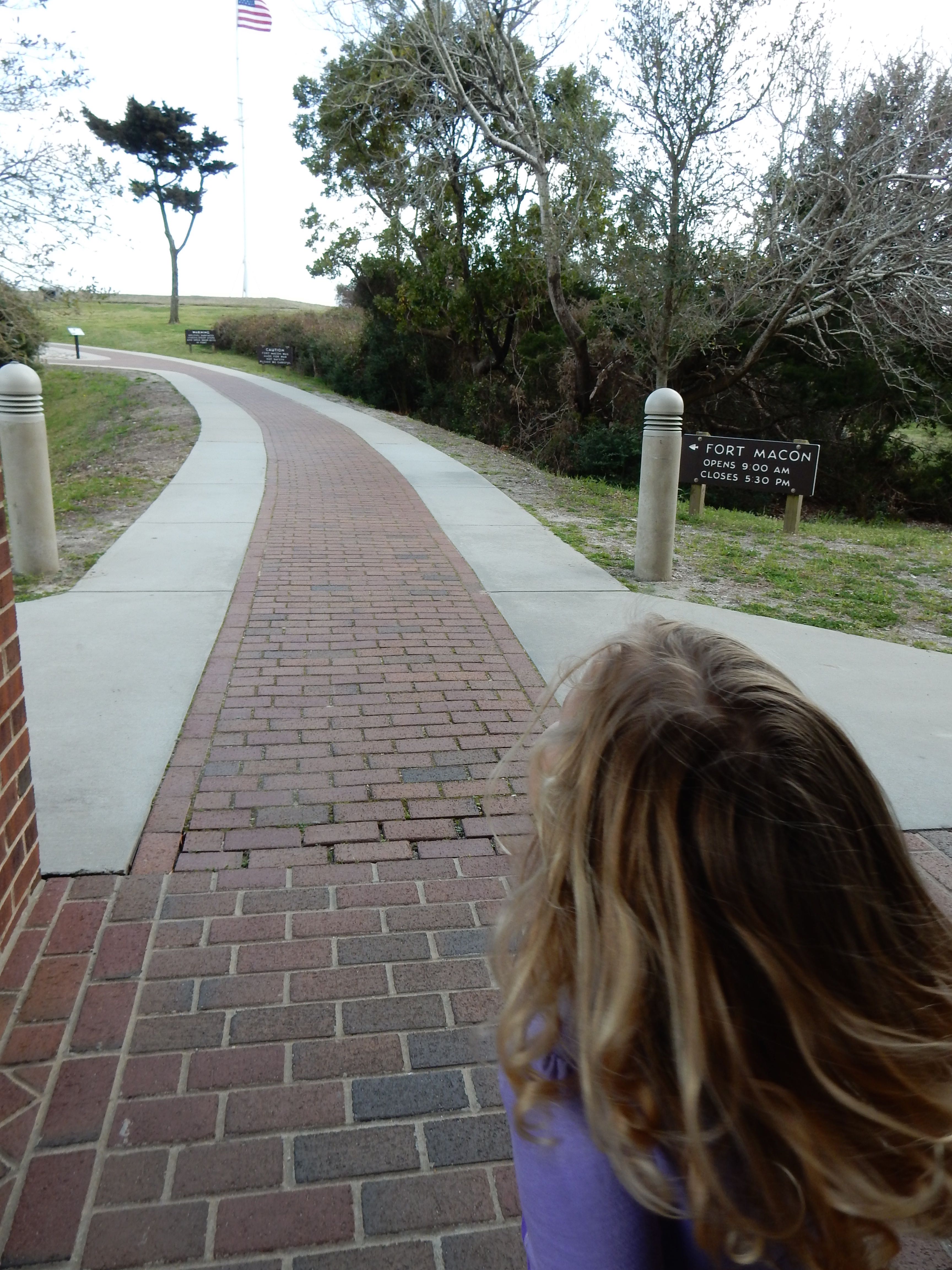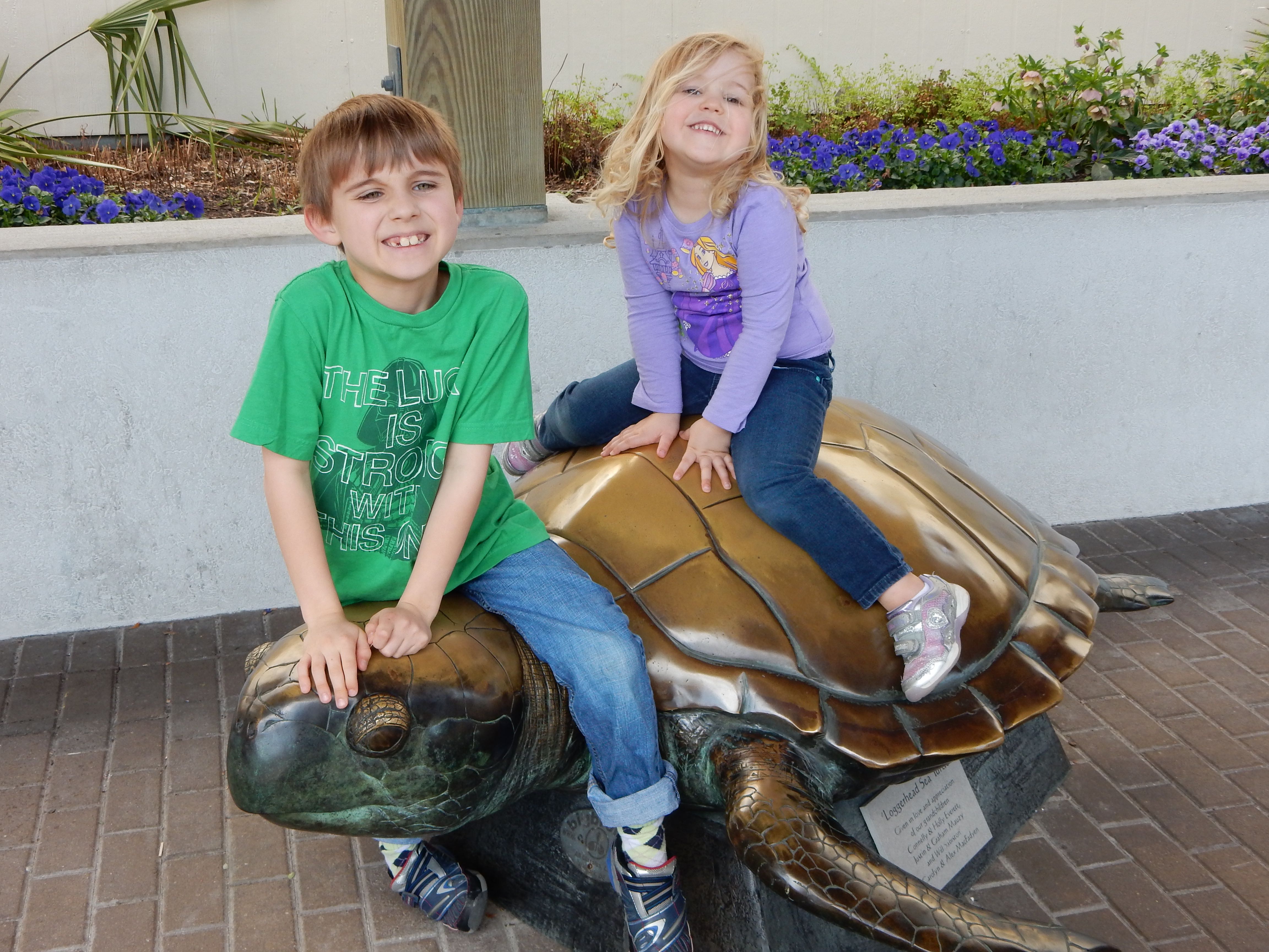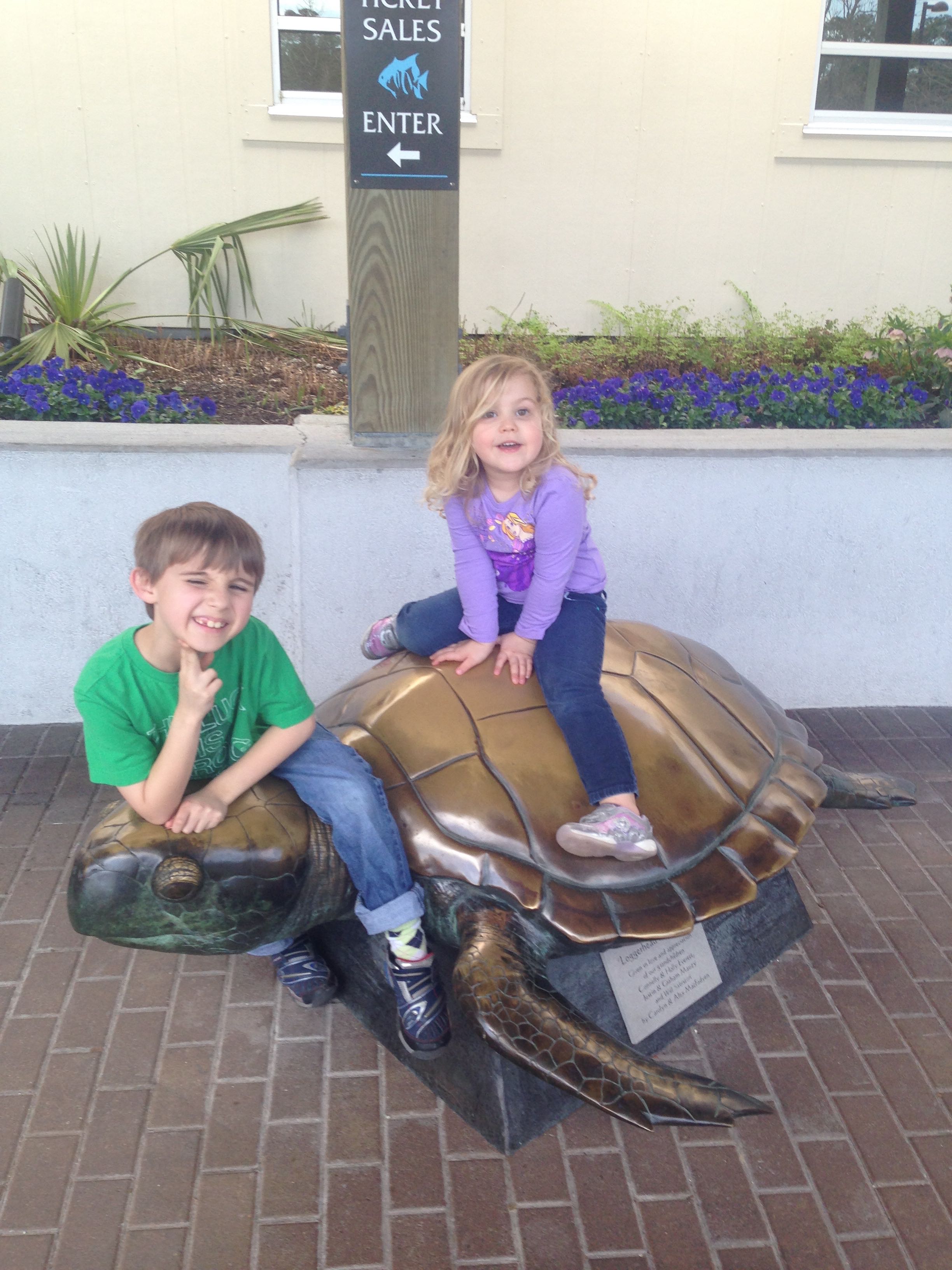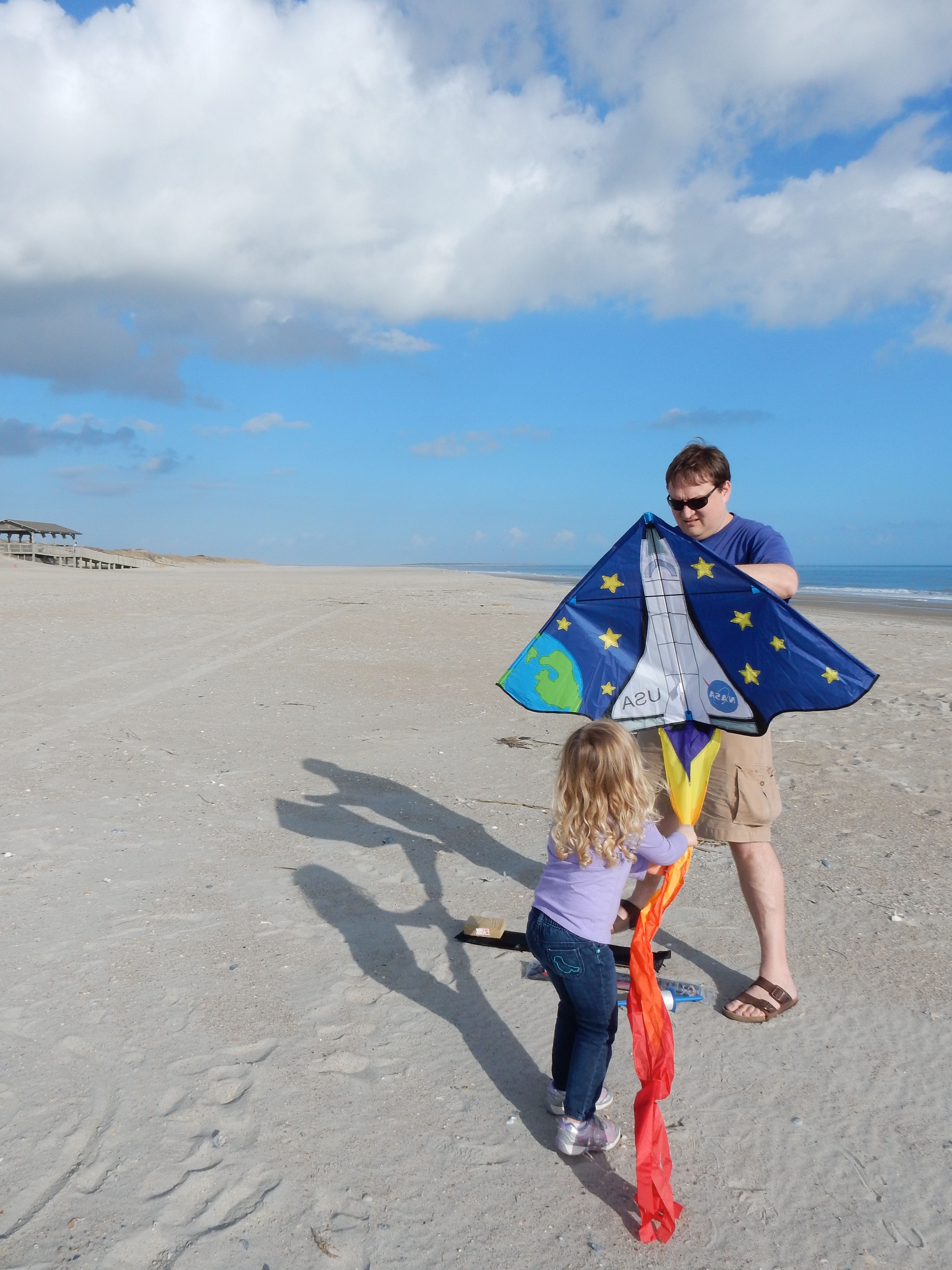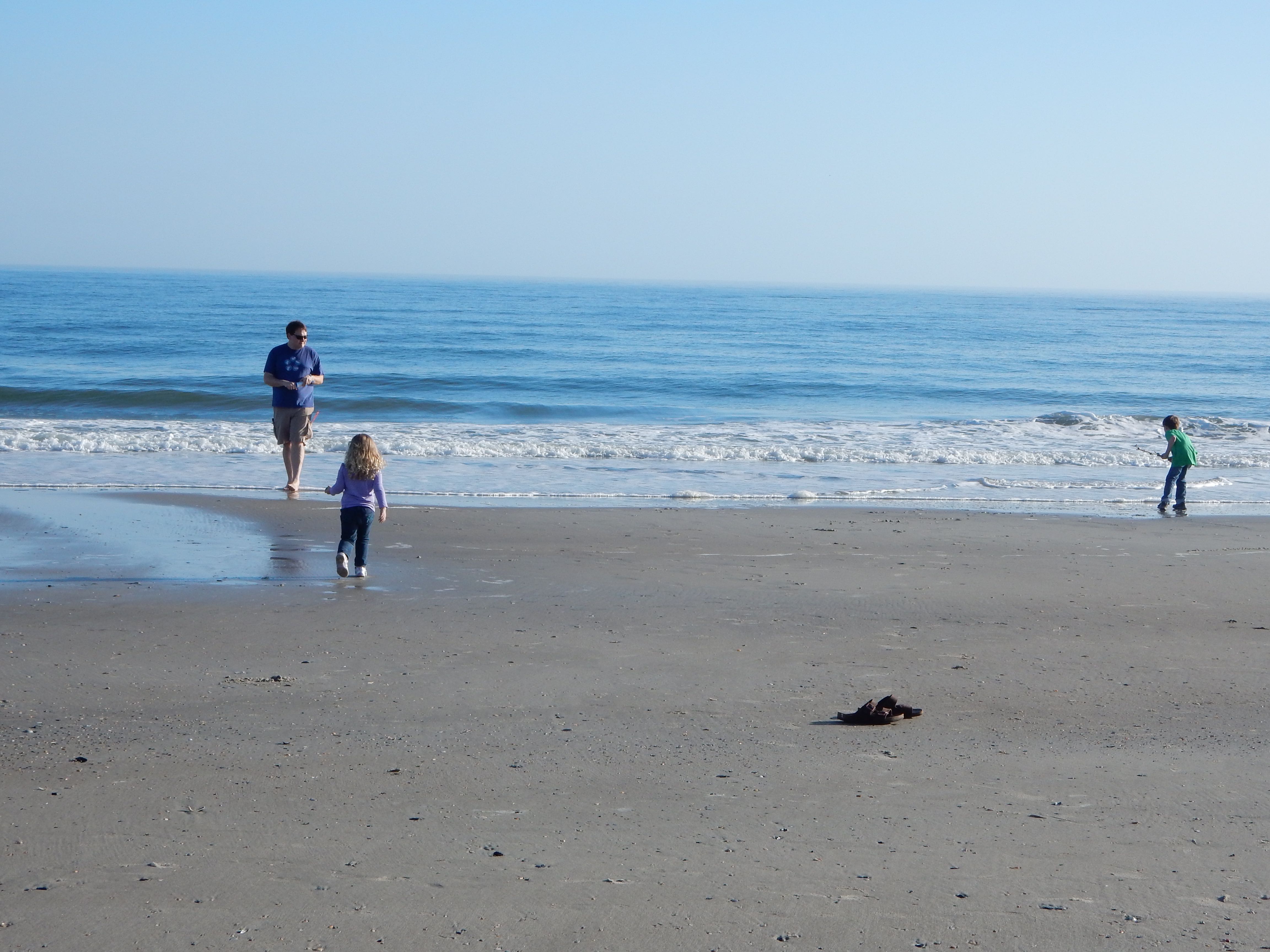 The spring break fun continued today (after a “healthy” breakfast, of course!) Today we were off to the aquarium, always a good time. 🙂 Brian really liked this gigantic plushie sting ray, but it’s nearly as big as him, pretty impractical. We convinced him that just taking pictures with it was okay. 😉 Brian did get a shark tooth necklace at the Wings store, something he wanted to do after seeing a coupon for a free one in the guidebook magazine we’d picked up. We had lunch at the Big Oak Drive-In, known for its yummy shrimp sandwiches and pretty amazing onion rings, too. We even got some apple fritters for dessert. 🙂 Then, we headed off to Fort Macon, or “Fort Fun” as the Visitor’s Guide called it. 😉 Brandon and I had some laughs about that, but the kids really did have fun there! They like running around and opening up all the doors to see what’s inside. In the gift shop, Kendall liked the display of Audubon plushie birds, especially the cardinals, but didn’t actually ask to get one. 🙂 Brandon got a deck of replica “spotter” playing cards, which were used during wartime to help the soldiers learn how to identify planes. Of course Brandon doesn’t need any help with that, he can already identify every plane we see. 🙂 Afterward, we spent a little time on the beach flying kites and playing in the sand some. It’s too cool for getting in the water, but it was fun to be nearby! Kendall had been really jealous of Brian’s note-taking, so at the grocery store we got her a cute pink notebook to have for her own. She was so sleepy, she ended up taking a nap on the couch while we made dinner!