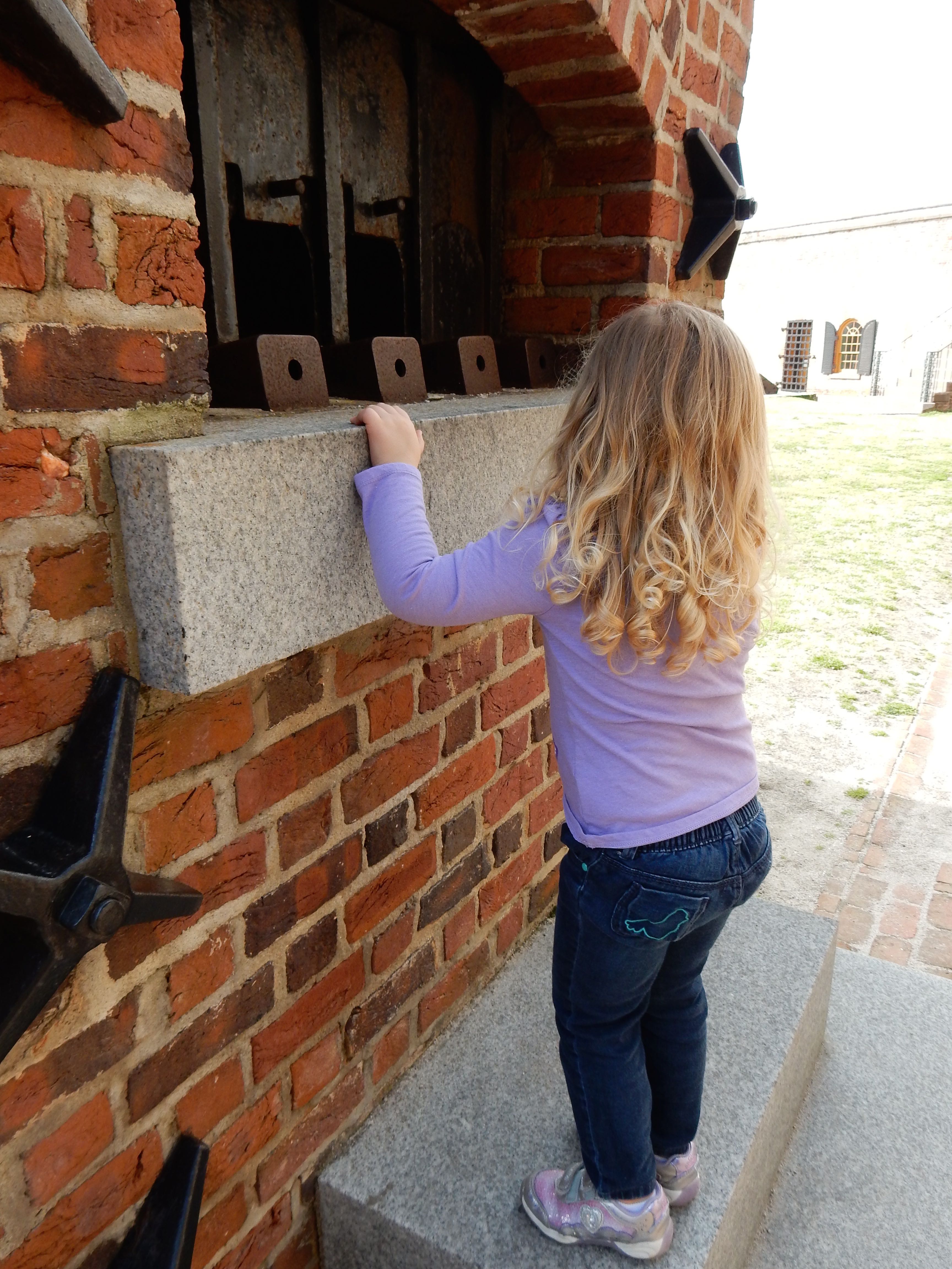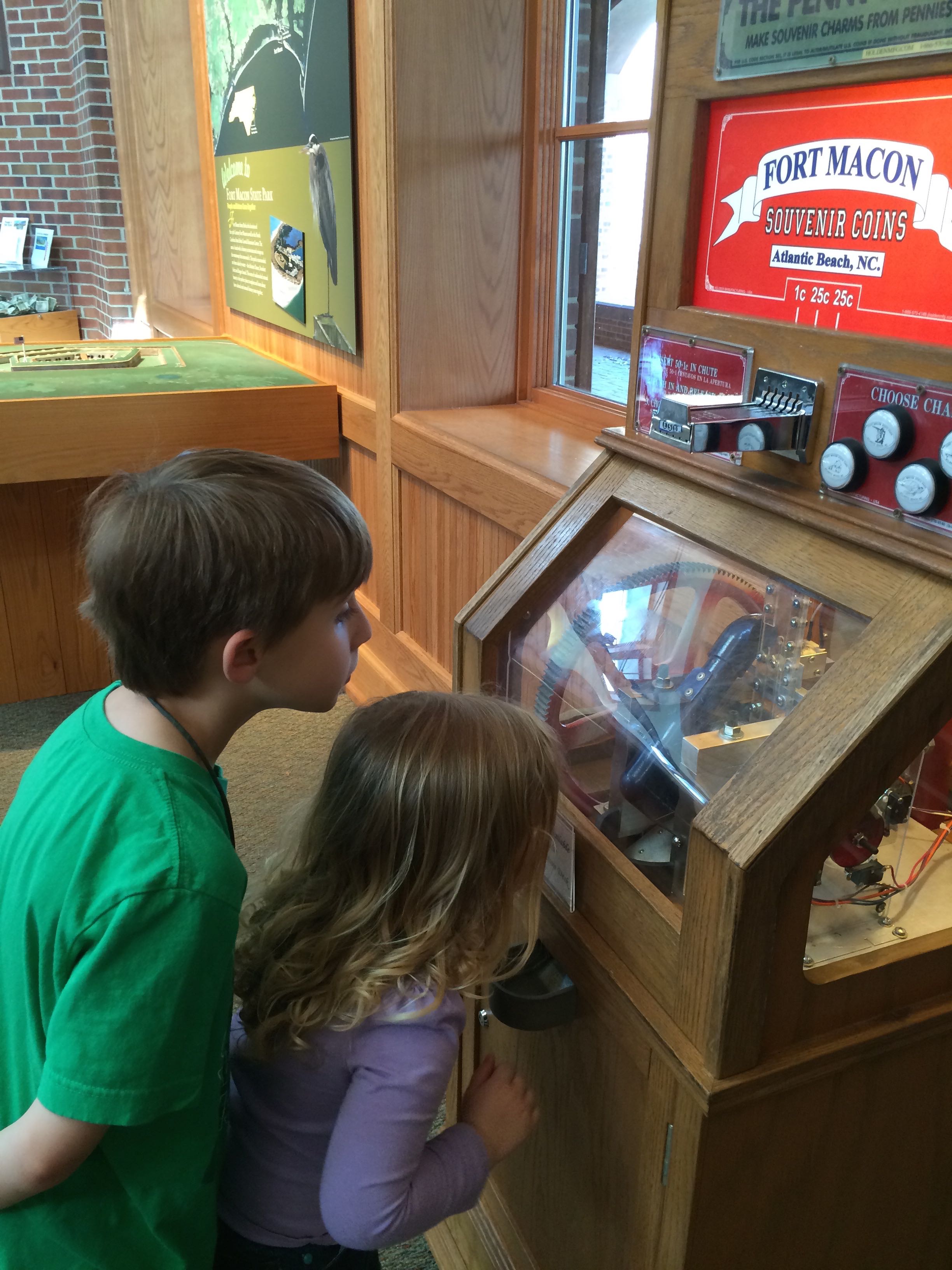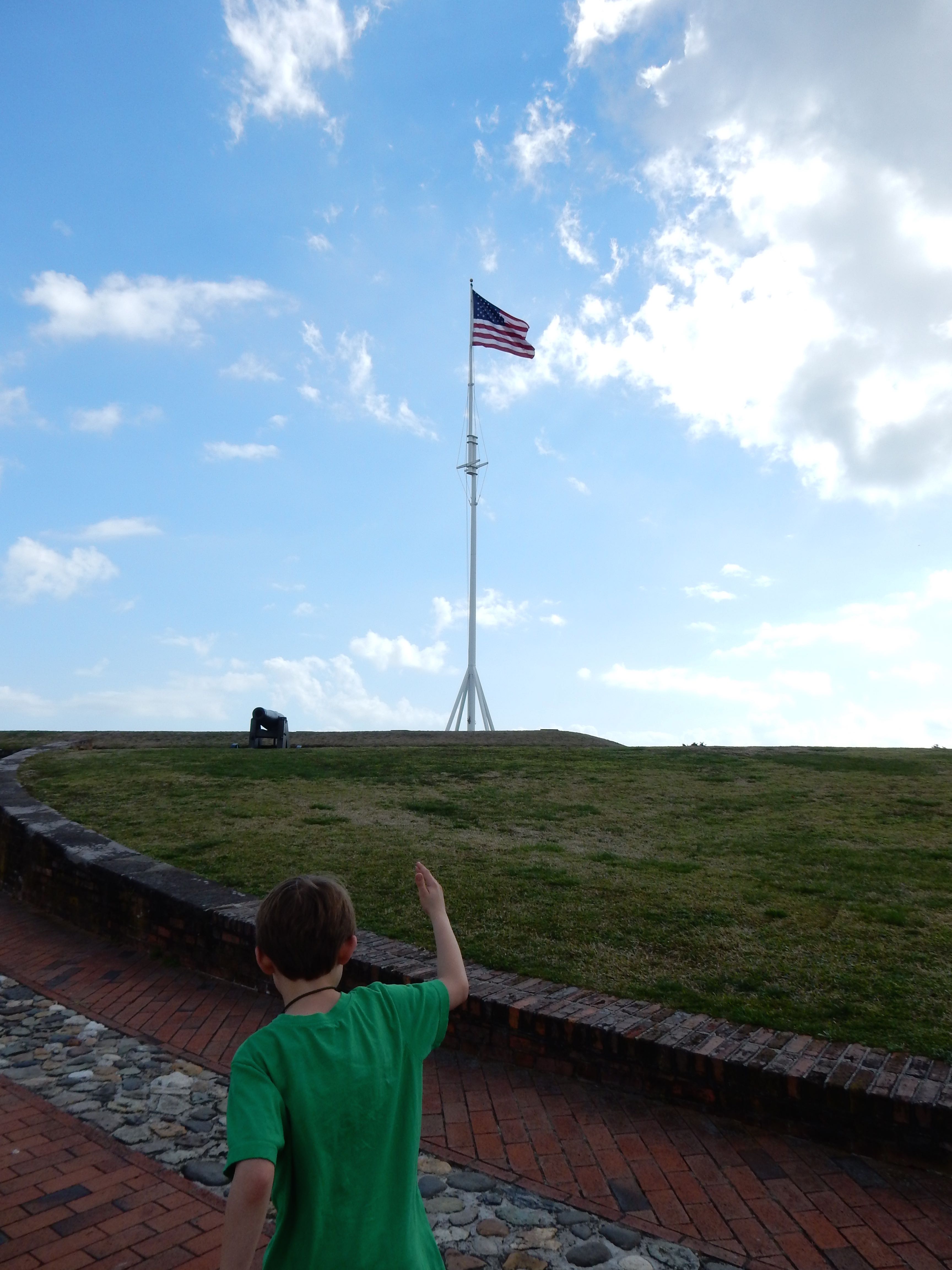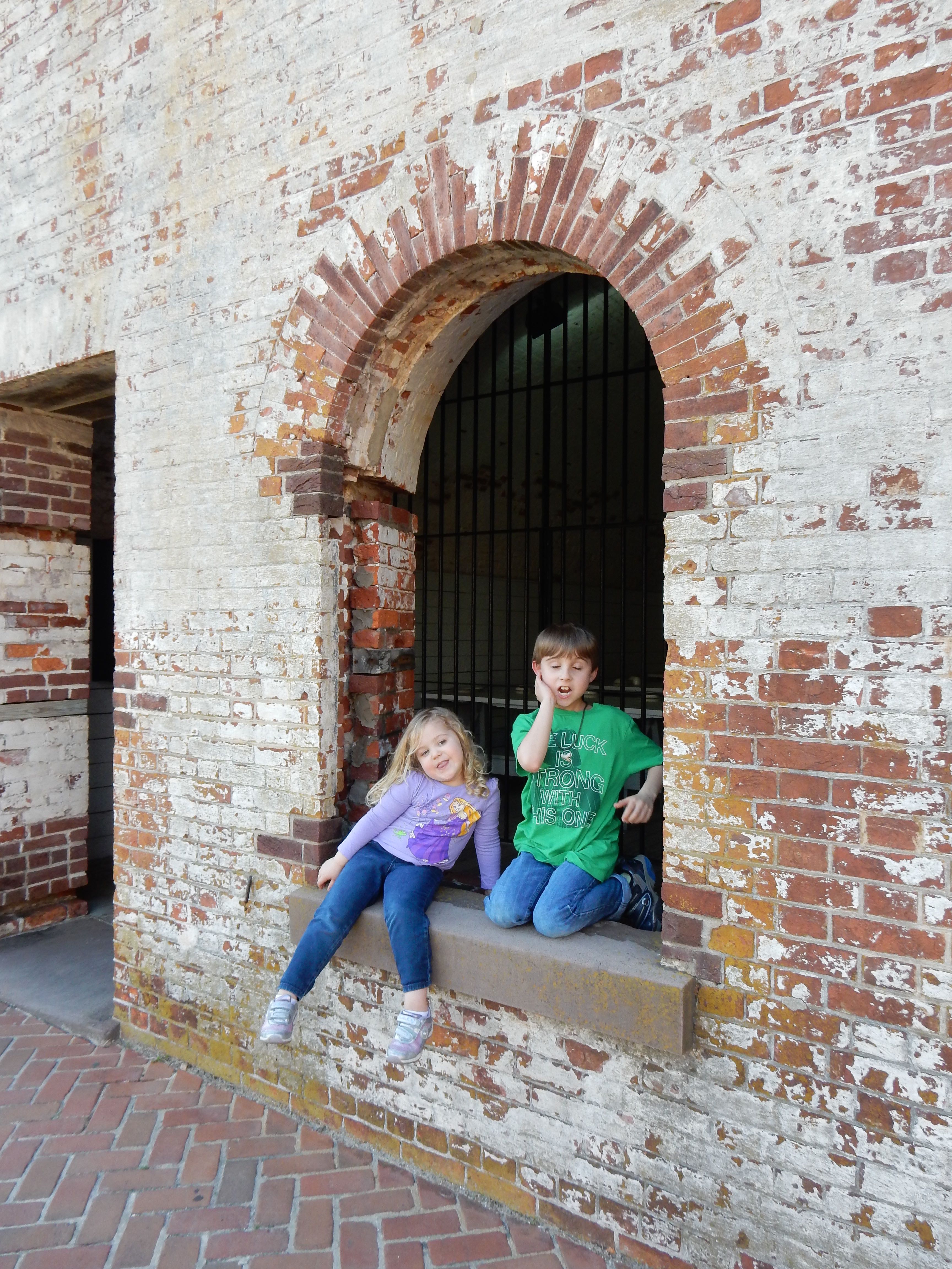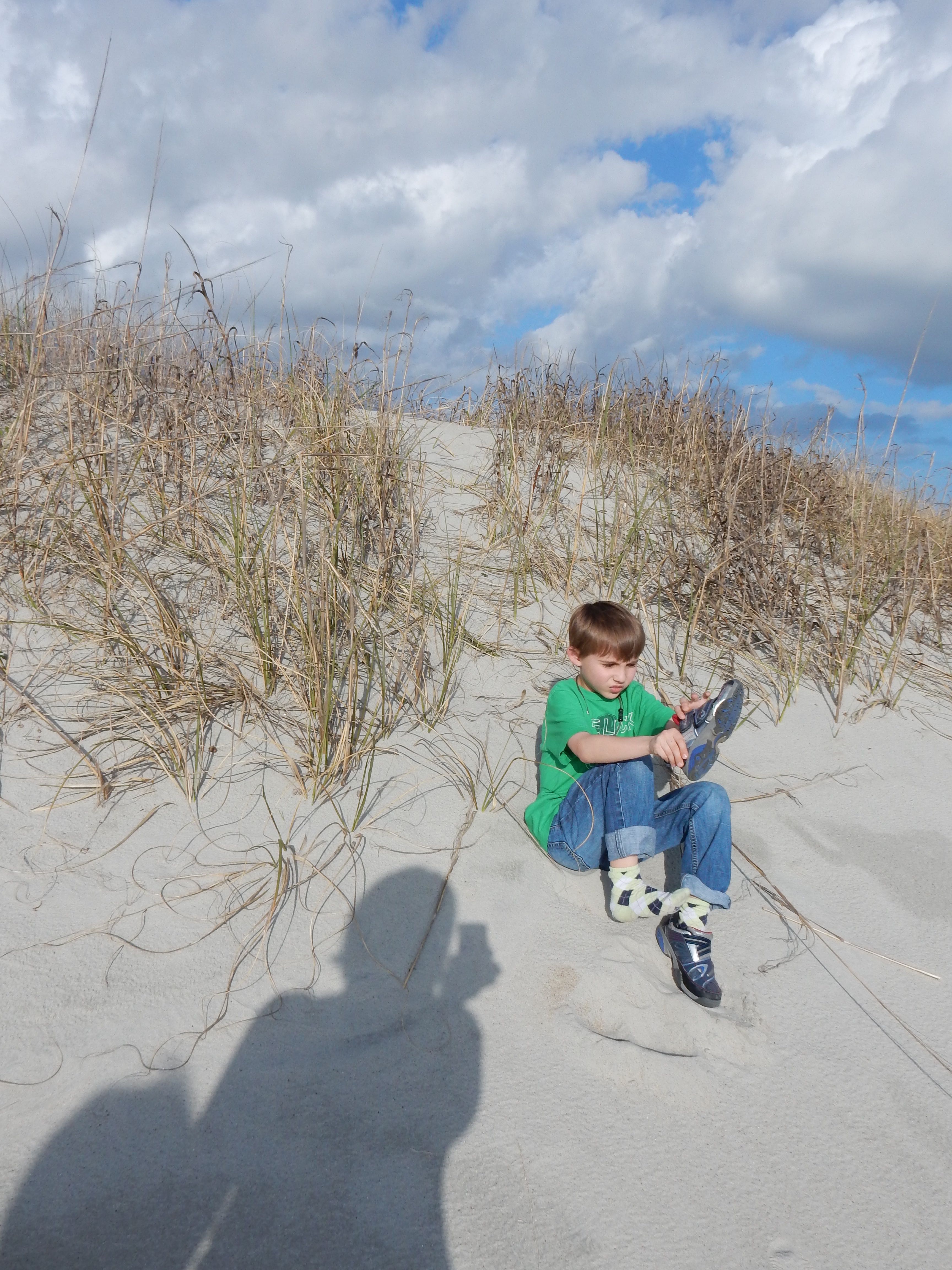 The spring break fun continued today (after a “healthy” breakfast, of course!) Today we were off to the aquarium, always a good time. 🙂 Brian really liked this gigantic plushie sting ray, but it’s nearly as big as him, pretty impractical. We convinced him that just taking pictures with it was okay. 😉 Brian did get a shark tooth necklace at the Wings store, something he wanted to do after seeing a coupon for a free one in the guidebook magazine we’d picked up. We had lunch at the Big Oak Drive-In, known for its yummy shrimp sandwiches and pretty amazing onion rings, too. We even got some apple fritters for dessert. 🙂 Then, we headed off to Fort Macon, or “Fort Fun” as the Visitor’s Guide called it. 😉 Brandon and I had some laughs about that, but the kids really did have fun there! They like running around and opening up all the doors to see what’s inside. In the gift shop, Kendall liked the display of Audubon plushie birds, especially the cardinals, but didn’t actually ask to get one. 🙂 Brandon got a deck of replica “spotter” playing cards, which were used during wartime to help the soldiers learn how to identify planes. Of course Brandon doesn’t need any help with that, he can already identify every plane we see. 🙂 Afterward, we spent a little time on the beach flying kites and playing in the sand some. It’s too cool for getting in the water, but it was fun to be nearby! Kendall had been really jealous of Brian’s note-taking, so at the grocery store we got her a cute pink notebook to have for her own. She was so sleepy, she ended up taking a nap on the couch while we made dinner!