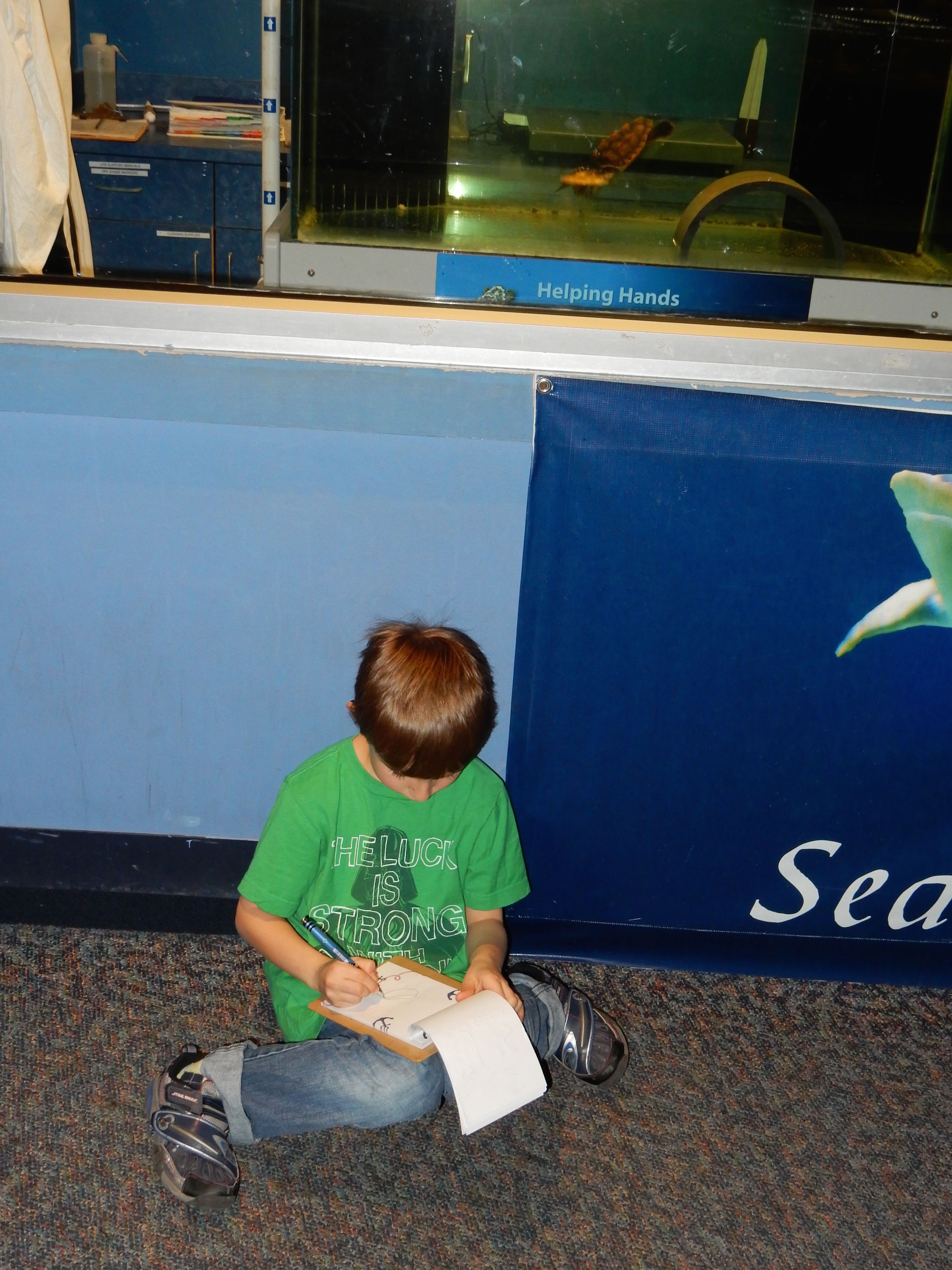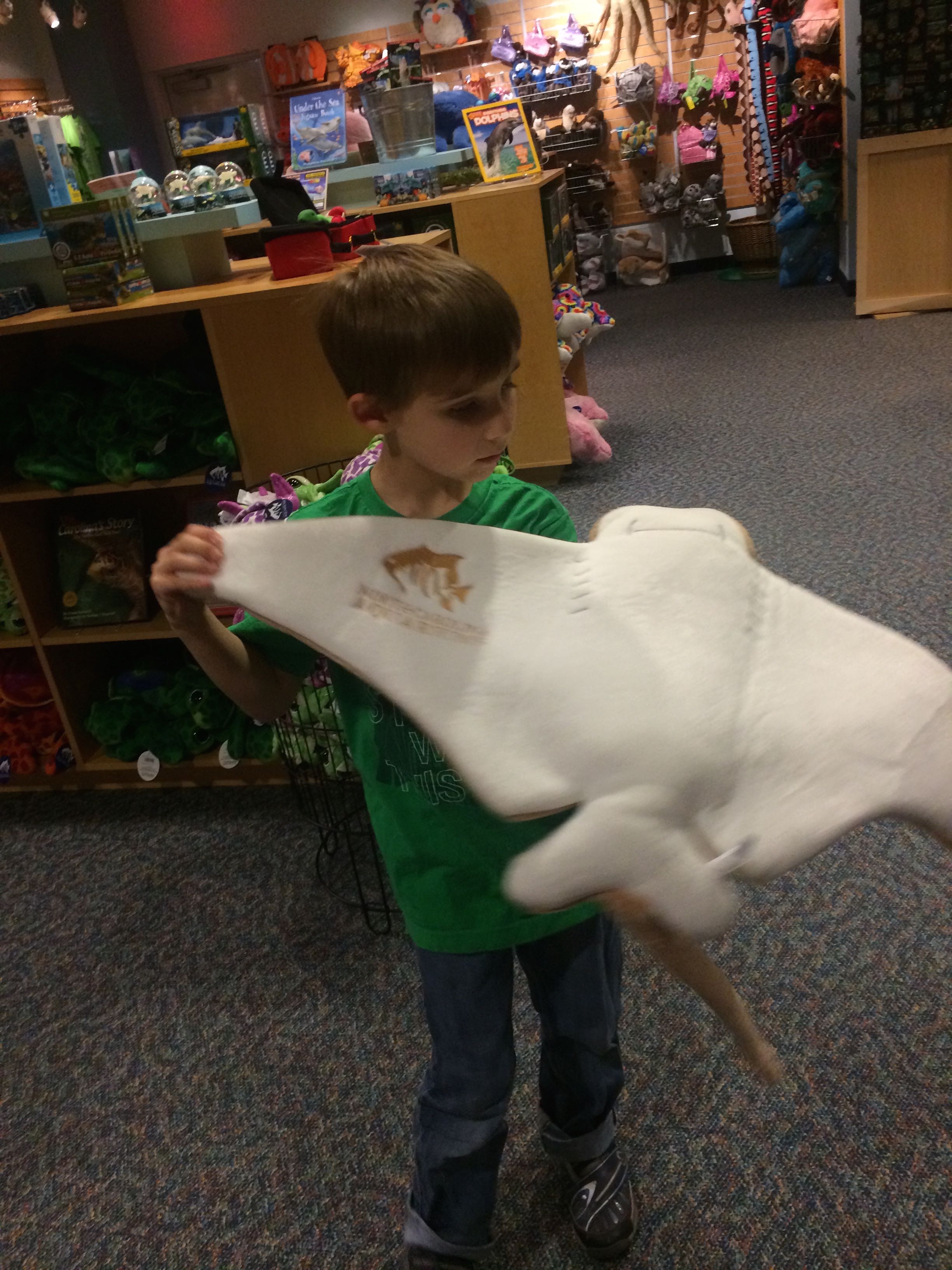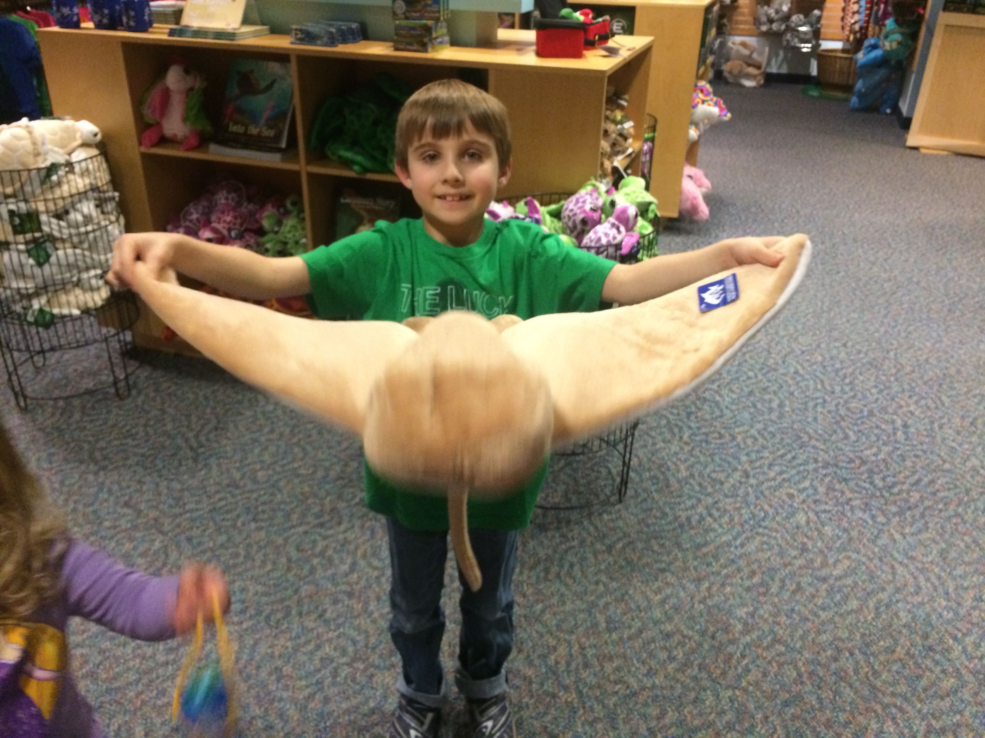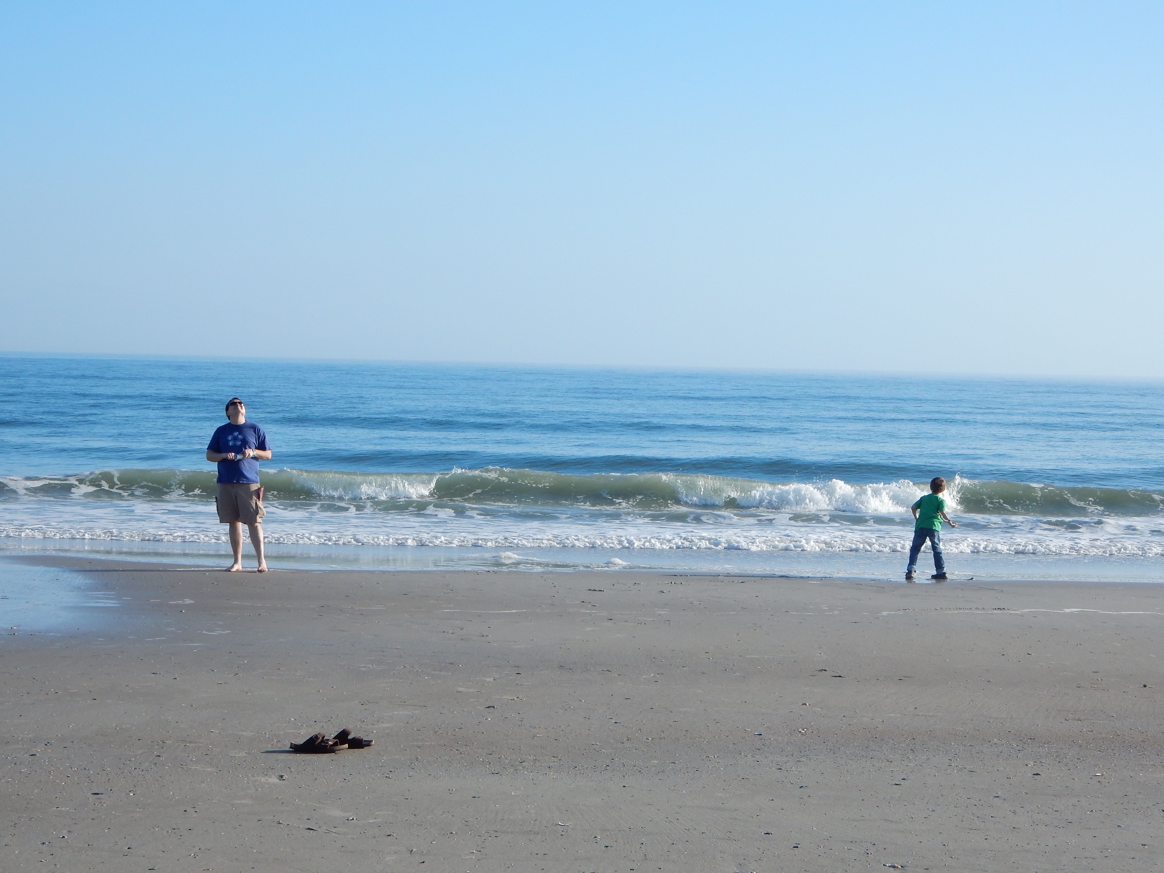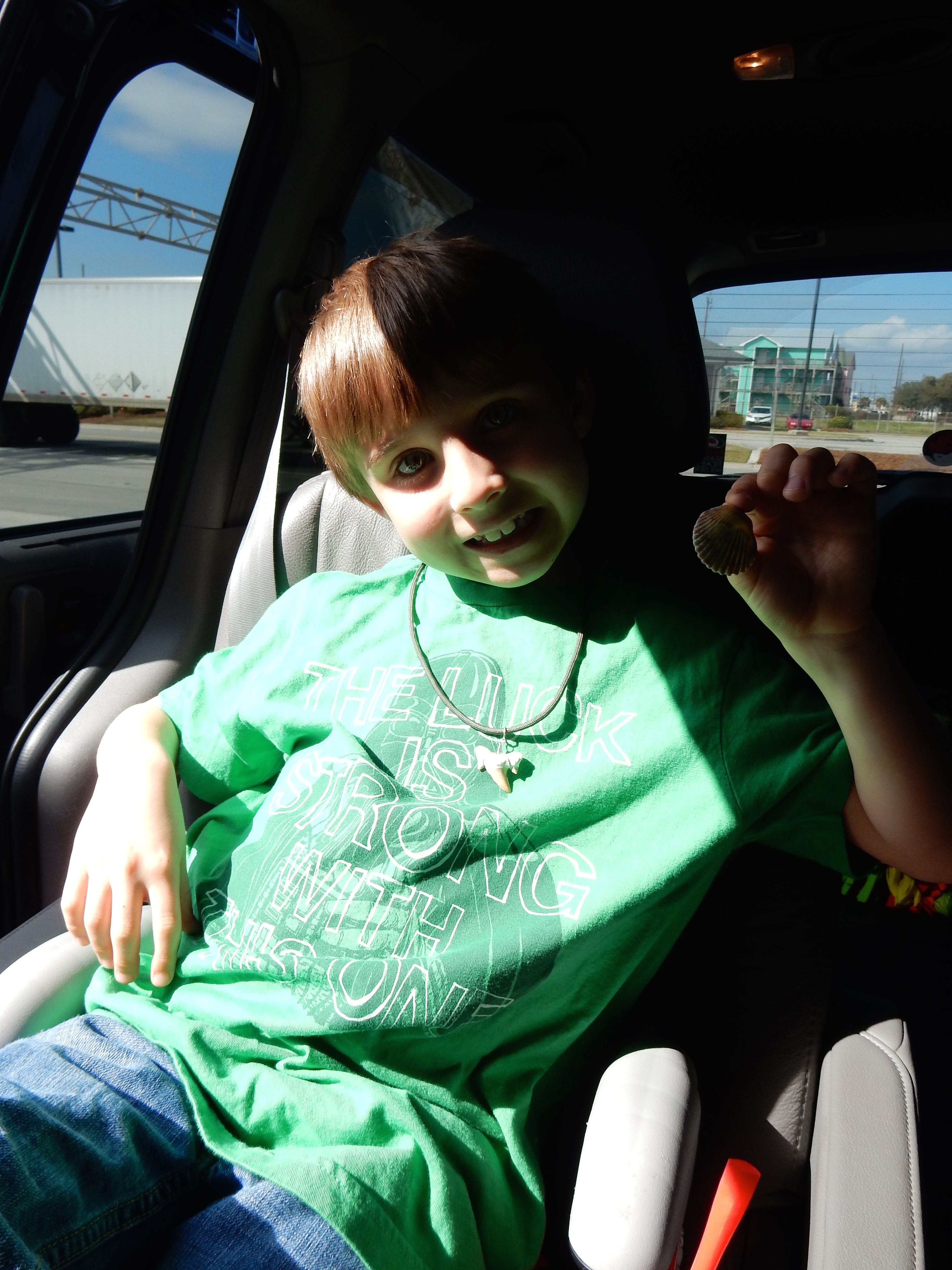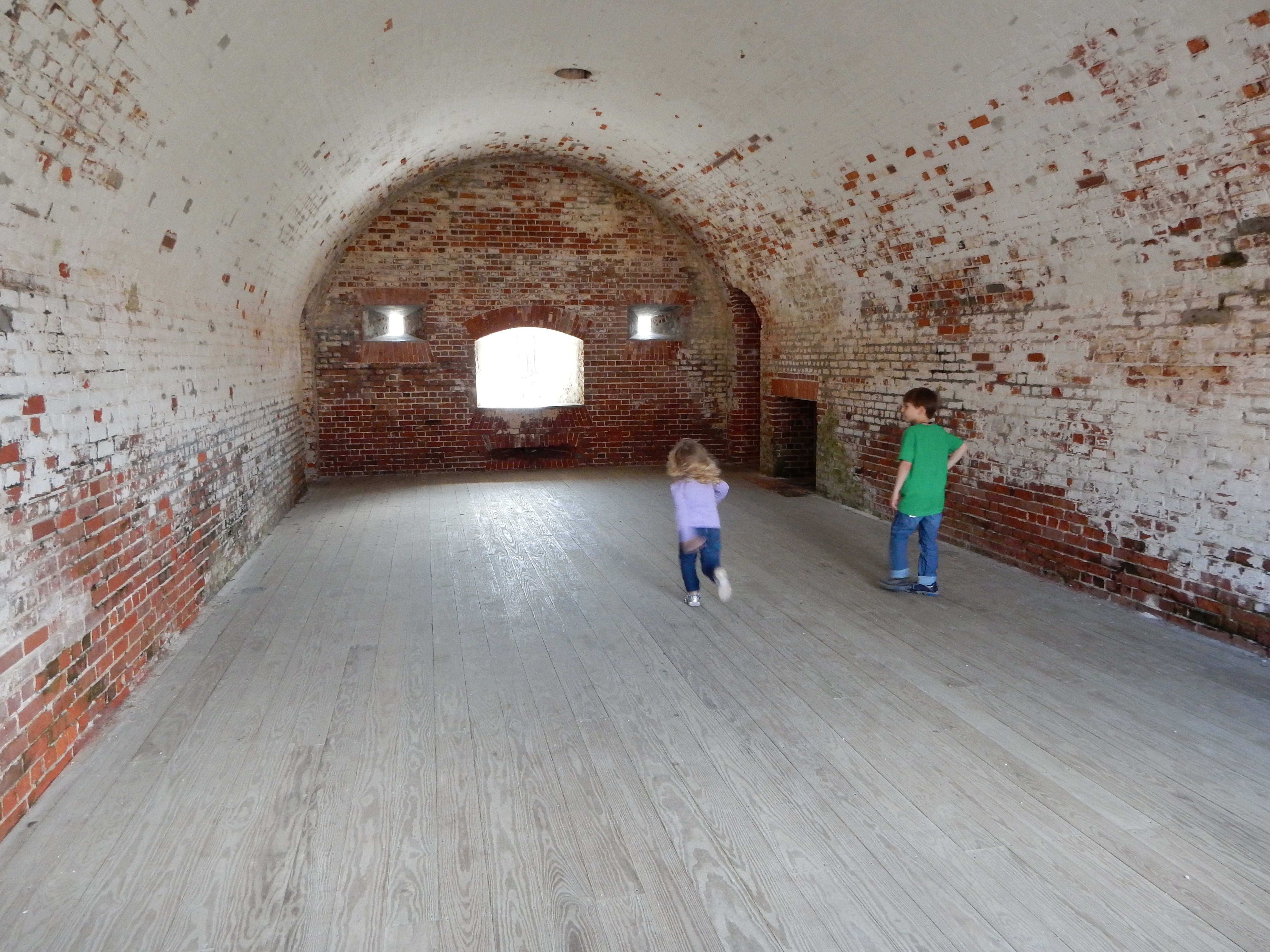 The spring break fun continued today (after a “healthy” breakfast, of course!) Today we were off to the aquarium, always a good time. 🙂 Brian really liked this gigantic plushie sting ray, but it’s nearly as big as him, pretty impractical. We convinced him that just taking pictures with it was okay. 😉 Brian did get a shark tooth necklace at the Wings store, something he wanted to do after seeing a coupon for a free one in the guidebook magazine we’d picked up. We had lunch at the Big Oak Drive-In, known for its yummy shrimp sandwiches and pretty amazing onion rings, too. We even got some apple fritters for dessert. 🙂 Then, we headed off to Fort Macon, or “Fort Fun” as the Visitor’s Guide called it. 😉 Brandon and I had some laughs about that, but the kids really did have fun there! They like running around and opening up all the doors to see what’s inside. In the gift shop, Kendall liked the display of Audubon plushie birds, especially the cardinals, but didn’t actually ask to get one. 🙂 Brandon got a deck of replica “spotter” playing cards, which were used during wartime to help the soldiers learn how to identify planes. Of course Brandon doesn’t need any help with that, he can already identify every plane we see. 🙂 Afterward, we spent a little time on the beach flying kites and playing in the sand some. It’s too cool for getting in the water, but it was fun to be nearby! Kendall had been really jealous of Brian’s note-taking, so at the grocery store we got her a cute pink notebook to have for her own. She was so sleepy, she ended up taking a nap on the couch while we made dinner!