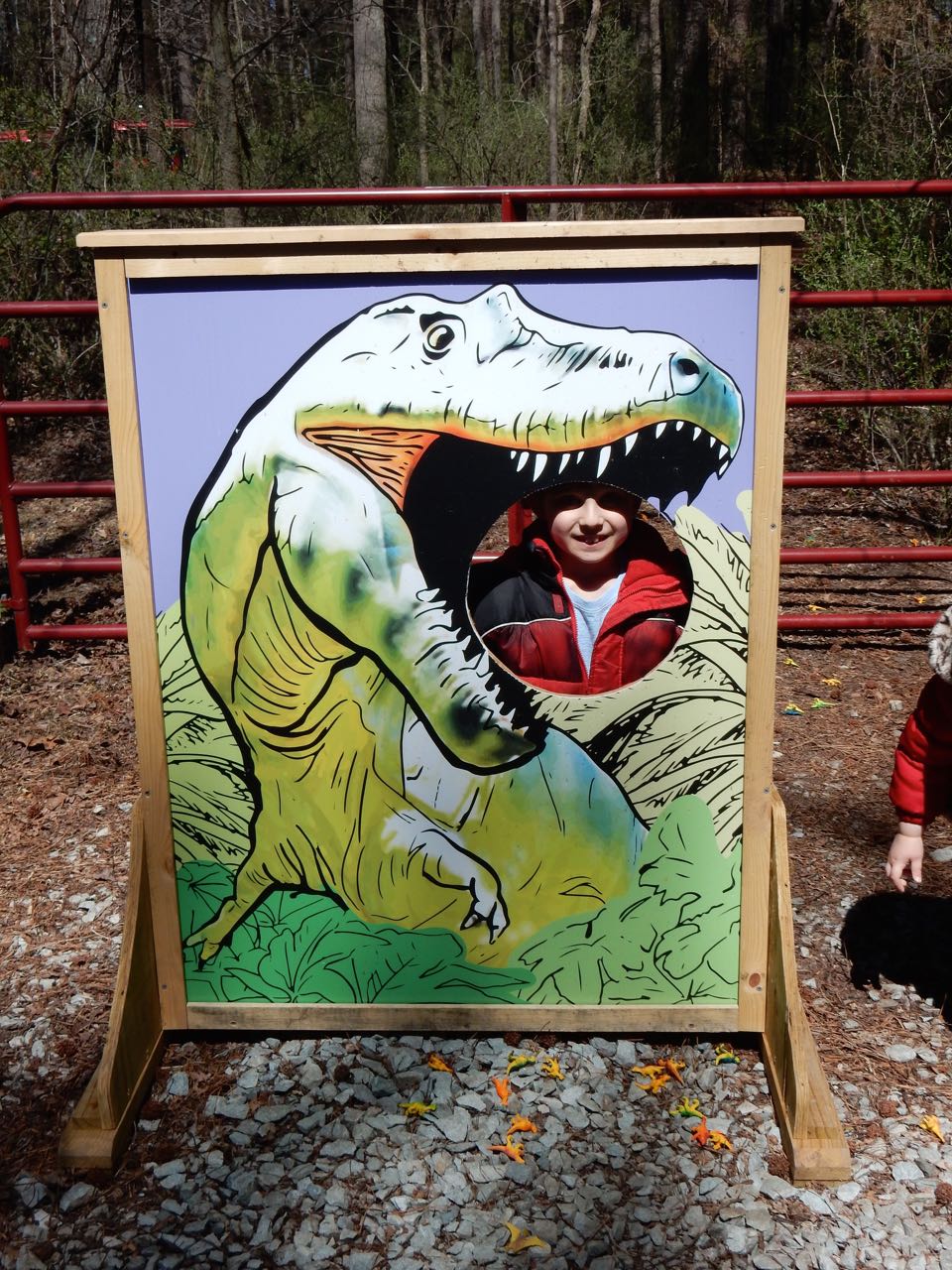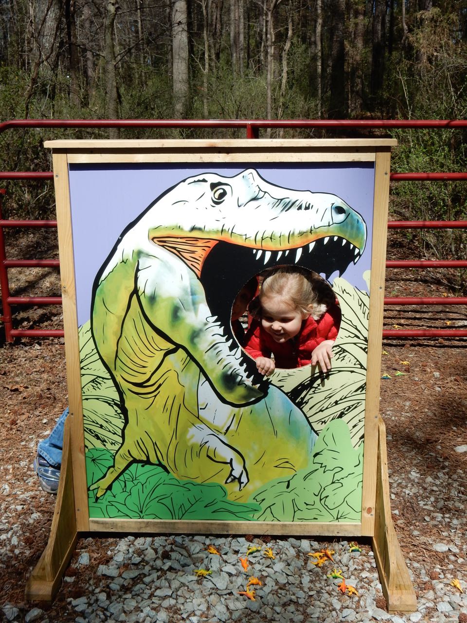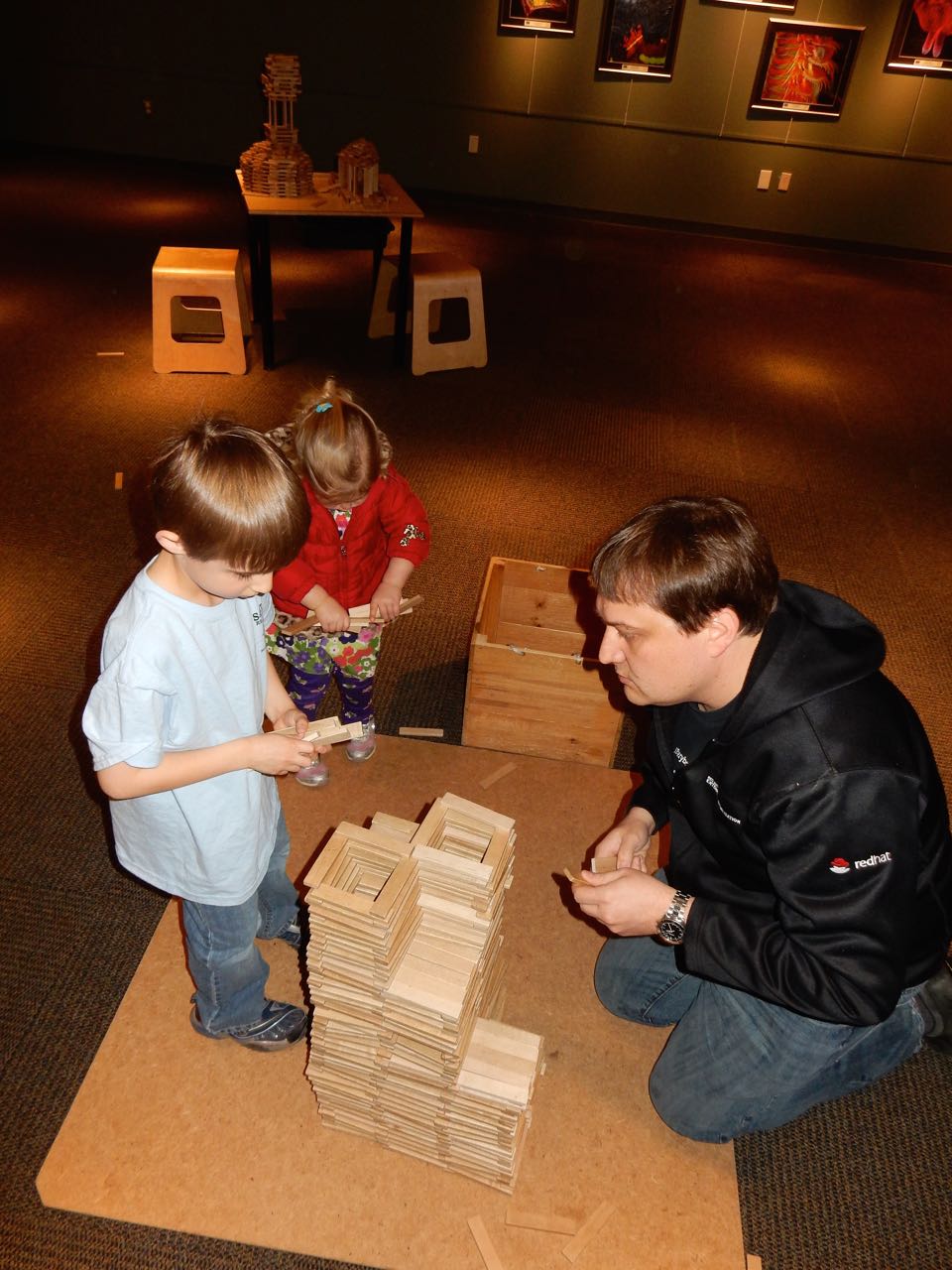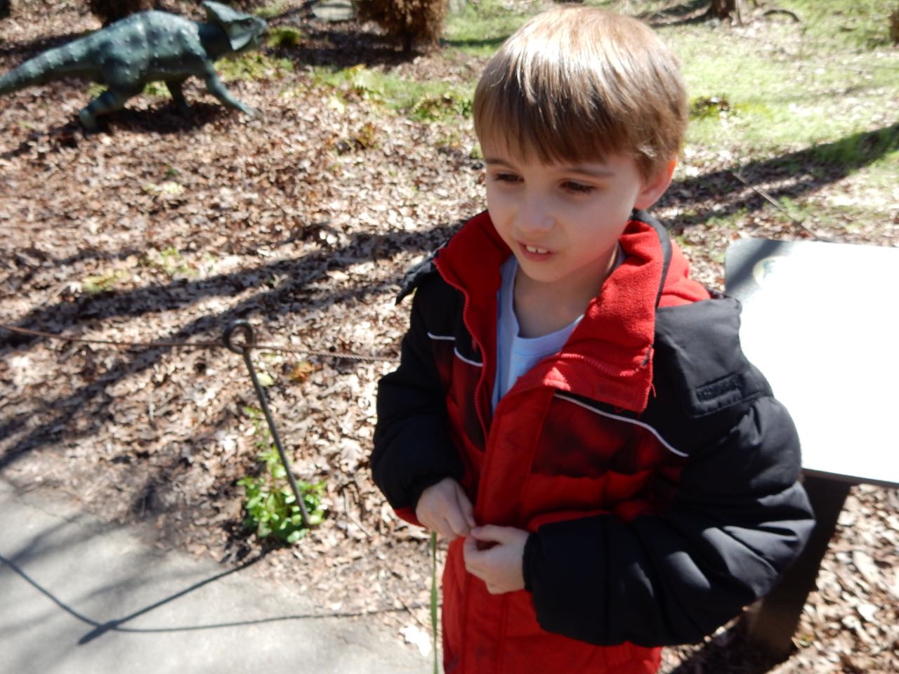Today was the Dino Egg Hunt at the Museum of Life + Science in Durham! On the way in, we were happy to run into Brian’s pal from his Goddard days, Julian. What a nice surprise! The kids played outside for awhile before it was our turn to hunt. The fossil dig area was a hit! Julian is a bit of an expert about dinosaurs, so he told us about some of his favorites. There were some new activities outside, like the big dinosaur 3D puzzles, and some old favorites. The kids had fun with each, and when we got too cold, we retreated indoors for awhile. The kids played in SoundScapes for awhile, and then at the Keva blocks. Brandon made a great structure, highly precise. I took Kendall to look at some of her favorite weather displays for awhile so he could have a chance to finish building it. Predictably, Kendall crashed the block structure not soon after it was complete! Oh well. I guess she couldn’t resist. 🙂