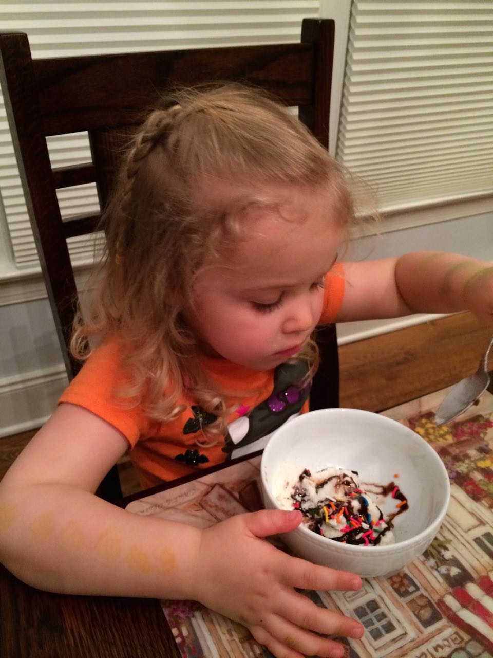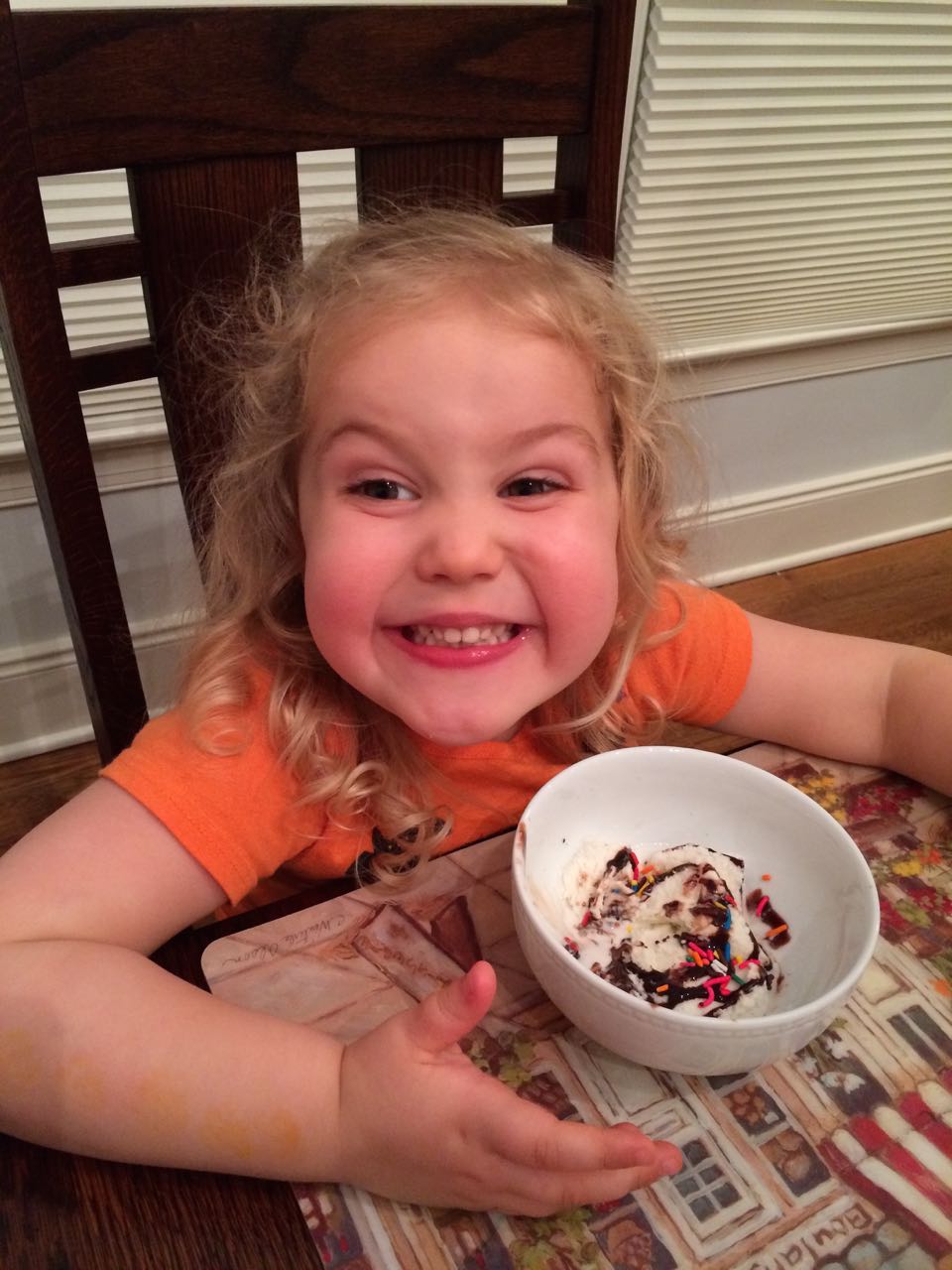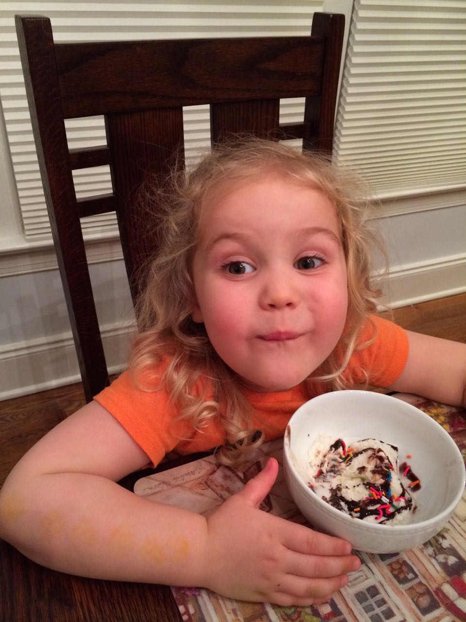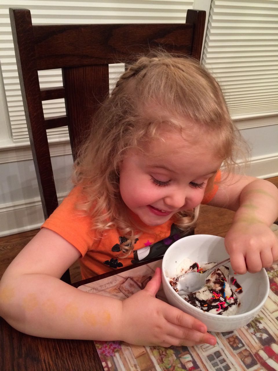 Today I let Brian work on his Crystal Mining set–basically, three interesting rocks in a brick of plaster of paris, where the objective is to slowly saw them out with a plastic knife. Talk about busy work! But, the kids found it fun and exciting, to see what will get uncovered. While putting some things away while the kids were otherwise occupied, I suddenly remembered the silver bowl that we’d bought in India, and the two tiny silver spoons we’d bought at the same time, just in case we got married and had a baby one day. We were in line, checking out, and I was holding the one tiny spoon we’d picked out. Our eyes met and we both said something like, “ah, maybe get a second one–you never know.” So, our babies both had silver spoons since 1999, even though we didn’t actually feed them with those spoons! We’d more or less forgotten about the spoons, I guess (and were busy, carefully feeding the kids with the safest, most age-appropriate modern flatware.) 😉 We had dinner at Grandma Sue’s house, and saw the Easter Egg decorations Brian had made! Kendall was really excited about her dessert of ice cream, chocolate syrup, and the best part–rainbow sprinkles!