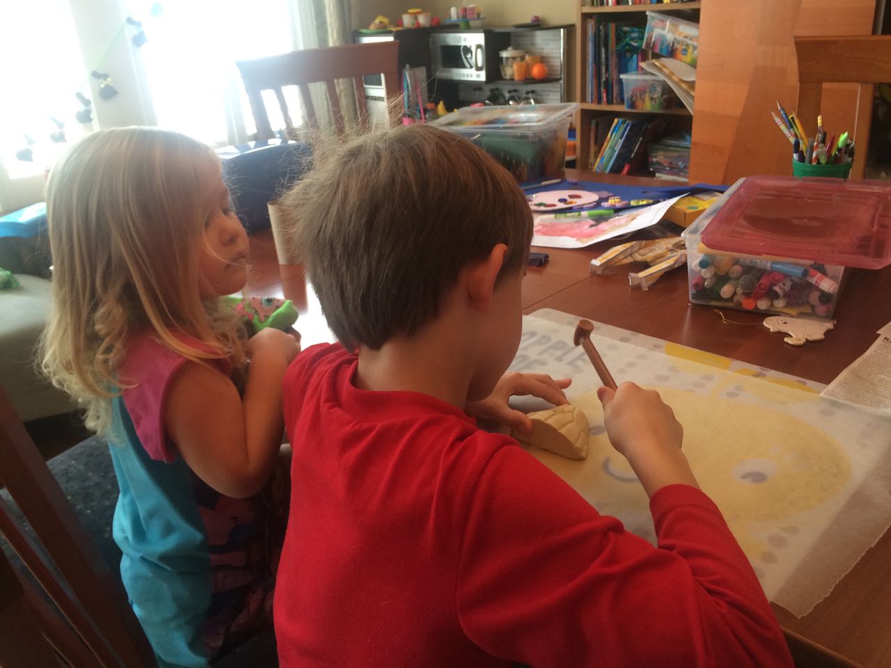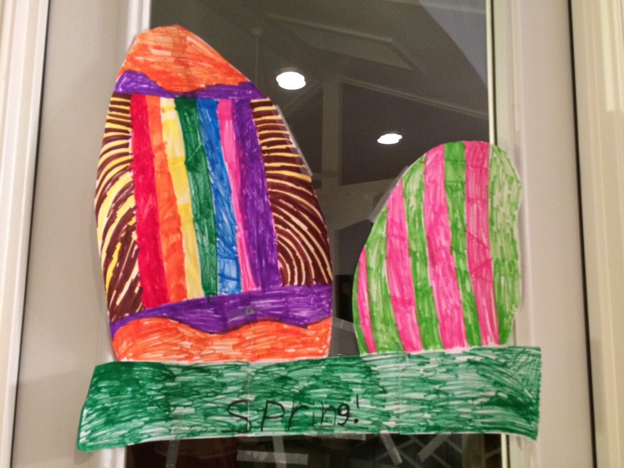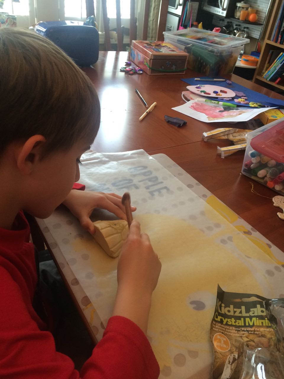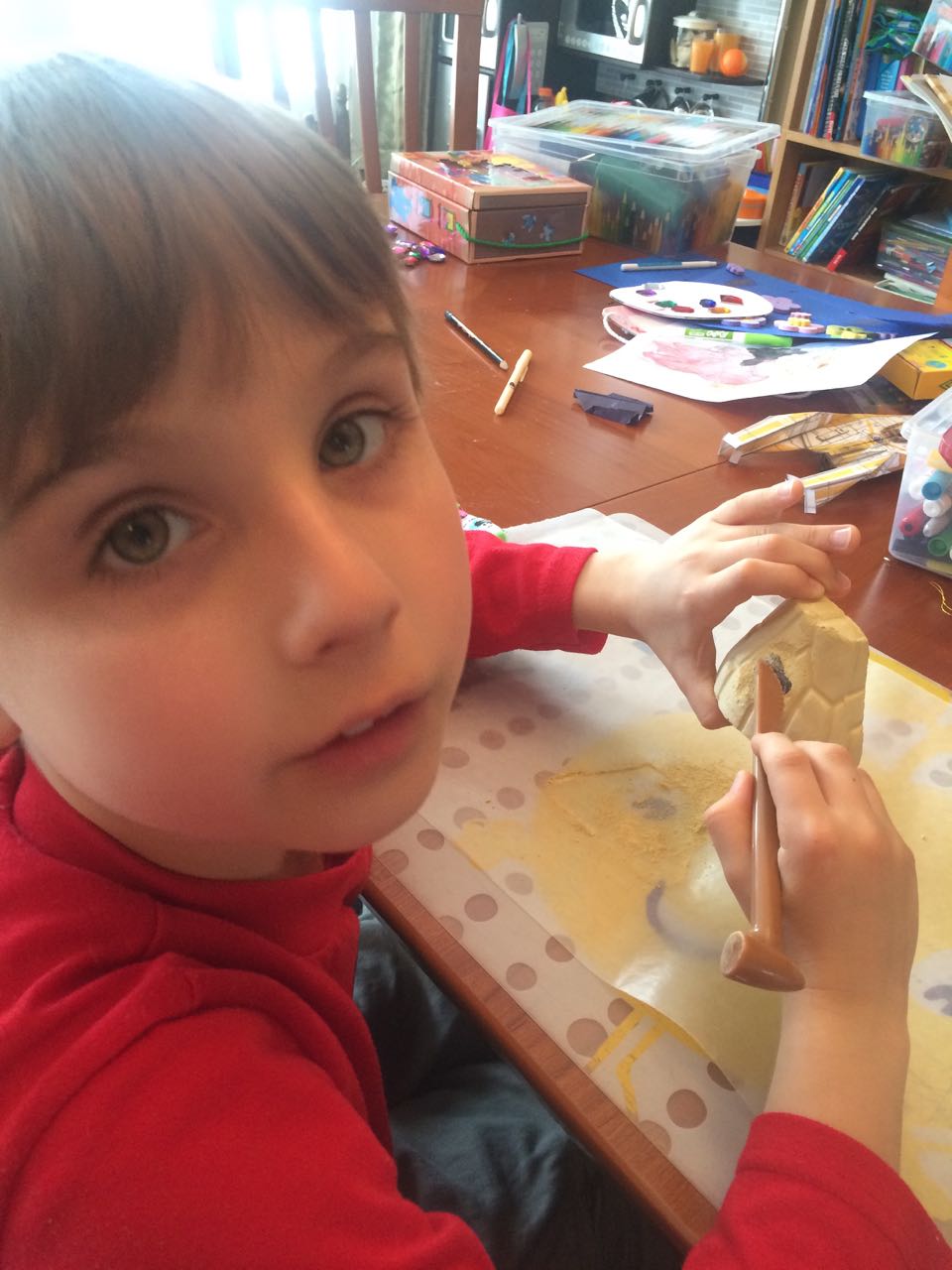 Today I let Brian work on his Crystal Mining set–basically, three interesting rocks in a brick of plaster of paris, where the objective is to slowly saw them out with a plastic knife. Talk about busy work! But, the kids found it fun and exciting, to see what will get uncovered. While putting some things away while the kids were otherwise occupied, I suddenly remembered the silver bowl that we’d bought in India, and the two tiny silver spoons we’d bought at the same time, just in case we got married and had a baby one day. We were in line, checking out, and I was holding the one tiny spoon we’d picked out. Our eyes met and we both said something like, “ah, maybe get a second one–you never know.” So, our babies both had silver spoons since 1999, even though we didn’t actually feed them with those spoons! We’d more or less forgotten about the spoons, I guess (and were busy, carefully feeding the kids with the safest, most age-appropriate modern flatware.) 😉 We had dinner at Grandma Sue’s house, and saw the Easter Egg decorations Brian had made! Kendall was really excited about her dessert of ice cream, chocolate syrup, and the best part–rainbow sprinkles!