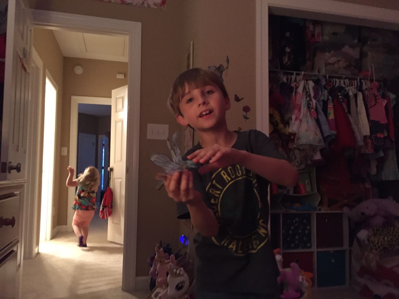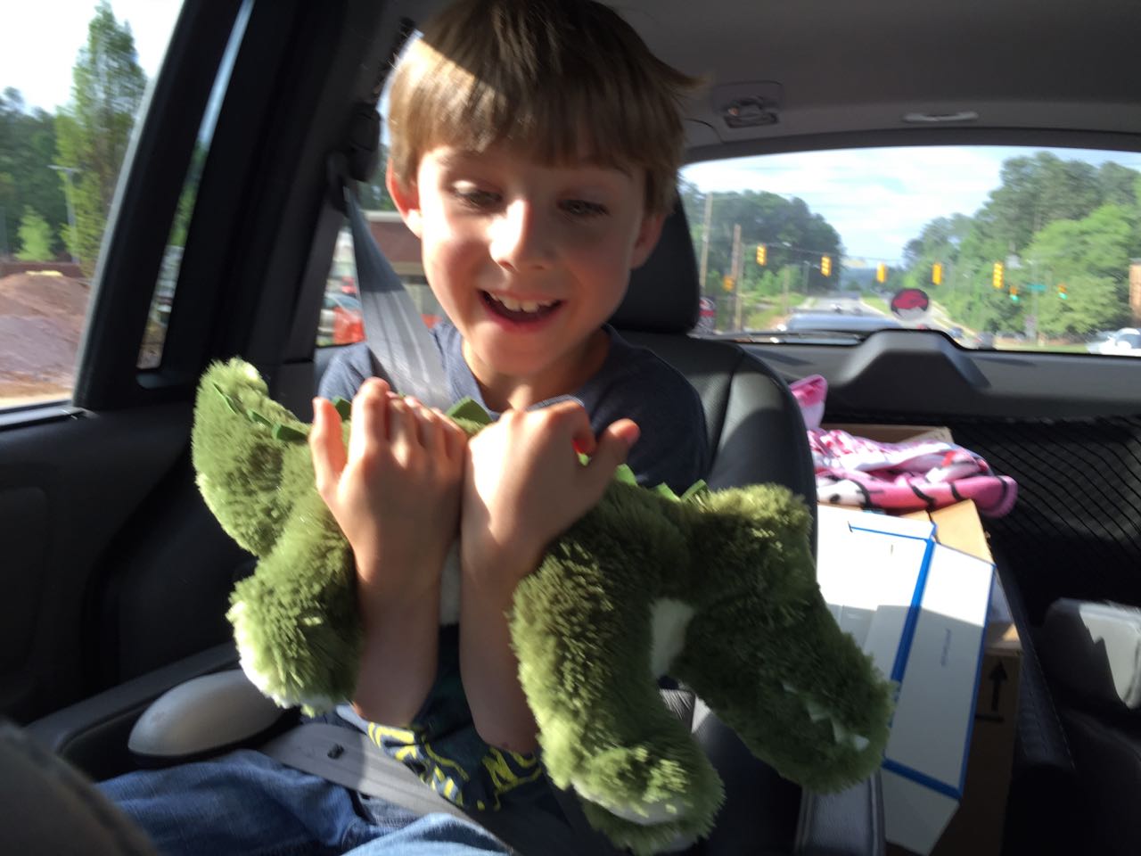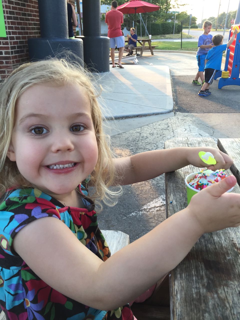 Today was Brian’s last day of first grade! The class celebrated with a pajama party, and the kids got to go to school in their PJs and bring a stuffed animal friend. Brian took Jason the Alligator, the softest reptile you’ll ever meet, a gift from Grandpa Steve before Brian was even born. 🙂 After school, we asked Brian where he’d like to go for dinner to celebrate, and he picked Chick-Fil-A. We had a fun dinner, and Kendall got to play in the playspace for a bit (Brian is technically too old for it), and then we all went to Fresh for ice cream! The kids loved their treat, but couldn’t wait to go play with the extra-large Connect Four game! Back at home, they played with the butterfly and dragonfly finger puppets for a bit before bath. 🙂