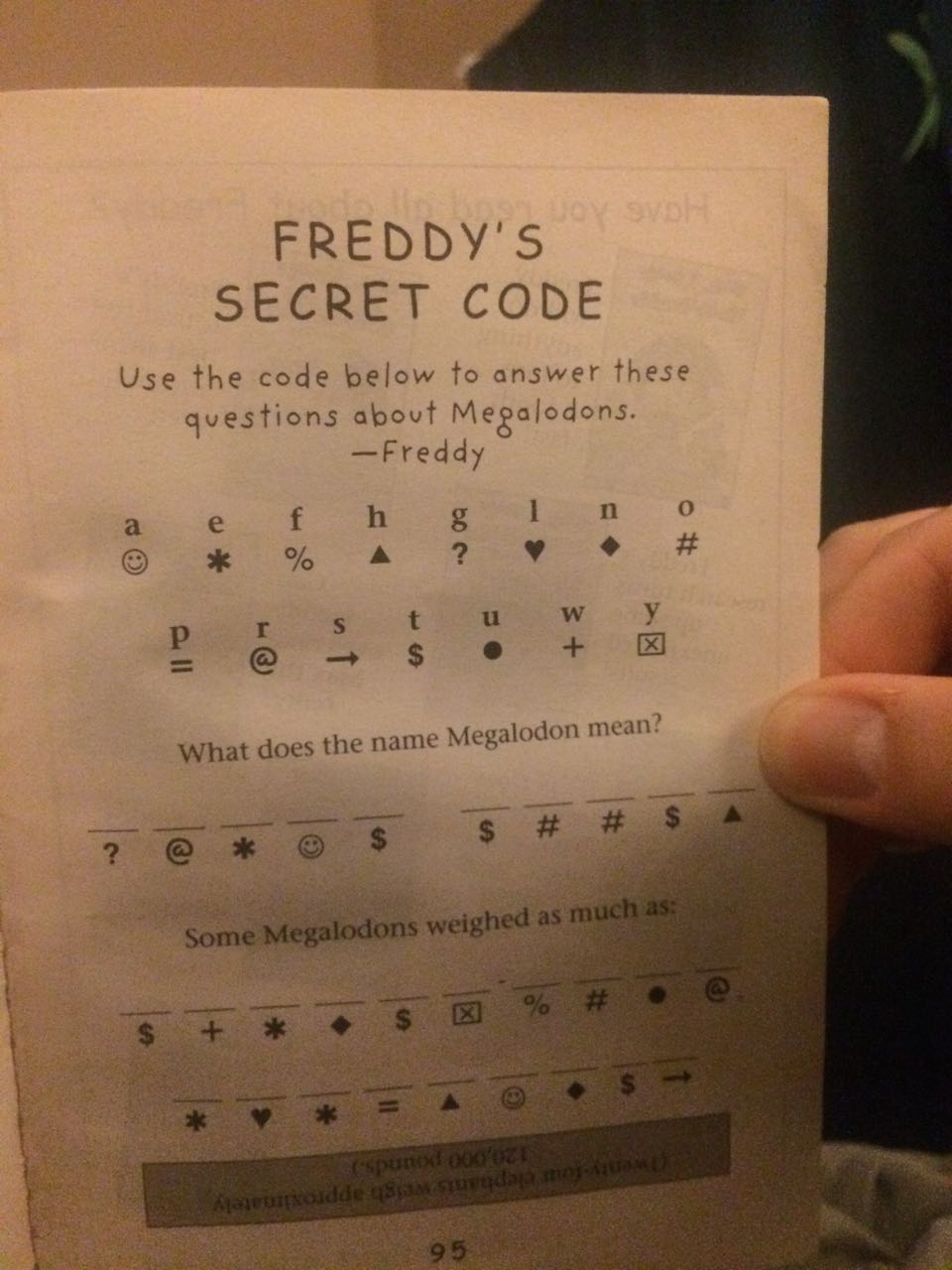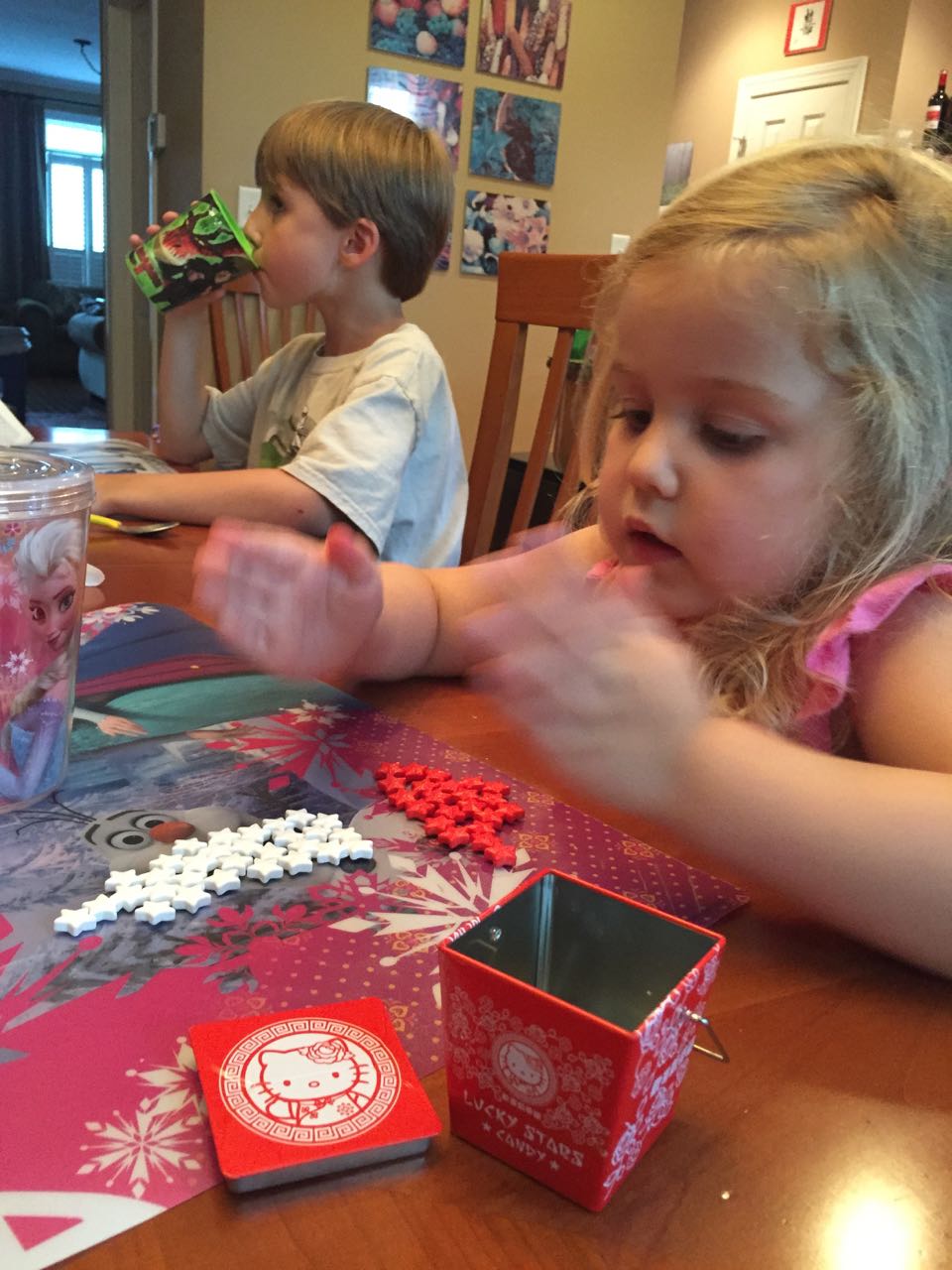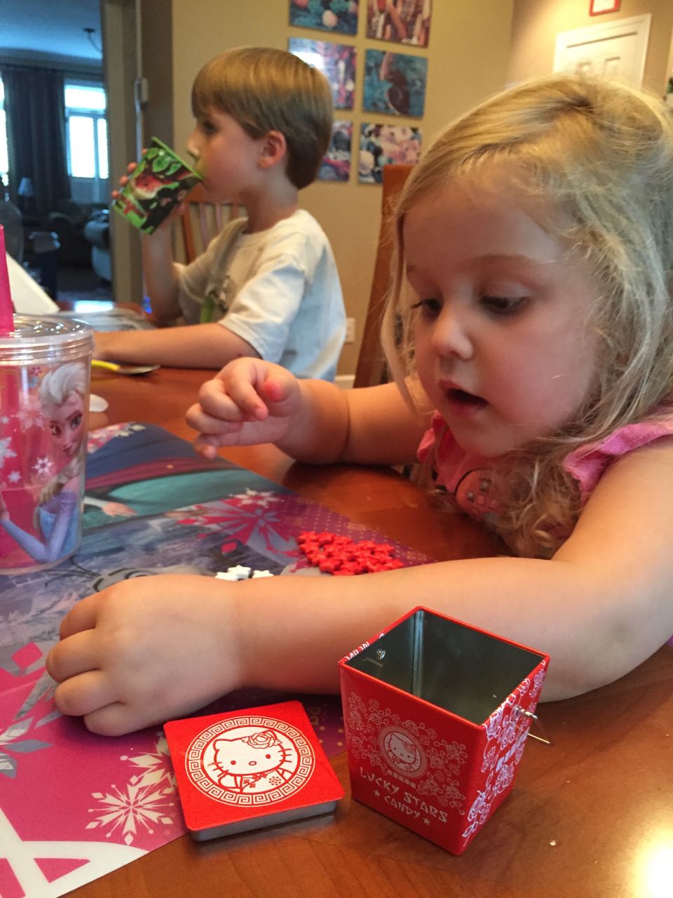 It’s a short week, since Monday was the last day of school, and we’re heading to Colorado soon! Brian’s summer camp for this week was cancelled last minute due to lack of enrollment, so we’re improvising. Brian spent the day with Grandma Sue and went out to a fancy lunch. He liked the fish tank! Nana Rosemary gave the kids some Hello Kitty candy in cute red tins that look like Chinese takeout boxes. Kendall sorted out the colors with her candy. Brian borrowed a book from Goddard School’s mini library about Megalodon sharks. He really liked this one! Before he gave it back, he made me take pictures of Freddy’s Secret Code and the included recipe for lemonade.