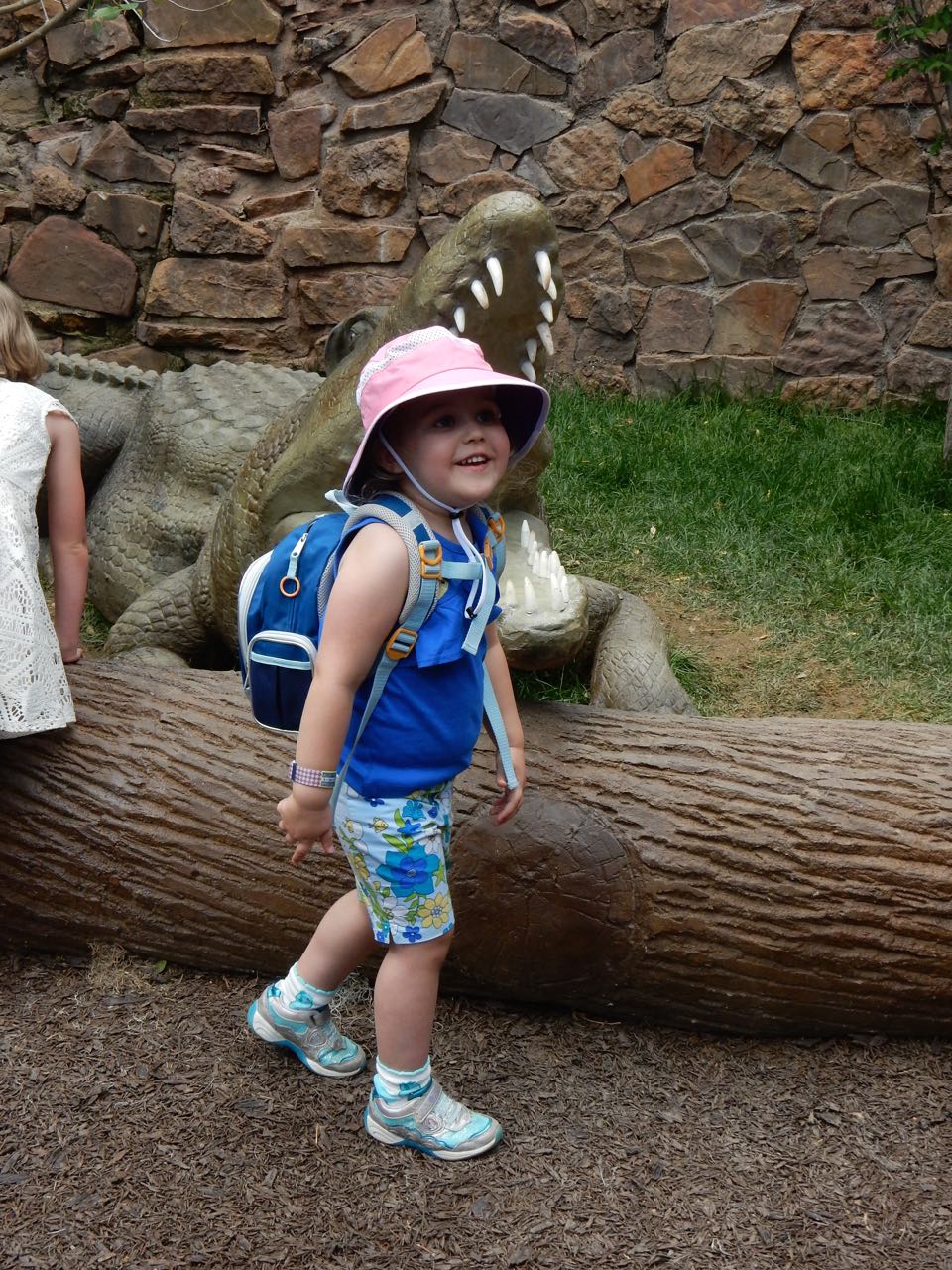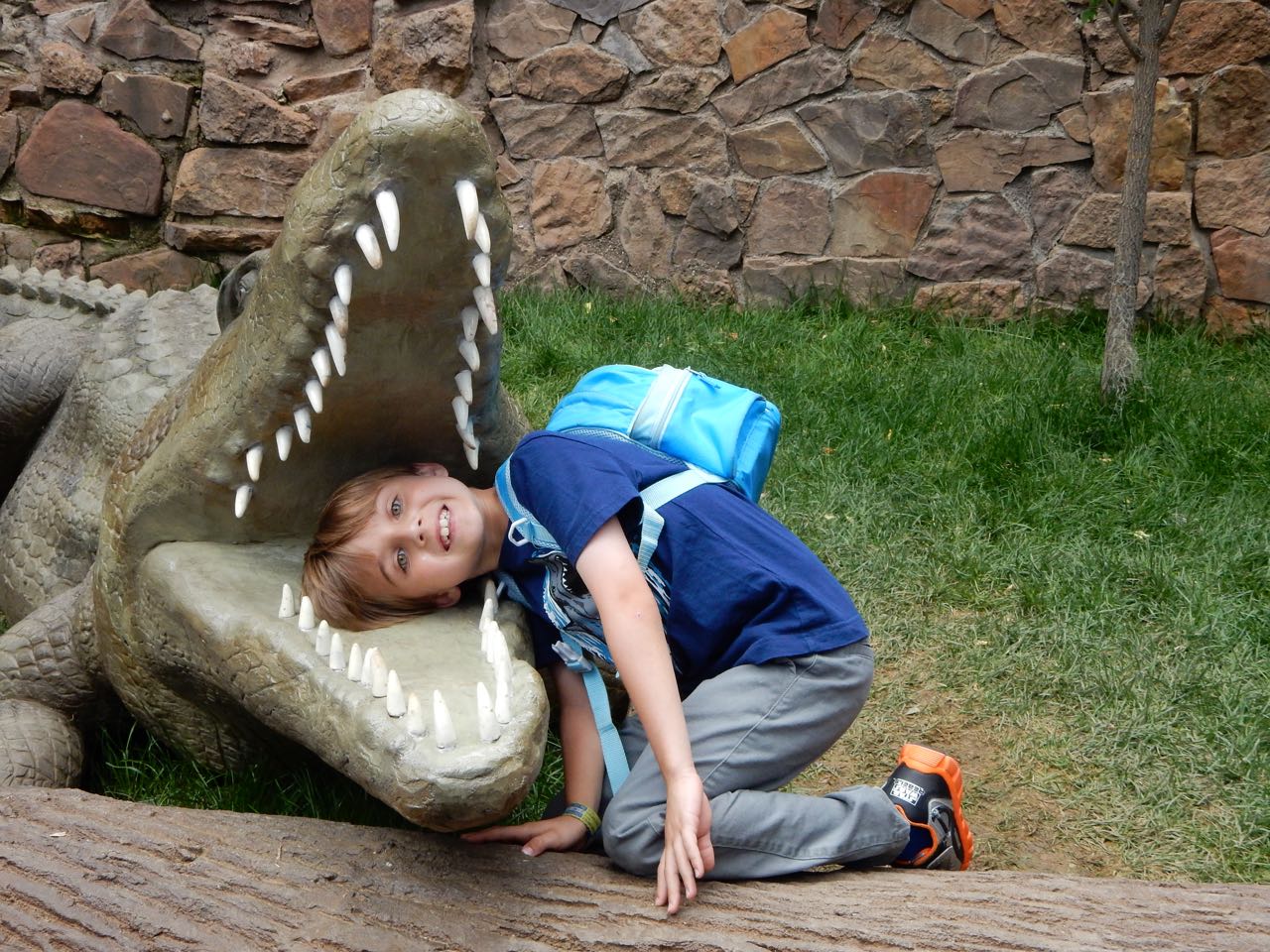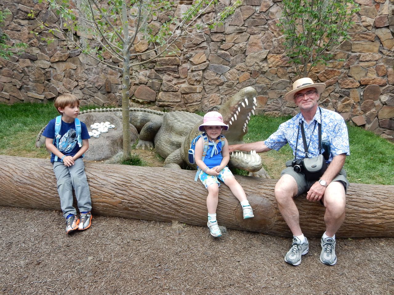 A couple new (to me) exhibits that the kids really liked were the “crash-landed plane” that you sit in and “fly”. The other was the “Australia Walkabout”, which was actually a bunch of exhibits under one umbrella. One really fun part was that there were seeds stuck on Popsicle sticks that you could feed the colorful birds, up close and personal. Of course there were the mandatory kangaroos jumping around that were quite cute. Of course, they also have Peacocks all over the place, and I still have a 16-year hate on for peacocks since my trip to India. Brian tries to mimic the sound occasionally to mess with me! And no Australia exhibit would be complete without crocodiles!
