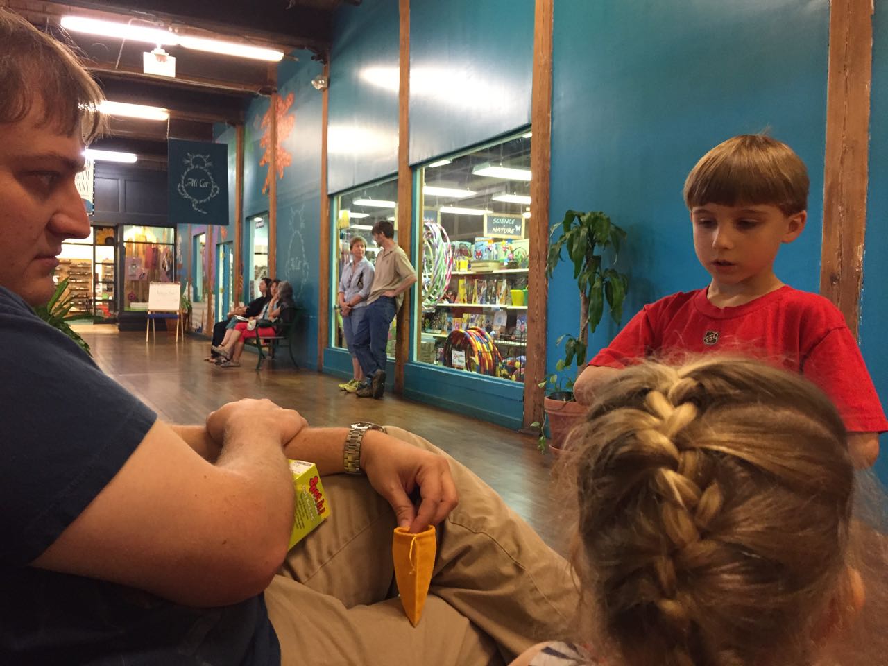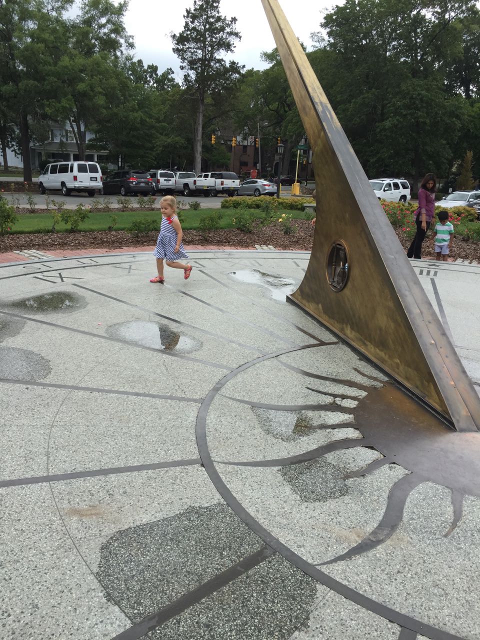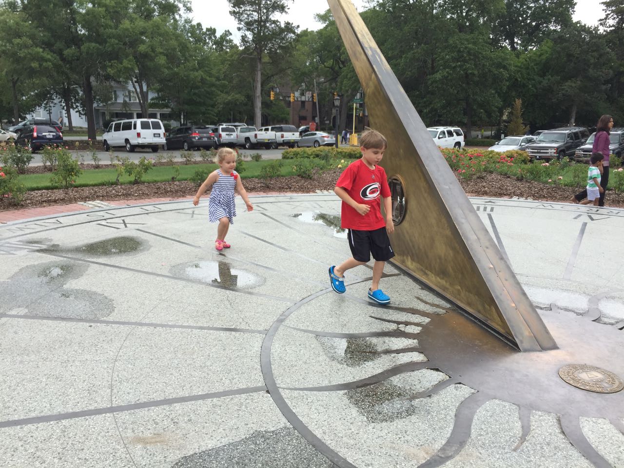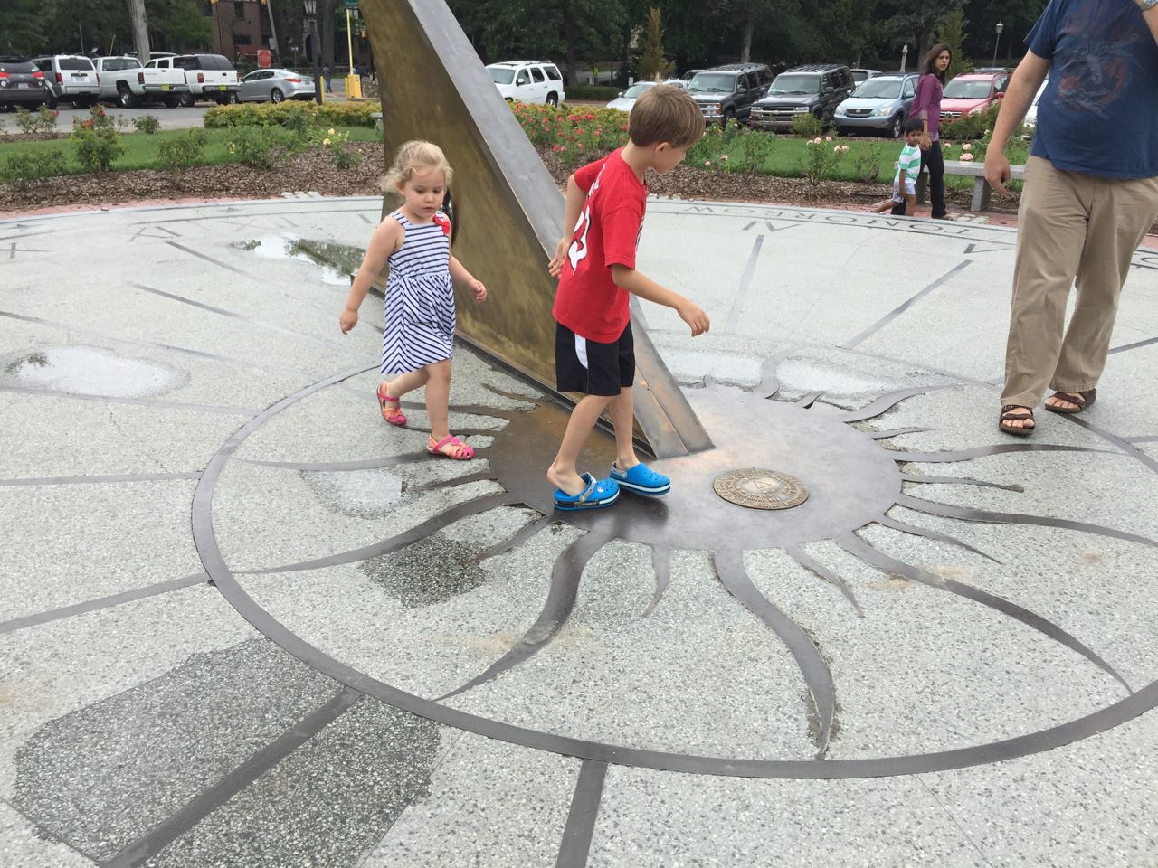 Today we were invited to go to Chapel Hill so that Kendall could participate in a study being done by the UNC Psychology department. This was a follow-up to last year’s visit, which Kendall enjoyed–and who wouldn’t enjoy getting piles of stickers for playing games with the researchers? 🙂 So we made the trek out this morning, and Kendall played her games while I filled out huge surveys, and she earned an entire baggie full of stickers, and even a special purple fairy rubber duckie. Awesome! After having to check off words that I’ve heard Kendall say from a huge list, I’m even more impressed with her vocabulary. Of course the researchers can’t tell us exactly what they’re looking for, or anything about her performance–but she had fun, and seemed to be able to do everything they asked of her. 🙂 Afterward, we had lunch at Elmo’s diner, and took the kids into the Ali Cat toy store, that Brandon and I used to always peer into as we waited for our brunch table (on those lazy child-free Sunday mornings, way back when!) Kendall chose a cool book about Wonder Woman, and Brian chose to get some rocks (they have real rock specimens here, not the artificially-colored polished stones which are so common at museums these days). We also got a travel edition of Spot It, which is a fun card game the kids like. Kendall also saw this Mermaid Excavation kit she wanted, but it was after I’d already checked out–I think I’ll order it for her online, it’s cheaper at Amazon, anyway. 😉 Following that, we walked around the campus some, showing the kids some landmarks like the Davie Poplar. We went to Morehead Planetarium for a science demonstration, a tour through the Gross Labs exhibit, and a planetarium show–and of course running-around-the-sundial time. We made a really fun science-filled day of it, and did our part to help out some real scientists, too!