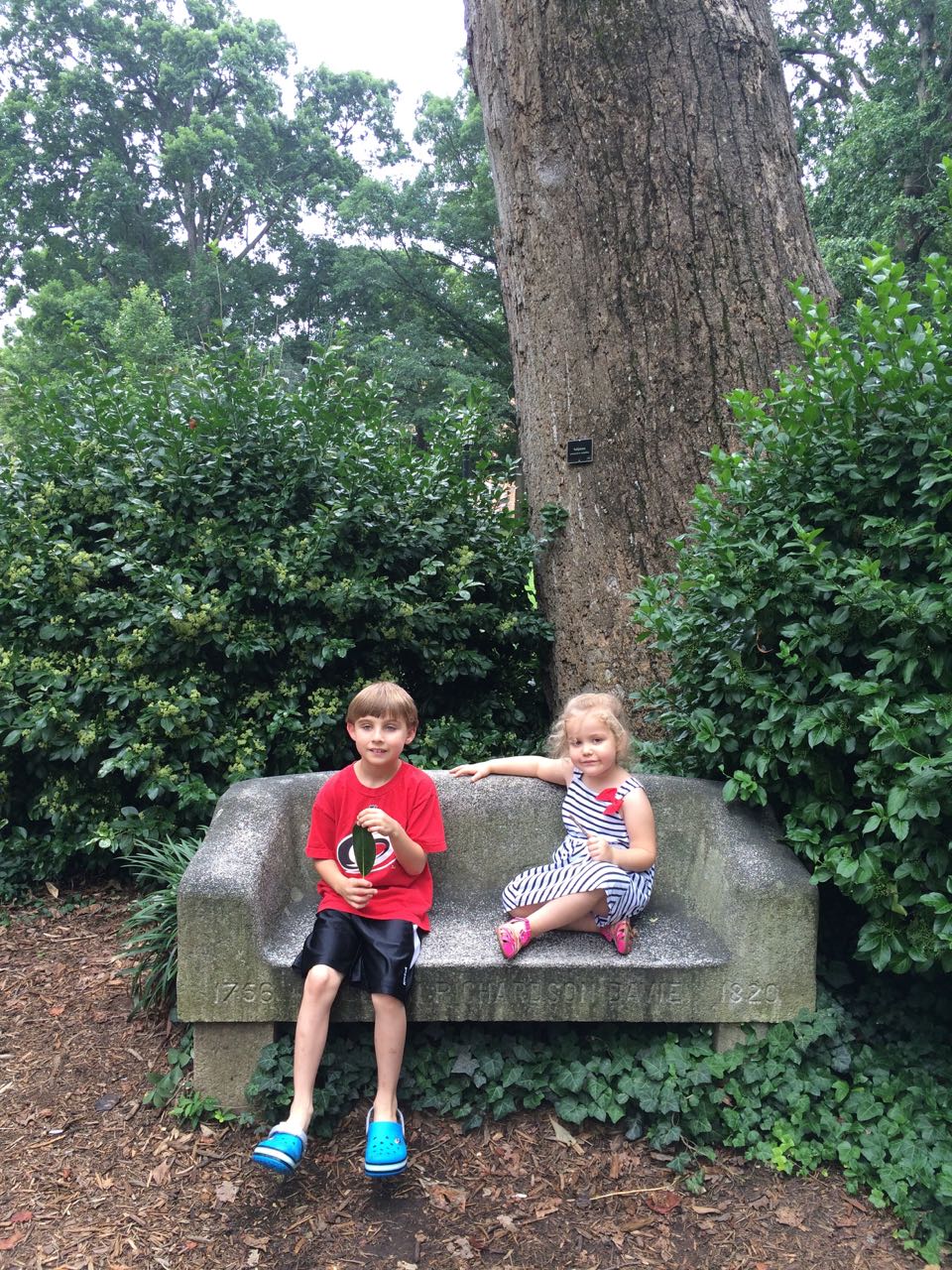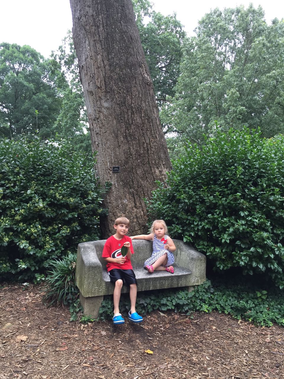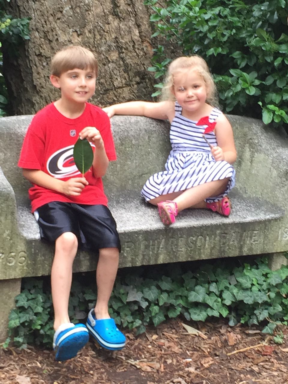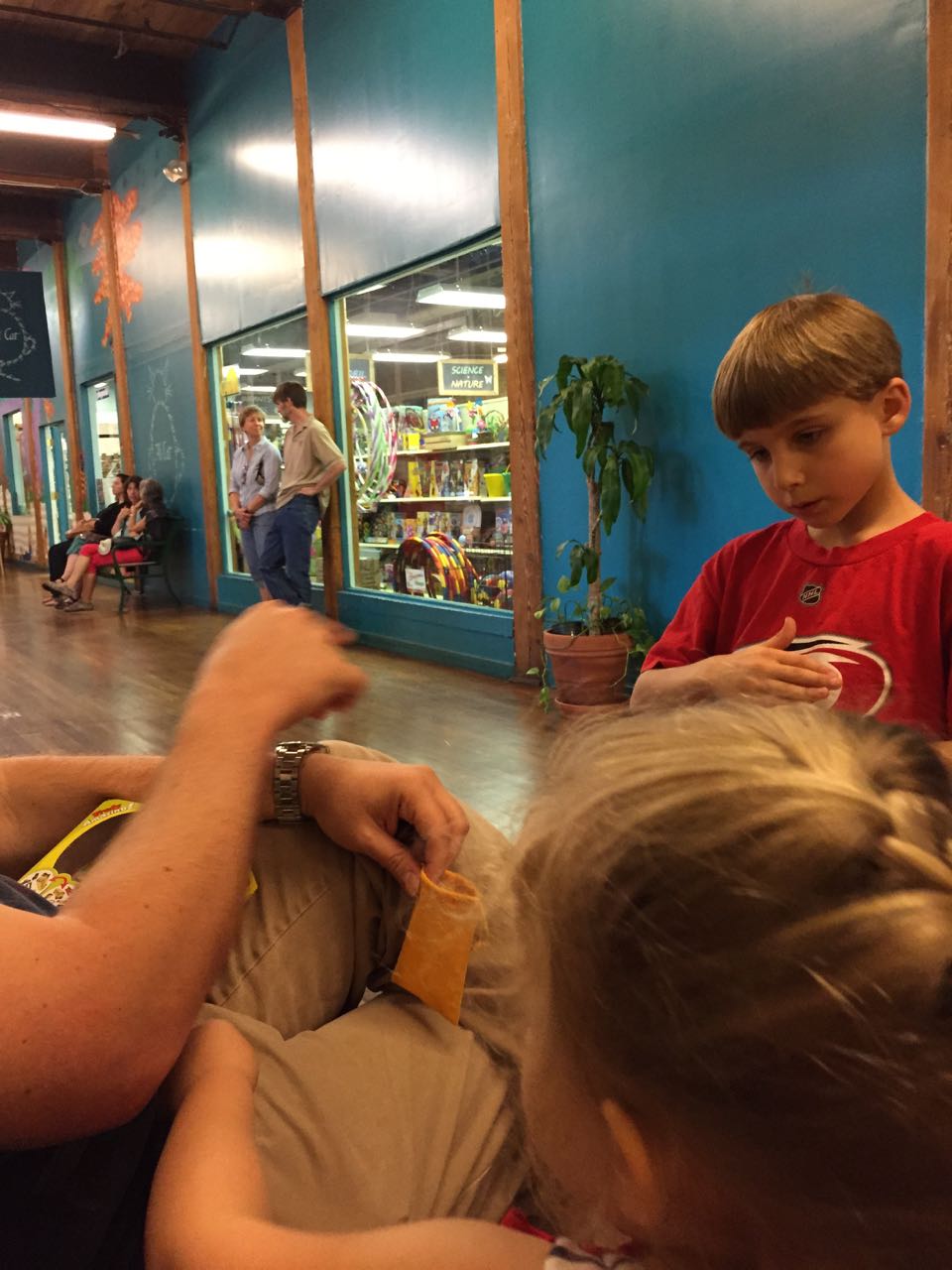 Today we were invited to go to Chapel Hill so that Kendall could participate in a study being done by the UNC Psychology department. This was a follow-up to last year’s visit, which Kendall enjoyed–and who wouldn’t enjoy getting piles of stickers for playing games with the researchers? 🙂 So we made the trek out this morning, and Kendall played her games while I filled out huge surveys, and she earned an entire baggie full of stickers, and even a special purple fairy rubber duckie. Awesome! After having to check off words that I’ve heard Kendall say from a huge list, I’m even more impressed with her vocabulary. Of course the researchers can’t tell us exactly what they’re looking for, or anything about her performance–but she had fun, and seemed to be able to do everything they asked of her. 🙂 Afterward, we had lunch at Elmo’s diner, and took the kids into the Ali Cat toy store, that Brandon and I used to always peer into as we waited for our brunch table (on those lazy child-free Sunday mornings, way back when!) Kendall chose a cool book about Wonder Woman, and Brian chose to get some rocks (they have real rock specimens here, not the artificially-colored polished stones which are so common at museums these days). We also got a travel edition of Spot It, which is a fun card game the kids like. Kendall also saw this Mermaid Excavation kit she wanted, but it was after I’d already checked out–I think I’ll order it for her online, it’s cheaper at Amazon, anyway. 😉 Following that, we walked around the campus some, showing the kids some landmarks like the Davie Poplar. We went to Morehead Planetarium for a science demonstration, a tour through the Gross Labs exhibit, and a planetarium show–and of course running-around-the-sundial time. We made a really fun science-filled day of it, and did our part to help out some real scientists, too!