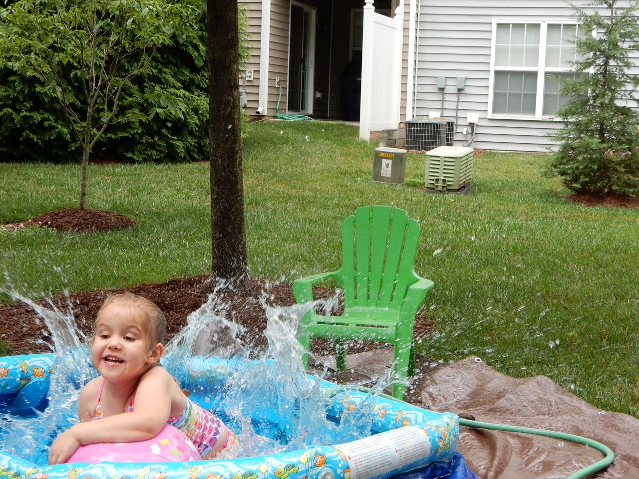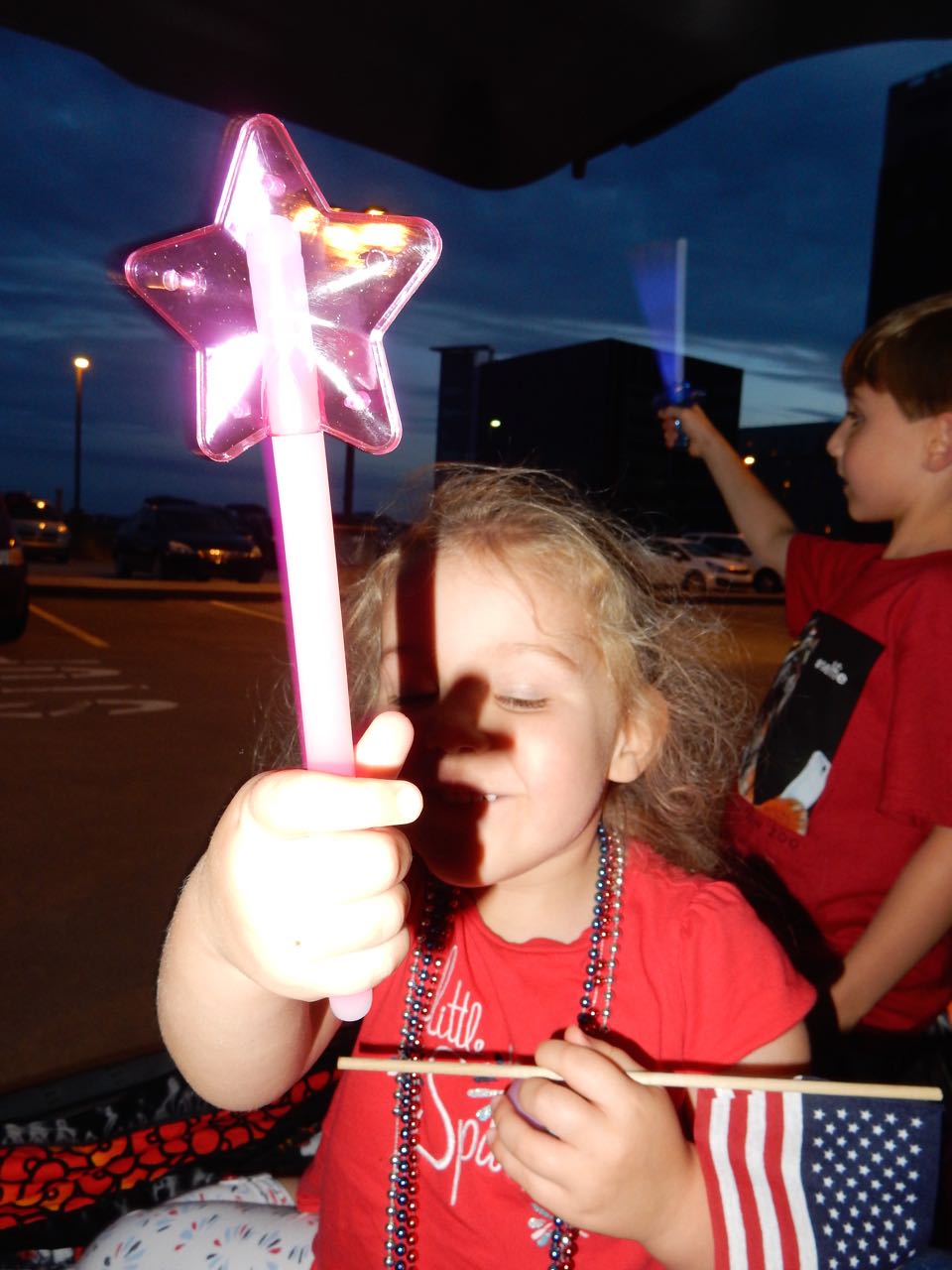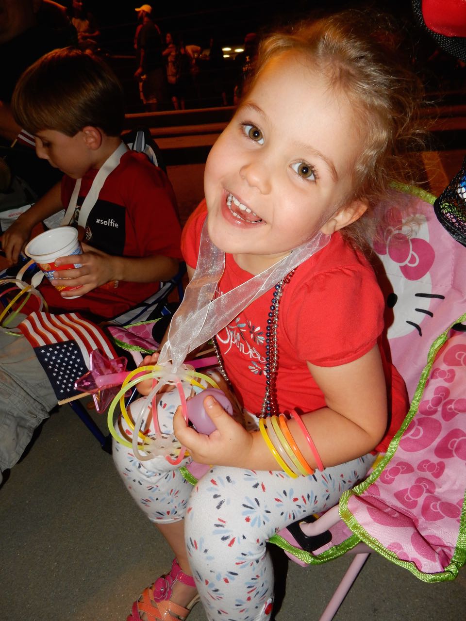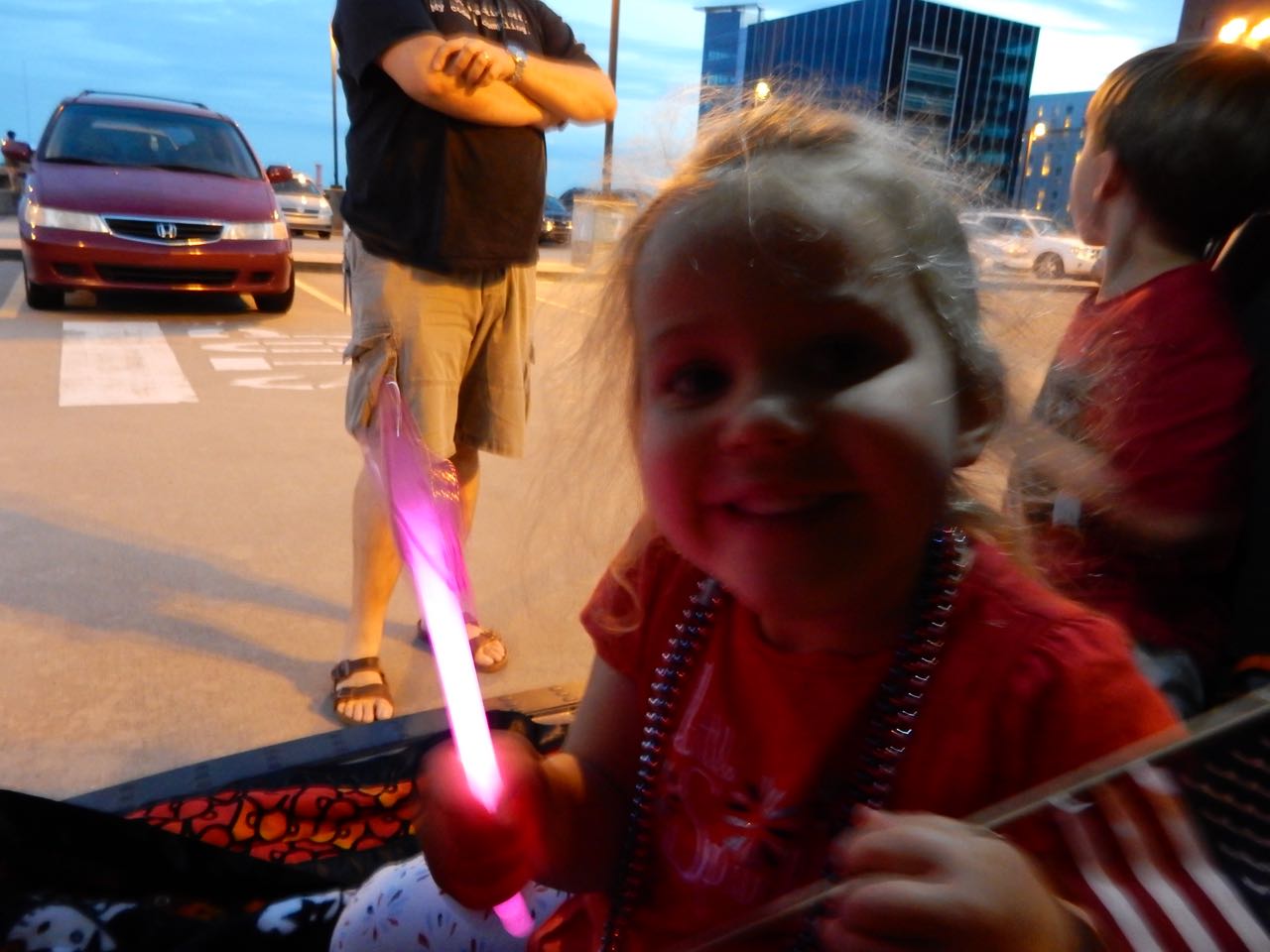 Happy 4th of July! The kids had a second round of fun with the kiddie pool in the backyard today. Again it wasn’t quite as sunny or warm as we probably would have liked, but the kids still had a good time. This evening we packed up some snacks and a pile of glow sticks and headed to the parking deck at Red Hat Tower to see the downtown fireworks. We were comfortable “tailgating” in the back of the van as we waited for sunset, and our folding lawn chairs were great seats for the show. The kids go crazy for glow sticks, and Brian loved his glow sword, and Kendall her pink glow wand. Kendall even brought her fairy princess duckie, her favorite prize from her trip to Chapel Hill helping out the scientists. 🙂