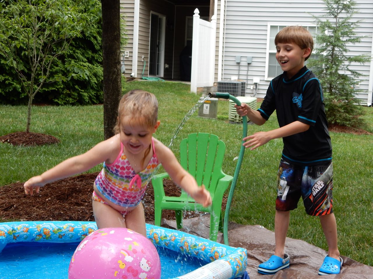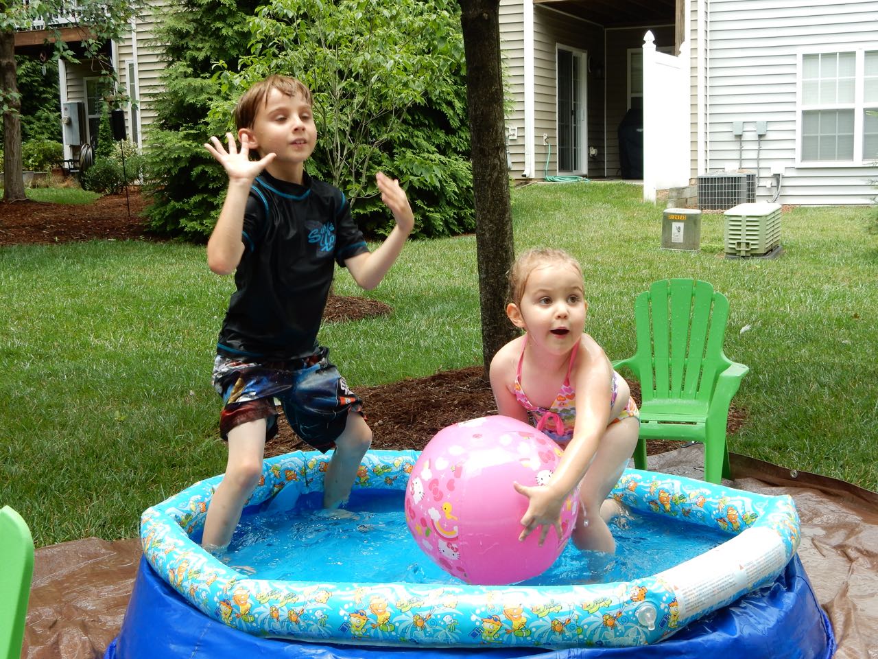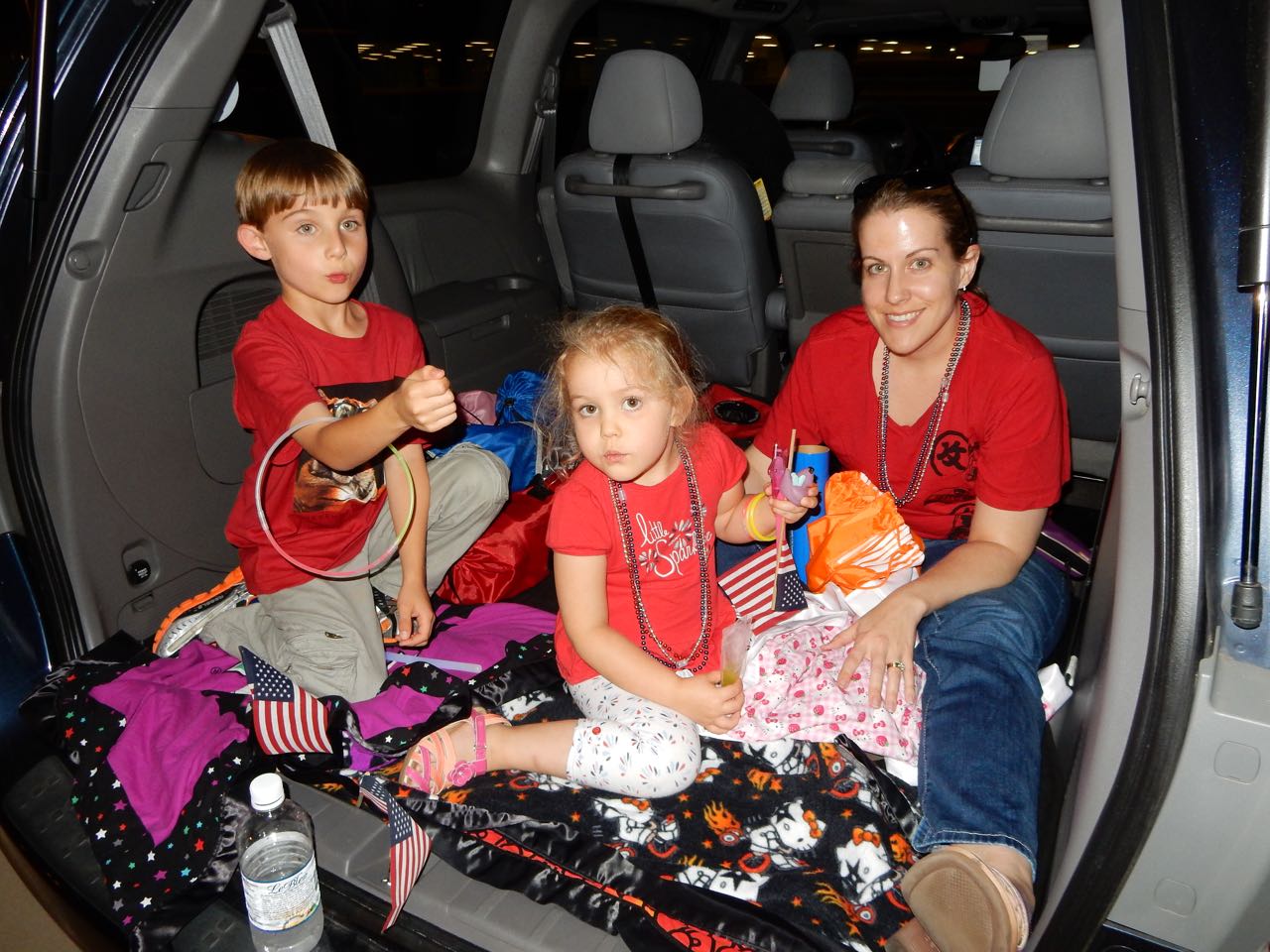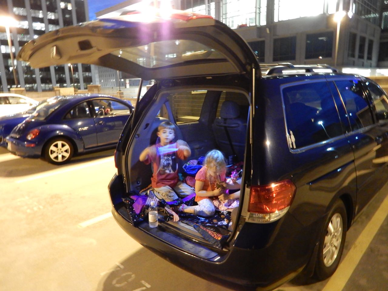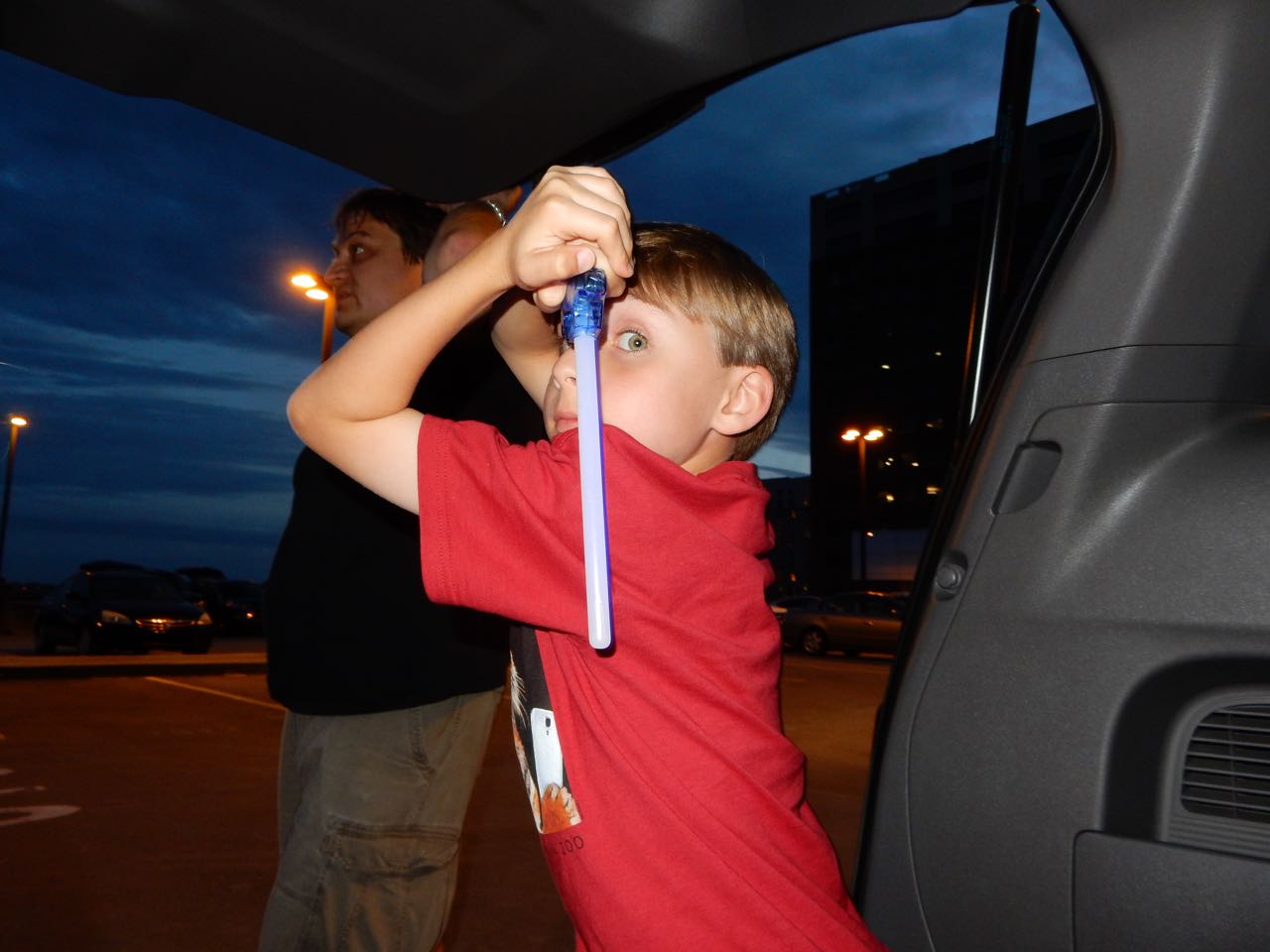Happy 4th of July! The kids had a second round of fun with the kiddie pool in the backyard today. Again it wasn’t quite as sunny or warm as we probably would have liked, but the kids still had a good time. This evening we packed up some snacks and a pile of glow sticks and headed to the parking deck at Red Hat Tower to see the downtown fireworks. We were comfortable “tailgating” in the back of the van as we waited for sunset, and our folding lawn chairs were great seats for the show. The kids go crazy for glow sticks, and Brian loved his glow sword, and Kendall her pink glow wand. Kendall even brought her fairy princess duckie, her favorite prize from her trip to Chapel Hill helping out the scientists. 🙂