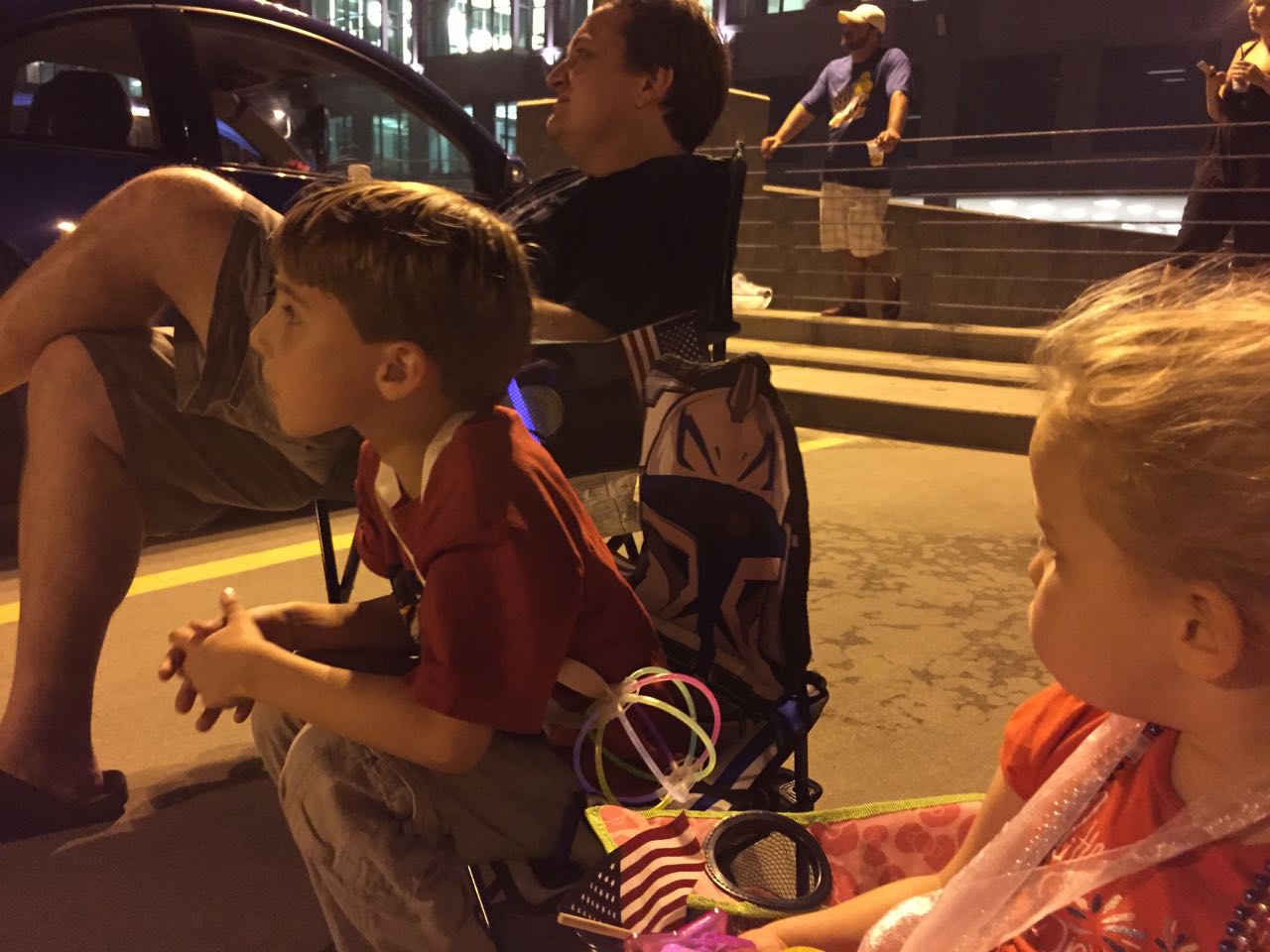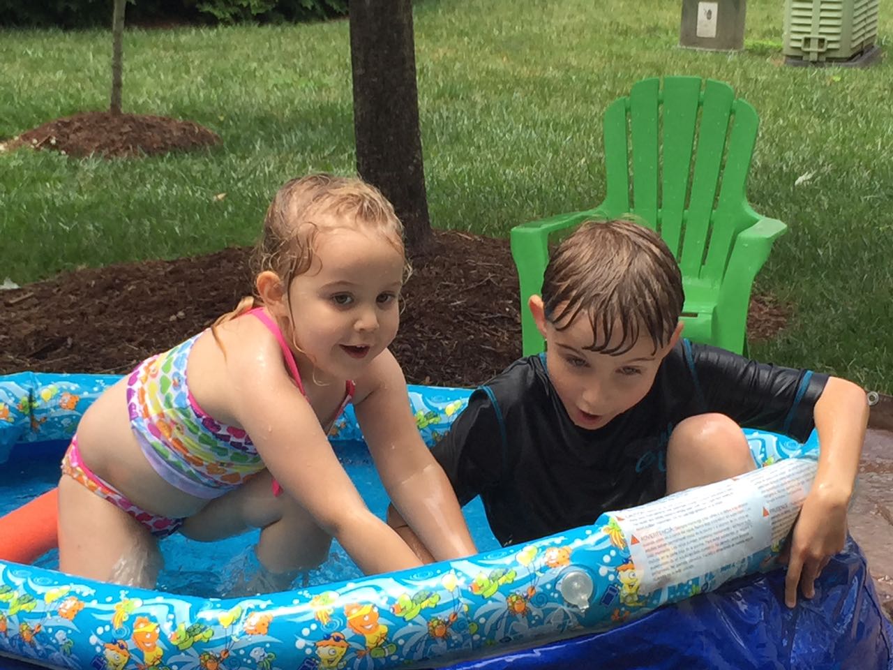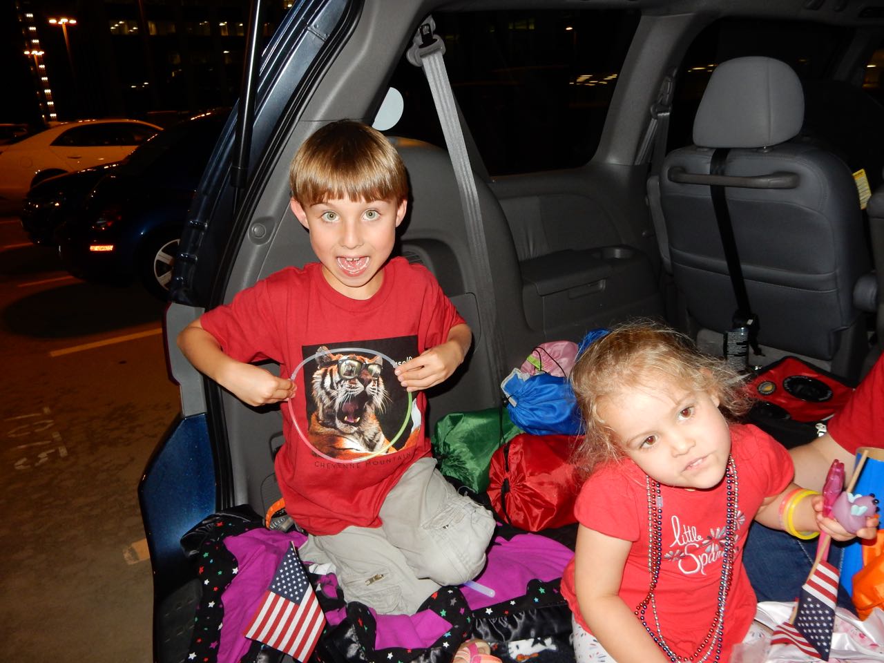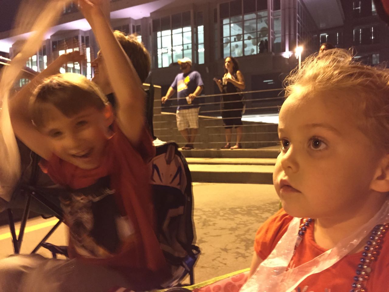 Happy 4th of July! The kids had a second round of fun with the kiddie pool in the backyard today. Again it wasn’t quite as sunny or warm as we probably would have liked, but the kids still had a good time. This evening we packed up some snacks and a pile of glow sticks and headed to the parking deck at Red Hat Tower to see the downtown fireworks. We were comfortable “tailgating” in the back of the van as we waited for sunset, and our folding lawn chairs were great seats for the show. The kids go crazy for glow sticks, and Brian loved his glow sword, and Kendall her pink glow wand. Kendall even brought her fairy princess duckie, her favorite prize from her trip to Chapel Hill helping out the scientists. 🙂