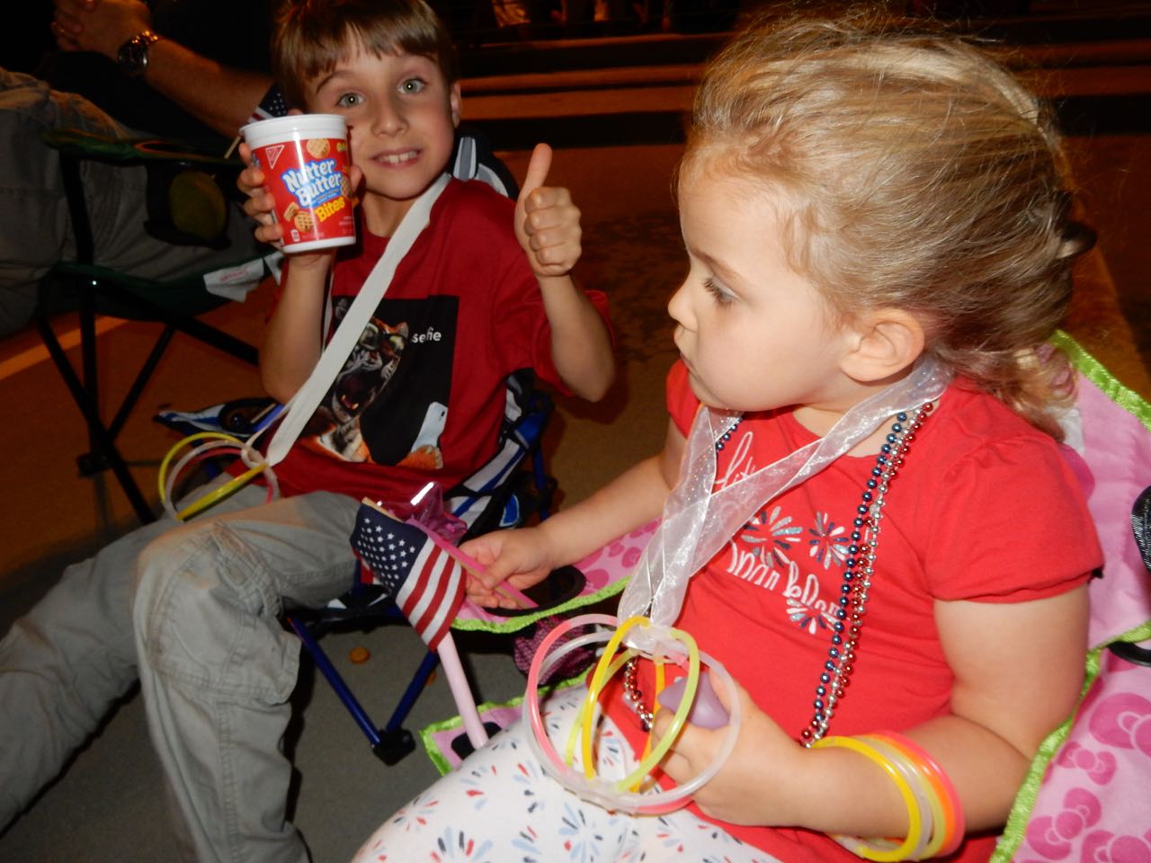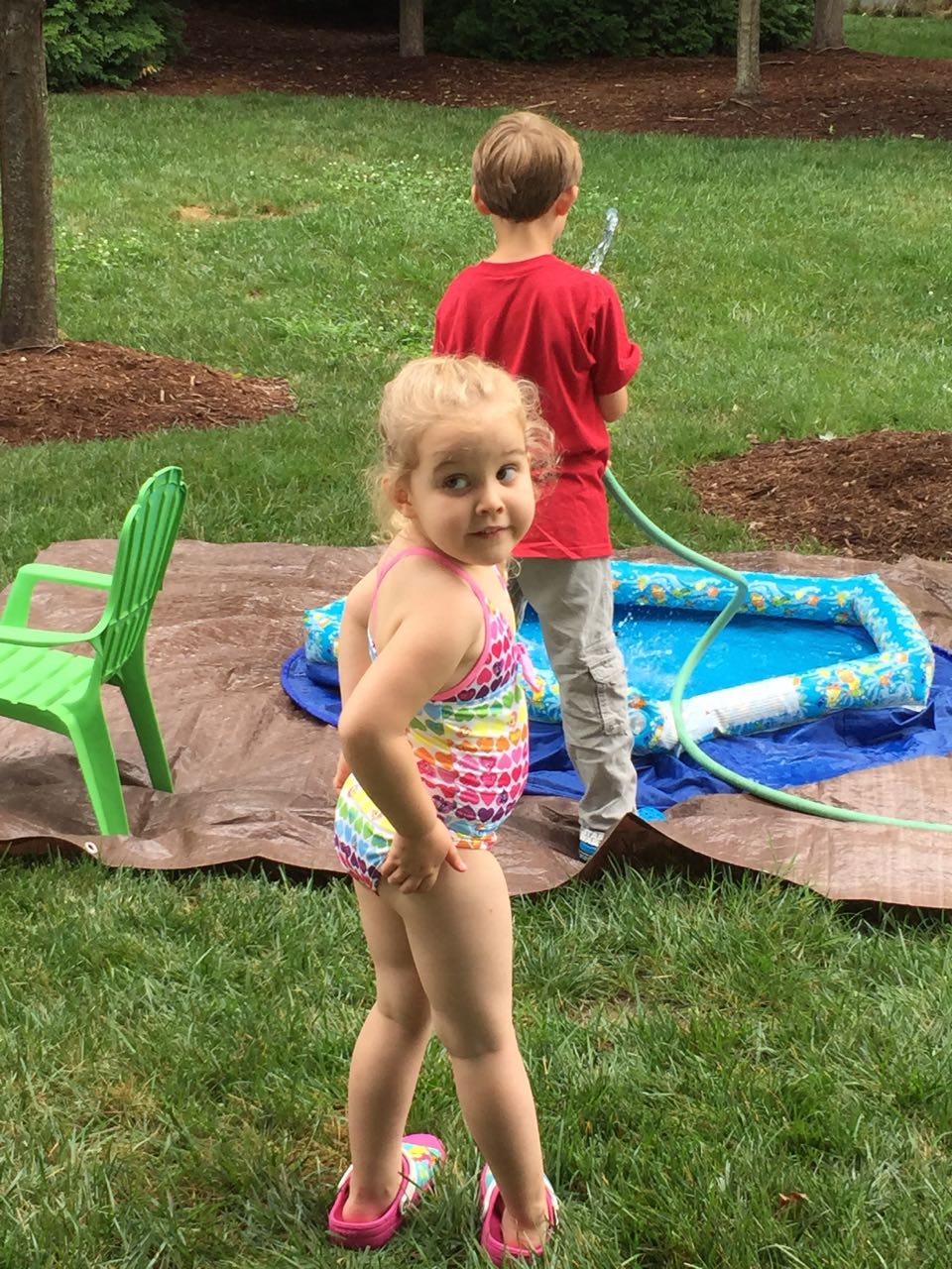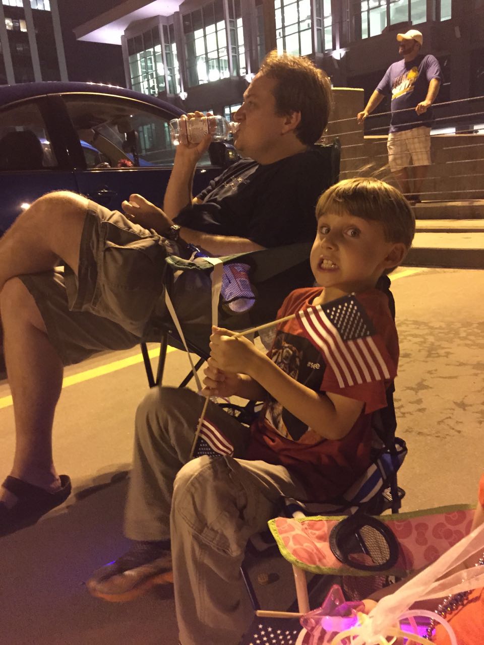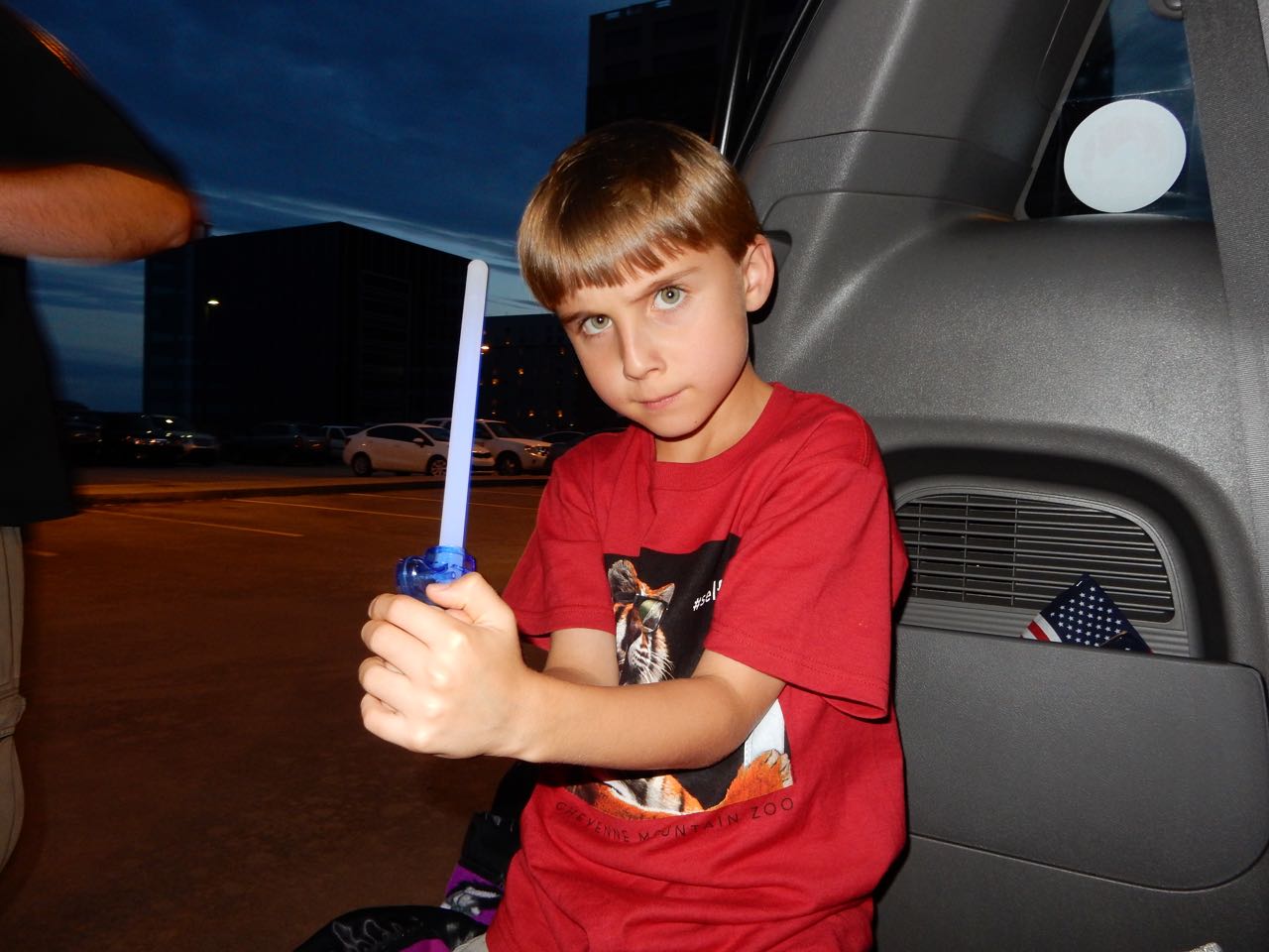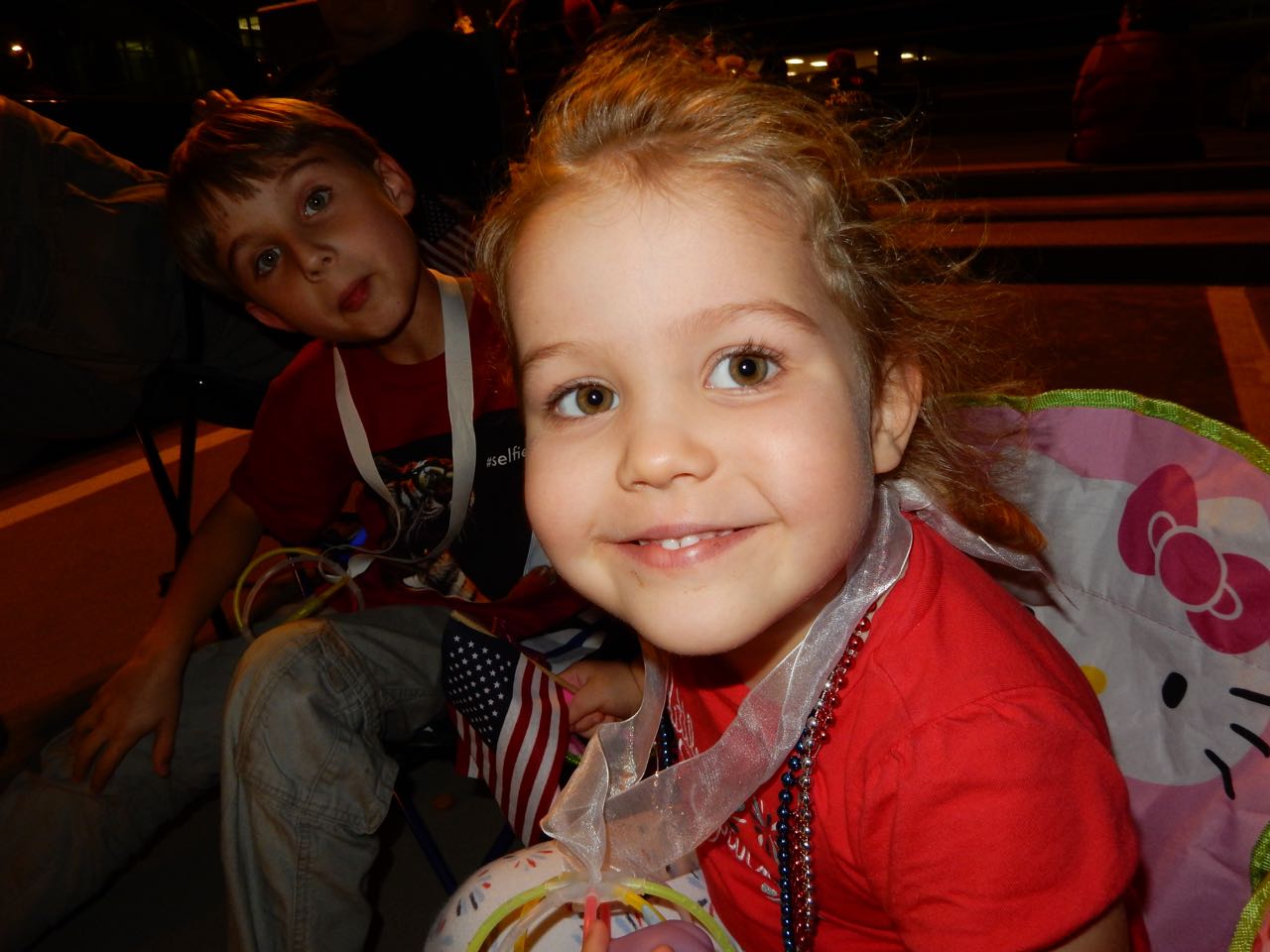 Happy 4th of July! The kids had a second round of fun with the kiddie pool in the backyard today. Again it wasn’t quite as sunny or warm as we probably would have liked, but the kids still had a good time. This evening we packed up some snacks and a pile of glow sticks and headed to the parking deck at Red Hat Tower to see the downtown fireworks. We were comfortable “tailgating” in the back of the van as we waited for sunset, and our folding lawn chairs were great seats for the show. The kids go crazy for glow sticks, and Brian loved his glow sword, and Kendall her pink glow wand. Kendall even brought her fairy princess duckie, her favorite prize from her trip to Chapel Hill helping out the scientists. 🙂