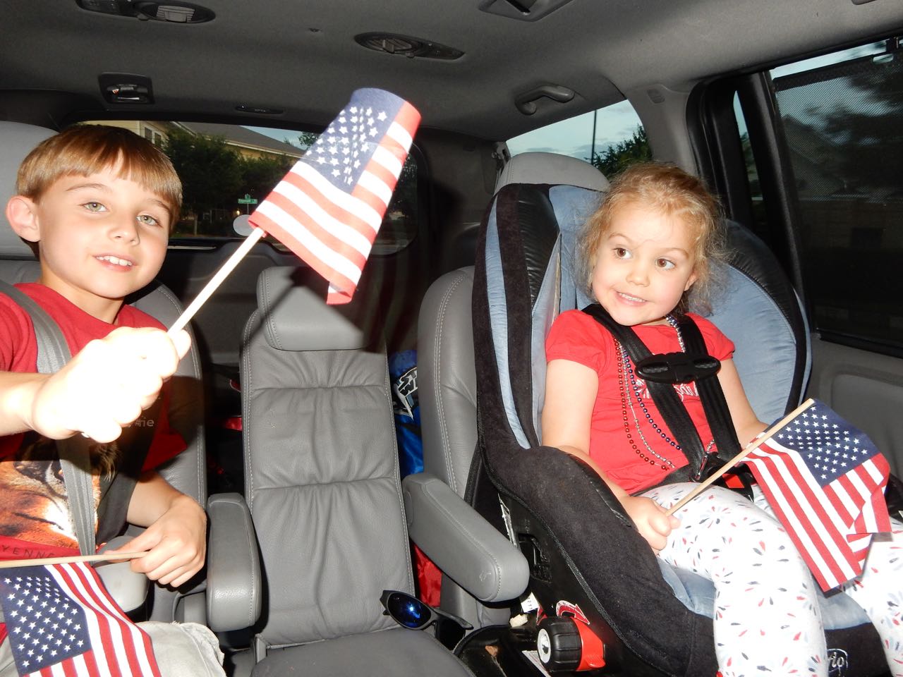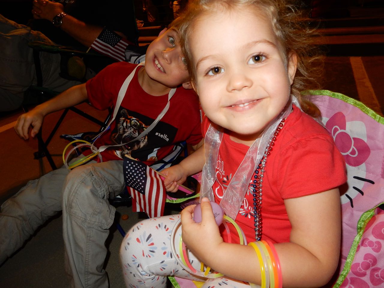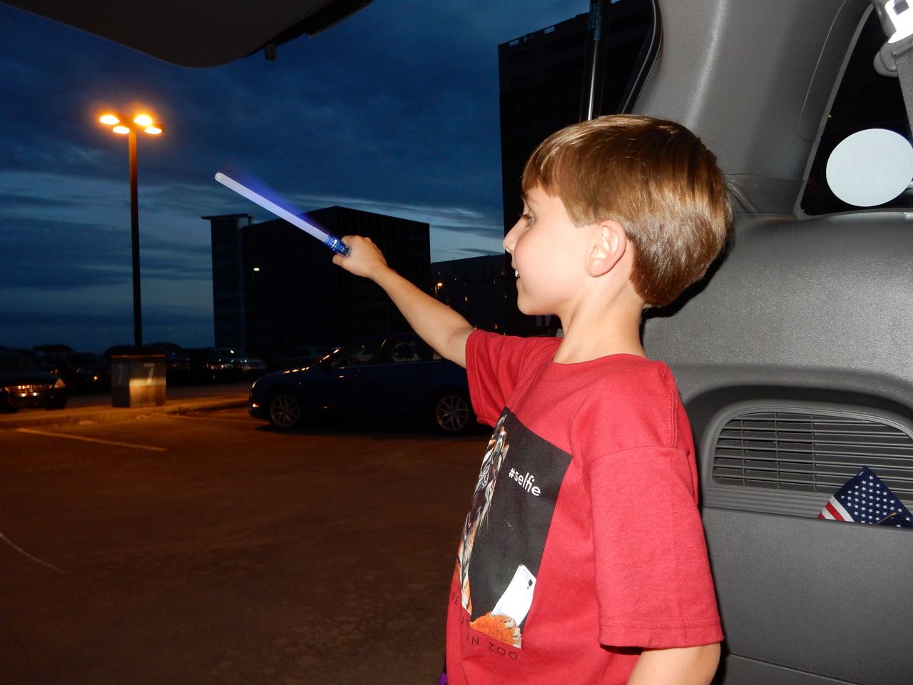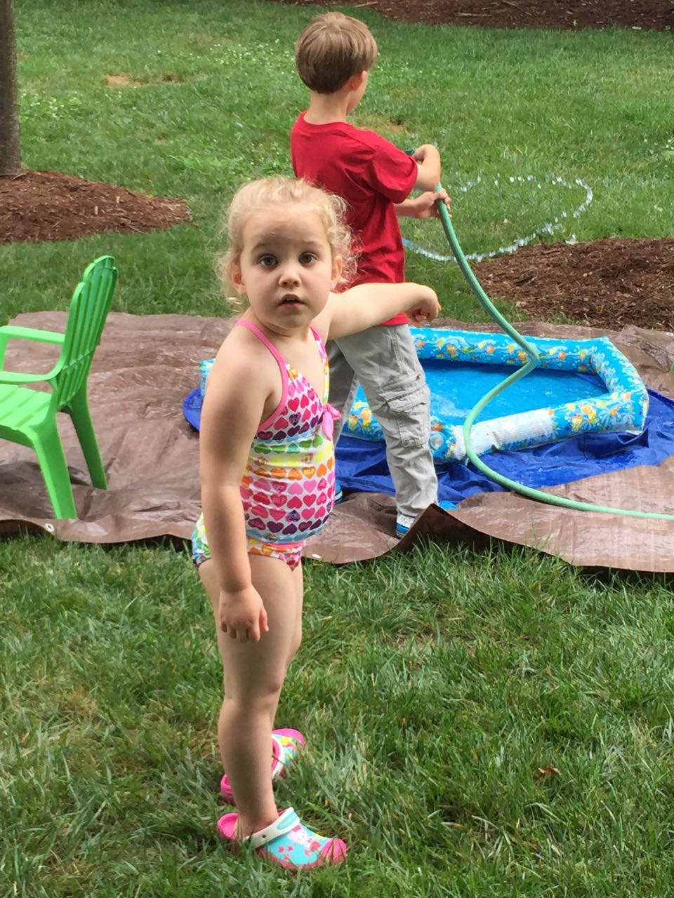 Happy 4th of July! The kids had a second round of fun with the kiddie pool in the backyard today. Again it wasn’t quite as sunny or warm as we probably would have liked, but the kids still had a good time. This evening we packed up some snacks and a pile of glow sticks and headed to the parking deck at Red Hat Tower to see the downtown fireworks. We were comfortable “tailgating” in the back of the van as we waited for sunset, and our folding lawn chairs were great seats for the show. The kids go crazy for glow sticks, and Brian loved his glow sword, and Kendall her pink glow wand. Kendall even brought her fairy princess duckie, her favorite prize from her trip to Chapel Hill helping out the scientists. 🙂