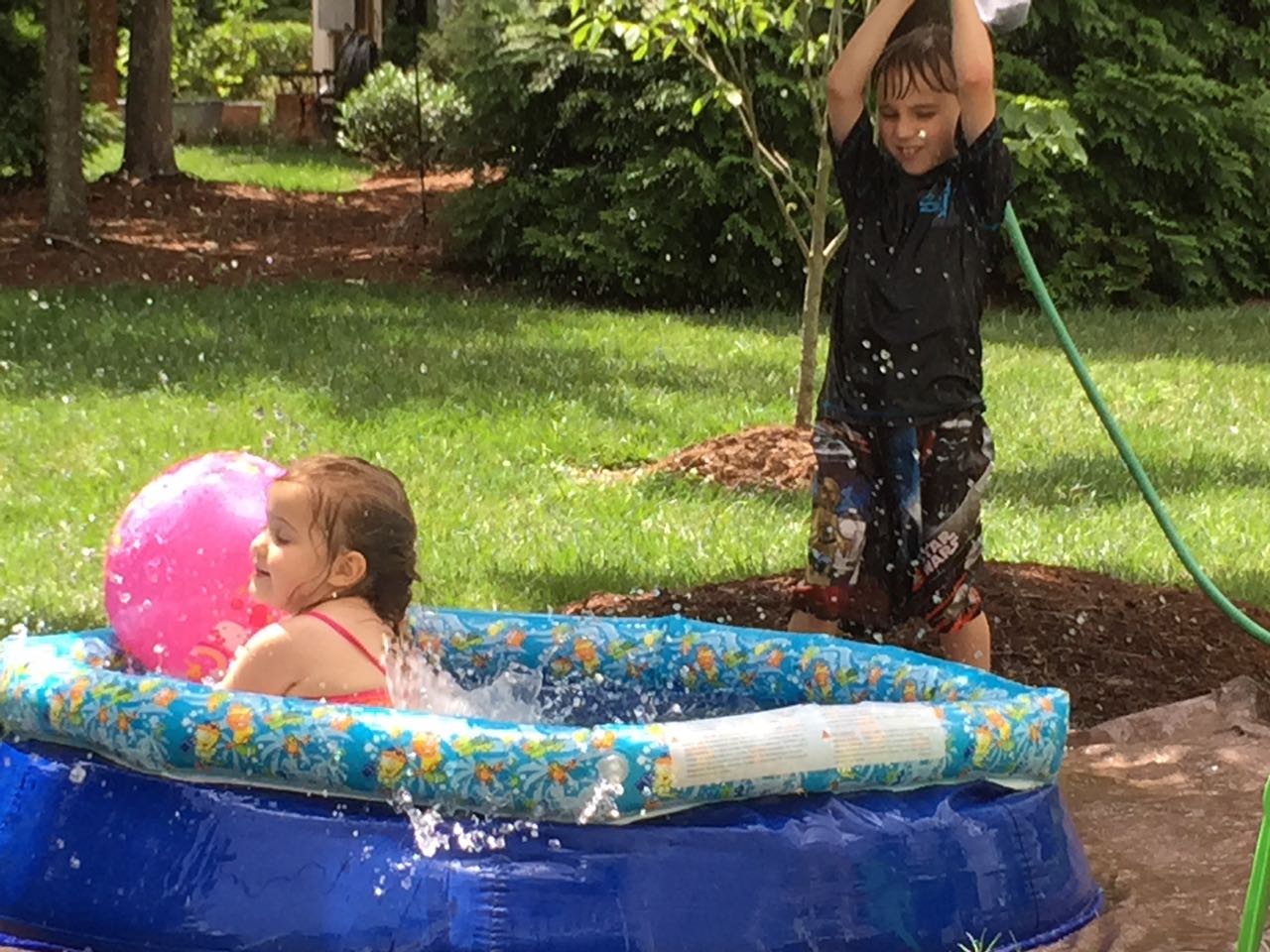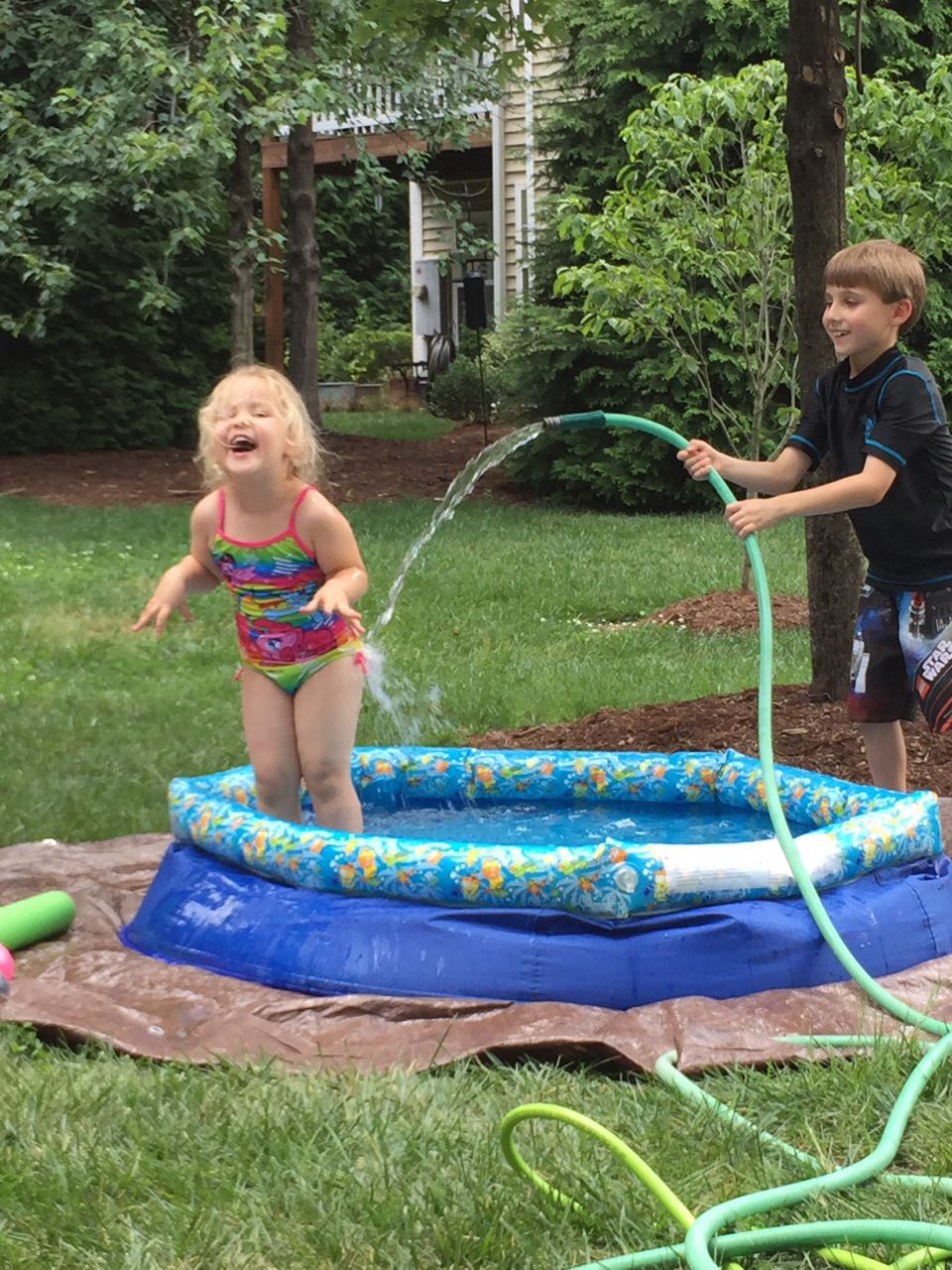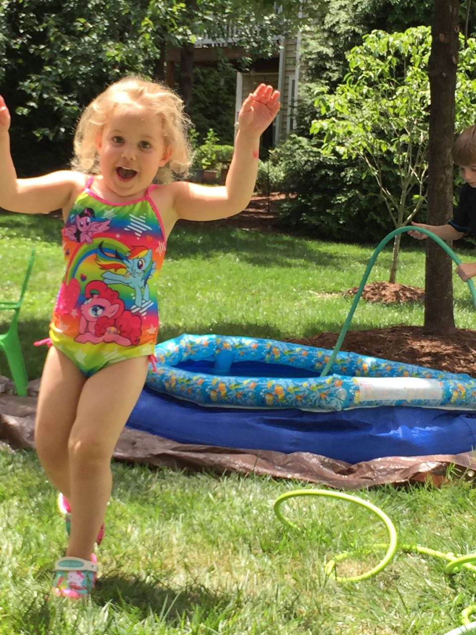 Kendall was up early this morning, and decide to bring all her ponies into our bathroom (?) for a pony party. Okay Kendall, we get it, we’re awake…! Sheesh. We haven’t had a weekend this summer that has been good for backyard splash fun yet, so we decided that today had to be the day, even though the ground was a bit soggy and clouds were in the forecast. The kids made the most of the breaks in the clouds, and had a wild time running around and splashing each other. Brian played a lacrosse-like net-catching came with his Death Star pool ball. He really liked sneaking up on Kendall with the water hose! She squealed, but I don’t think she minded too much–she asked him to get her again! 😀
