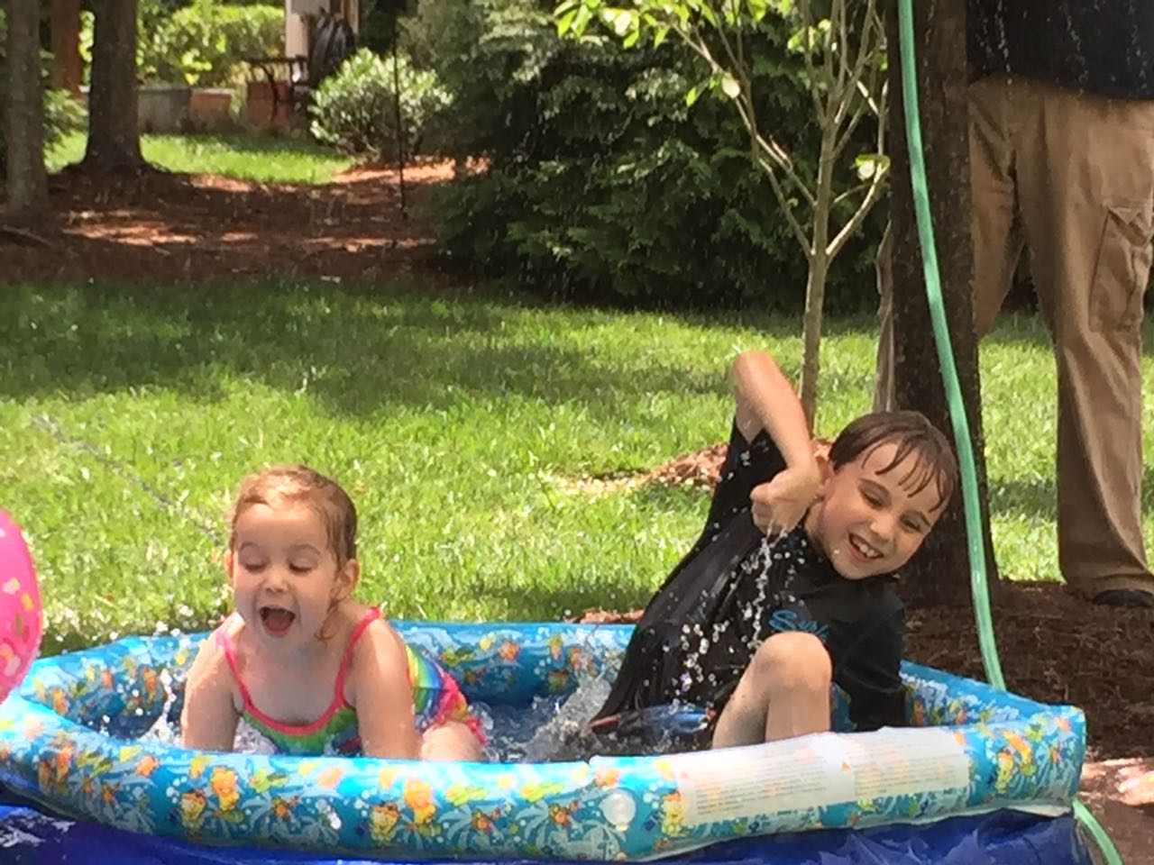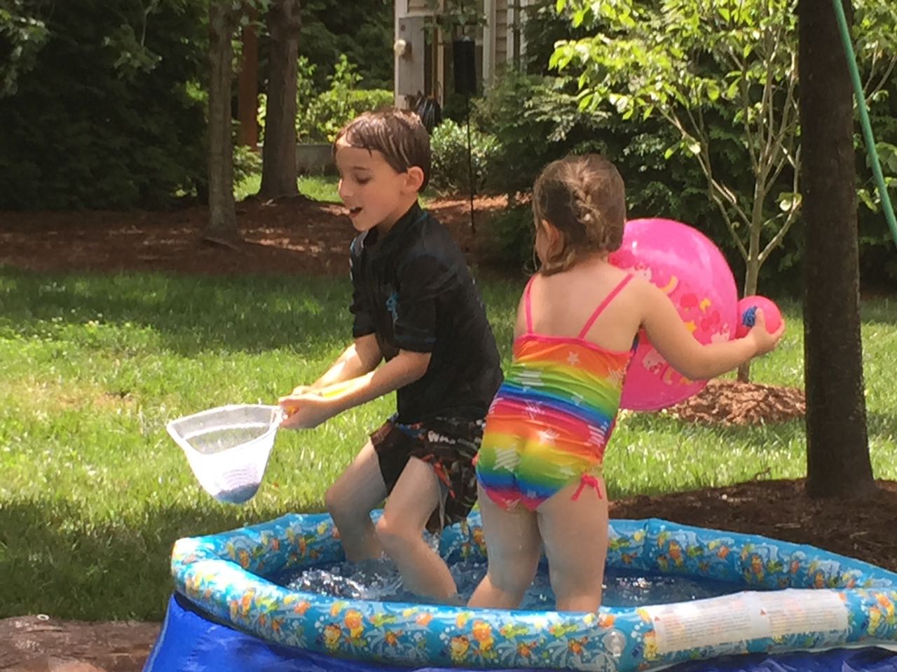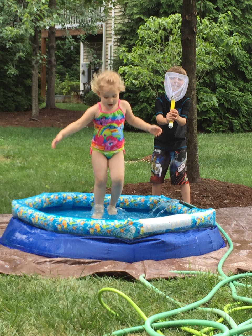 Kendall was up early this morning, and decide to bring all her ponies into our bathroom (?) for a pony party. Okay Kendall, we get it, we’re awake…! Sheesh. We haven’t had a weekend this summer that has been good for backyard splash fun yet, so we decided that today had to be the day, even though the ground was a bit soggy and clouds were in the forecast. The kids made the most of the breaks in the clouds, and had a wild time running around and splashing each other. Brian played a lacrosse-like net-catching came with his Death Star pool ball. He really liked sneaking up on Kendall with the water hose! She squealed, but I don’t think she minded too much–she asked him to get her again! 😀