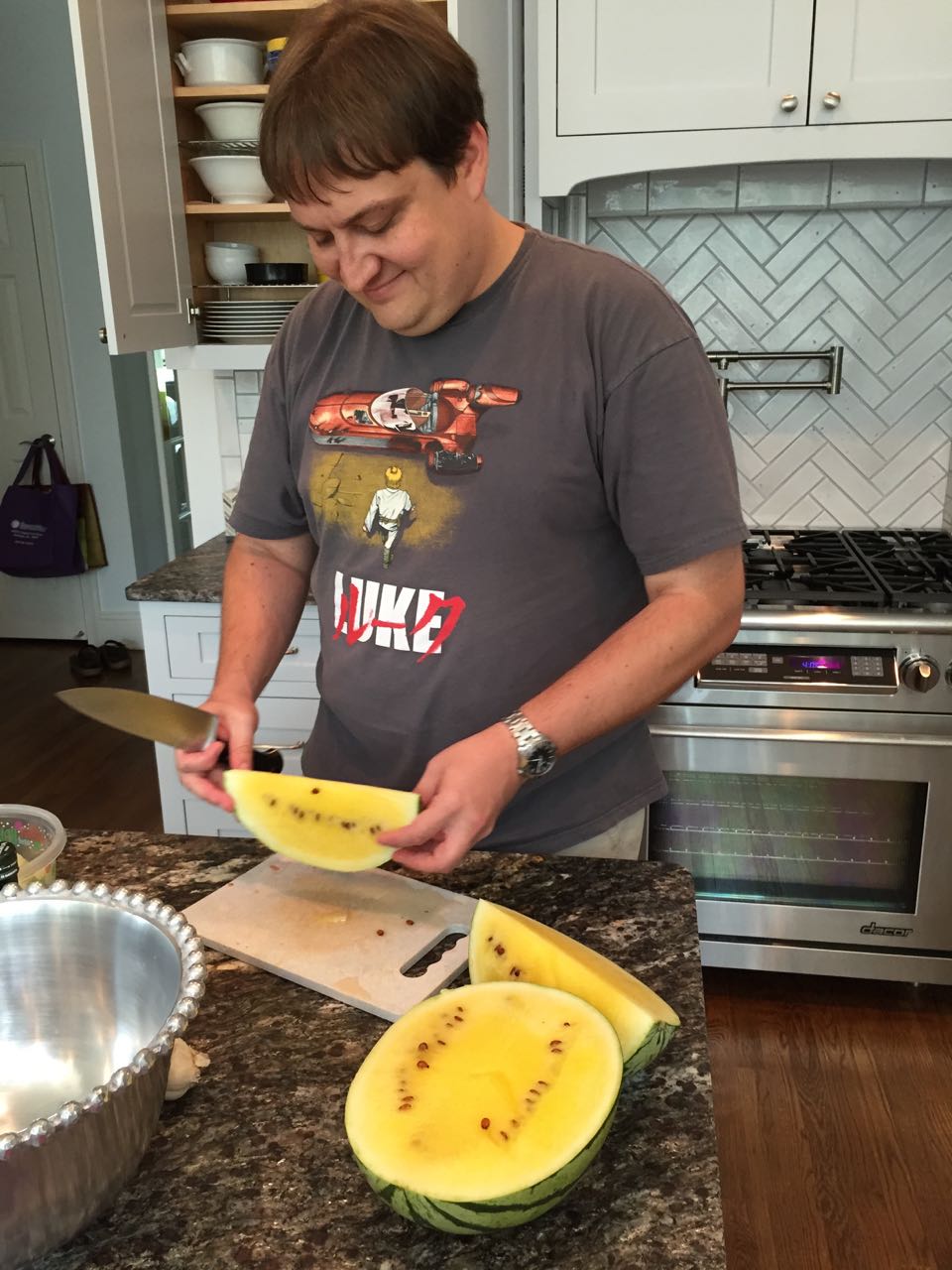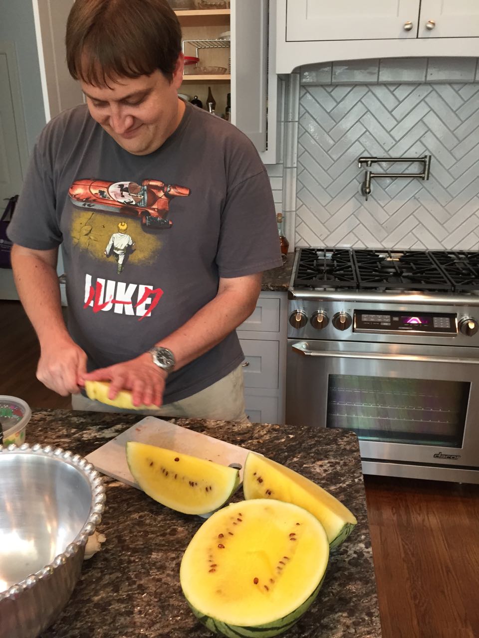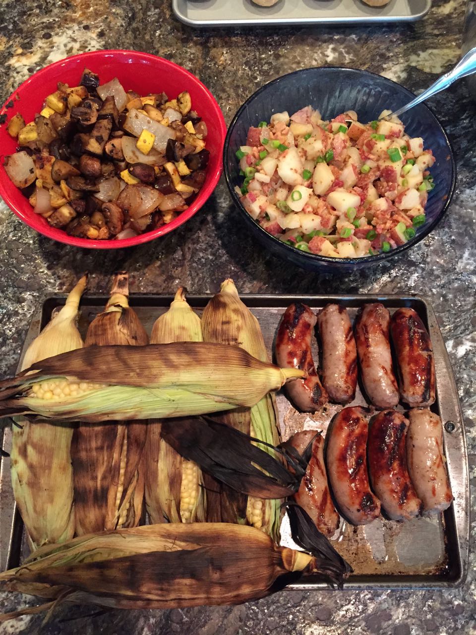 Brian didn’t believe me when I told him that there were yellow watermelons, so when one turned up in our Produce Box, we decided to have a taste test during our Sunday Dinner today! The kids liked both kinds, but the classic red was the winner. 🙂 Brandon made us an epic grilled feast, with grilled corn, mixed vegetables, bratwurst, and my warm German potato salad. Yum! 😀