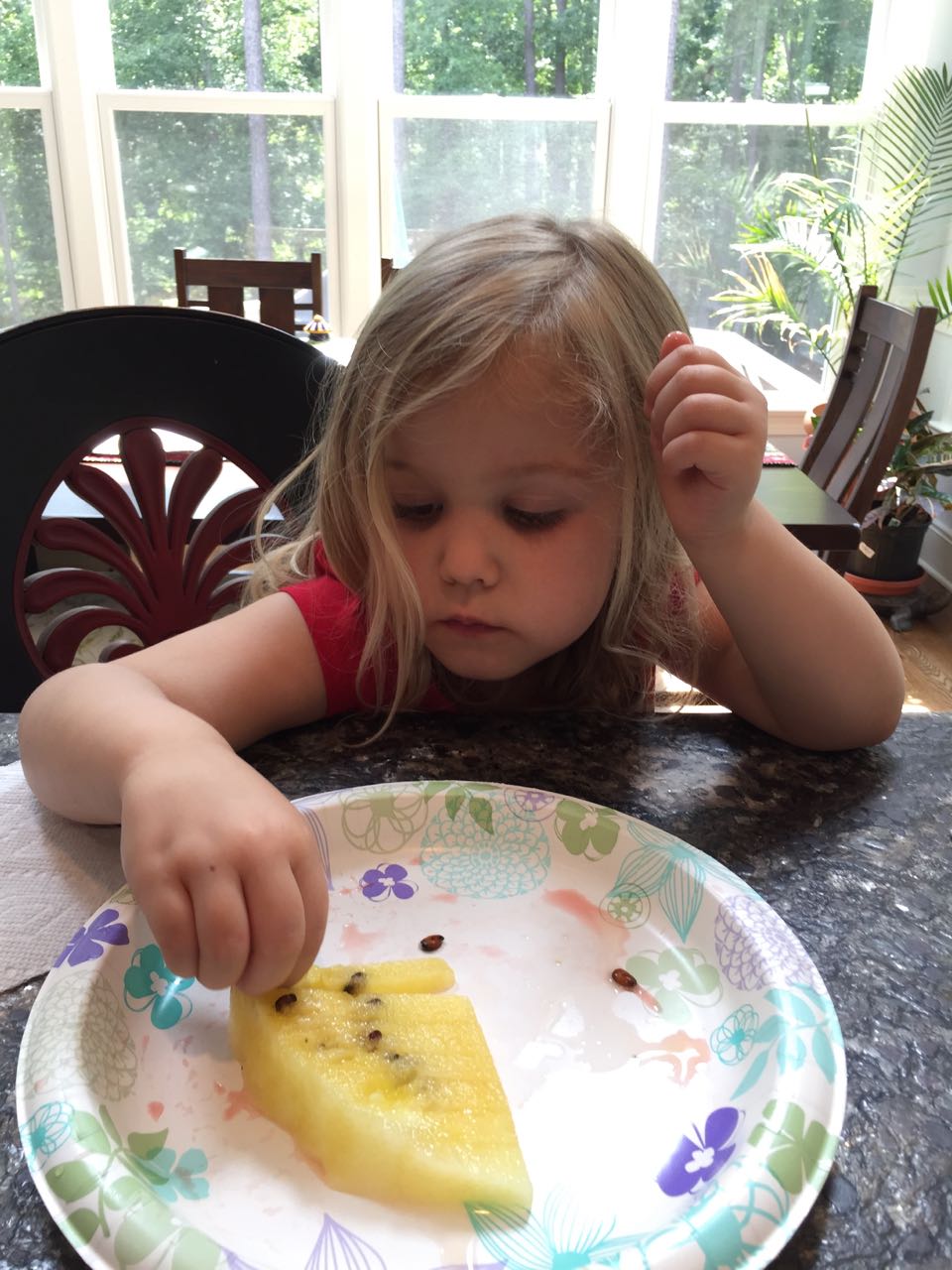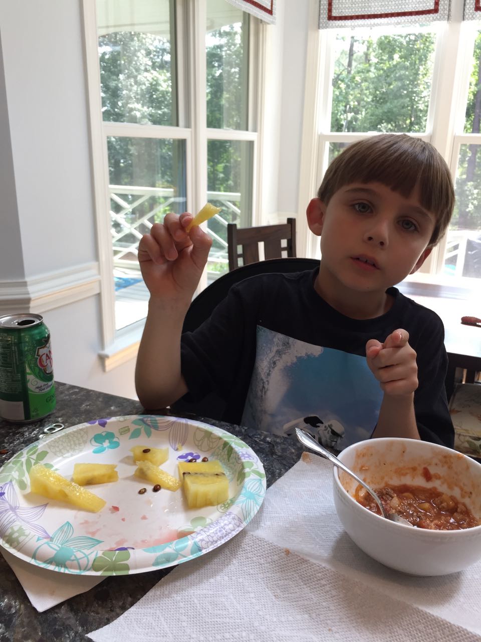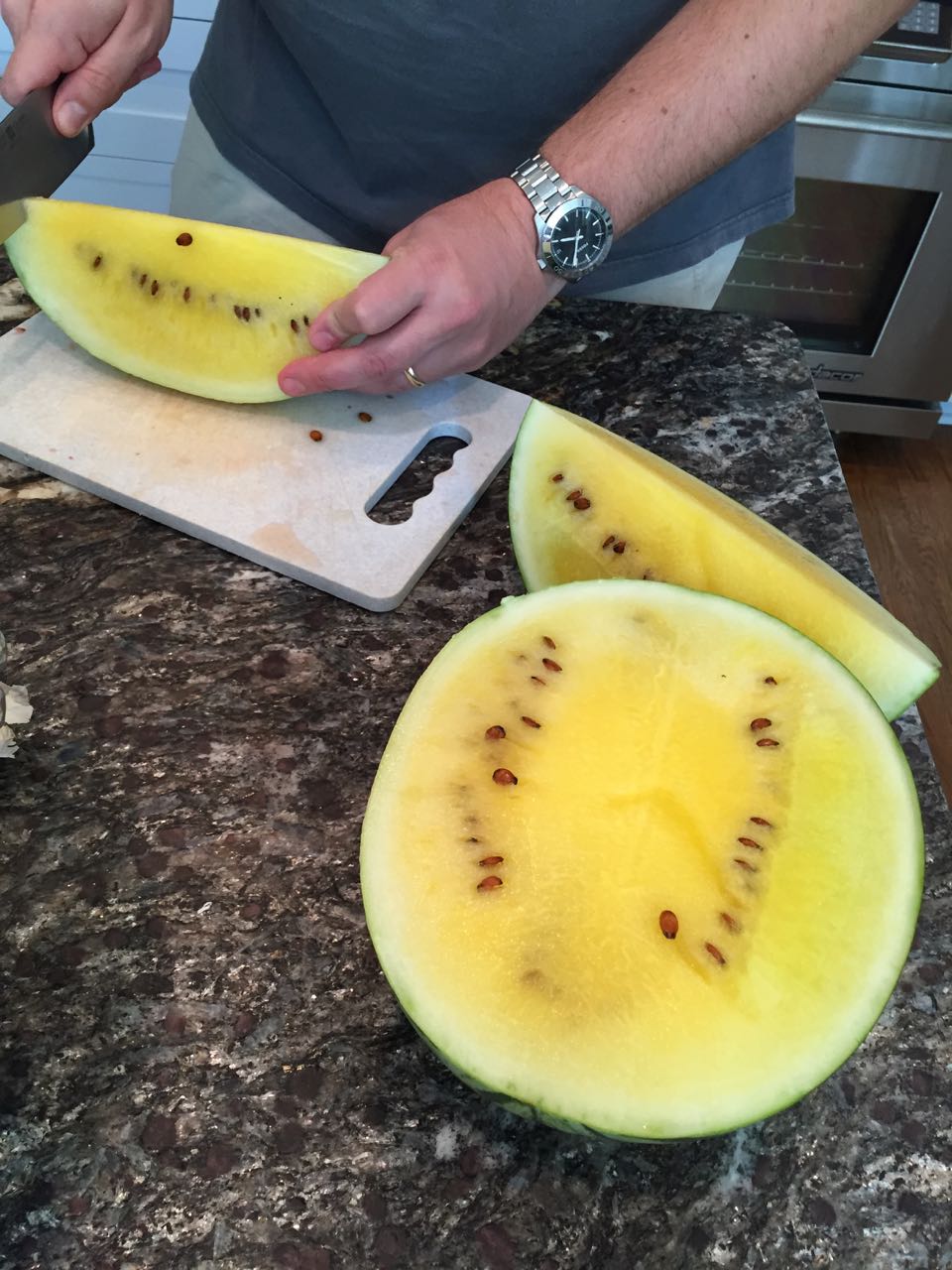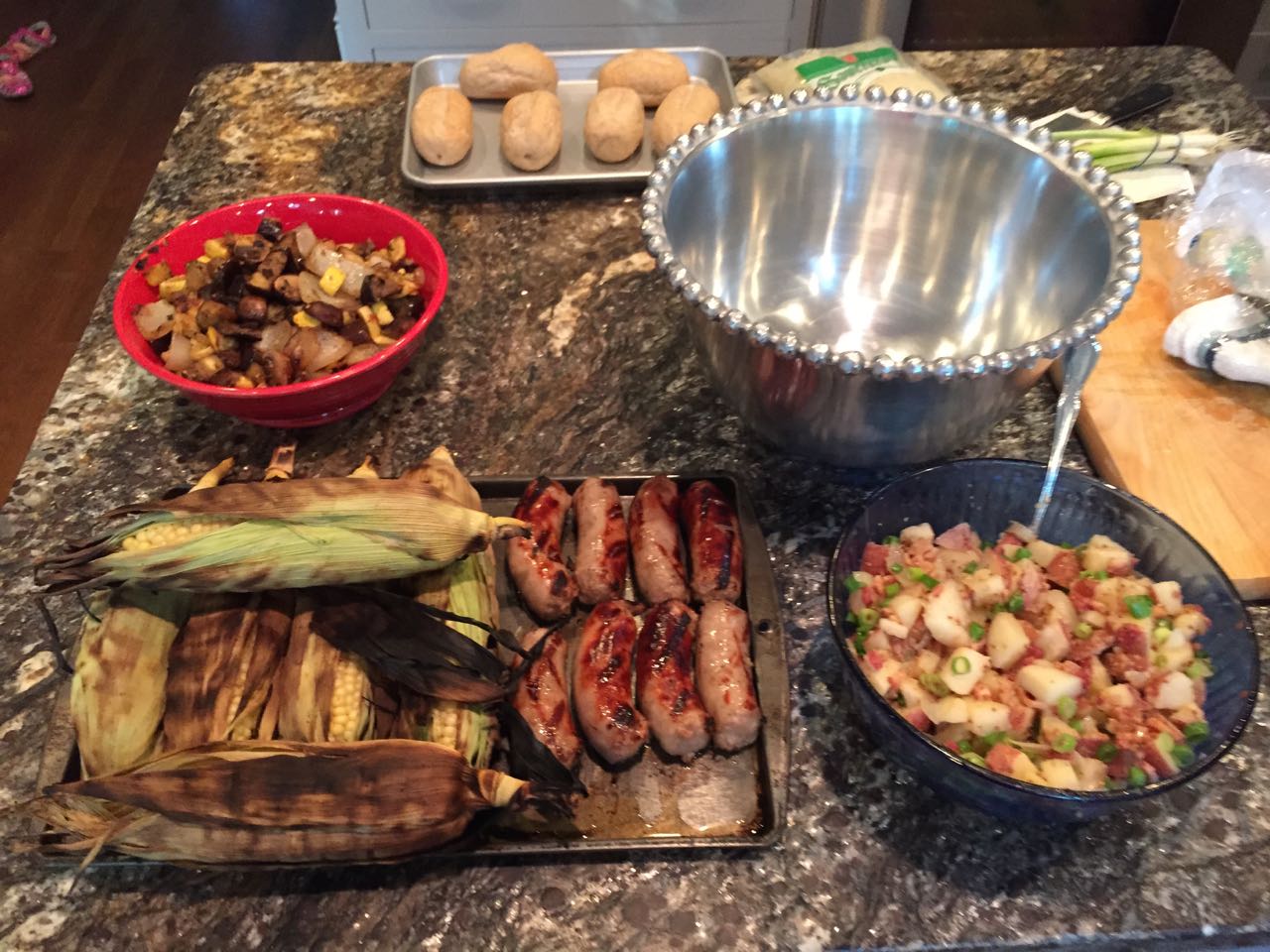 Brian didn’t believe me when I told him that there were yellow watermelons, so when one turned up in our Produce Box, we decided to have a taste test during our Sunday Dinner today! The kids liked both kinds, but the classic red was the winner. 🙂 Brandon made us an epic grilled feast, with grilled corn, mixed vegetables, bratwurst, and my warm German potato salad. Yum! 😀