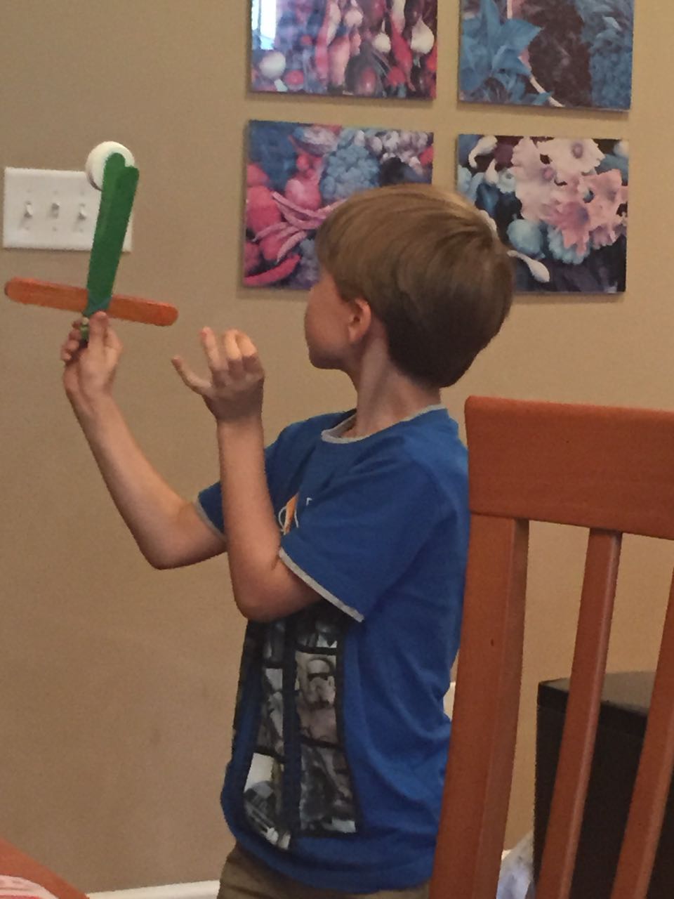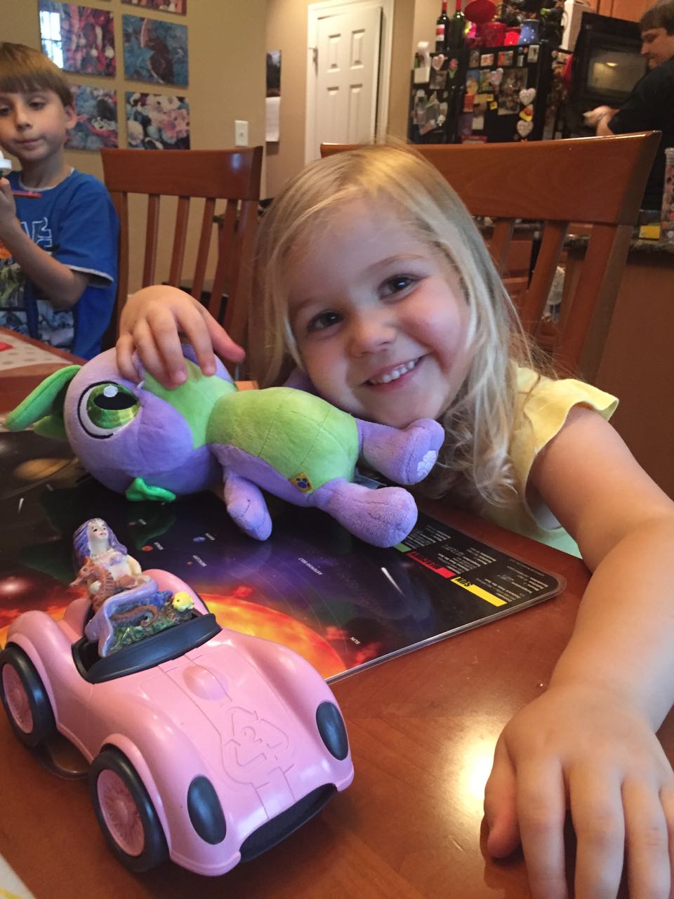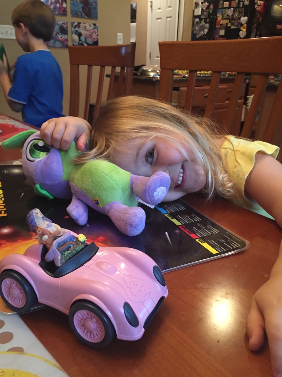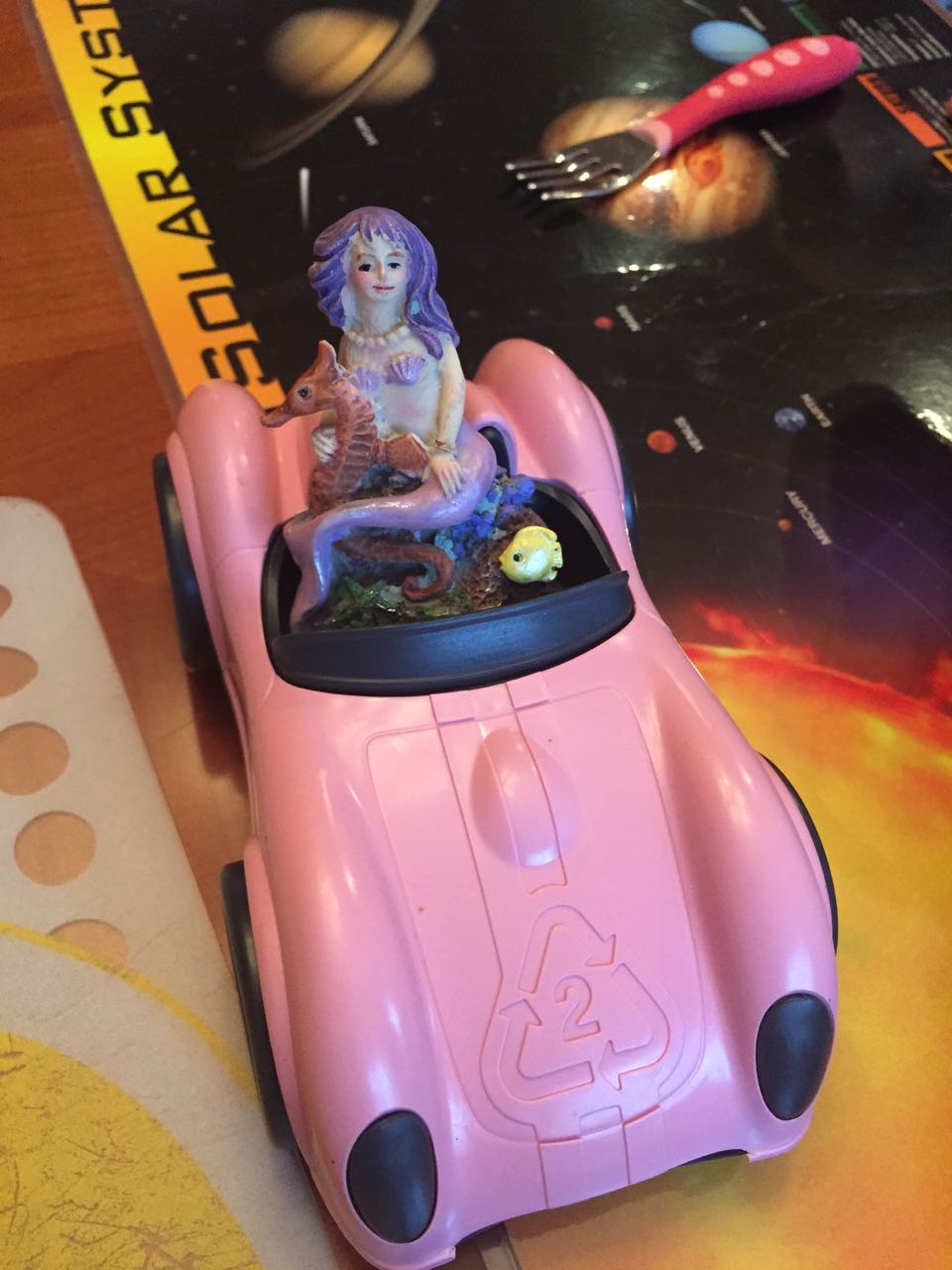 Kendall was looking so cute in her Hello Kitty outfit yesterday! 🙂 Today Brian came home from camp with a little catapult he’d made. He was quite proud of it! Kendall had her mermaid driving her pink car at breakfast time. So funny. 🙂