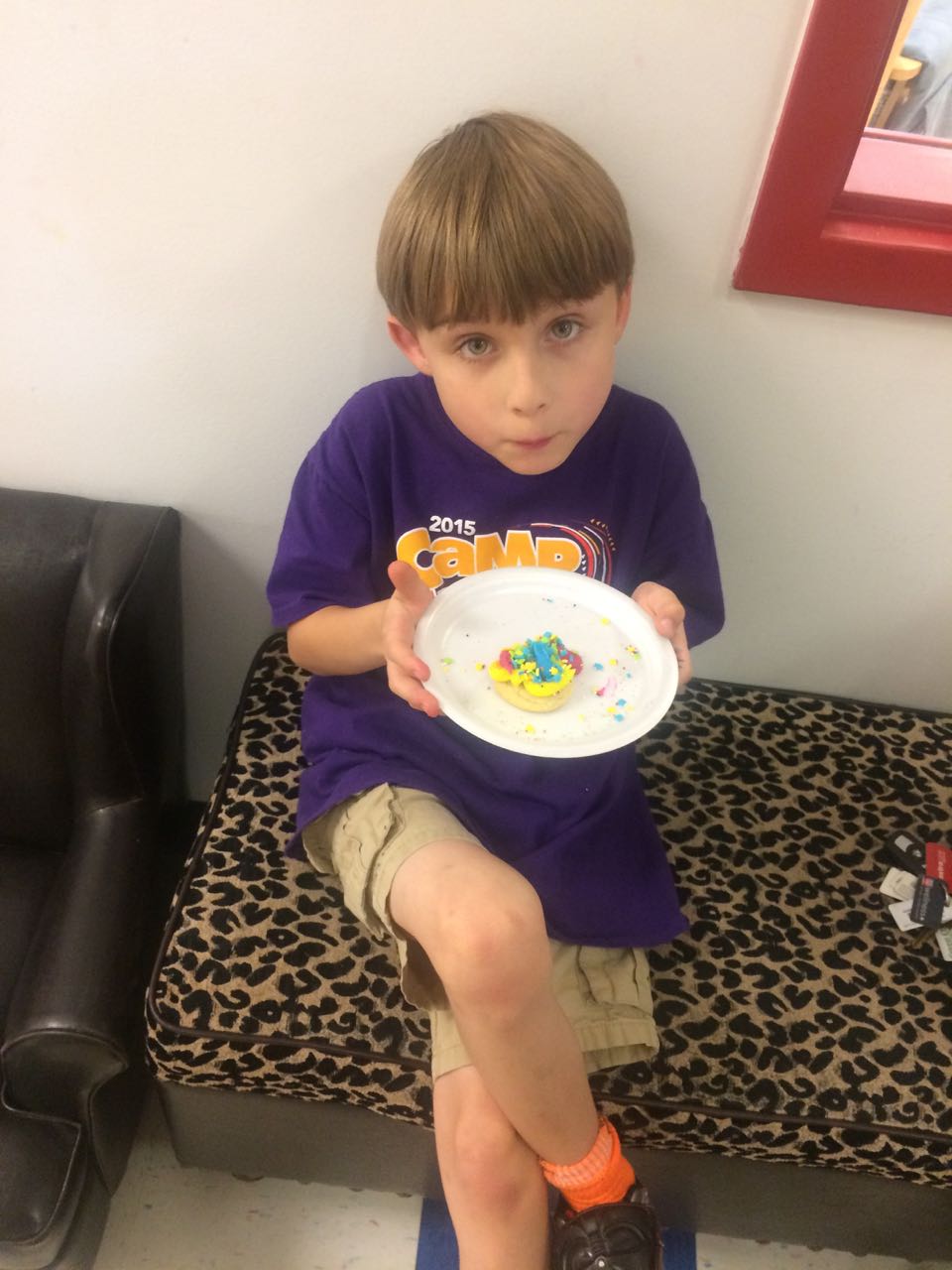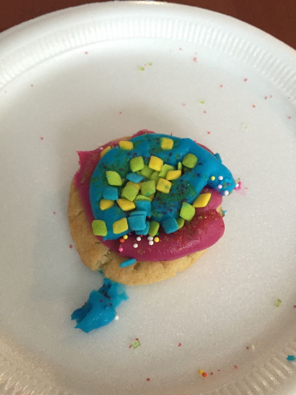 This afternoon, there was a cookie party at Goddard School–the kids got to decorate cookies with colorful icing and sprinkles. They even made one for me! Brian brought home some of his creations from his Crazy for Cardboard camp at Marbles. He finished up his triangular building at home–he worked hard to make it just as he imagined it, and was pretty proud of the way it turned out. The other big thing he called his “Boom Box”–he imagined it like a big speakerbox. At bedtime he was still playing with both, and he wanted me to make music come out of the boom box–instead I showed him how he could put a flashlight behind it, so the light could come out of the many holes he’d made, and the resulting light show impressed us both!