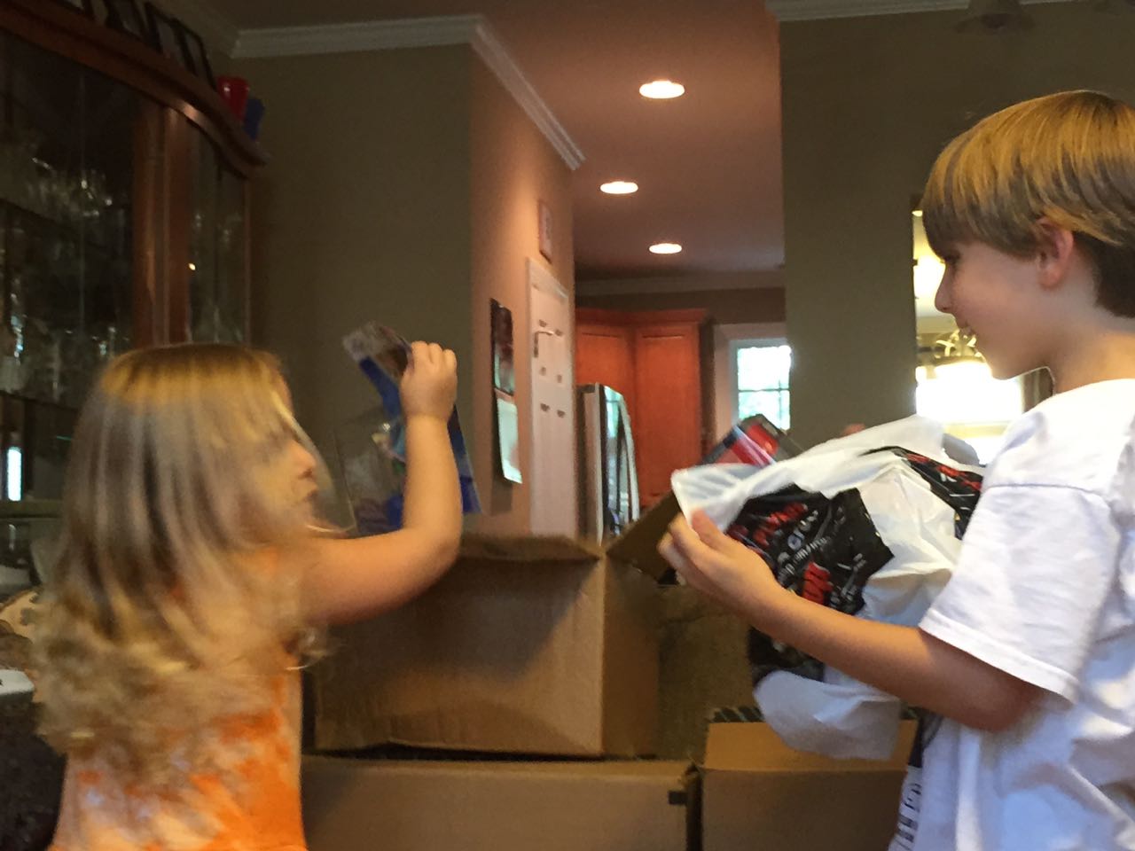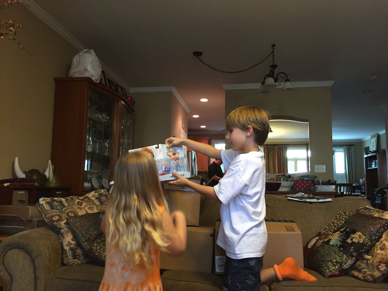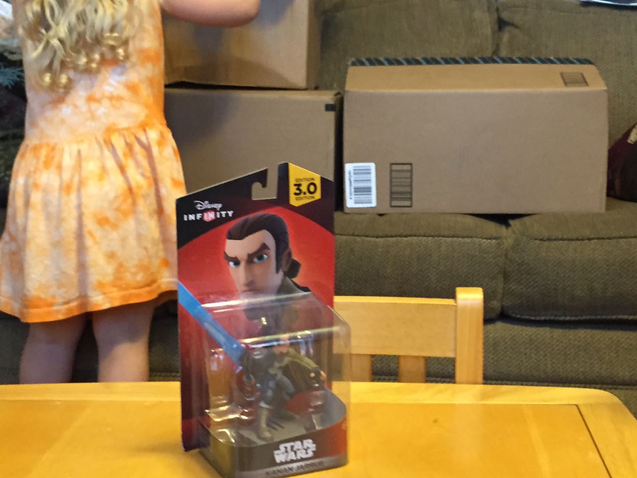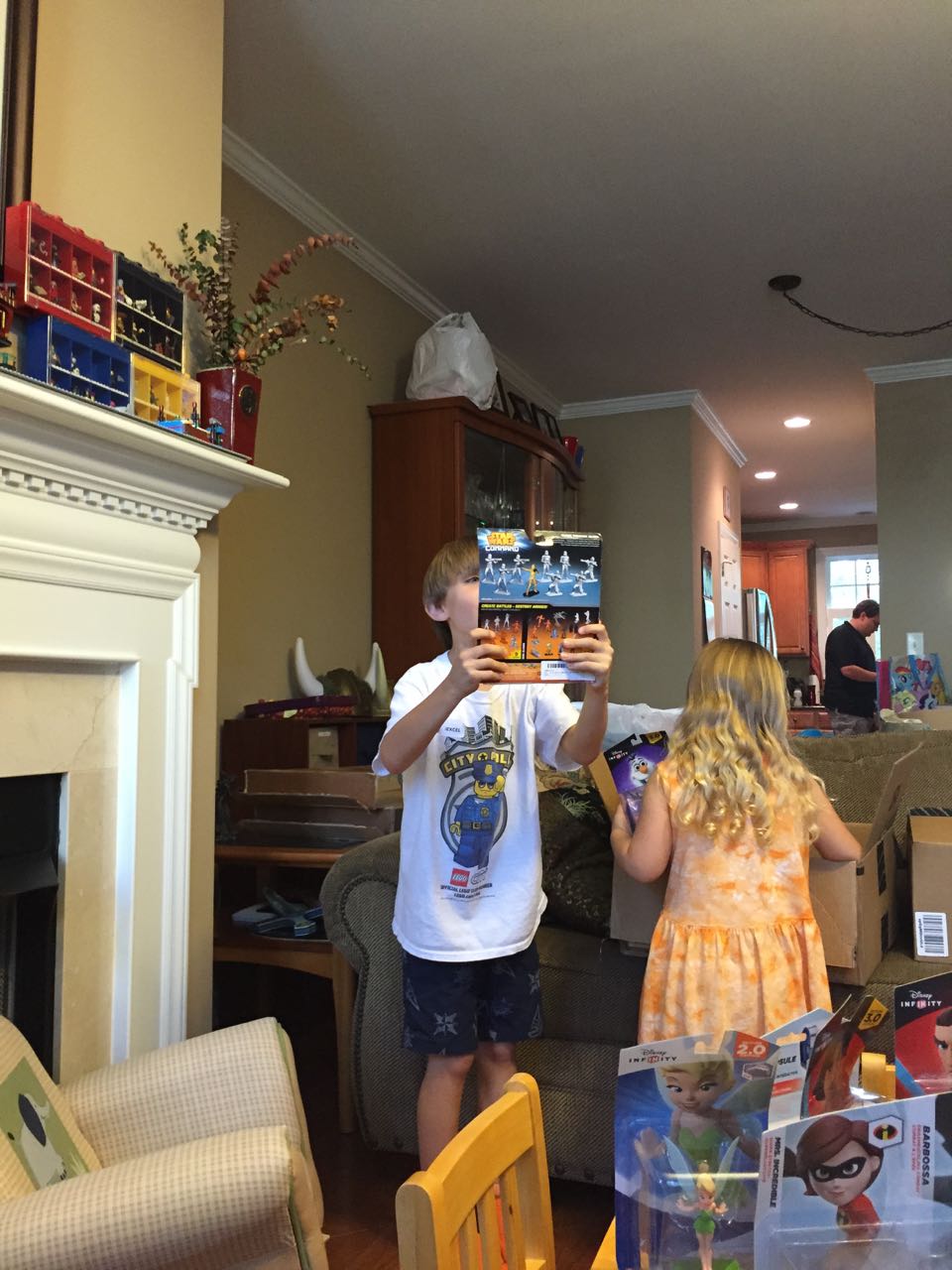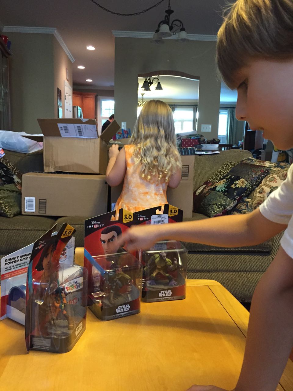 Today Brian’s big birthday present arrived–the newly-released Disney Infinity 3.0! Nana went in with Brandon and me to get Brian the big set that included a lot of Star Wars characters, and we picked up all the rest of them individually. We also got some other characters that Kendall would like–I think she might be able to play this game, too! Of course we don’t want them playing videogames all the time, but I think this one encourages creativity. The kids can make their own worlds and games within the game, and being able to combine the different characters in different situations is just awesome. 🙂 I can’t wait to see Princess Elsa flying an X-Wing fighter around Cinderella’s castle, while Hulk smashes his way around Halloween Town. Predictably, the kids ended up playing with the boxes that the games and figures came in, making a cardboard train for themselves, which they rode all around the living room. They made it quite detailed, with multiple cars, and amenities like personal TV sets.