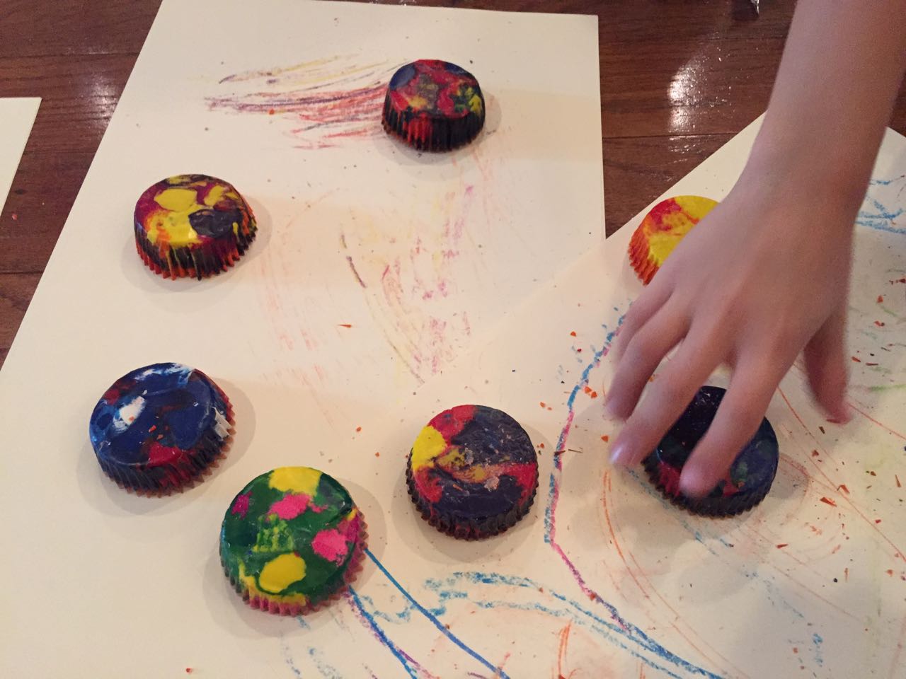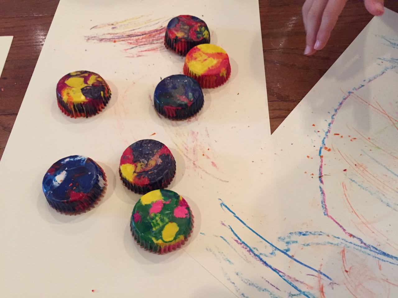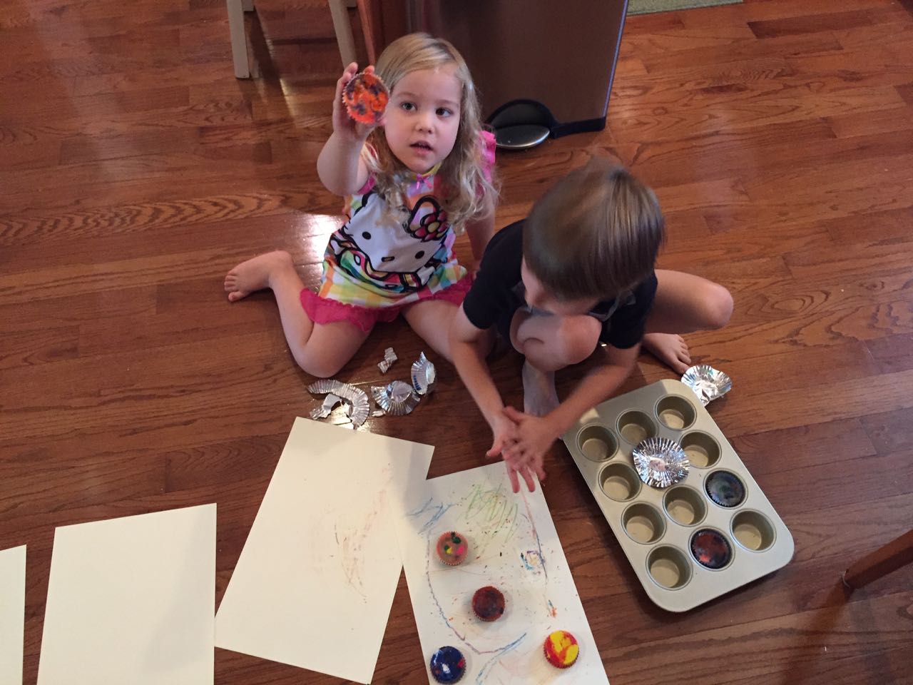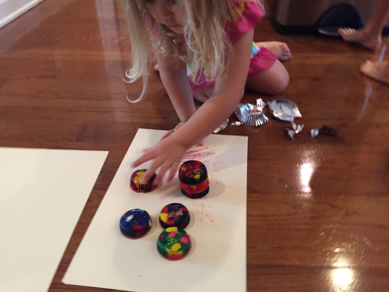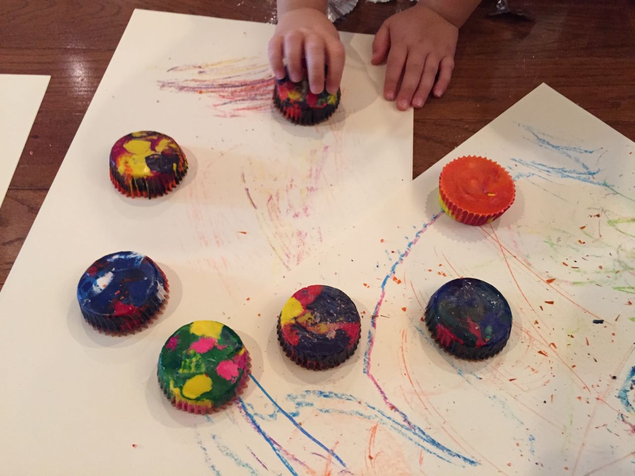 Just a fun Sunday at home..! Today the kids used all the broken crayons to melt down into rainbow crayon cupcakes. They had fun choosing their color combos, although we learned that crayon quality varies widely, which affects the quality of the blend. The majority of the broken crayons were cheap restaurant crayons, and yeah, they are mostly just wax, not a lot of pigment. Still, it was a fun activity. 🙂 The kids also amused themselves with Duplos and Brian’s new Star Wars Command toys (like little army men, but Star Wars characters) and this afternoon, we played with bubbles on the porch, and Brian played catch while Kendall had sandbox time in the back yard.