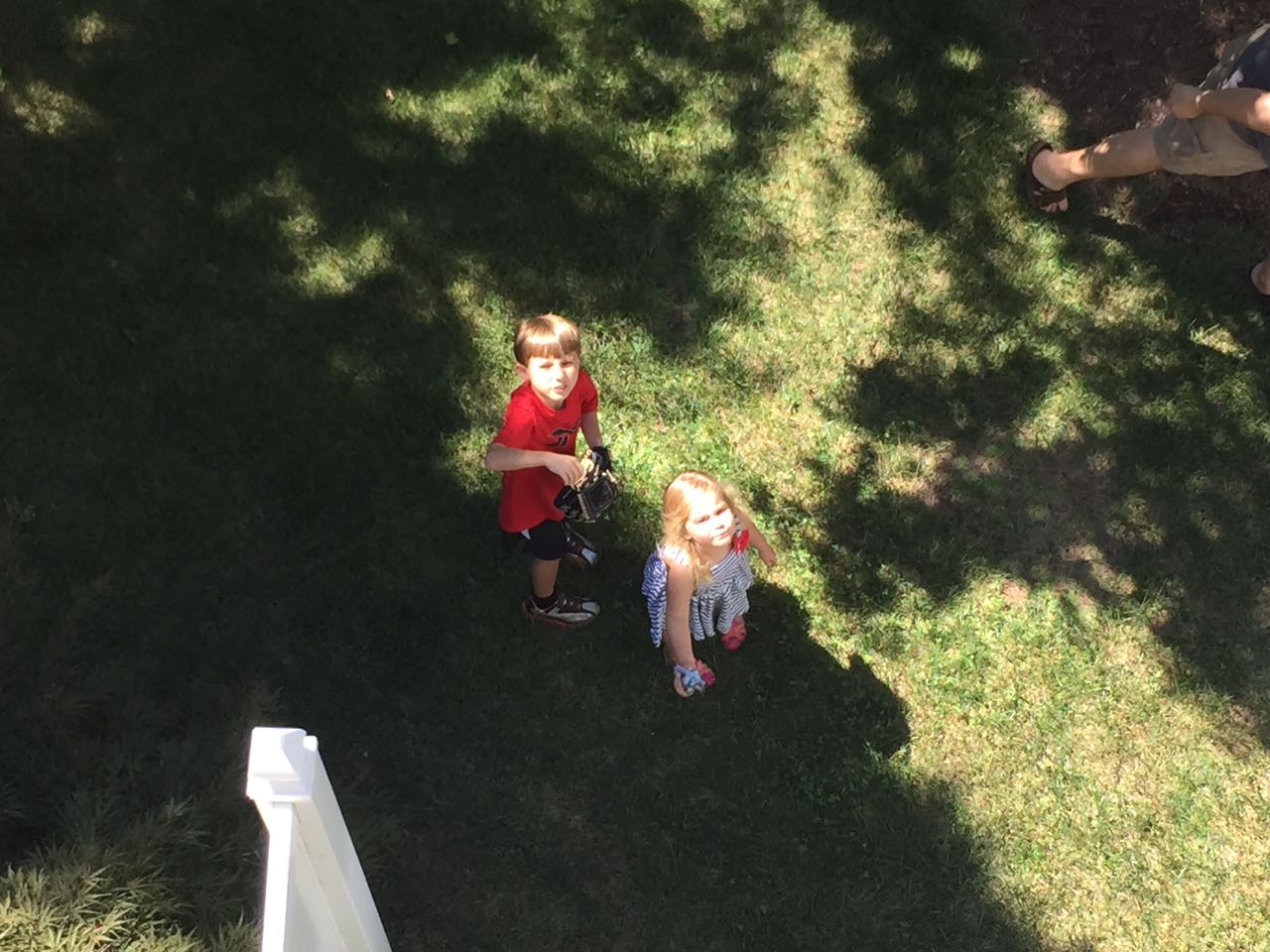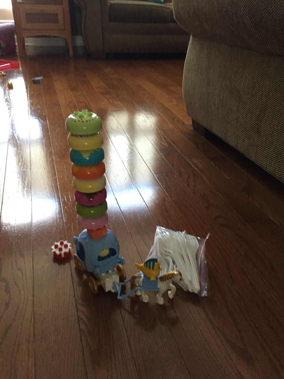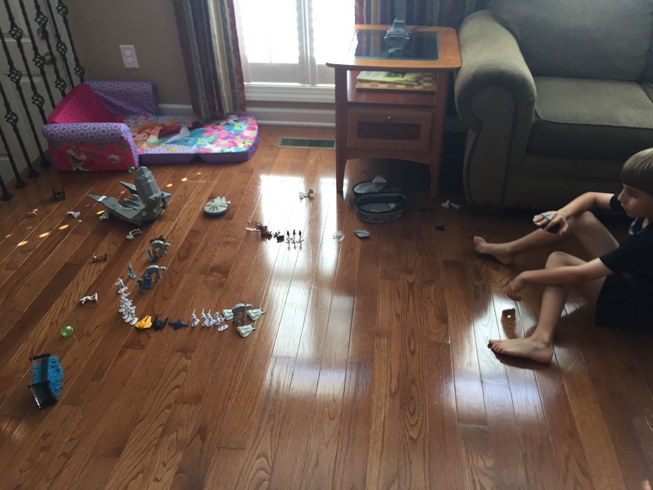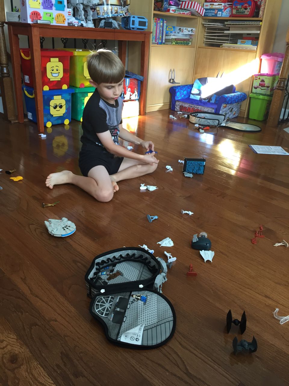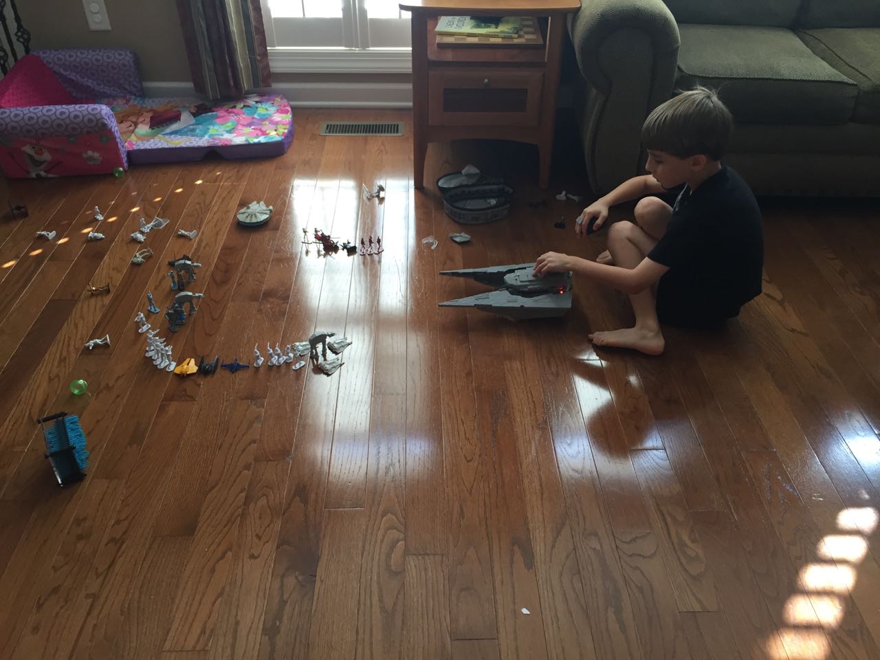 Just a fun Sunday at home..! Today the kids used all the broken crayons to melt down into rainbow crayon cupcakes. They had fun choosing their color combos, although we learned that crayon quality varies widely, which affects the quality of the blend. The majority of the broken crayons were cheap restaurant crayons, and yeah, they are mostly just wax, not a lot of pigment. Still, it was a fun activity. 🙂 The kids also amused themselves with Duplos and Brian’s new Star Wars Command toys (like little army men, but Star Wars characters) and this afternoon, we played with bubbles on the porch, and Brian played catch while Kendall had sandbox time in the back yard.