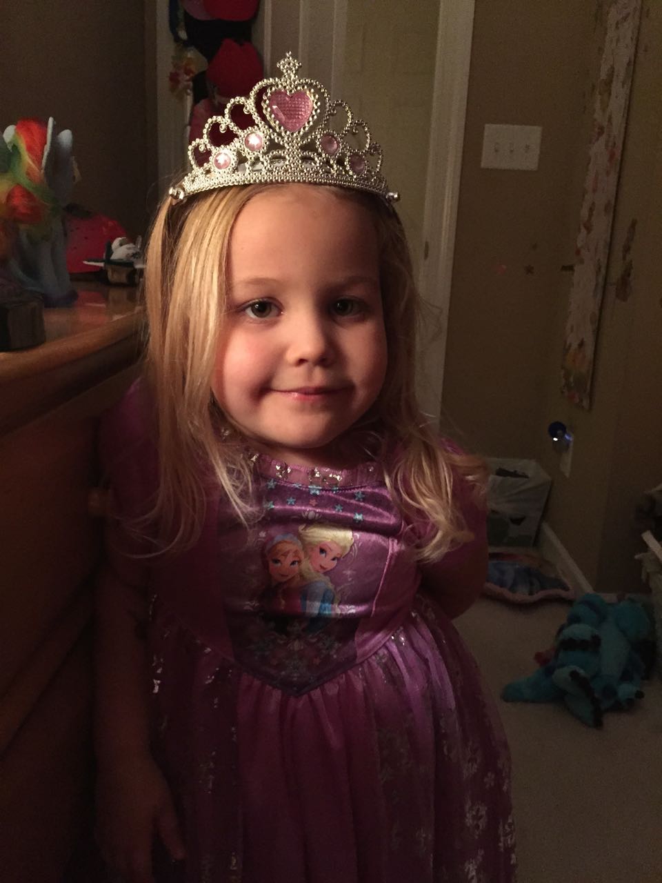 I picked up this very fancy Frozen nightgown for Kendall on one of my many Target runs on the way to the beach last time (I was trying to collect a full set of Power Ponies for her birthday before the collector nerds got them all. I think I visited six different Targets along our route to the beach!) She debuted it today, along with a sparkly princess crown. Just lovely, Kendall!