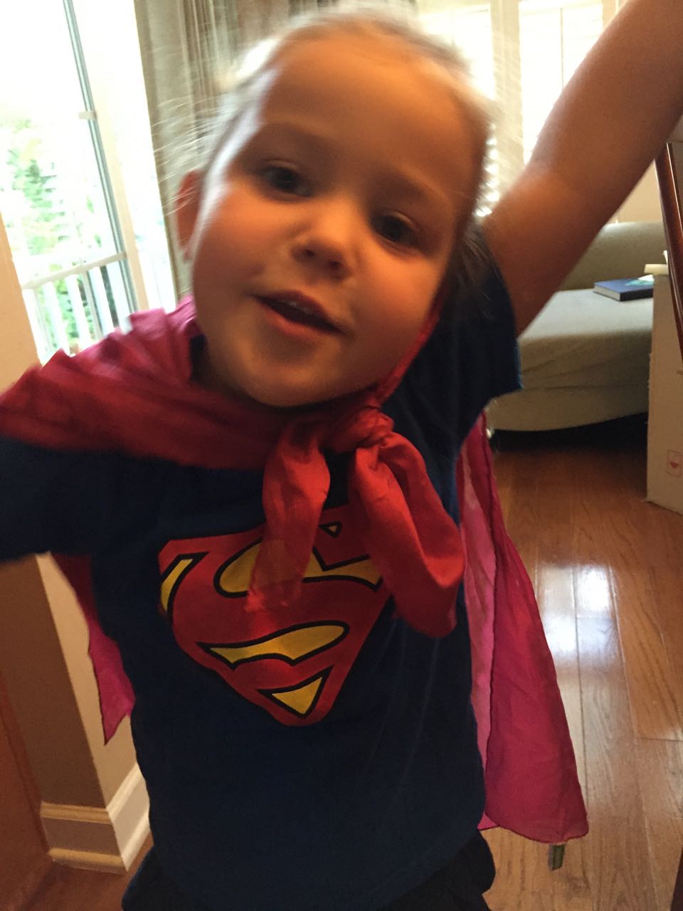 Today was “dress like a superhero” day at Goddard, and we pulled together this Supergirl outfit for Kendall at the last possible second, using one of Brian’s old undershirts and a red playsilk. At school, Kendall was surprised to find Ms. Robin also dressed as Supergirl! They had to pose for a photo together. 🙂