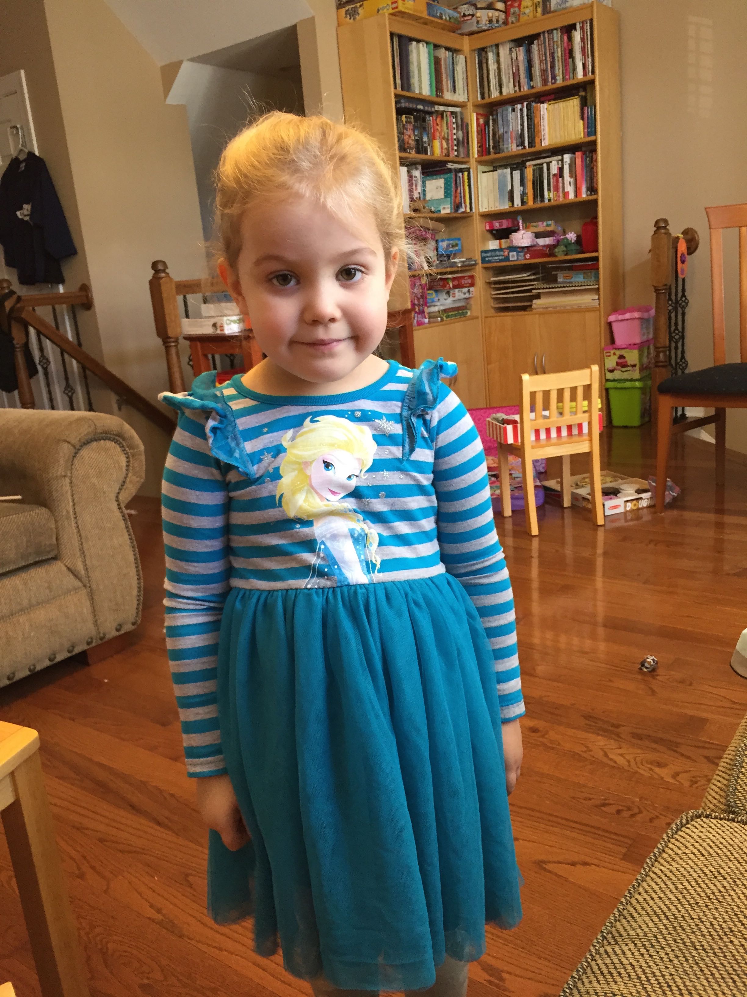 Kendall has declared war on pants, and loves to wear dresses.. She loves her long-sleeved Elsa dress! Also included, the shopping bag of the toy store I got the kids’ souvenirs in Brno, and a fun poster of Admiral Grace Hopper–I think that’s awesome. 🙂
