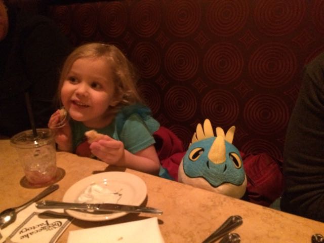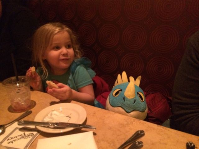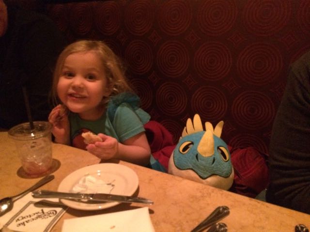 When we got home, we already needed to turn right around and go to the mall with Alison and Kendall. We needed to go to the Disney Store and Build-a-Bear Store for Christmas related items. Part of the reason we did this, is because we were already planning on going to the mall (quick note: Alison and I have a pretty solid rule that we do not go to the mall in the months of November and December), because we were having Sunday dinner with Sue and Marci at The Cheesecake Factory. A good time was had by all, and tag-along Stormfly the Dragon! Stormfly spent the evening staring at me… I think she wanted the chicken.