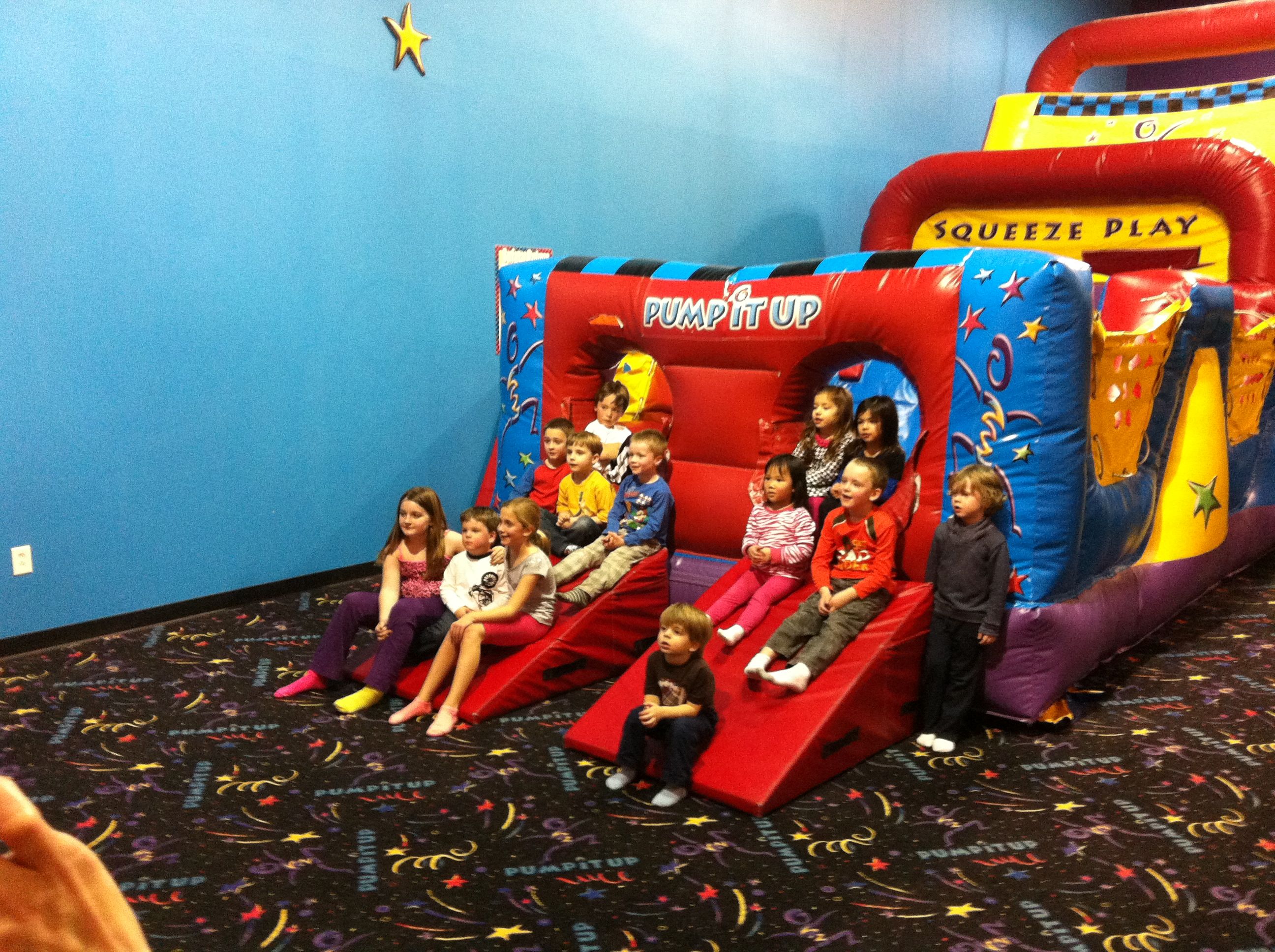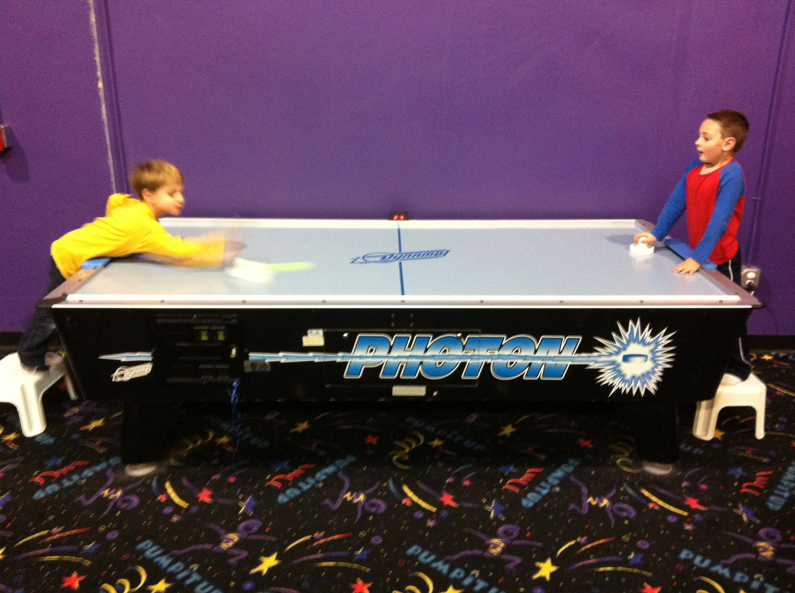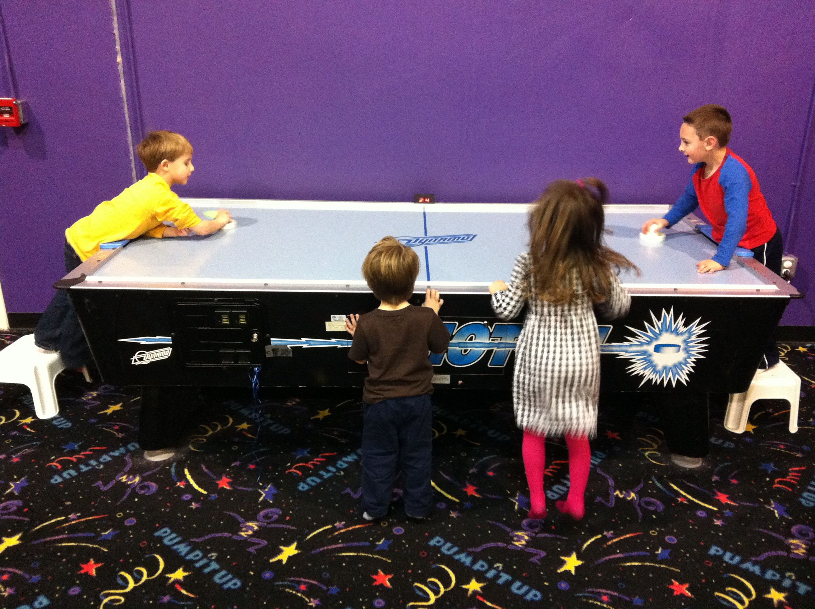 It had to happen sooner or later–tonight was Brian’s first Friday night party.  🙂  His pal Drew’s birthday was this evening after school, out at once of those indoor bounce-house places.  I knew that Kendall wouldn’t be up for all that action, so late in the evening, especially after being back in school, so I stayed home with her and had a girls’ night.  🙂  I’ll be honest, I am not a huge fan of those places, the noise is a little much for me and every surface feels sort of..  sticky.  Ew!   😀  Kendall was really into her dinner (as usual!) and I caught a couple great smiles.  The boys stayed out, bouncing past bedtime, and Brian came home thoroughly exhausted, but happy that he got to stay out late with his best buddies, Ty and Drew.  He loved playing air hockey, of course, it’s one of his favorites!